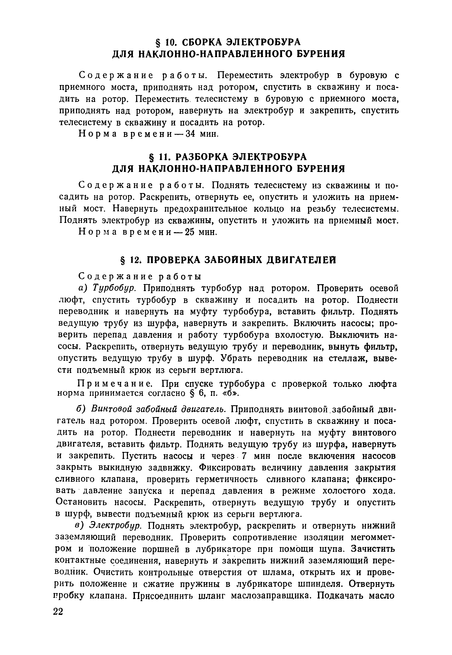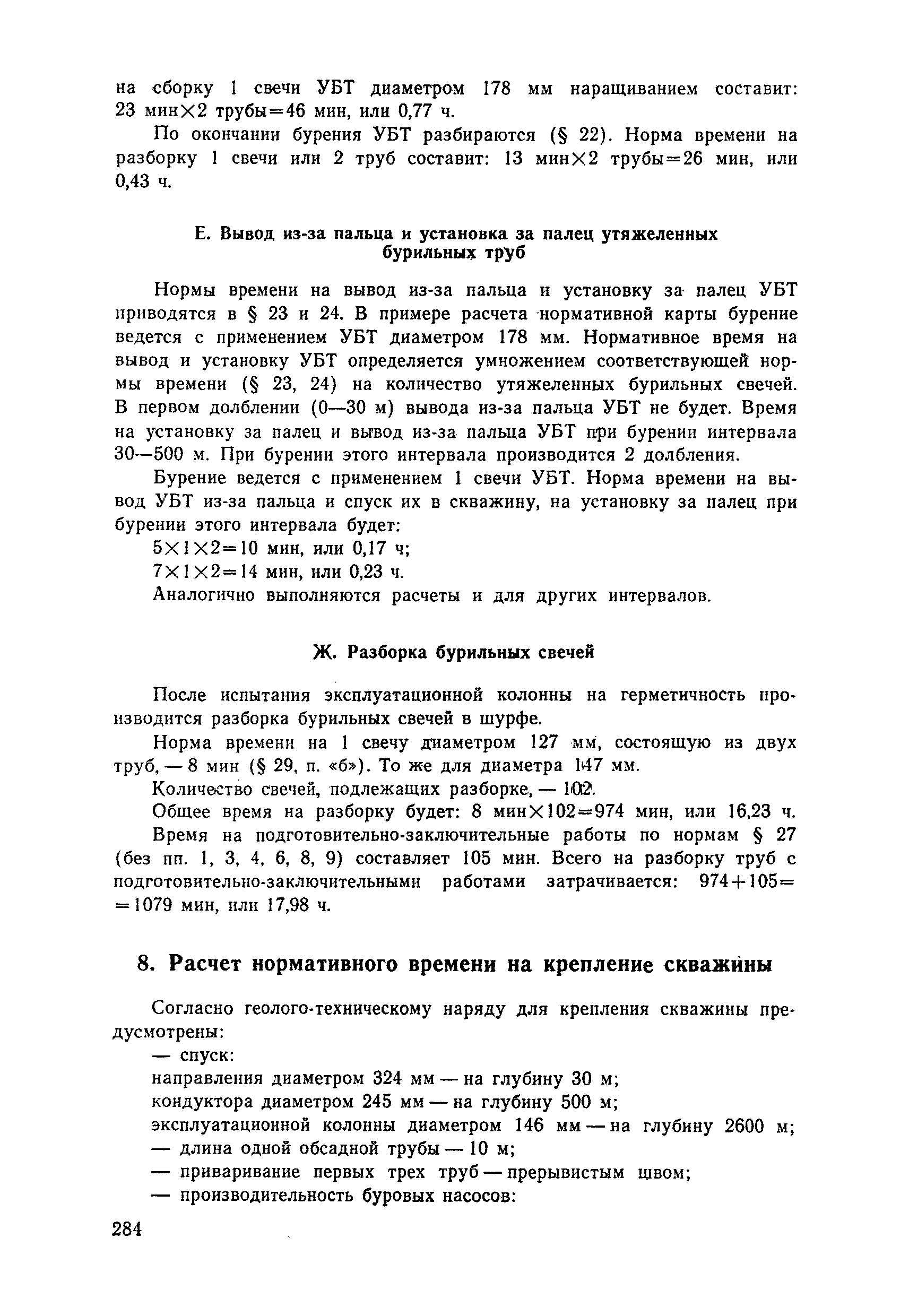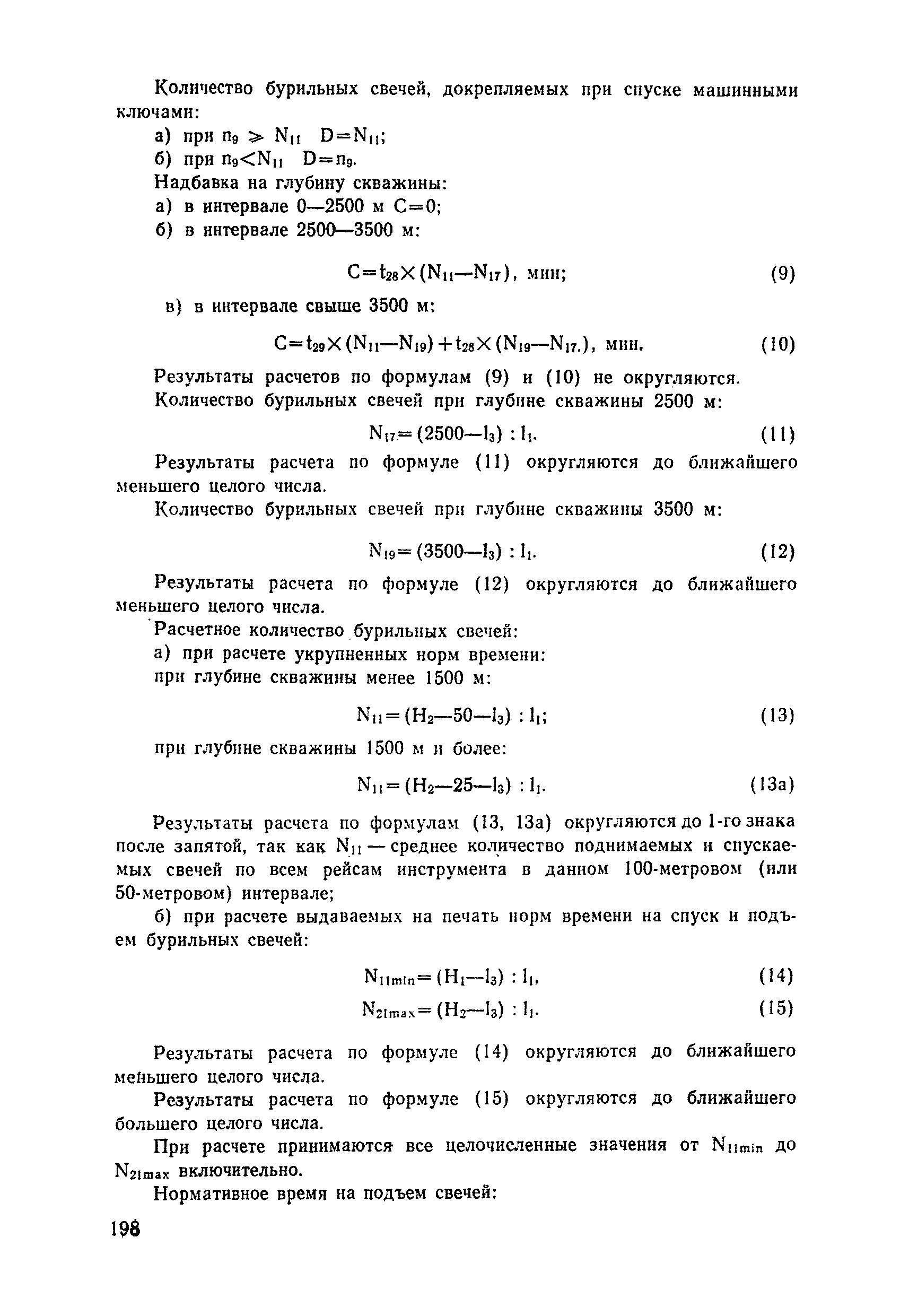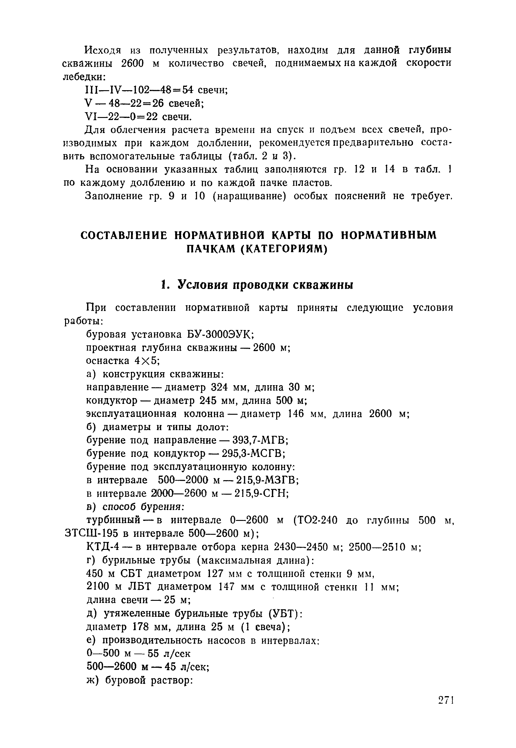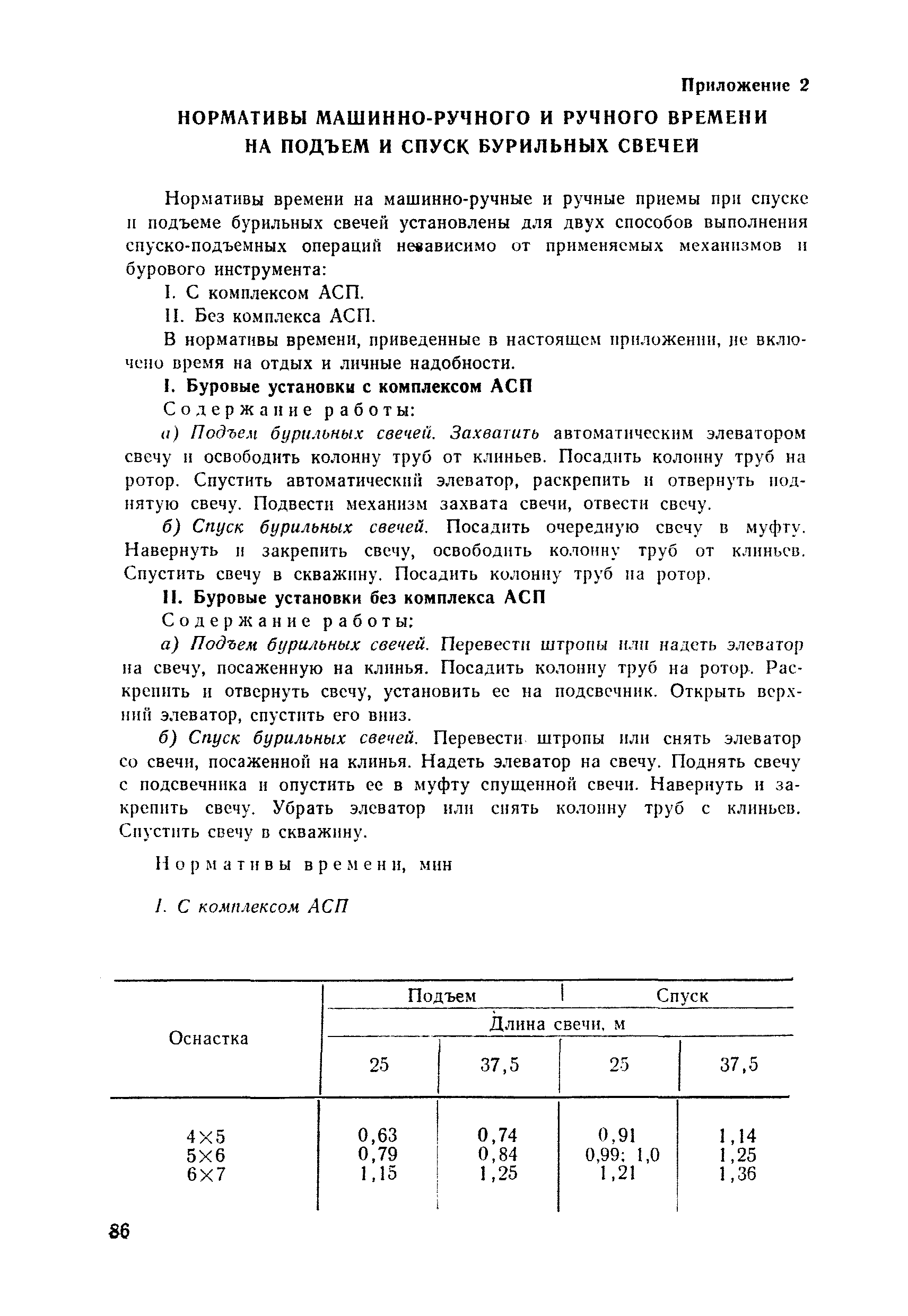 Единые нормы времени на бурение скважин на нефть, газ и другие полезные ископаемые| Статус: | не действует | | Название рус.: | Единые нормы времени на бурение скважин на нефть, газ и другие полезные ископаемые | | Дата добавления в базу: | 01.01.2018 | | Дата актуализации: | 01.01.2021 | | Область применения: | Единые нормы времени на основные виды работ, выполняемые при бурении разведочных, эксплуатационных, опорных, параметрических скважин с применением как роторного способа бурения, так и забойных двигателей, являются обязательными для применения на предприятиях и в организациях, выполняющих указанные работы, независимо от их ведомственной подчиненности и служат для нормирования труда рабочих, находящихся на сдельной оплате труда, а также для разработки нормированных заданий при по- временной оплате труда. Нормы настоящего сборника могут быть использованы для расчета комплексных норм времени. | | Оглавление: | 1. Общая часть 2. Организация труда 3. Нормативная часть 3.1. Нормы времени на подготовительно-заключительные и вспомогательные работы § 1. Подготовительные работы к бурению скважин § 2. Подготовительные работы перед спуском инструмента § 3. Заключительные работы после спуска инструмента § 4. Подготовительные работы перед подъемом инструмента § 5. Наращивание инструмента § 6. Отвертывание долота. Проверка забойного двигателя и укладка на приемный мост § 7. Подъем забойного двигателя в буровую с приемного моста, навертывание долота § 8. Сборка секционного турбобура § 9. Разборка секционного турбобура § 10. Сборка электробура для наклонно-направленного бурения § 11. Разборка электробура для наклонно-направленного бурения § 12. Проверка забойных двигателей § 13. Смена шпинделя турбобура § 14. Сборка колонкового снаряда при роторном бурении и бурении турбобуром с колонковой трубой § 15. Разборка колонкового снаряда при бурении ротором или турбобуром с колонковой трубой (надставкой) § 16. Сборка колонкового турбодолота § 17. Разборка колонкового турбодолота § 18. Подъем и спуск съемной грунтоноски § 19. Сборка колонковых снарядов типа «Недра» и «СКУ» § 20. Разборка колонковых снарядов типа «Недра» и «СКУ» § 21. Сборка утяжеленных бурильных труб § 22. Разборка утяжеленных бурильных труб § 23. Установка утяжеленных бурильных труб за палец § 24. Вывод утяжеленных бурильных труб из-за пальца и спуск в скважину § 25. Спуск утяжеленных бурильных труб в дополнительный шурф (длина свечи 25 м) § 26. Подъем утяжеленных бурильных труб из дополнительного шурфа (длина свечи 25 м) § 27. Подготовительно-заключительные работы при сборке и разборке колонны бурильных труб в скважине или в шурфе при смене диаметра бурильных труб § 28. Сборка колонны бурильных труб § 29. Разборка колонны бурильных труб § 30. Проверка резьбовых соединений бурильных труб ультразвуковой дефектоскопией при спуско-подъемных операциях на скважине § 31. Проверка легкосплавных бурильных труб ультразвуковой дефектоскопией при спуско-подъемных операциях на скважине § 32. Опрессовка свечей бурильных труб на буровой § 33. Сборка элементов компоновки бурильной колонны (расширителей, стабилизаторов, калибраторов, удлинителей, центраторов) § 34. Разборка элементов компоновки бурильной колонны (расширителей, стабилизаторов, калибраторов, удлинителей, центраторов) § 35. Навертывание, отвертывание переводников или вс