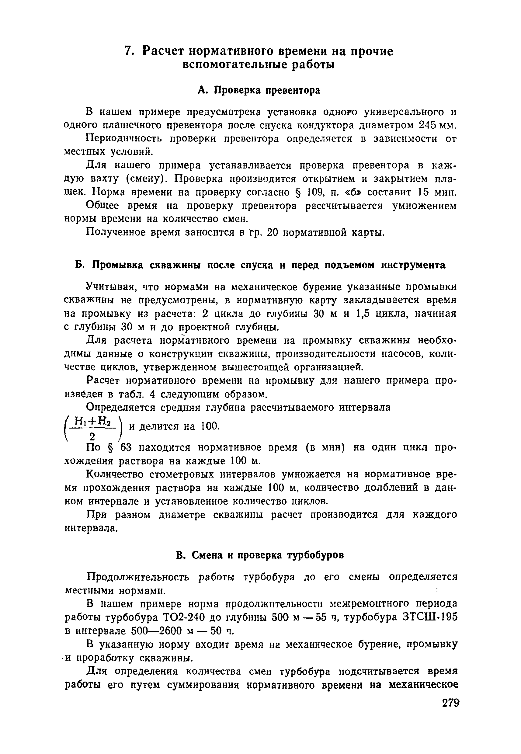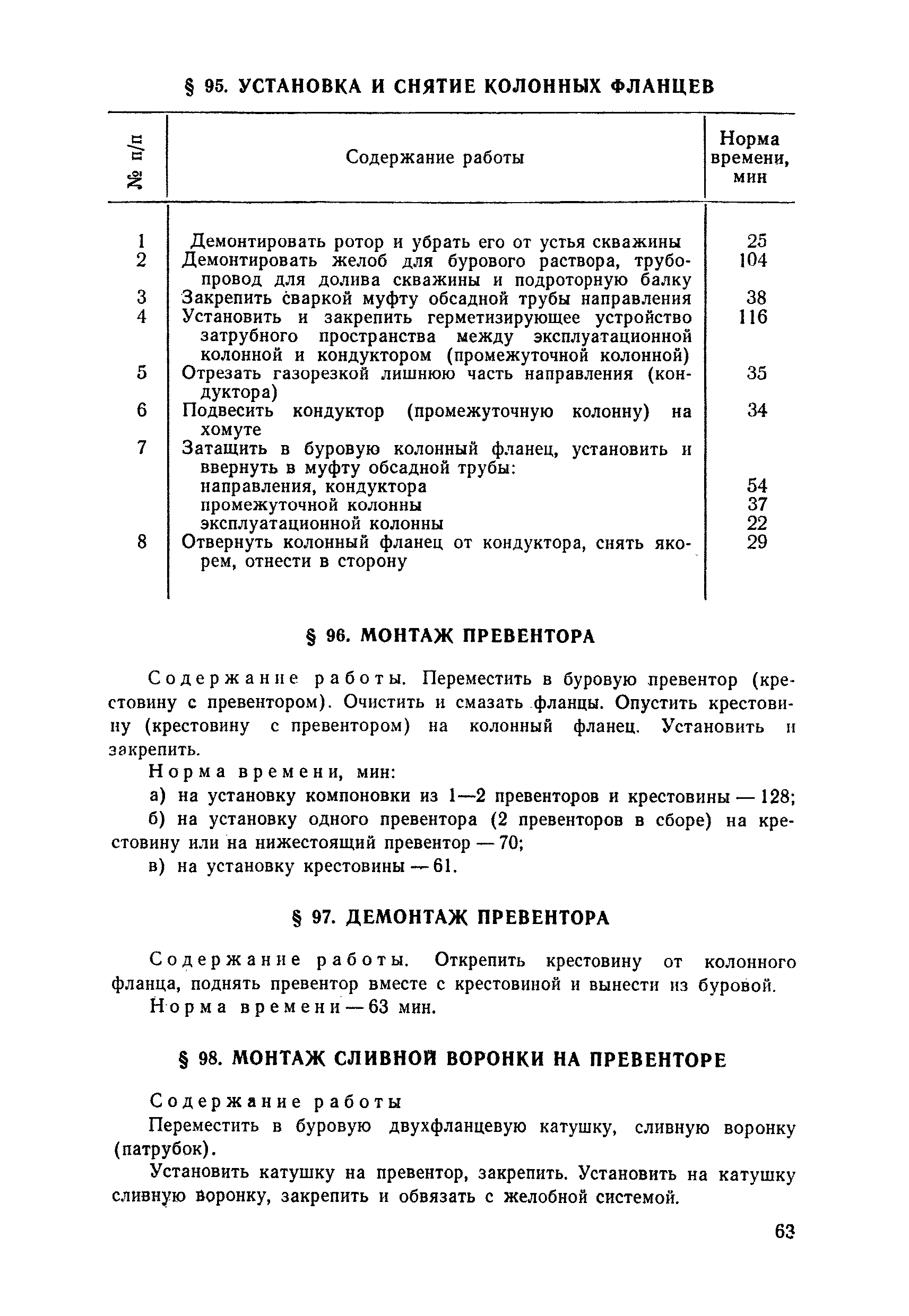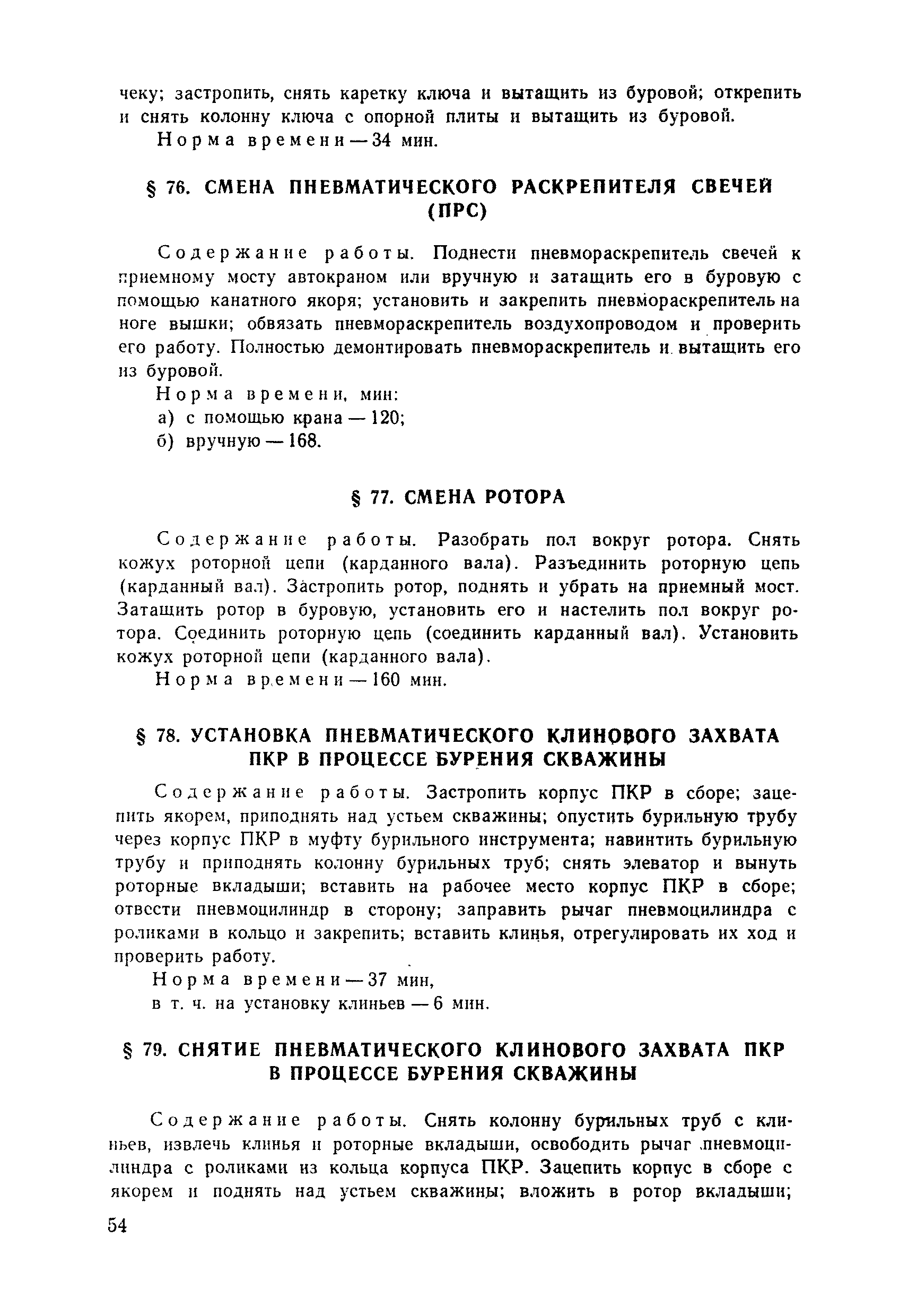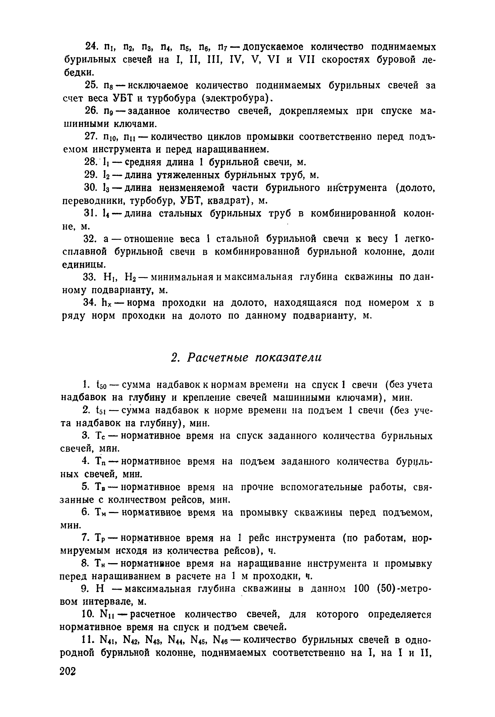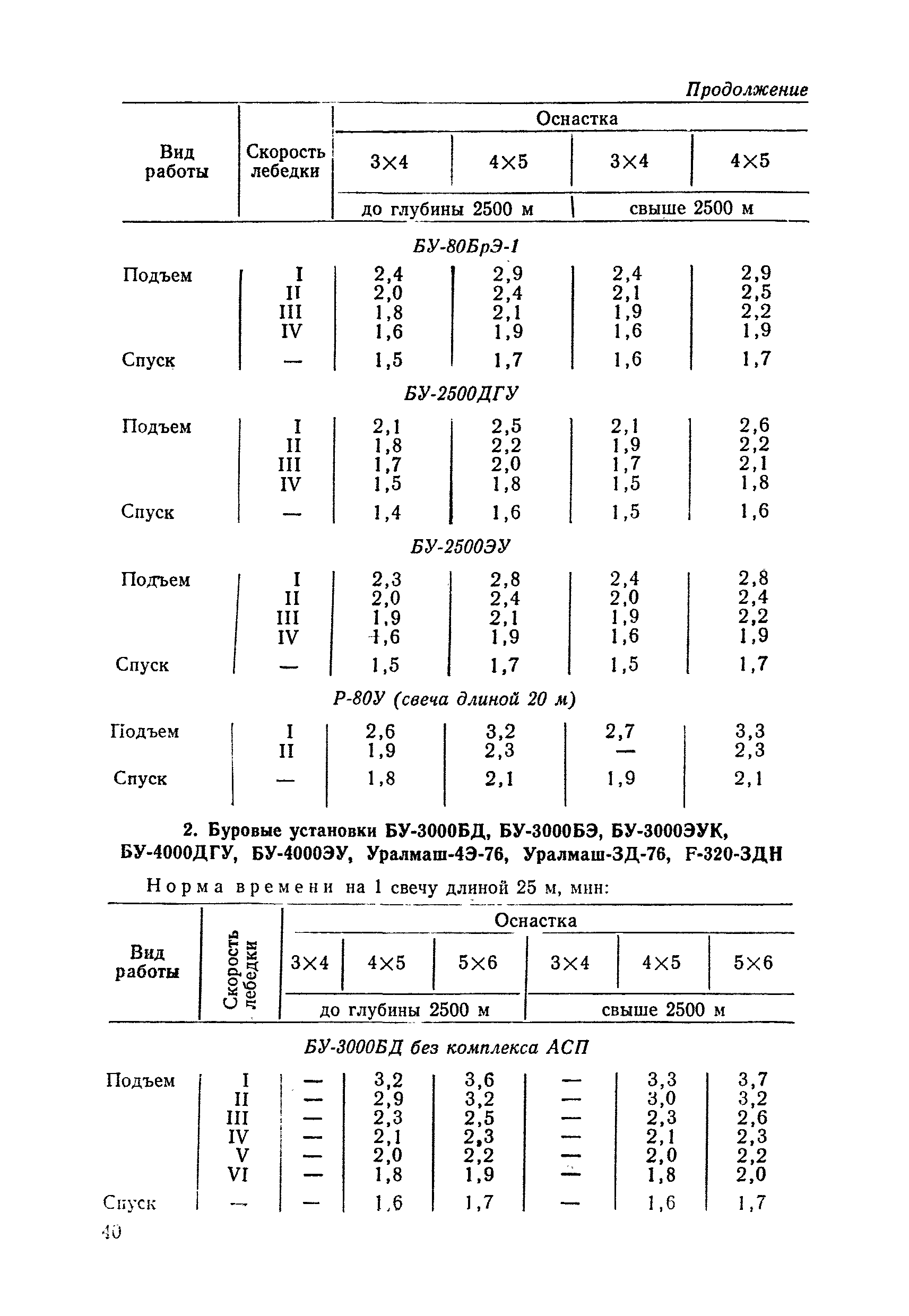 Единые нормы времени на бурение скважин на нефть, газ и другие полезные ископаемые| Статус: | не действует | | Название рус.: | Единые нормы времени на бурение скважин на нефть, газ и другие полезные ископаемые | | Дата добавления в базу: | 01.01.2018 | | Дата актуализации: | 01.01.2021 | | Область применения: | Единые нормы времени на основные виды работ, выполняемые при бурении разведочных, эксплуатационных, опорных, параметрических скважин с применением как роторного способа бурения, так и забойных двигателей, являются обязательными для применения на предприятиях и в организациях, выполняющих указанные работы, независимо от их ведомственной подчиненности и служат для нормирования труда рабочих, находящихся на сдельной оплате труда, а также для разработки нормированных заданий при по- временной оплате труда. Нормы настоящего сборника могут быть использованы для расчета комплексных норм времени. | | Оглавление: | 1. Общая часть 2. Организация труда 3. Нормативная часть 3.1. Нормы времени на подготовительно-заключительные и вспомогательные работы § 1. Подготовительные работы к бурению скважин § 2. Подготовительные работы перед спуском инструмента § 3. Заключительные работы после спуска инструмента § 4. Подготовительные работы перед подъемом инструмента § 5. Наращивание инструмента § 6. Отвертывание долота. Проверка забойного двигателя и укладка на приемный мост § 7. Подъем забойного двигателя в буровую с приемного моста, навертывание долота § 8. Сборка секционного турбобура § 9. Разборка секционного турбобура § 10. Сборка электробура для наклонно-направленного бурения § 11. Разборка электробура для наклонно-направленного бурения § 12. Проверка забойных двигателей § 13. Смена шпинделя турбобура § 14. Сборка колонкового снаряда при роторном бурении и бурении турбобуром с колонковой трубой § 15. Разборка колонкового снаряда при бурении ротором или турбобуром с колонковой трубой (надставкой) § 16. Сборка колонкового турбодолота § 17. Разборка колонкового турбодолота § 18. Подъем и спуск съемной грунтоноски § 19. Сборка колонковых снарядов типа «Недра» и «СКУ» § 20. Разборка колонковых снарядов типа «Недра» и «СКУ» § 21. Сборка утяжеленных бурильных труб § 22. Разборка утяжеленных бурильных труб § 23. Установка утяжеленных бурильных труб за палец § 24. Вывод утяжеленных бурильных труб из-за пальца и спуск в скважину § 25. Спуск утяжеленных бурильных труб в дополнительный шурф (длина свечи 25 м) § 26. Подъем утяжеленных бурильных труб из дополнительного шурфа (длина свечи 25 м) § 27. Подготовительно-заключительные работы при сборке и разборке колонны бурильных труб в скважине или в шурфе при смене диаметра бурильных труб § 28. Сборка колонны бурильных труб § 29. Разборка колонны бурильных труб § 30. Проверка резьбовых соединений бурильных труб ультразвуковой дефектоскопией при спуско-подъемных операциях на скважине § 31. Проверка легкосплавных бурильных труб ультразвуковой дефектоскопией при спуско-подъемных операциях на скважине § 32. Опрессовка свечей бурильных труб на буровой § 33. Сборка элементов компоновки бурильной колонны (расширителей, стабилизаторов, калибраторов, удлинителей, центраторов) § 34. Разборка элементов компоновки бурильной колонны (расширителей, стабилизаторов, калибраторов, удлинителей, центраторов) § 35. Навертывание, отвертывание переводников или вс