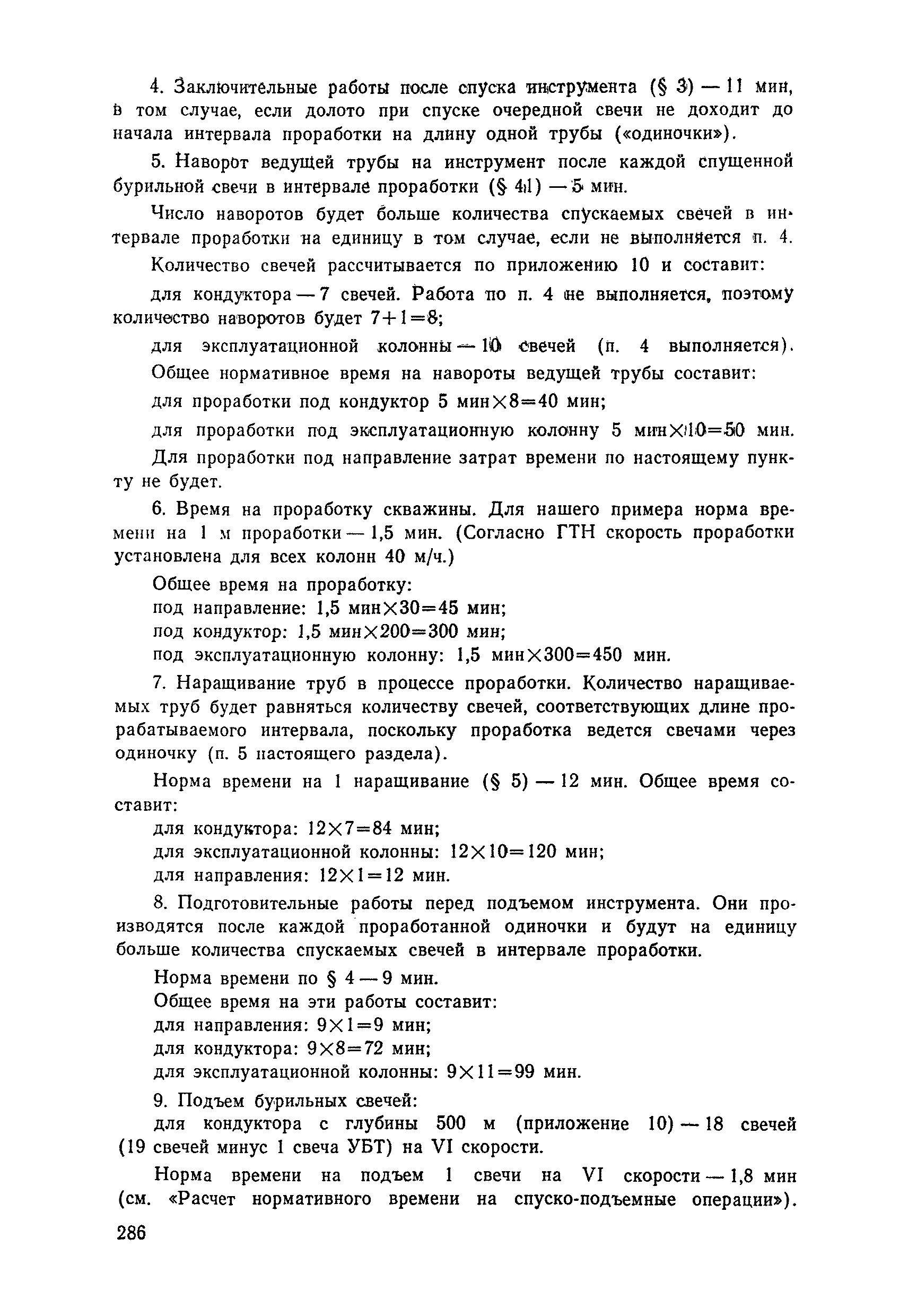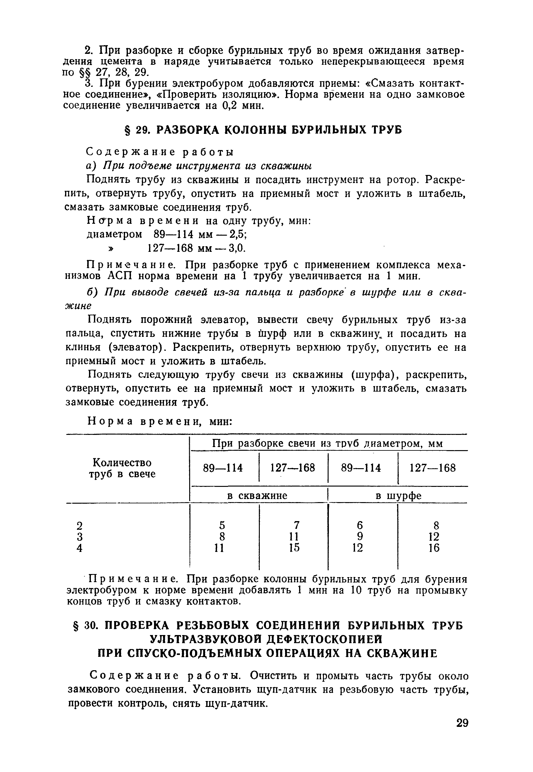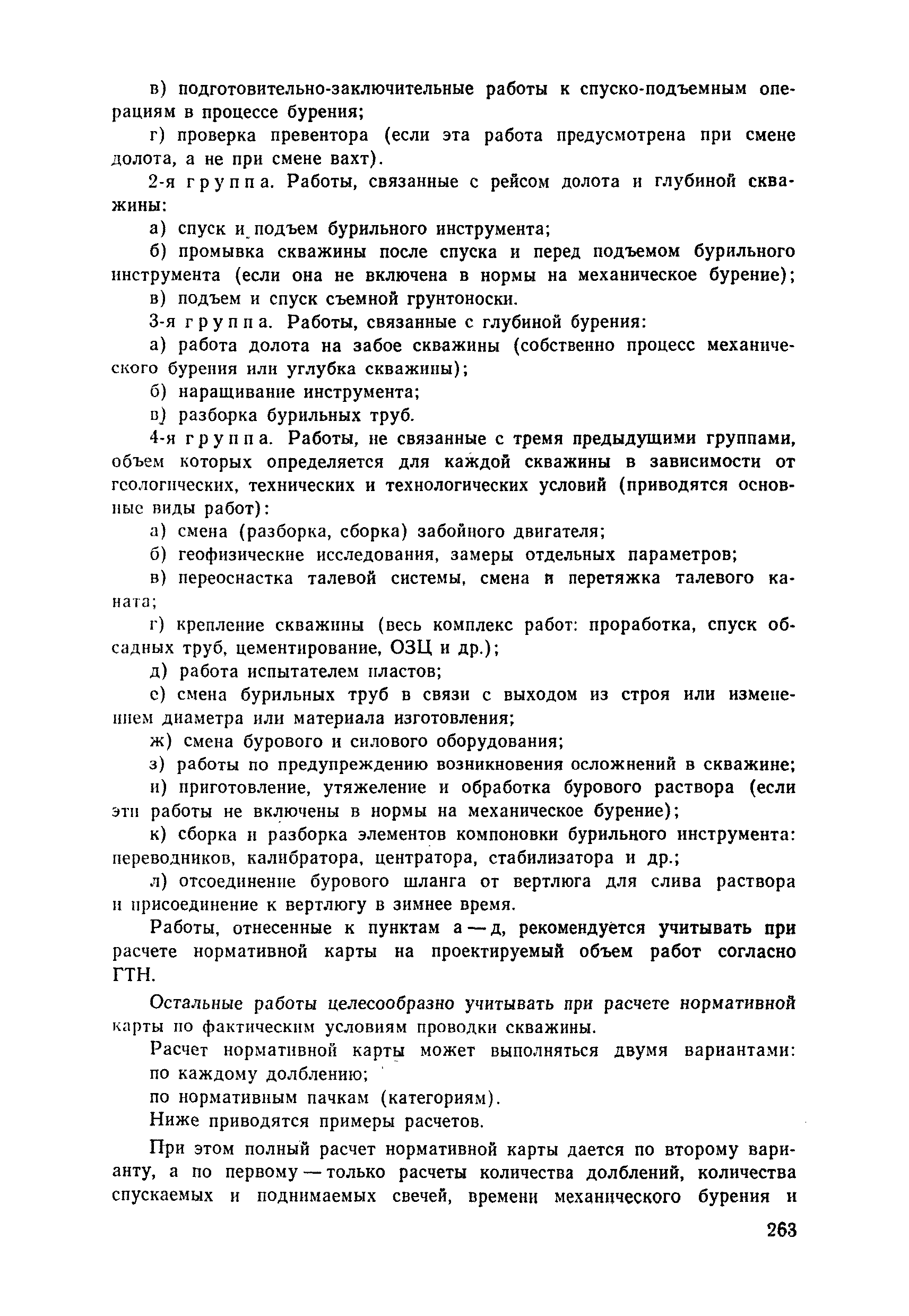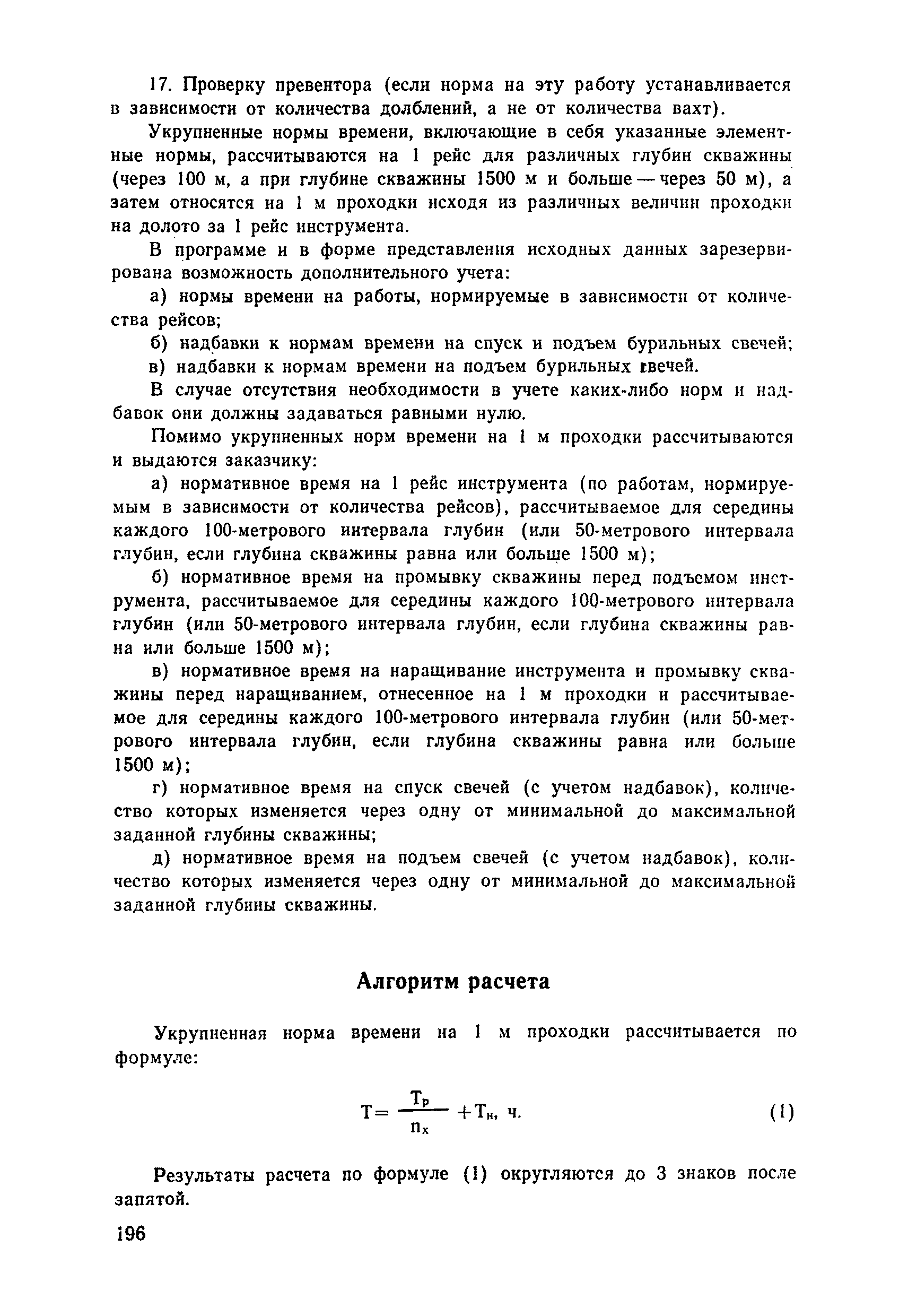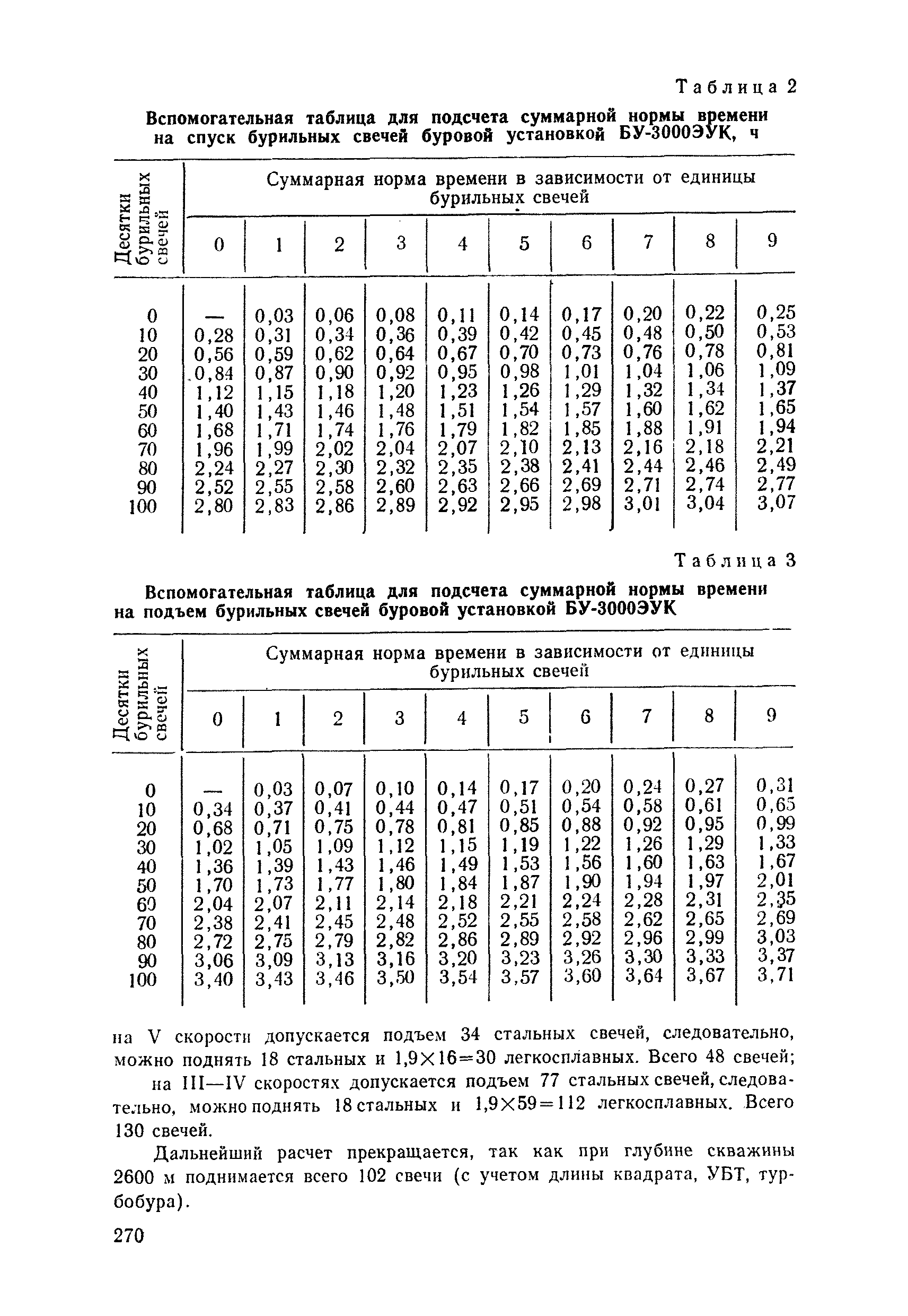 Единые нормы времени на бурение скважин на нефть, газ и другие полезные ископаемые| Статус: | не действует | | Название рус.: | Единые нормы времени на бурение скважин на нефть, газ и другие полезные ископаемые | | Дата добавления в базу: | 01.01.2018 | | Дата актуализации: | 01.01.2021 | | Область применения: | Единые нормы времени на основные виды работ, выполняемые при бурении разведочных, эксплуатационных, опорных, параметрических скважин с применением как роторного способа бурения, так и забойных двигателей, являются обязательными для применения на предприятиях и в организациях, выполняющих указанные работы, независимо от их ведомственной подчиненности и служат для нормирования труда рабочих, находящихся на сдельной оплате труда, а также для разработки нормированных заданий при по- временной оплате труда. Нормы настоящего сборника могут быть использованы для расчета комплексных норм времени. | | Оглавление: | 1. Общая часть 2. Организация труда 3. Нормативная часть 3.1. Нормы времени на подготовительно-заключительные и вспомогательные работы § 1. Подготовительные работы к бурению скважин § 2. Подготовительные работы перед спуском инструмента § 3. Заключительные работы после спуска инструмента § 4. Подготовительные работы перед подъемом инструмента § 5. Наращивание инструмента § 6. Отвертывание долота. Проверка забойного двигателя и укладка на приемный мост § 7. Подъем забойного двигателя в буровую с приемного моста, навертывание долота § 8. Сборка секционного турбобура § 9. Разборка секционного турбобура § 10. Сборка электробура для наклонно-направленного бурения § 11. Разборка электробура для наклонно-направленного бурения § 12. Проверка забойных двигателей § 13. Смена шпинделя турбобура § 14. Сборка колонкового снаряда при роторном бурении и бурении турбобуром с колонковой трубой § 15. Разборка колонкового снаряда при бурении ротором или турбобуром с колонковой трубой (надставкой) § 16. Сборка колонкового турбодолота § 17. Разборка колонкового турбодолота § 18. Подъем и спуск съемной грунтоноски § 19. Сборка колонковых снарядов типа «Недра» и «СКУ» § 20. Разборка колонковых снарядов типа «Недра» и «СКУ» § 21. Сборка утяжеленных бурильных труб § 22. Разборка утяжеленных бурильных труб § 23. Установка утяжеленных бурильных труб за палец § 24. Вывод утяжеленных бурильных труб из-за пальца и спуск в скважину § 25. Спуск утяжеленных бурильных труб в дополнительный шурф (длина свечи 25 м) § 26. Подъем утяжеленных бурильных труб из дополнительного шурфа (длина свечи 25 м) § 27. Подготовительно-заключительные работы при сборке и разборке колонны бурильных труб в скважине или в шурфе при смене диаметра бурильных труб § 28. Сборка колонны бурильных труб § 29. Разборка колонны бурильных труб § 30. Проверка резьбовых соединений бурильных труб ультразвуковой дефектоскопией при спуско-подъемных операциях на скважине § 31. Проверка легкосплавных бурильных труб ультразвуковой дефектоскопией при спуско-подъемных операциях на скважине § 32. Опрессовка свечей бурильных труб на буровой § 33. Сборка элементов компоновки бурильной колонны (расширителей, стабилизаторов, калибраторов, удлинителей, центраторов) § 34. Разборка элементов компоновки бурильной колонны (расширителей, стабилизаторов, калибраторов, удлинителей, центраторов) § 35. Навертывание, отвертывание переводников или вс