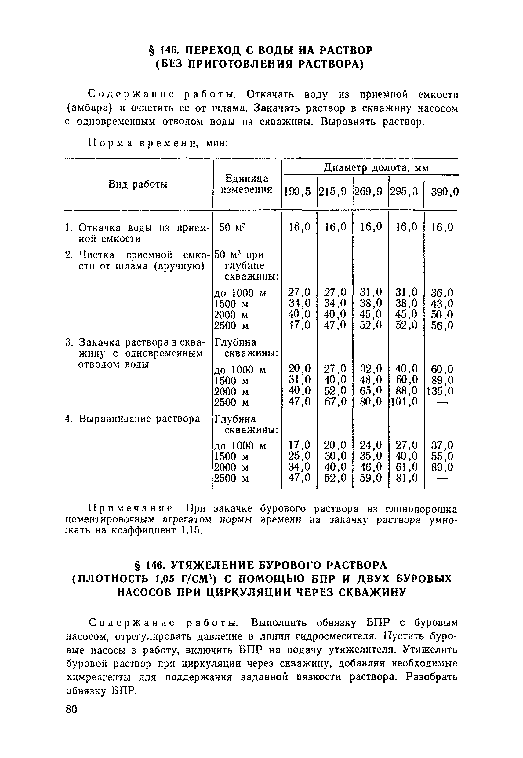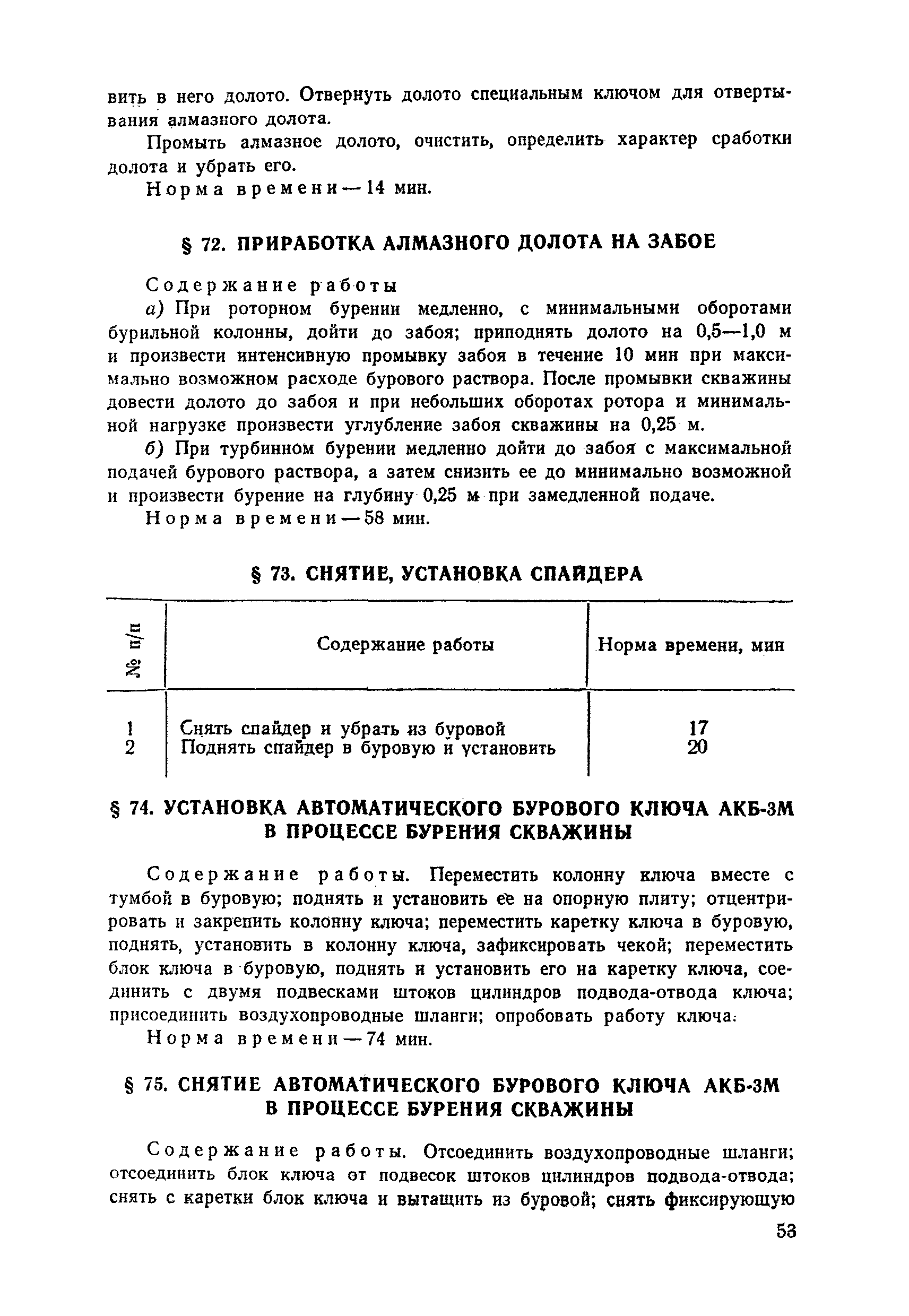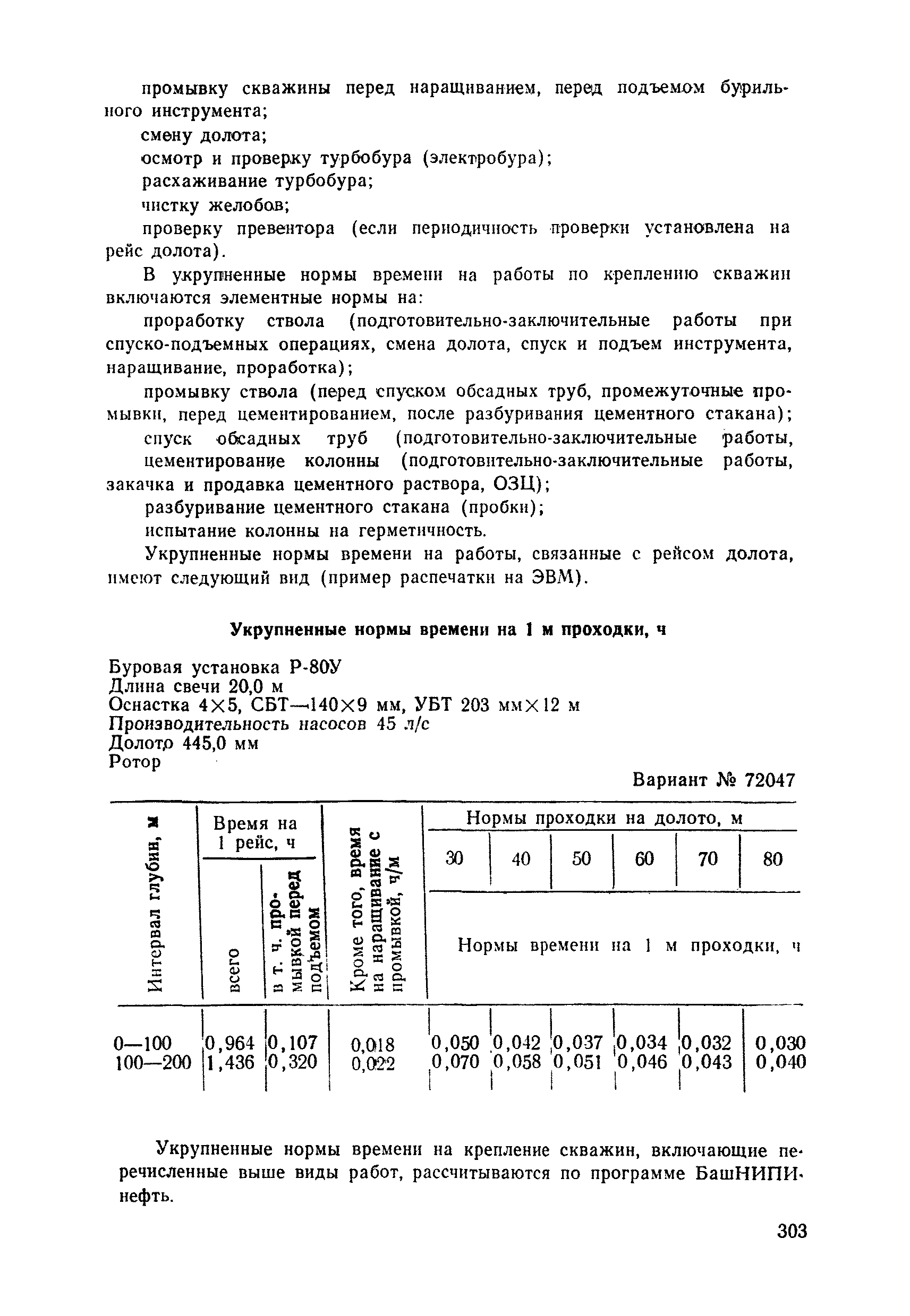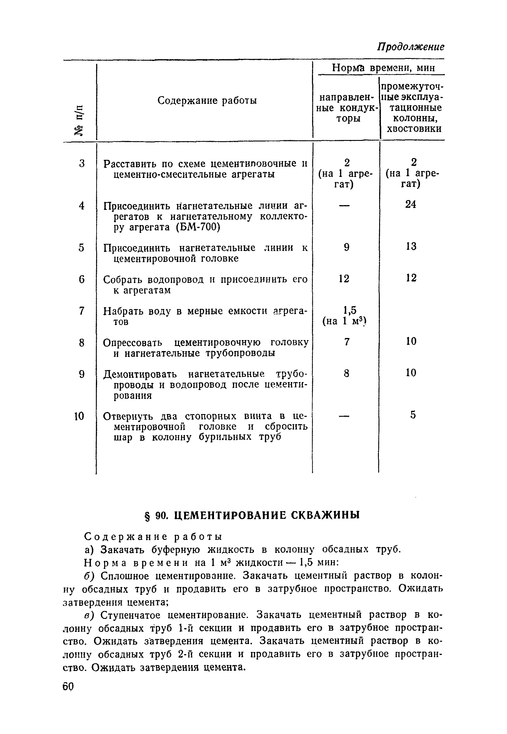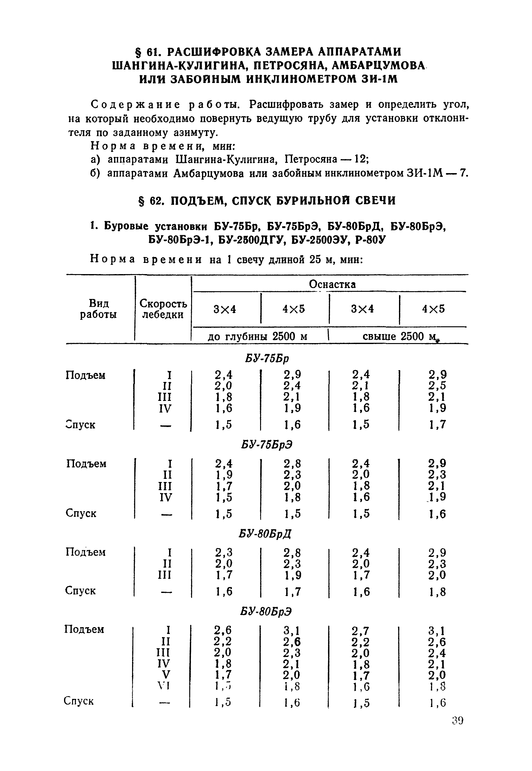 Единые нормы времени на бурение скважин на нефть, газ и другие полезные ископаемые| Статус: | не действует | | Название рус.: | Единые нормы времени на бурение скважин на нефть, газ и другие полезные ископаемые | | Дата добавления в базу: | 01.01.2018 | | Дата актуализации: | 01.01.2021 | | Область применения: | Единые нормы времени на основные виды работ, выполняемые при бурении разведочных, эксплуатационных, опорных, параметрических скважин с применением как роторного способа бурения, так и забойных двигателей, являются обязательными для применения на предприятиях и в организациях, выполняющих указанные работы, независимо от их ведомственной подчиненности и служат для нормирования труда рабочих, находящихся на сдельной оплате труда, а также для разработки нормированных заданий при по- временной оплате труда. Нормы настоящего сборника могут быть использованы для расчета комплексных норм времени. | | Оглавление: | 1. Общая часть 2. Организация труда 3. Нормативная часть 3.1. Нормы времени на подготовительно-заключительные и вспомогательные работы § 1. Подготовительные работы к бурению скважин § 2. Подготовительные работы перед спуском инструмента § 3. Заключительные работы после спуска инструмента § 4. Подготовительные работы перед подъемом инструмента § 5. Наращивание инструмента § 6. Отвертывание долота. Проверка забойного двигателя и укладка на приемный мост § 7. Подъем забойного двигателя в буровую с приемного моста, навертывание долота § 8. Сборка секционного турбобура § 9. Разборка секционного турбобура § 10. Сборка электробура для наклонно-направленного бурения § 11. Разборка электробура для наклонно-направленного бурения § 12. Проверка забойных двигателей § 13. Смена шпинделя турбобура § 14. Сборка колонкового снаряда при роторном бурении и бурении турбобуром с колонковой трубой § 15. Разборка колонкового снаряда при бурении ротором или турбобуром с колонковой трубой (надставкой) § 16. Сборка колонкового турбодолота § 17. Разборка колонкового турбодолота § 18. Подъем и спуск съемной грунтоноски § 19. Сборка колонковых снарядов типа «Недра» и «СКУ» § 20. Разборка колонковых снарядов типа «Недра» и «СКУ» § 21. Сборка утяжеленных бурильных труб § 22. Разборка утяжеленных бурильных труб § 23. Установка утяжеленных бурильных труб за палец § 24. Вывод утяжеленных бурильных труб из-за пальца и спуск в скважину § 25. Спуск утяжеленных бурильных труб в дополнительный шурф (длина свечи 25 м) § 26. Подъем утяжеленных бурильных труб из дополнительного шурфа (длина свечи 25 м) § 27. Подготовительно-заключительные работы при сборке и разборке колонны бурильных труб в скважине или в шурфе при смене диаметра бурильных труб § 28. Сборка колонны бурильных труб § 29. Разборка колонны бурильных труб § 30. Проверка резьбовых соединений бурильных труб ультразвуковой дефектоскопией при спуско-подъемных операциях на скважине § 31. Проверка легкосплавных бурильных труб ультразвуковой дефектоскопией при спуско-подъемных операциях на скважине § 32. Опрессовка свечей бурильных труб на буровой § 33. Сборка элементов компоновки бурильной колонны (расширителей, стабилизаторов, калибраторов, удлинителей, центраторов) § 34. Разборка элементов компоновки бурильной колонны (расширителей, стабилизаторов, калибраторов, удлинителей, центраторов) § 35. Навертывание, отвертывание переводников или вс