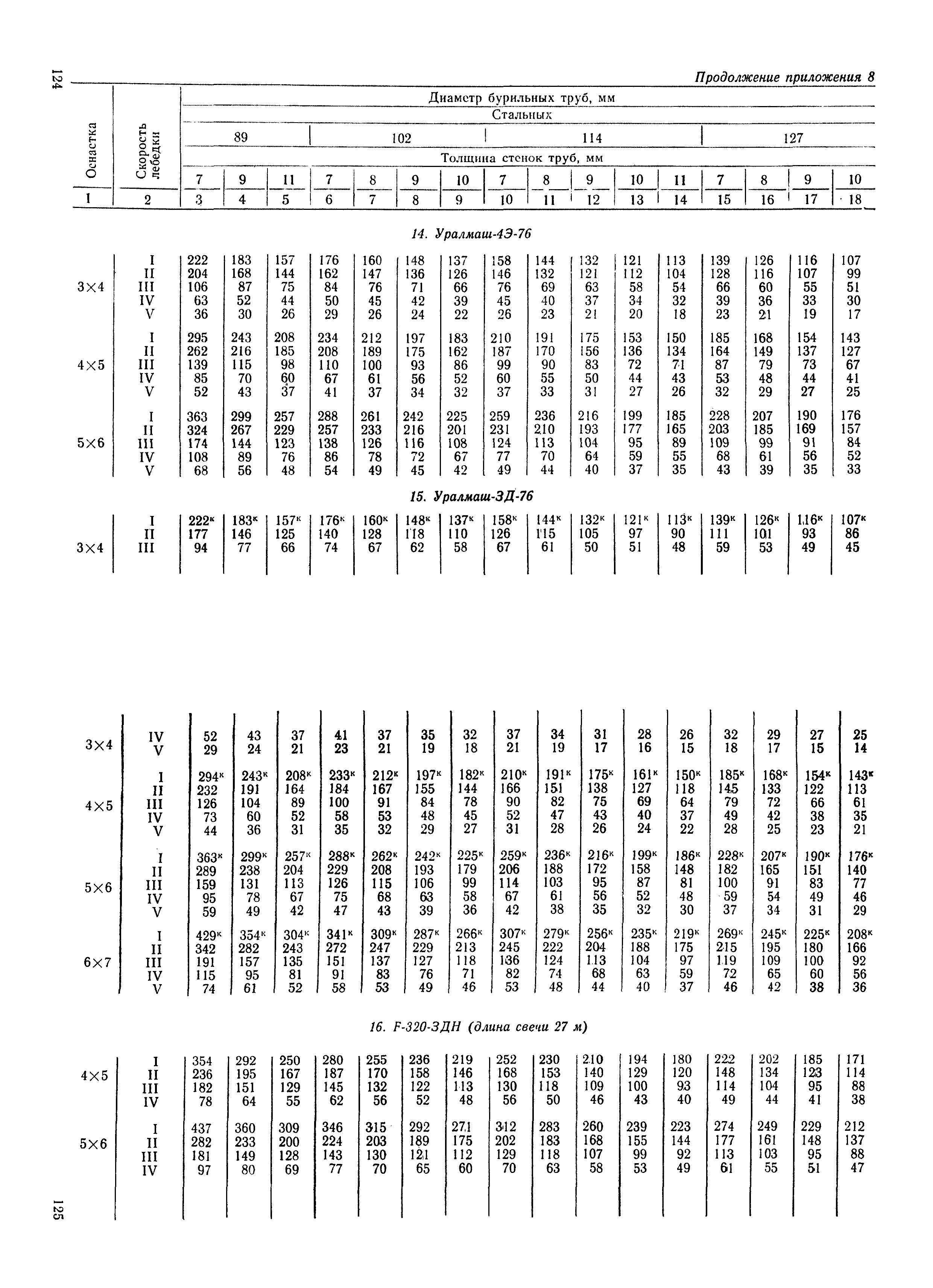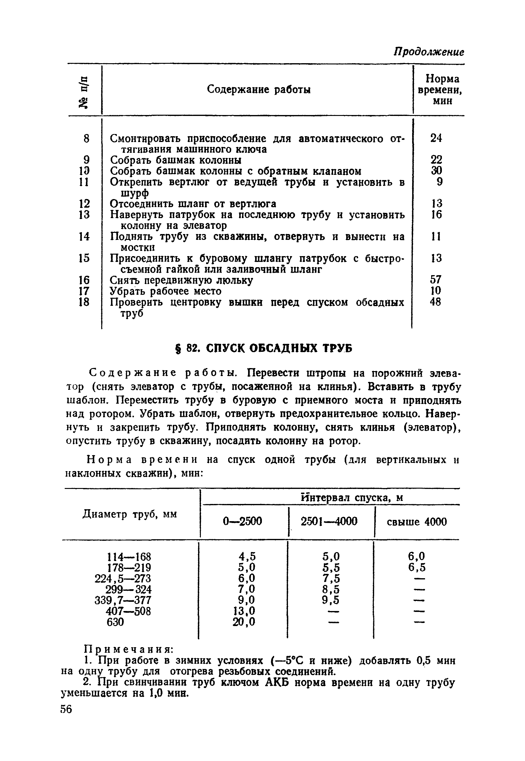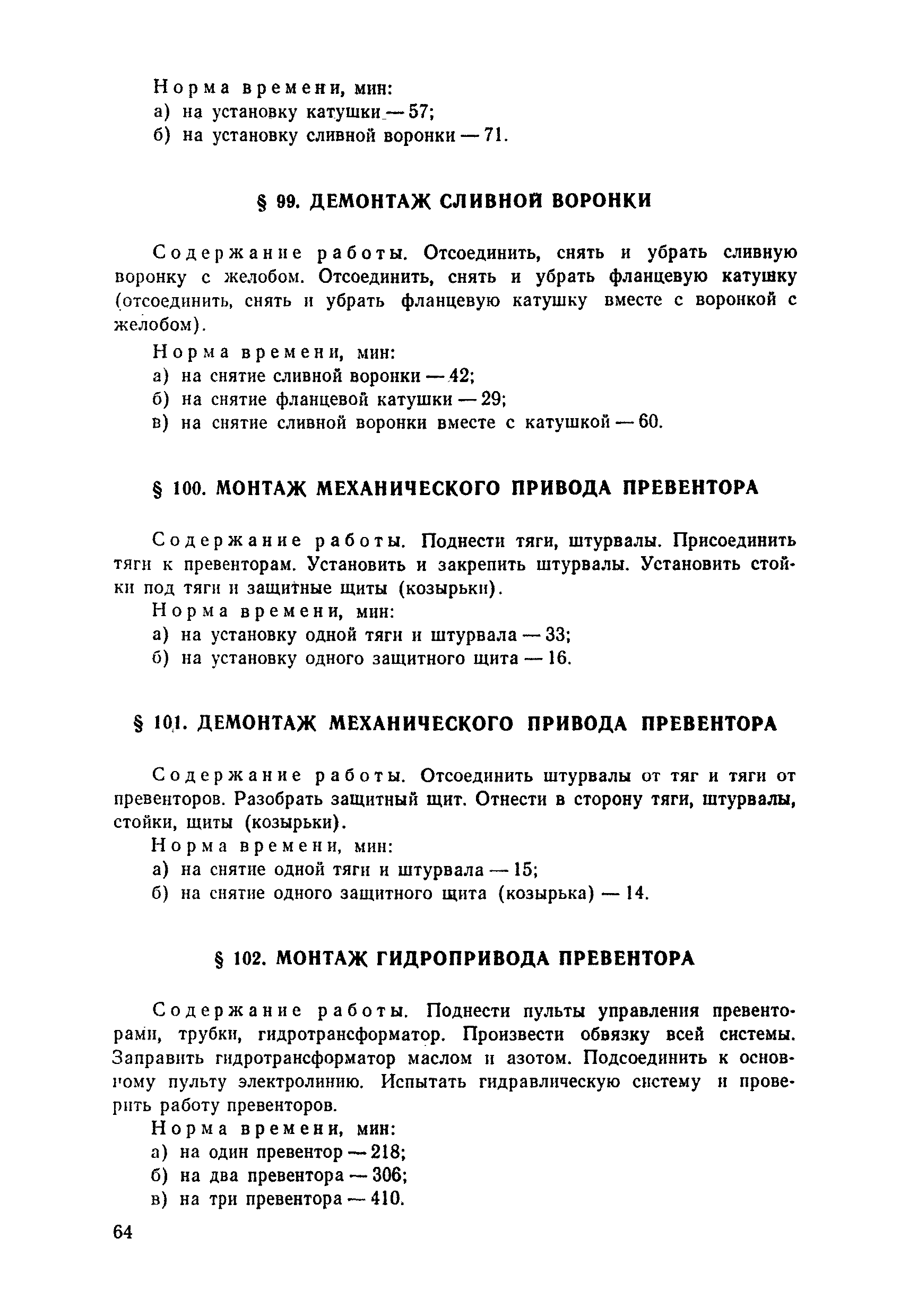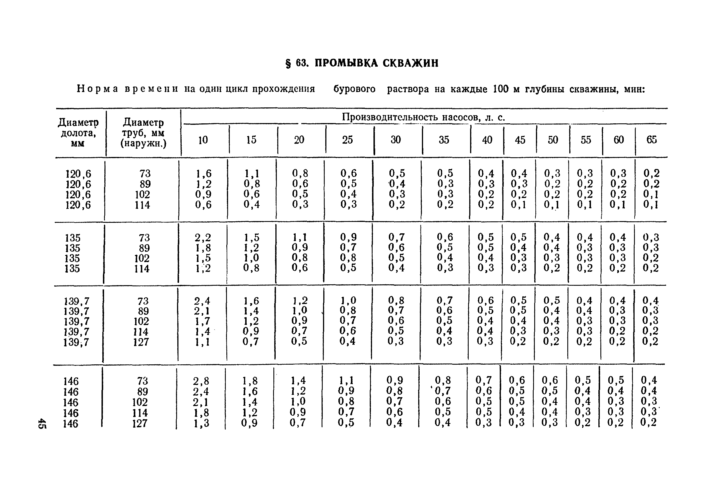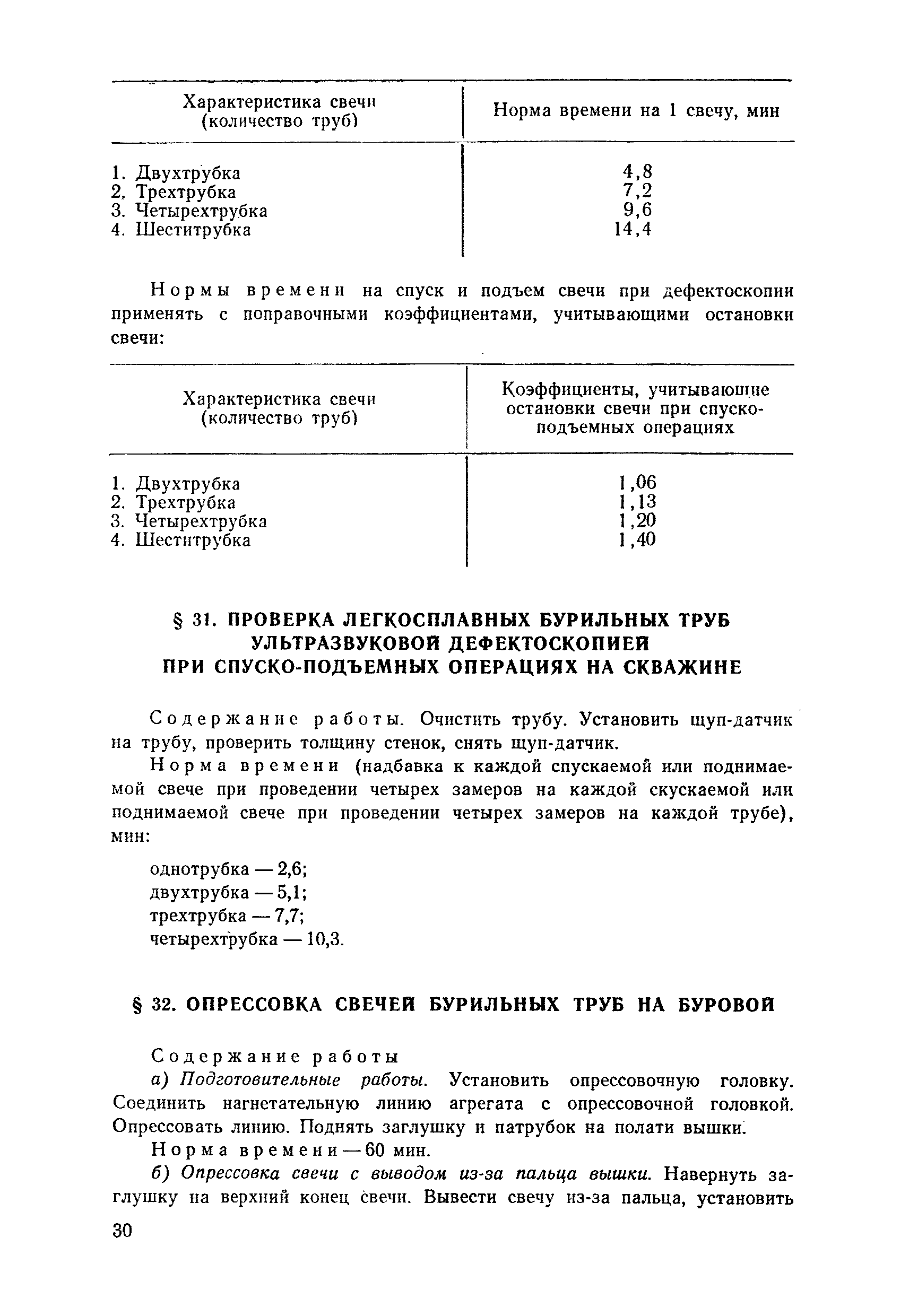 Единые нормы времени на бурение скважин на нефть, газ и другие полезные ископаемые| Статус: | не действует | | Название рус.: | Единые нормы времени на бурение скважин на нефть, газ и другие полезные ископаемые | | Дата добавления в базу: | 01.01.2018 | | Дата актуализации: | 01.01.2021 | | Область применения: | Единые нормы времени на основные виды работ, выполняемые при бурении разведочных, эксплуатационных, опорных, параметрических скважин с применением как роторного способа бурения, так и забойных двигателей, являются обязательными для применения на предприятиях и в организациях, выполняющих указанные работы, независимо от их ведомственной подчиненности и служат для нормирования труда рабочих, находящихся на сдельной оплате труда, а также для разработки нормированных заданий при по- временной оплате труда. Нормы настоящего сборника могут быть использованы для расчета комплексных норм времени. | | Оглавление: | 1. Общая часть 2. Организация труда 3. Нормативная часть 3.1. Нормы времени на подготовительно-заключительные и вспомогательные работы § 1. Подготовительные работы к бурению скважин § 2. Подготовительные работы перед спуском инструмента § 3. Заключительные работы после спуска инструмента § 4. Подготовительные работы перед подъемом инструмента § 5. Наращивание инструмента § 6. Отвертывание долота. Проверка забойного двигателя и укладка на приемный мост § 7. Подъем забойного двигателя в буровую с приемного моста, навертывание долота § 8. Сборка секционного турбобура § 9. Разборка секционного турбобура § 10. Сборка электробура для наклонно-направленного бурения § 11. Разборка электробура для наклонно-направленного бурения § 12. Проверка забойных двигателей § 13. Смена шпинделя турбобура § 14. Сборка колонкового снаряда при роторном бурении и бурении турбобуром с колонковой трубой § 15. Разборка колонкового снаряда при бурении ротором или турбобуром с колонковой трубой (надставкой) § 16. Сборка колонкового турбодолота § 17. Разборка колонкового турбодолота § 18. Подъем и спуск съемной грунтоноски § 19. Сборка колонковых снарядов типа «Недра» и «СКУ» § 20. Разборка колонковых снарядов типа «Недра» и «СКУ» § 21. Сборка утяжеленных бурильных труб § 22. Разборка утяжеленных бурильных труб § 23. Установка утяжеленных бурильных труб за палец § 24. Вывод утяжеленных бурильных труб из-за пальца и спуск в скважину § 25. Спуск утяжеленных бурильных труб в дополнительный шурф (длина свечи 25 м) § 26. Подъем утяжеленных бурильных труб из дополнительного шурфа (длина свечи 25 м) § 27. Подготовительно-заключительные работы при сборке и разборке колонны бурильных труб в скважине или в шурфе при смене диаметра бурильных труб § 28. Сборка колонны бурильных труб § 29. Разборка колонны бурильных труб § 30. Проверка резьбовых соединений бурильных труб ультразвуковой дефектоскопией при спуско-подъемных операциях на скважине § 31. Проверка легкосплавных бурильных труб ультразвуковой дефектоскопией при спуско-подъемных операциях на скважине § 32. Опрессовка свечей бурильных труб на буровой § 33. Сборка элементов компоновки бурильной колонны (расширителей, стабилизаторов, калибраторов, удлинителей, центраторов) § 34. Разборка элементов компоновки бурильной колонны (расширителей, стабилизаторов, калибраторов, удлинителей, центраторов) § 35. Навертывание, отвертывание переводников или вс