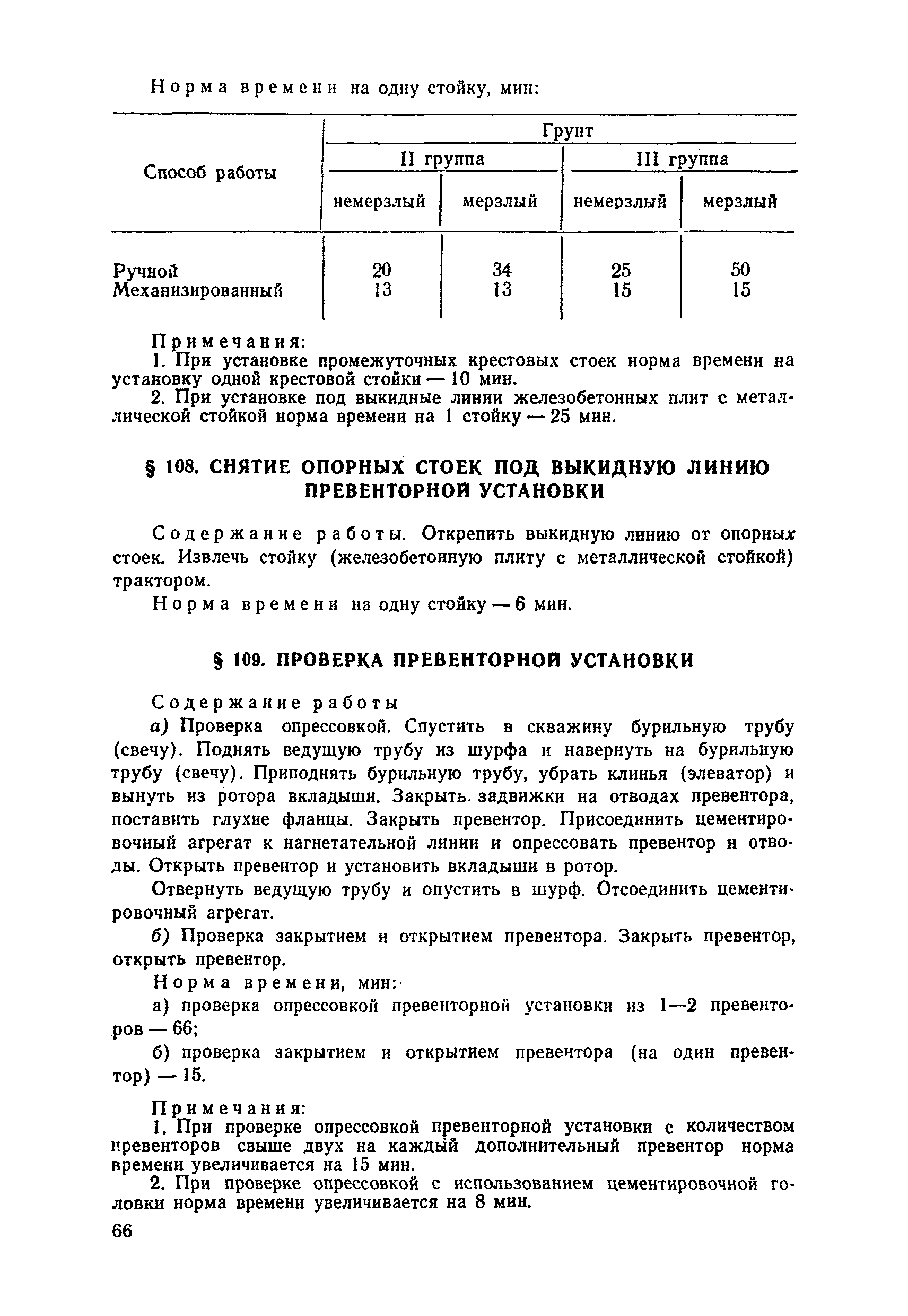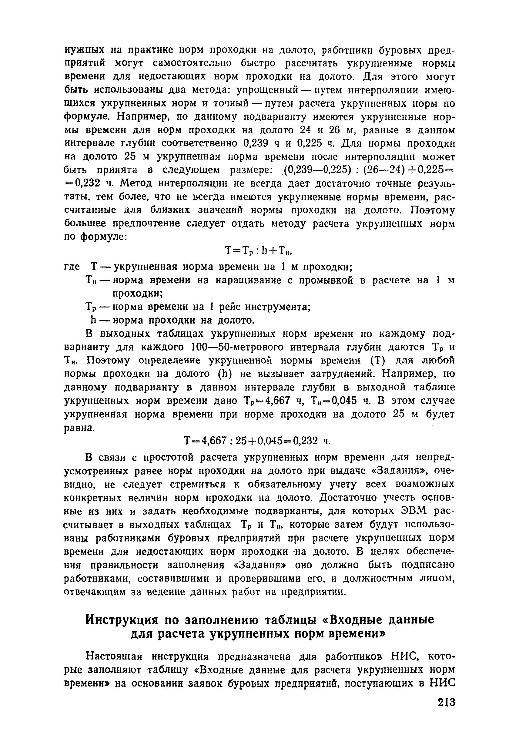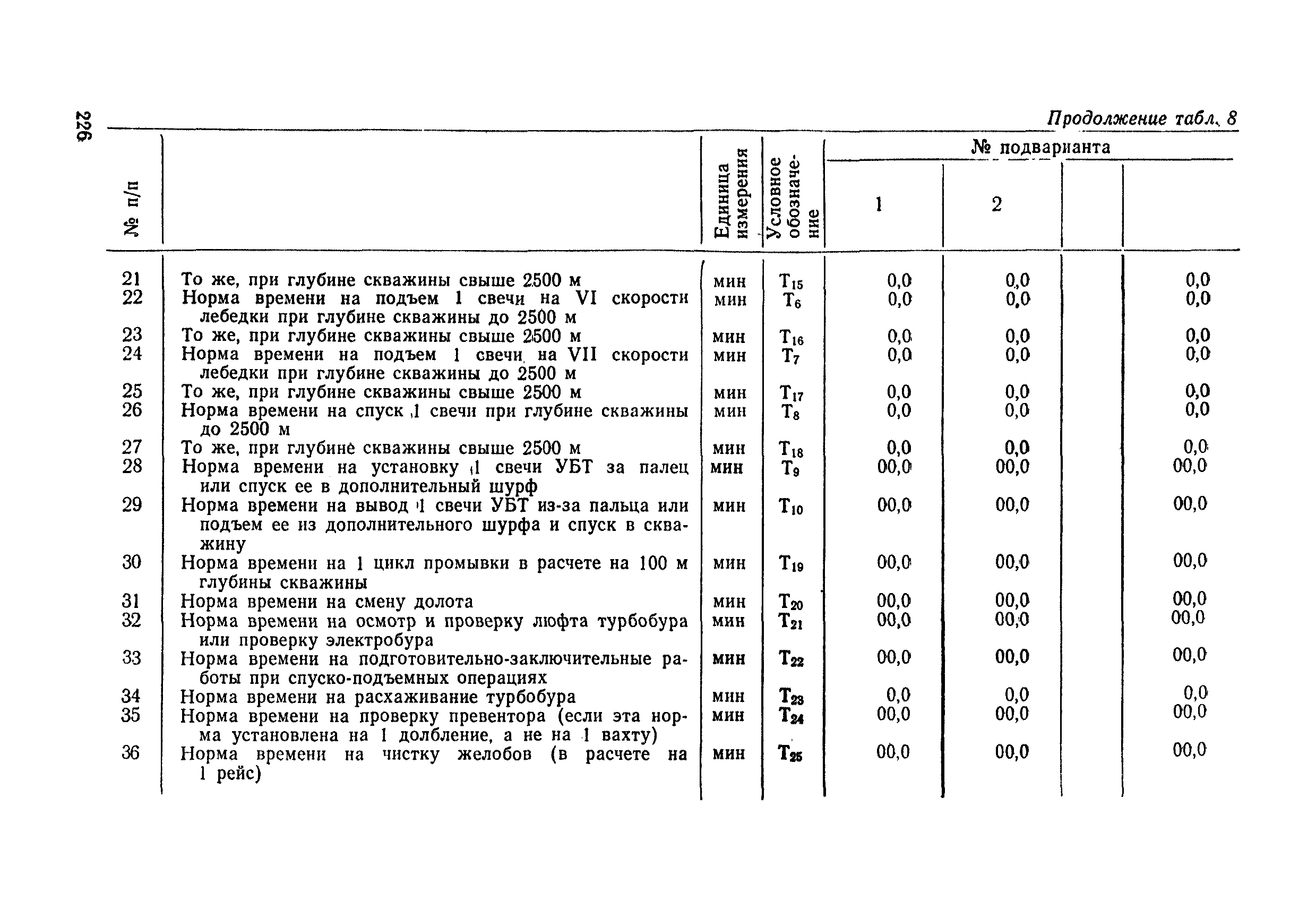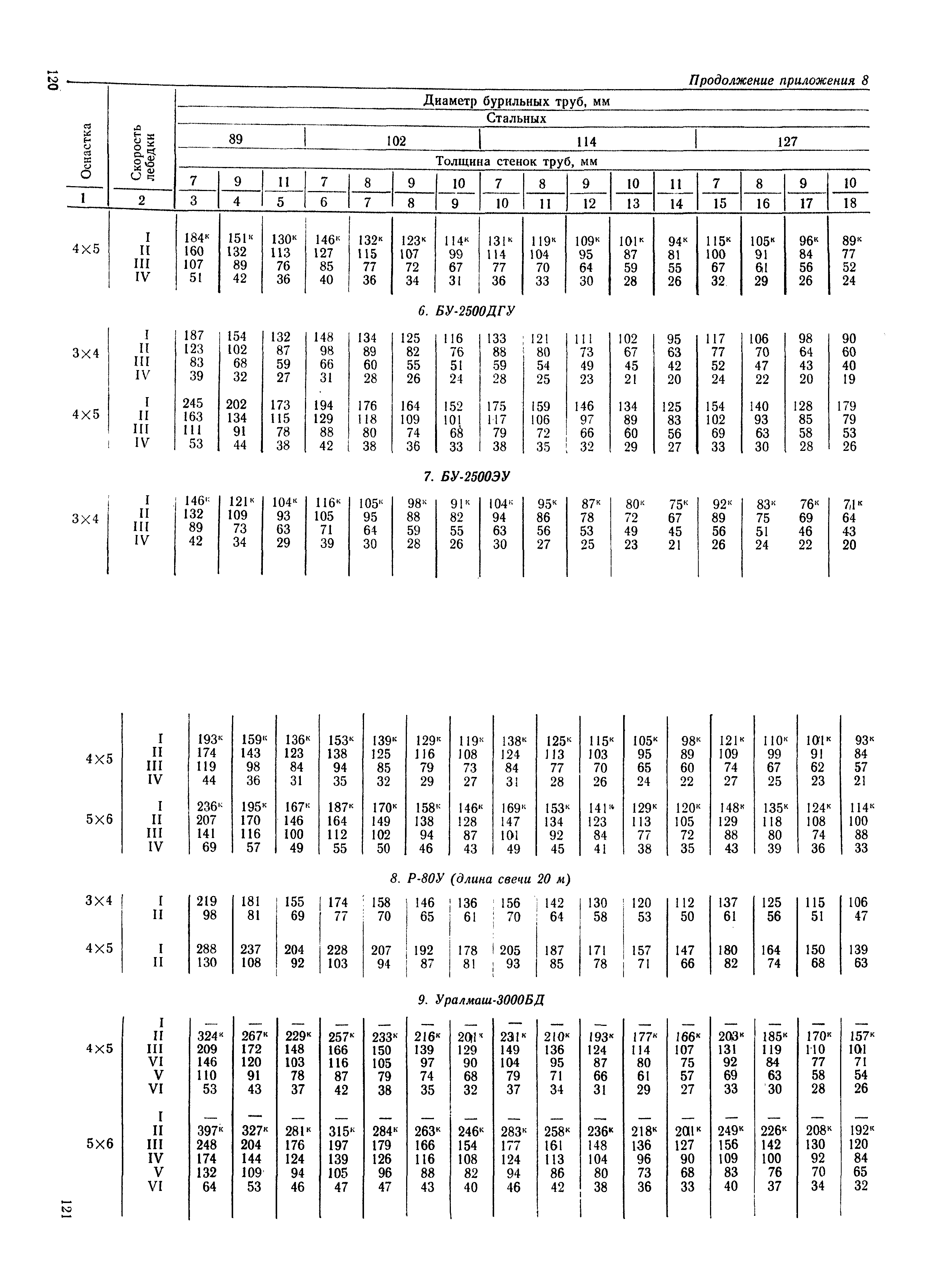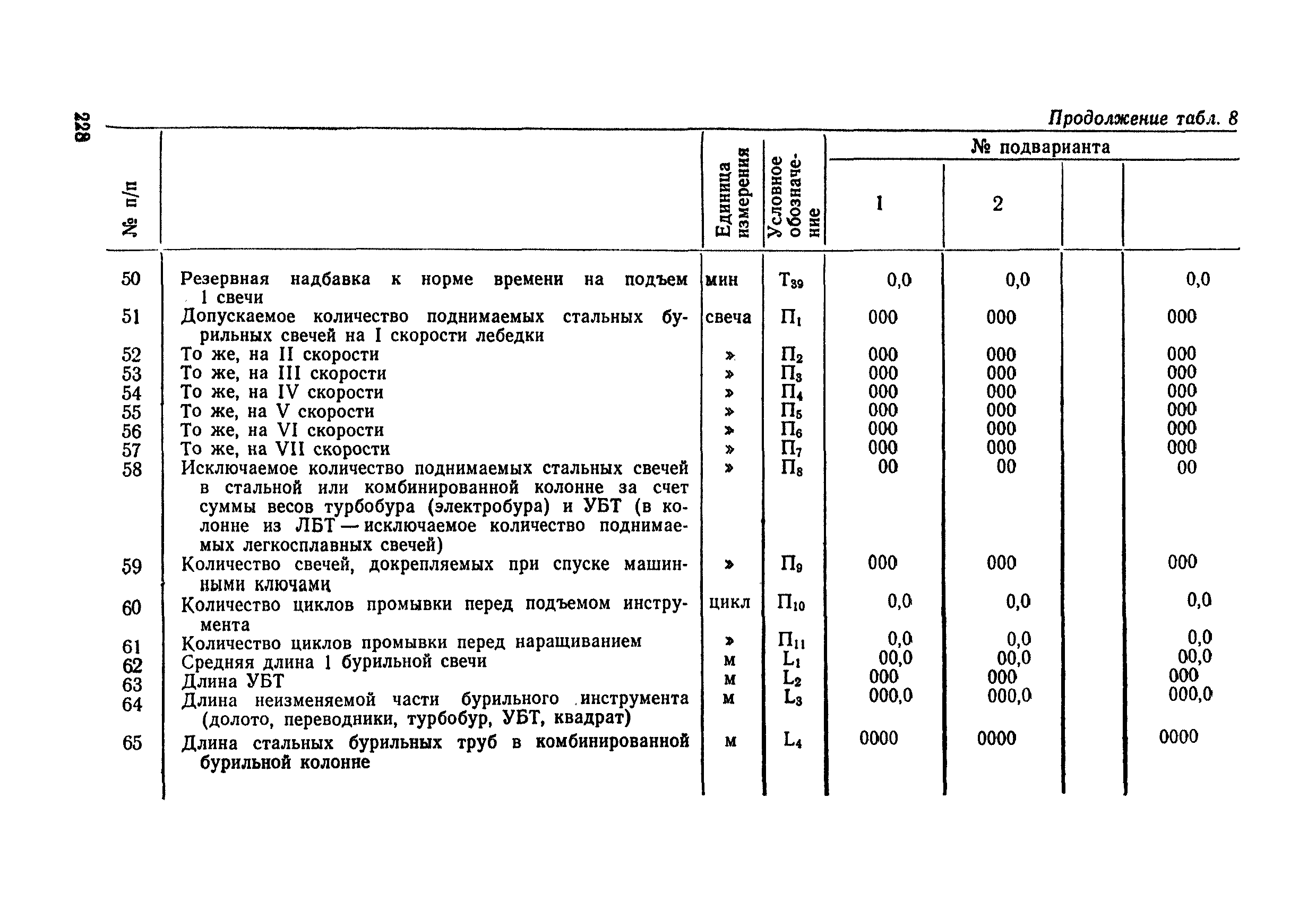Единые нормы времени на бурение скважин на нефть, газ и другие полезные ископаемые| Статус: | не действует | | Название рус.: | Единые нормы времени на бурение скважин на нефть, газ и другие полезные ископаемые | | Дата добавления в базу: | 01.01.2018 | | Дата актуализации: | 01.01.2021 | | Область применения: | Единые нормы времени на основные виды работ, выполняемые при бурении разведочных, эксплуатационных, опорных, параметрических скважин с применением как роторного способа бурения, так и забойных двигателей, являются обязательными для применения на предприятиях и в организациях, выполняющих указанные работы, независимо от их ведомственной подчиненности и служат для нормирования труда рабочих, находящихся на сдельной оплате труда, а также для разработки нормированных заданий при по- временной оплате труда. Нормы настоящего сборника могут быть использованы для расчета комплексных норм времени. | | Оглавление: | 1. Общая часть 2. Организация труда 3. Нормативная часть 3.1. Нормы времени на подготовительно-заключительные и вспомогательные работы § 1. Подготовительные работы к бурению скважин § 2. Подготовительные работы перед спуском инструмента § 3. Заключительные работы после спуска инструмента § 4. Подготовительные работы перед подъемом инструмента § 5. Наращивание инструмента § 6. Отвертывание долота. Проверка забойного двигателя и укладка на приемный мост § 7. Подъем забойного двигателя в буровую с приемного моста, навертывание долота § 8. Сборка секционного турбобура § 9. Разборка секционного турбобура § 10. Сборка электробура для наклонно-направленного бурения § 11. Разборка электробура для наклонно-направленного бурения § 12. Проверка забойных двигателей § 13. Смена шпинделя турбобура § 14. Сборка колонкового снаряда при роторном бурении и бурении турбобуром с колонковой трубой § 15. Разборка колонкового снаряда при бурении ротором или турбобуром с колонковой трубой (надставкой) § 16. Сборка колонкового турбодолота § 17. Разборка колонкового турбодолота § 18. Подъем и спуск съемной грунтоноски § 19. Сборка колонковых снарядов типа «Недра» и «СКУ» § 20. Разборка колонковых снарядов типа «Недра» и «СКУ» § 21. Сборка утяжеленных бурильных труб § 22. Разборка утяжеленных бурильных труб § 23. Установка утяжеленных бурильных труб за палец § 24. Вывод утяжеленных бурильных труб из-за пальца и спуск в скважину § 25. Спуск утяжеленных бурильных труб в дополнительный шурф (длина свечи 25 м) § 26. Подъем утяжеленных бурильных труб из дополнительного шурфа (длина свечи 25 м) § 27. Подготовительно-заключительные работы при сборке и разборке колонны бурильных труб в скважине или в шурфе при смене диаметра бурильных труб § 28. Сборка колонны бурильных труб § 29. Разборка колонны бурильных труб § 30. Проверка резьбовых соединений бурильных труб ультразвуковой дефектоскопией при спуско-подъемных операциях на скважине § 31. Проверка легкосплавных бурильных труб ультразвуковой дефектоскопией при спуско-подъемных операциях на скважине § 32. Опрессовка свечей бурильных труб на буровой § 33. Сборка элементов компоновки бурильной колонны (расширителей, стабилизаторов, калибраторов, удлинителей, центраторов) § 34. Разборка элементов компоновки бурильной колонны (расширителей, стабилизаторов, калибраторов, удлинителей, центраторов) § 35. Навертывание, отвертывание переводников или вс