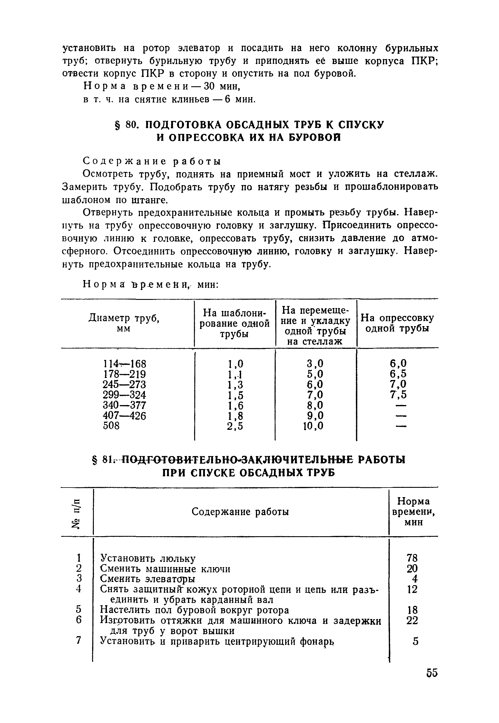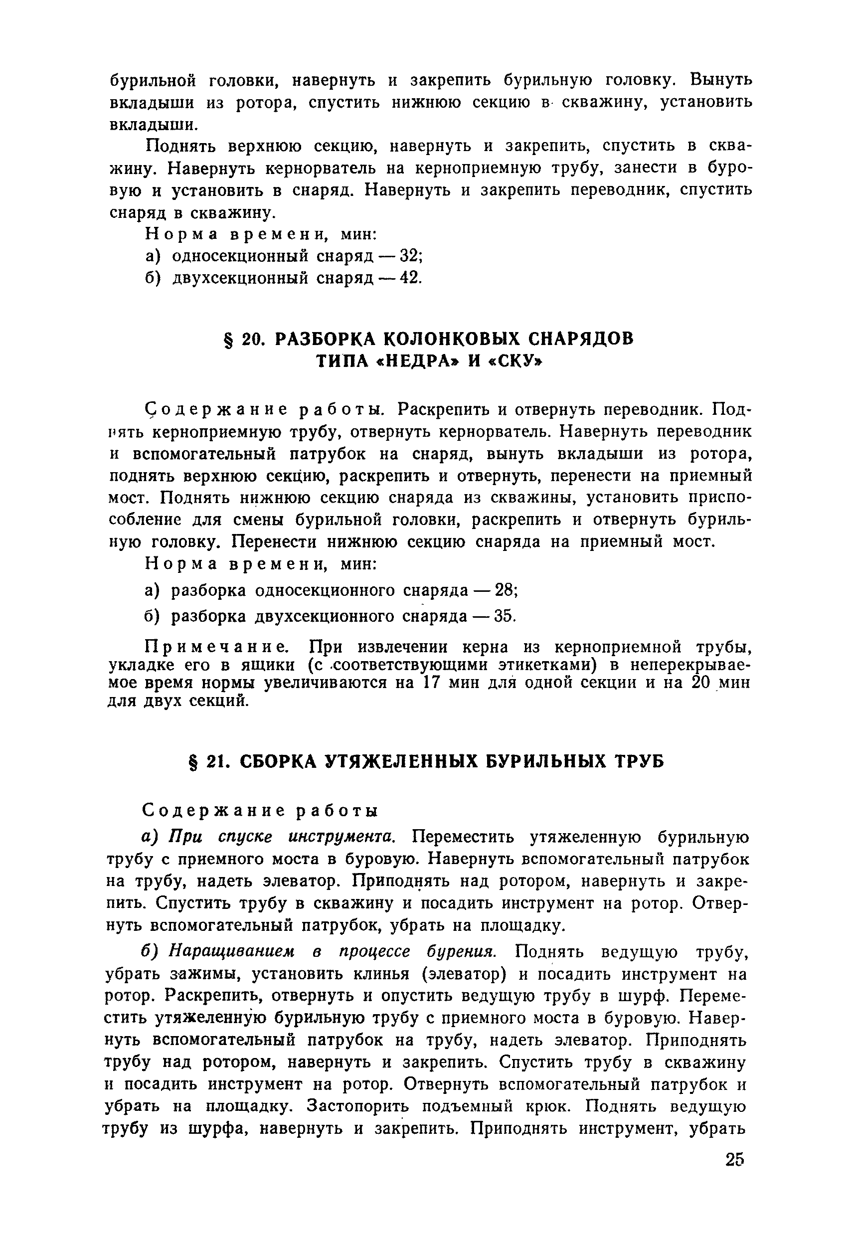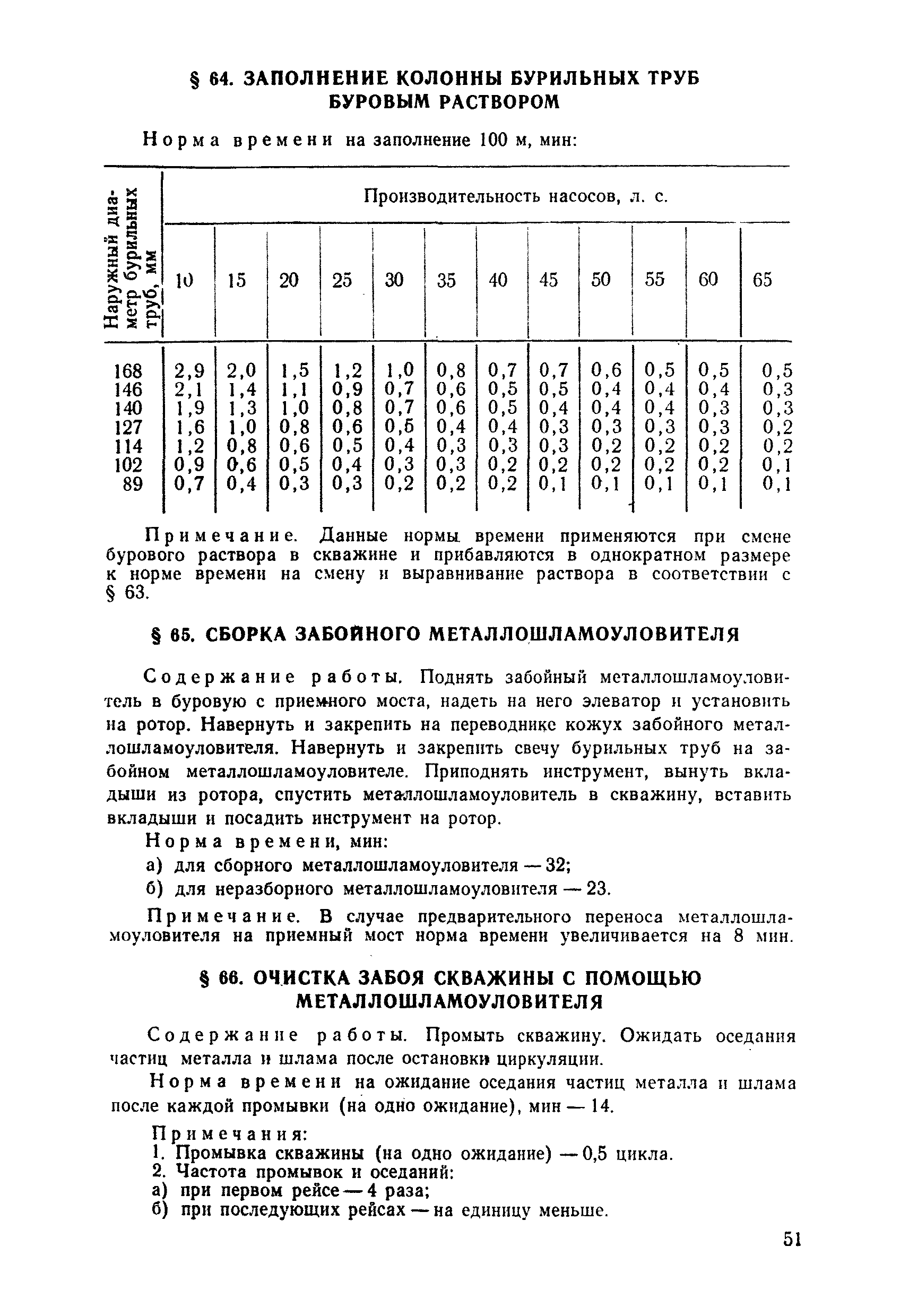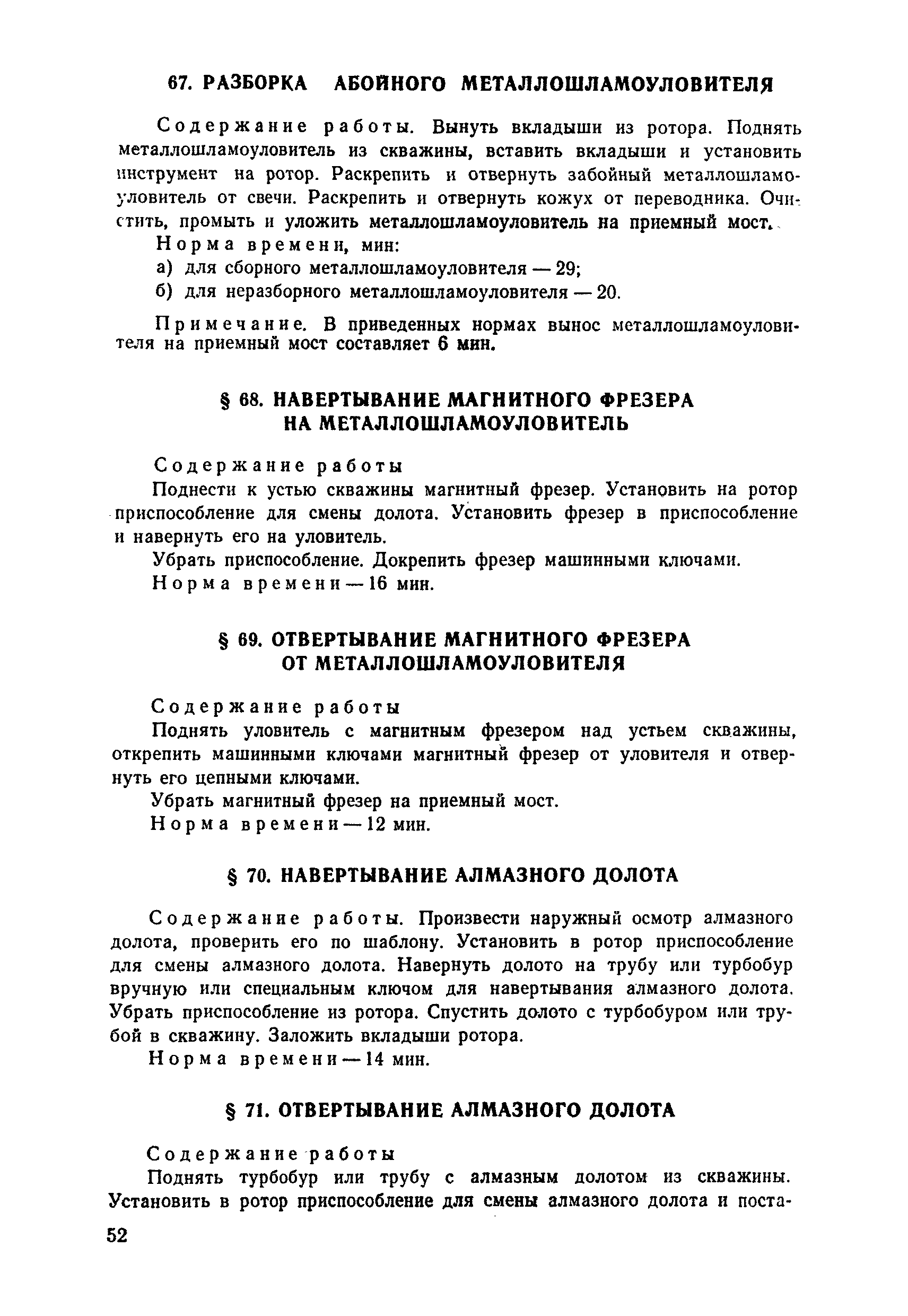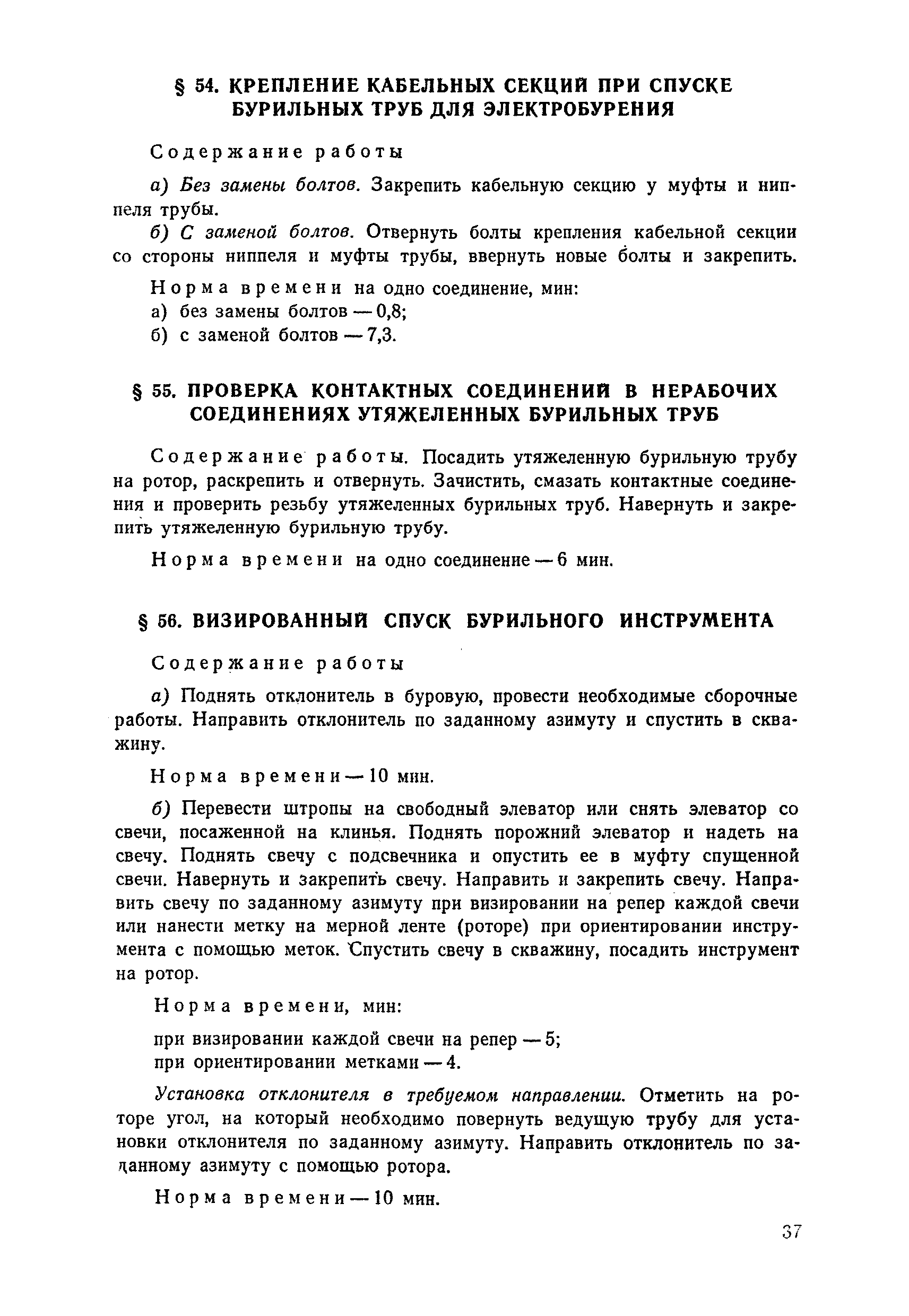 Единые нормы времени на бурение скважин на нефть, газ и другие полезные ископаемые| Статус: | не действует | | Название рус.: | Единые нормы времени на бурение скважин на нефть, газ и другие полезные ископаемые | | Дата добавления в базу: | 01.01.2018 | | Дата актуализации: | 01.01.2021 | | Область применения: | Единые нормы времени на основные виды работ, выполняемые при бурении разведочных, эксплуатационных, опорных, параметрических скважин с применением как роторного способа бурения, так и забойных двигателей, являются обязательными для применения на предприятиях и в организациях, выполняющих указанные работы, независимо от их ведомственной подчиненности и служат для нормирования труда рабочих, находящихся на сдельной оплате труда, а также для разработки нормированных заданий при по- временной оплате труда. Нормы настоящего сборника могут быть использованы для расчета комплексных норм времени. | | Оглавление: | 1. Общая часть 2. Организация труда 3. Нормативная часть 3.1. Нормы времени на подготовительно-заключительные и вспомогательные работы § 1. Подготовительные работы к бурению скважин § 2. Подготовительные работы перед спуском инструмента § 3. Заключительные работы после спуска инструмента § 4. Подготовительные работы перед подъемом инструмента § 5. Наращивание инструмента § 6. Отвертывание долота. Проверка забойного двигателя и укладка на приемный мост § 7. Подъем забойного двигателя в буровую с приемного моста, навертывание долота § 8. Сборка секционного турбобура § 9. Разборка секционного турбобура § 10. Сборка электробура для наклонно-направленного бурения § 11. Разборка электробура для наклонно-направленного бурения § 12. Проверка забойных двигателей § 13. Смена шпинделя турбобура § 14. Сборка колонкового снаряда при роторном бурении и бурении турбобуром с колонковой трубой § 15. Разборка колонкового снаряда при бурении ротором или турбобуром с колонковой трубой (надставкой) § 16. Сборка колонкового турбодолота § 17. Разборка колонкового турбодолота § 18. Подъем и спуск съемной грунтоноски § 19. Сборка колонковых снарядов типа «Недра» и «СКУ» § 20. Разборка колонковых снарядов типа «Недра» и «СКУ» § 21. Сборка утяжеленных бурильных труб § 22. Разборка утяжеленных бурильных труб § 23. Установка утяжеленных бурильных труб за палец § 24. Вывод утяжеленных бурильных труб из-за пальца и спуск в скважину § 25. Спуск утяжеленных бурильных труб в дополнительный шурф (длина свечи 25 м) § 26. Подъем утяжеленных бурильных труб из дополнительного шурфа (длина свечи 25 м) § 27. Подготовительно-заключительные работы при сборке и разборке колонны бурильных труб в скважине или в шурфе при смене диаметра бурильных труб § 28. Сборка колонны бурильных труб § 29. Разборка колонны бурильных труб § 30. Проверка резьбовых соединений бурильных труб ультразвуковой дефектоскопией при спуско-подъемных операциях на скважине § 31. Проверка легкосплавных бурильных труб ультразвуковой дефектоскопией при спуско-подъемных операциях на скважине § 32. Опрессовка свечей бурильных труб на буровой § 33. Сборка элементов компоновки бурильной колонны (расширителей, стабилизаторов, калибраторов, удлинителей, центраторов) § 34. Разборка элементов компоновки бурильной колонны (расширителей, стабилизаторов, калибраторов, удлинителей, центраторов) § 35. Навертывание, отвертывание переводников или вс