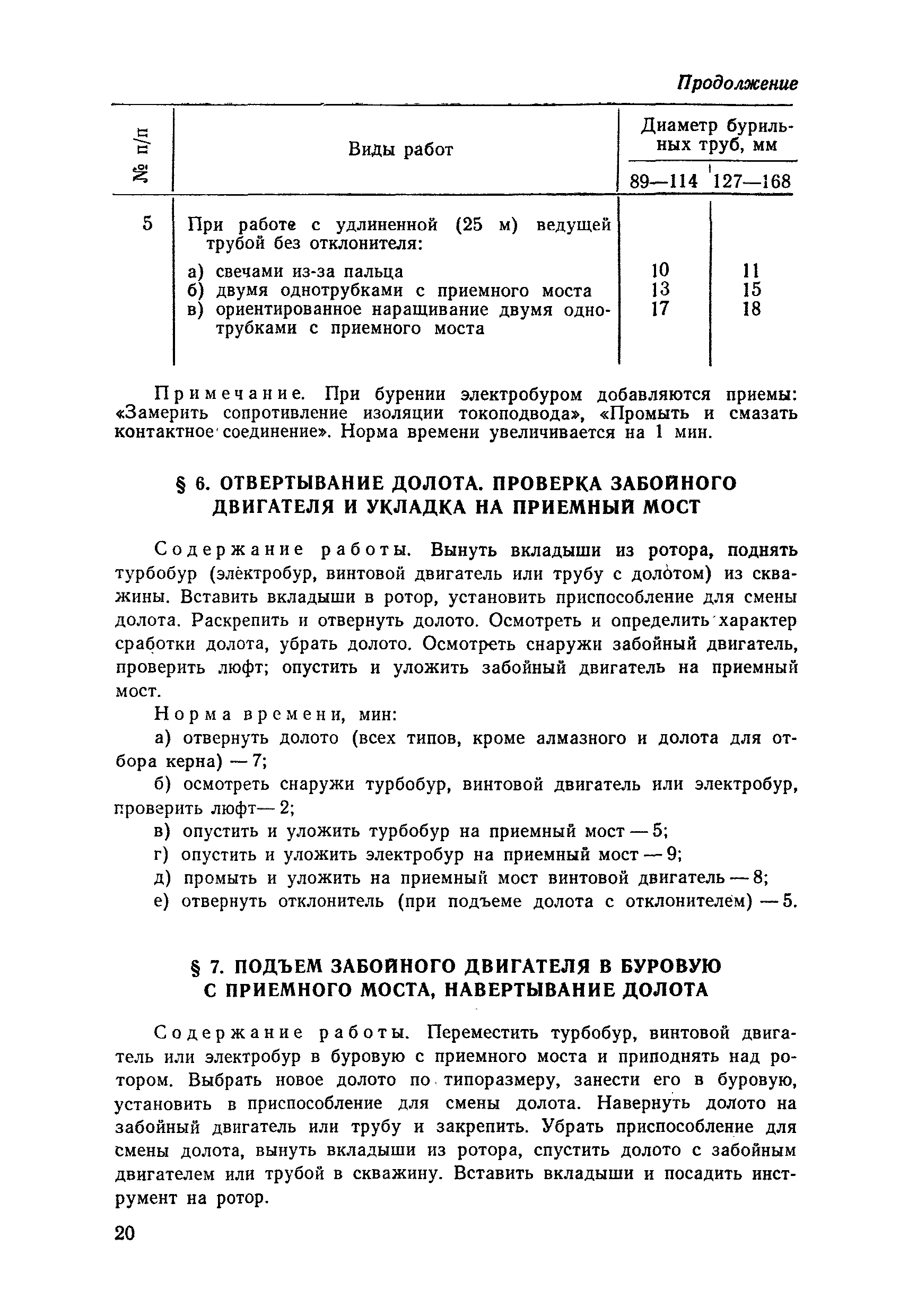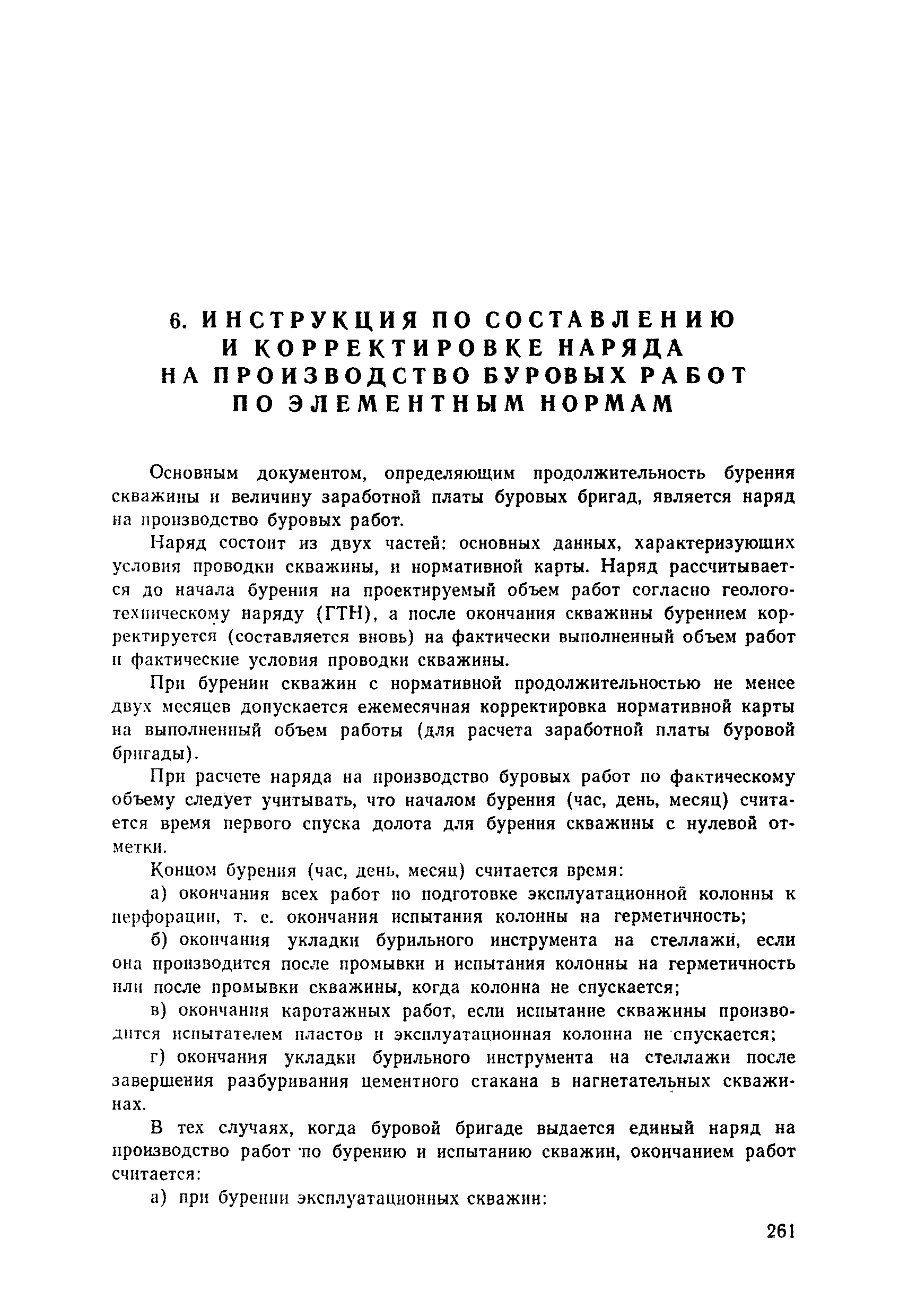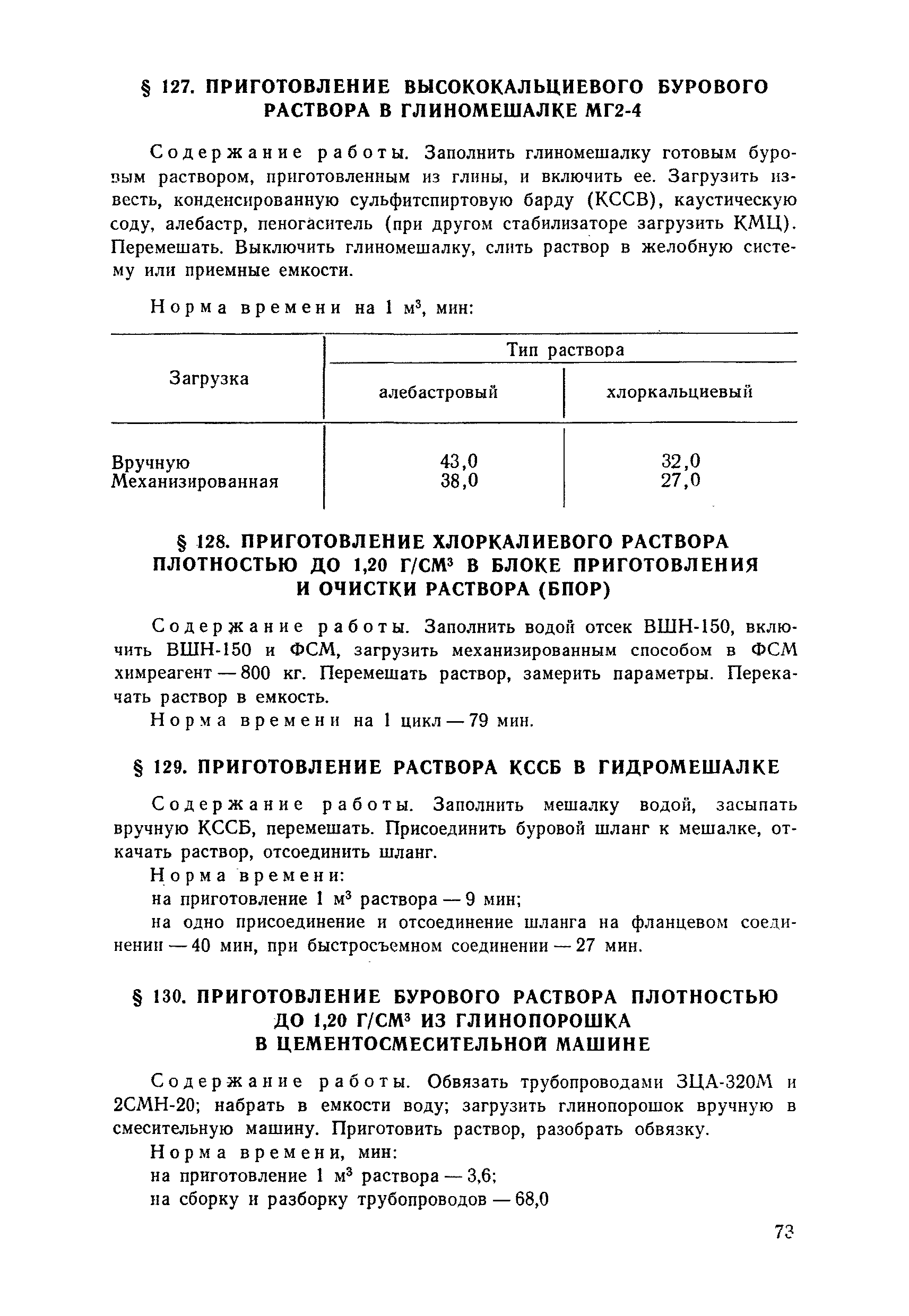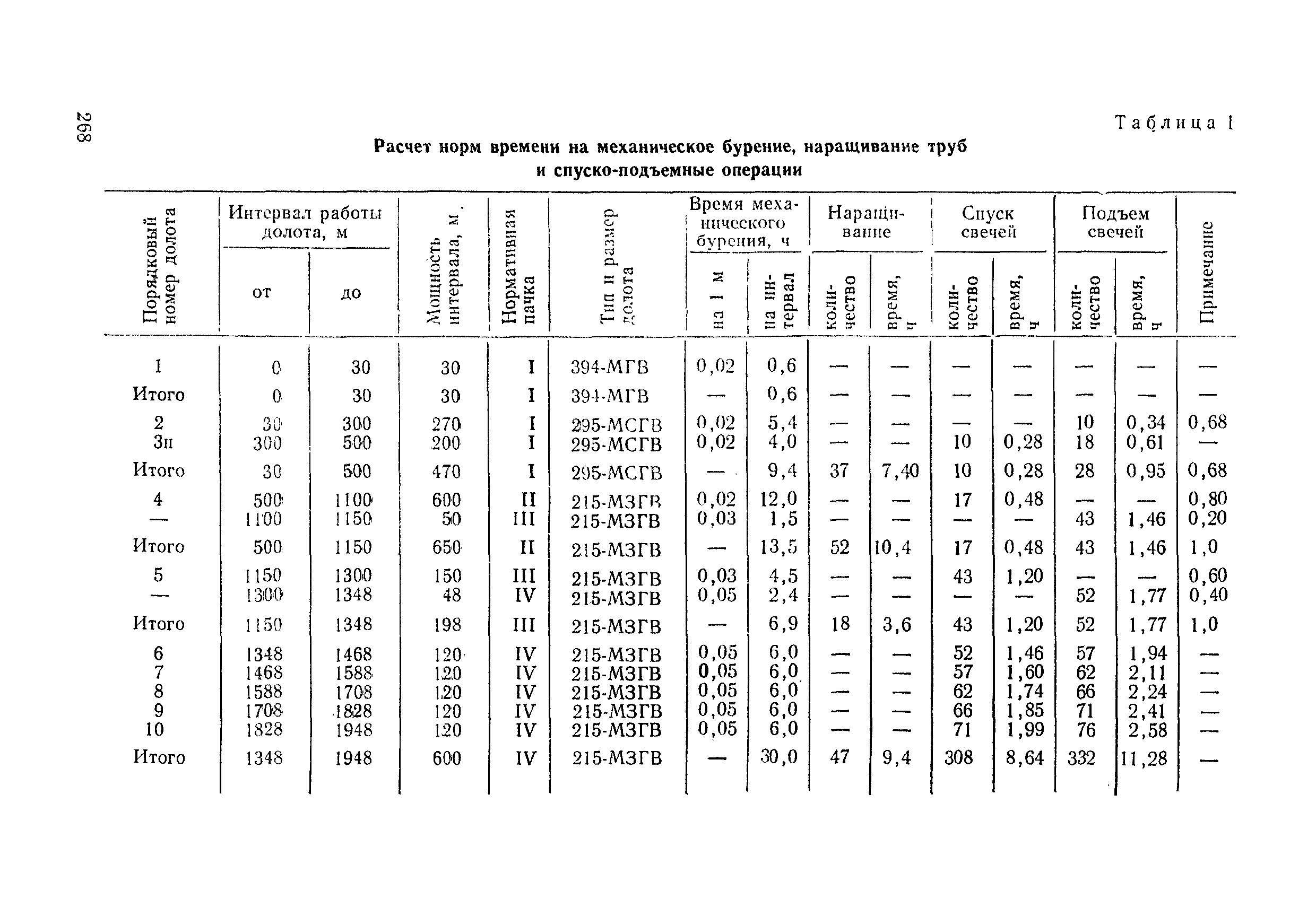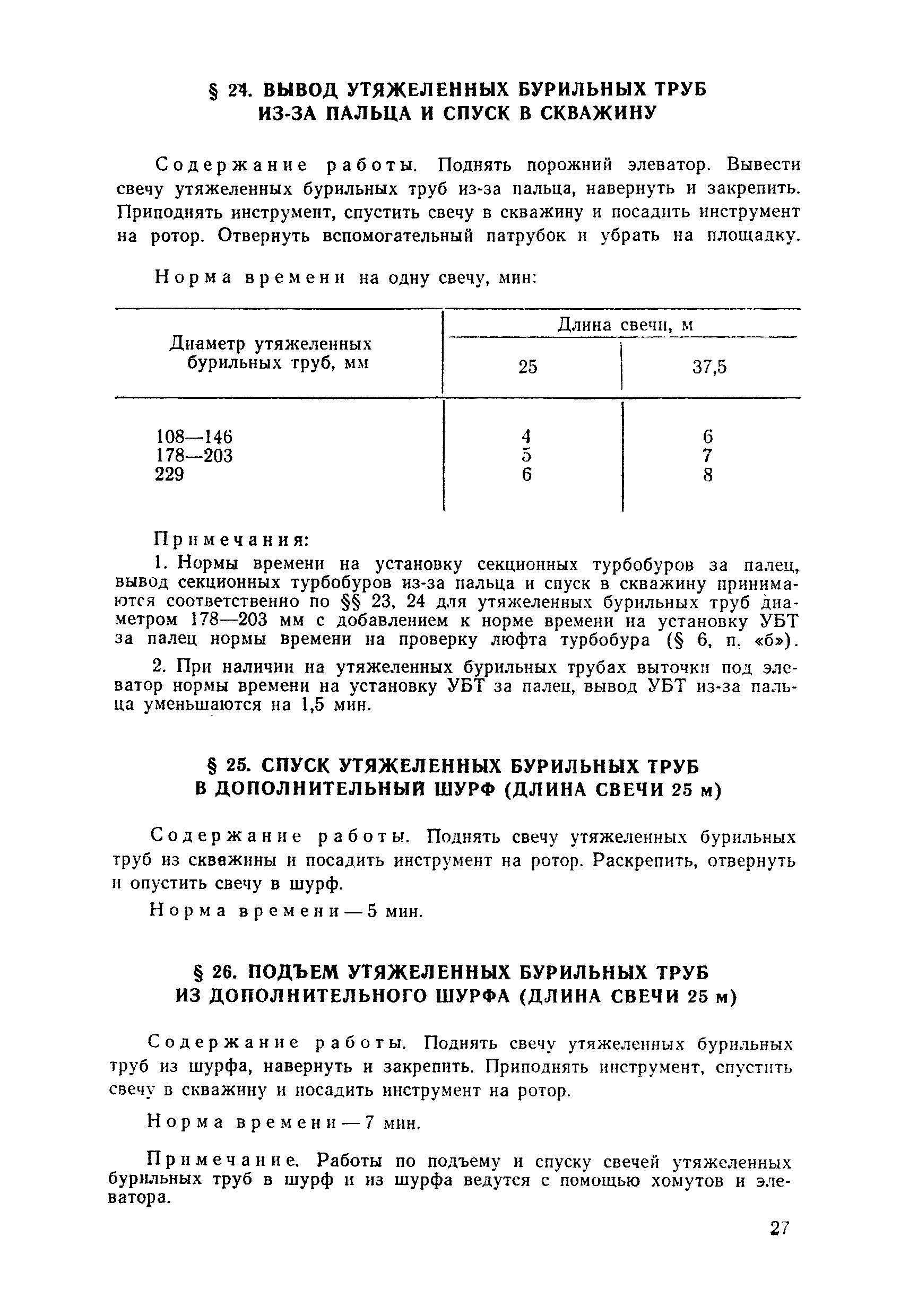 Единые нормы времени на бурение скважин на нефть, газ и другие полезные ископаемые| Статус: | не действует | | Название рус.: | Единые нормы времени на бурение скважин на нефть, газ и другие полезные ископаемые | | Дата добавления в базу: | 01.01.2018 | | Дата актуализации: | 01.01.2021 | | Область применения: | Единые нормы времени на основные виды работ, выполняемые при бурении разведочных, эксплуатационных, опорных, параметрических скважин с применением как роторного способа бурения, так и забойных двигателей, являются обязательными для применения на предприятиях и в организациях, выполняющих указанные работы, независимо от их ведомственной подчиненности и служат для нормирования труда рабочих, находящихся на сдельной оплате труда, а также для разработки нормированных заданий при по- временной оплате труда. Нормы настоящего сборника могут быть использованы для расчета комплексных норм времени. | | Оглавление: | 1. Общая часть 2. Организация труда 3. Нормативная часть 3.1. Нормы времени на подготовительно-заключительные и вспомогательные работы § 1. Подготовительные работы к бурению скважин § 2. Подготовительные работы перед спуском инструмента § 3. Заключительные работы после спуска инструмента § 4. Подготовительные работы перед подъемом инструмента § 5. Наращивание инструмента § 6. Отвертывание долота. Проверка забойного двигателя и укладка на приемный мост § 7. Подъем забойного двигателя в буровую с приемного моста, навертывание долота § 8. Сборка секционного турбобура § 9. Разборка секционного турбобура § 10. Сборка электробура для наклонно-направленного бурения § 11. Разборка электробура для наклонно-направленного бурения § 12. Проверка забойных двигателей § 13. Смена шпинделя турбобура § 14. Сборка колонкового снаряда при роторном бурении и бурении турбобуром с колонковой трубой § 15. Разборка колонкового снаряда при бурении ротором или турбобуром с колонковой трубой (надставкой) § 16. Сборка колонкового турбодолота § 17. Разборка колонкового турбодолота § 18. Подъем и спуск съемной грунтоноски § 19. Сборка колонковых снарядов типа «Недра» и «СКУ» § 20. Разборка колонковых снарядов типа «Недра» и «СКУ» § 21. Сборка утяжеленных бурильных труб § 22. Разборка утяжеленных бурильных труб § 23. Установка утяжеленных бурильных труб за палец § 24. Вывод утяжеленных бурильных труб из-за пальца и спуск в скважину § 25. Спуск утяжеленных бурильных труб в дополнительный шурф (длина свечи 25 м) § 26. Подъем утяжеленных бурильных труб из дополнительного шурфа (длина свечи 25 м) § 27. Подготовительно-заключительные работы при сборке и разборке колонны бурильных труб в скважине или в шурфе при смене диаметра бурильных труб § 28. Сборка колонны бурильных труб § 29. Разборка колонны бурильных труб § 30. Проверка резьбовых соединений бурильных труб ультразвуковой дефектоскопией при спуско-подъемных операциях на скважине § 31. Проверка легкосплавных бурильных труб ультразвуковой дефектоскопией при спуско-подъемных операциях на скважине § 32. Опрессовка свечей бурильных труб на буровой § 33. Сборка элементов компоновки бурильной колонны (расширителей, стабилизаторов, калибраторов, удлинителей, центраторов) § 34. Разборка элементов компоновки бурильной колонны (расширителей, стабилизаторов, калибраторов, удлинителей, центраторов) § 35. Навертывание, отвертывание переводников или вс