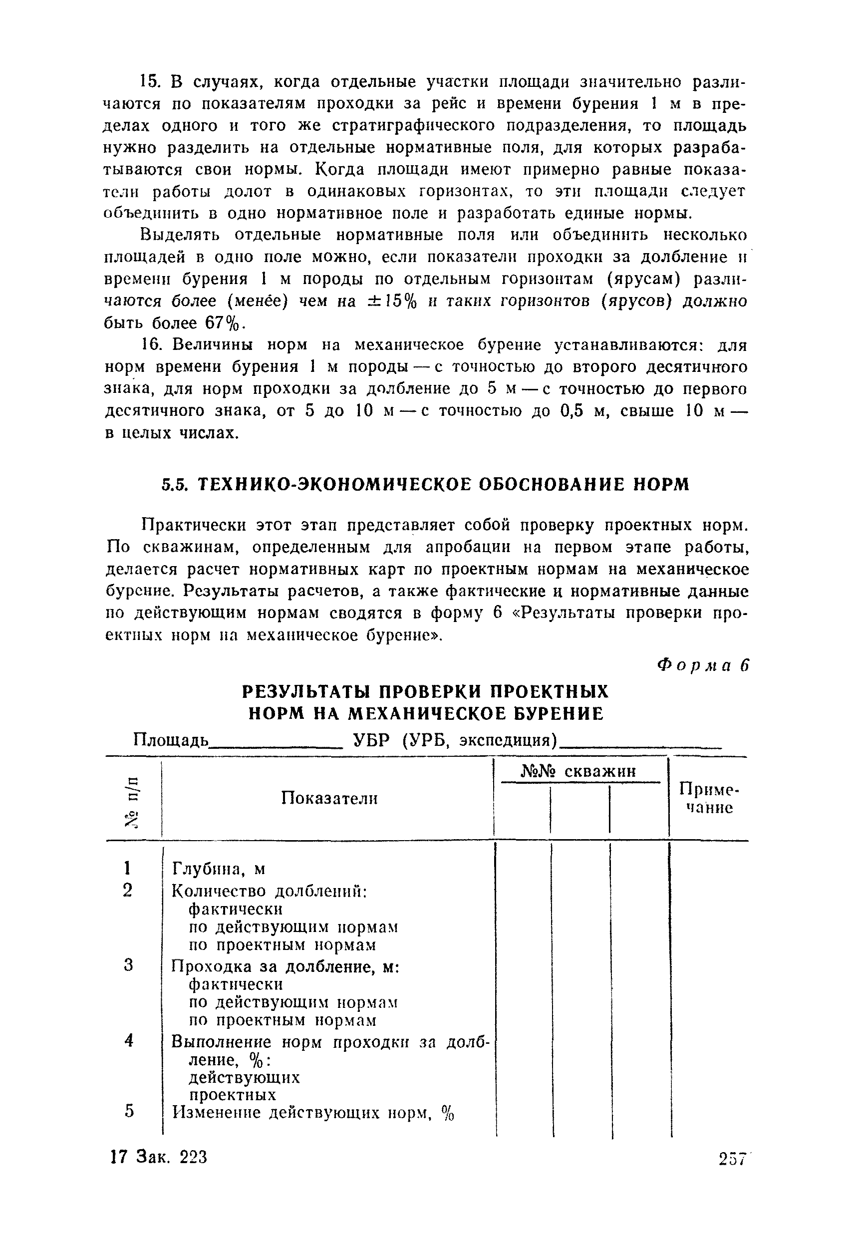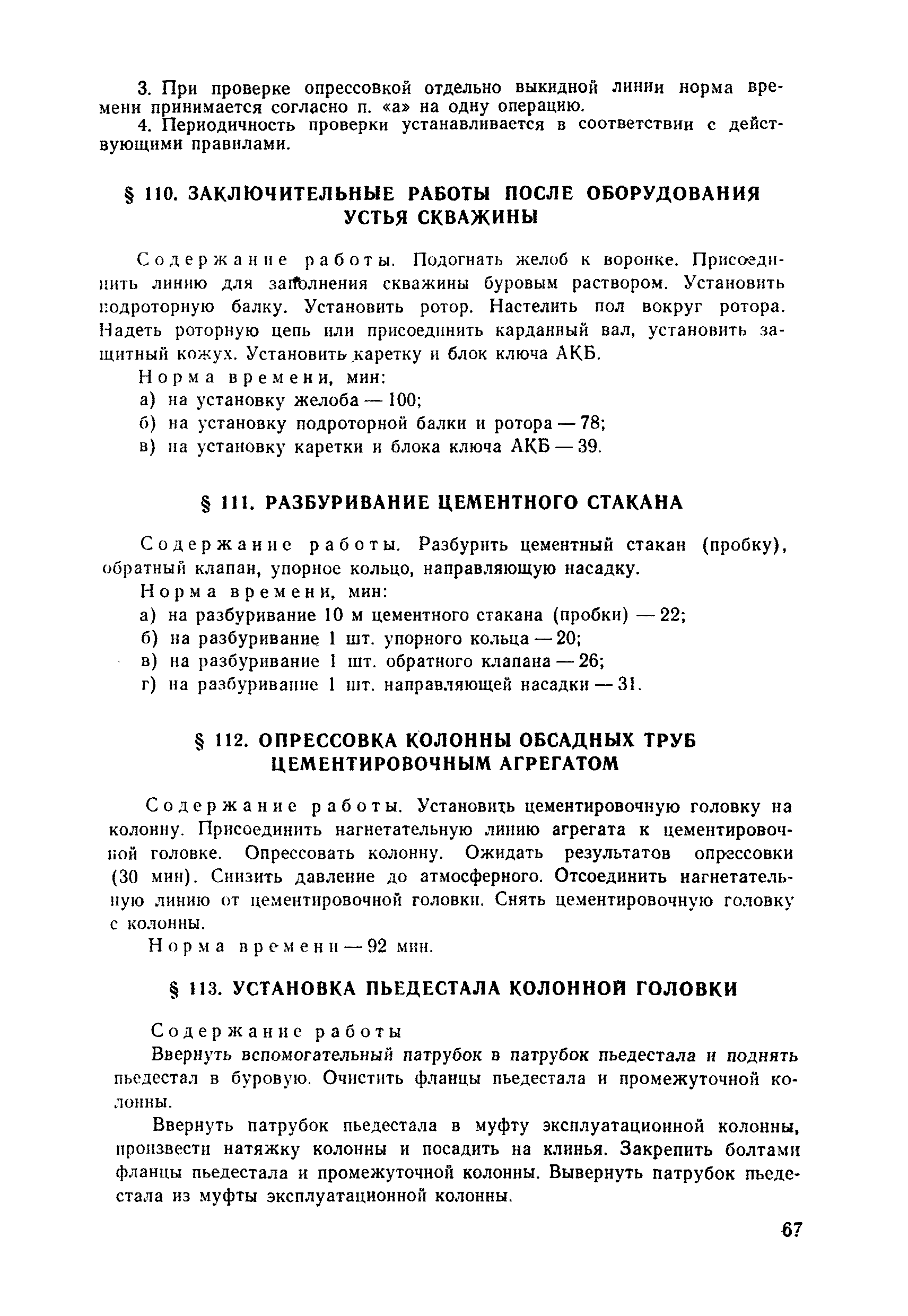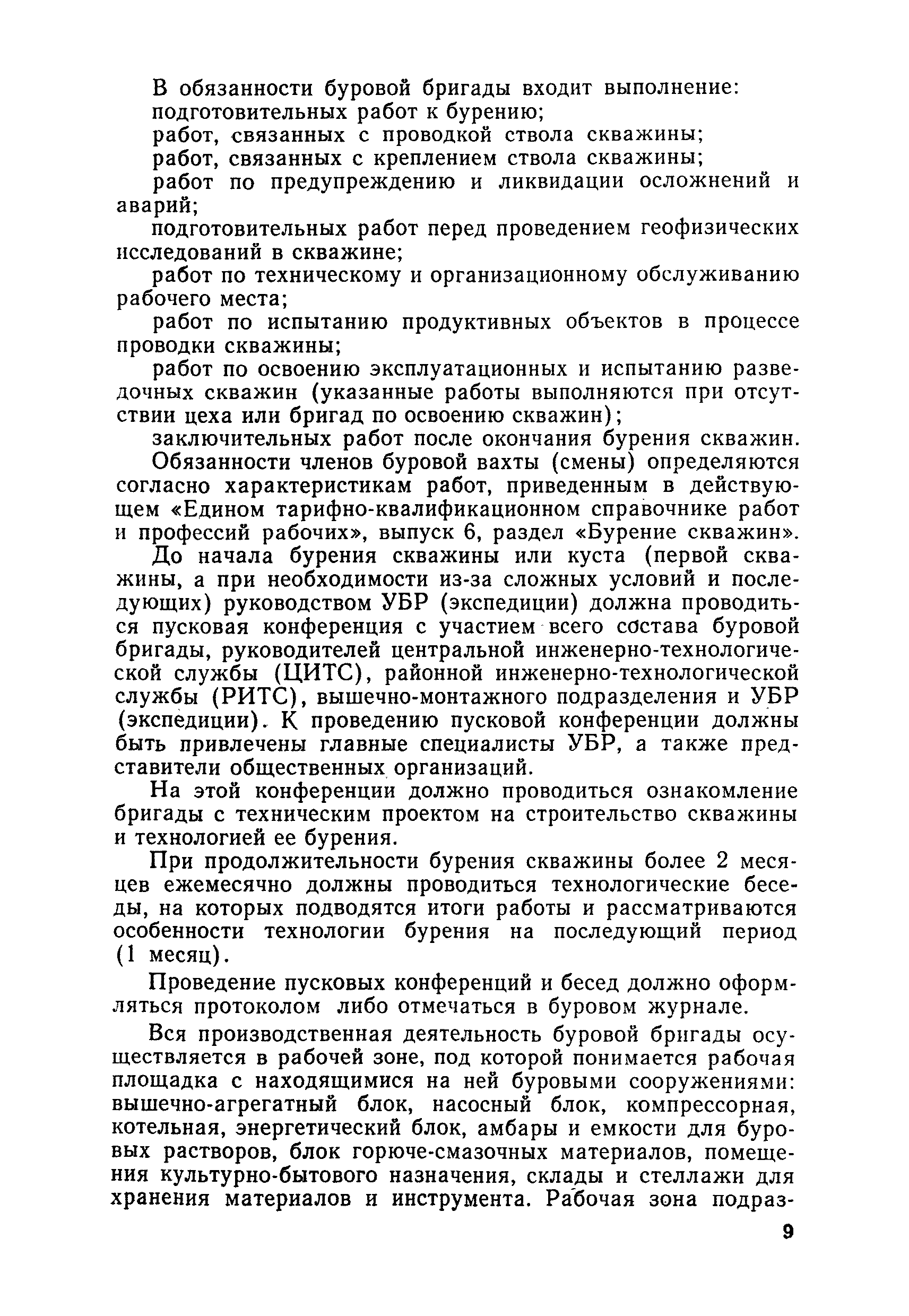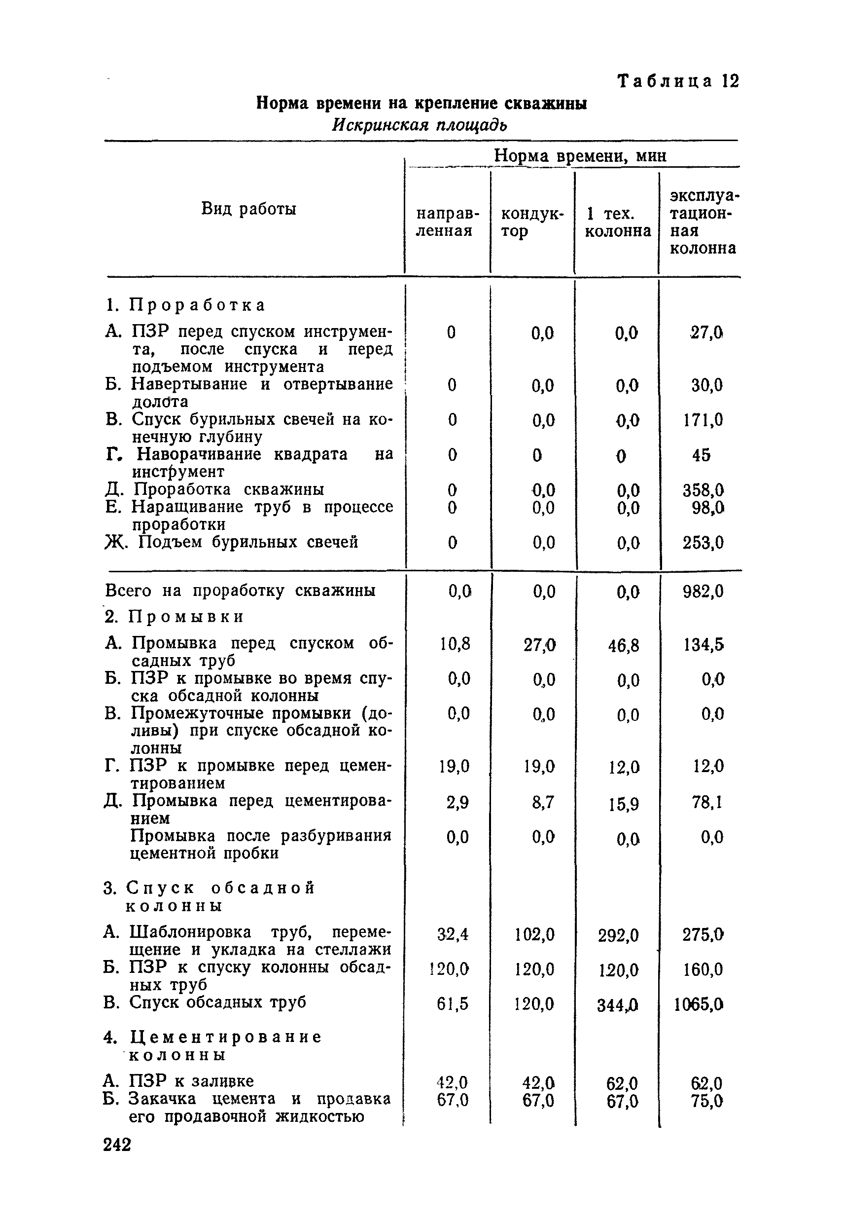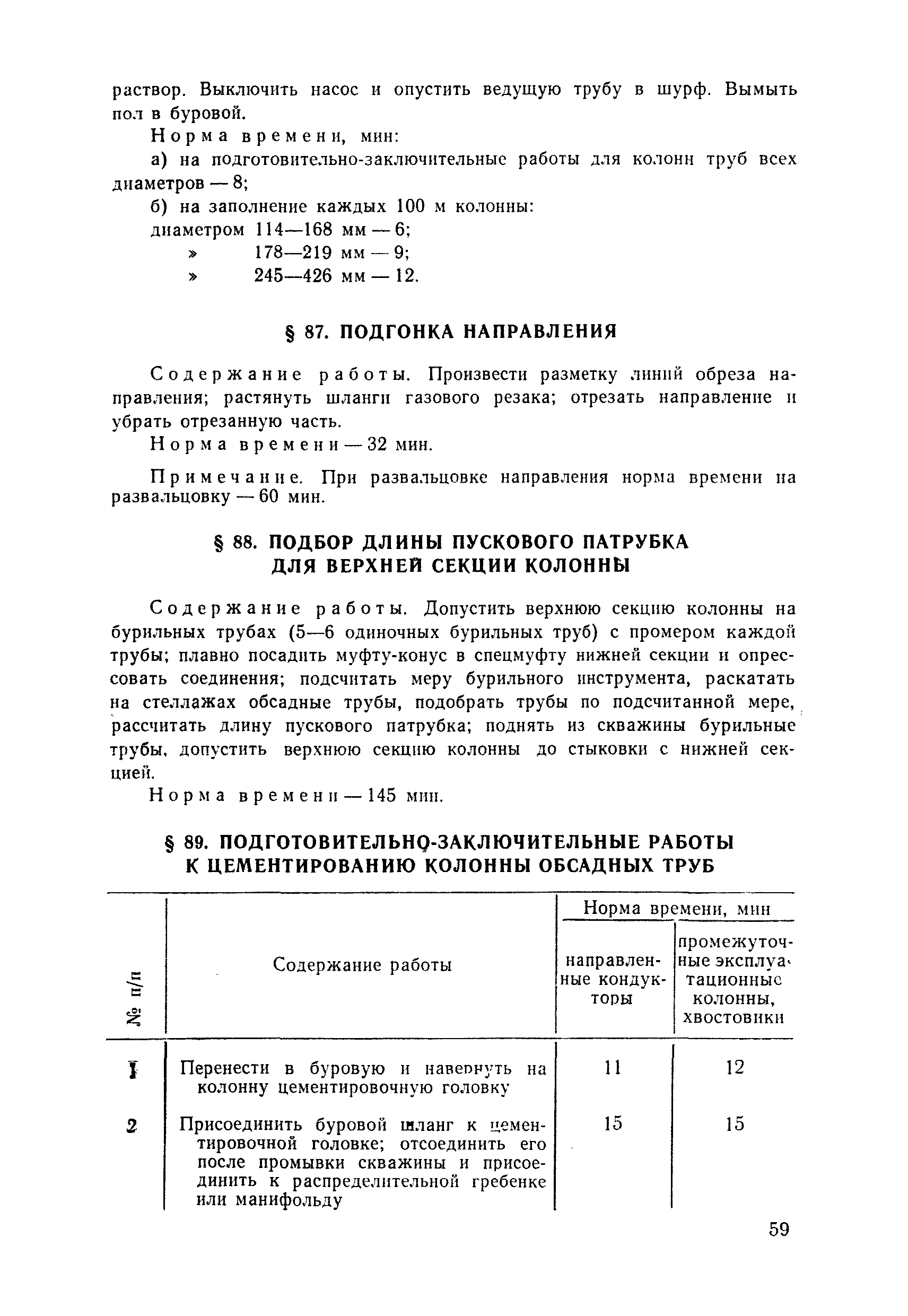 Единые нормы времени на бурение скважин на нефть, газ и другие полезные ископаемые| Статус: | не действует | | Название рус.: | Единые нормы времени на бурение скважин на нефть, газ и другие полезные ископаемые | | Дата добавления в базу: | 01.01.2018 | | Дата актуализации: | 01.01.2021 | | Область применения: | Единые нормы времени на основные виды работ, выполняемые при бурении разведочных, эксплуатационных, опорных, параметрических скважин с применением как роторного способа бурения, так и забойных двигателей, являются обязательными для применения на предприятиях и в организациях, выполняющих указанные работы, независимо от их ведомственной подчиненности и служат для нормирования труда рабочих, находящихся на сдельной оплате труда, а также для разработки нормированных заданий при по- временной оплате труда. Нормы настоящего сборника могут быть использованы для расчета комплексных норм времени. | | Оглавление: | 1. Общая часть 2. Организация труда 3. Нормативная часть 3.1. Нормы времени на подготовительно-заключительные и вспомогательные работы § 1. Подготовительные работы к бурению скважин § 2. Подготовительные работы перед спуском инструмента § 3. Заключительные работы после спуска инструмента § 4. Подготовительные работы перед подъемом инструмента § 5. Наращивание инструмента § 6. Отвертывание долота. Проверка забойного двигателя и укладка на приемный мост § 7. Подъем забойного двигателя в буровую с приемного моста, навертывание долота § 8. Сборка секционного турбобура § 9. Разборка секционного турбобура § 10. Сборка электробура для наклонно-направленного бурения § 11. Разборка электробура для наклонно-направленного бурения § 12. Проверка забойных двигателей § 13. Смена шпинделя турбобура § 14. Сборка колонкового снаряда при роторном бурении и бурении турбобуром с колонковой трубой § 15. Разборка колонкового снаряда при бурении ротором или турбобуром с колонковой трубой (надставкой) § 16. Сборка колонкового турбодолота § 17. Разборка колонкового турбодолота § 18. Подъем и спуск съемной грунтоноски § 19. Сборка колонковых снарядов типа «Недра» и «СКУ» § 20. Разборка колонковых снарядов типа «Недра» и «СКУ» § 21. Сборка утяжеленных бурильных труб § 22. Разборка утяжеленных бурильных труб § 23. Установка утяжеленных бурильных труб за палец § 24. Вывод утяжеленных бурильных труб из-за пальца и спуск в скважину § 25. Спуск утяжеленных бурильных труб в дополнительный шурф (длина свечи 25 м) § 26. Подъем утяжеленных бурильных труб из дополнительного шурфа (длина свечи 25 м) § 27. Подготовительно-заключительные работы при сборке и разборке колонны бурильных труб в скважине или в шурфе при смене диаметра бурильных труб § 28. Сборка колонны бурильных труб § 29. Разборка колонны бурильных труб § 30. Проверка резьбовых соединений бурильных труб ультразвуковой дефектоскопией при спуско-подъемных операциях на скважине § 31. Проверка легкосплавных бурильных труб ультразвуковой дефектоскопией при спуско-подъемных операциях на скважине § 32. Опрессовка свечей бурильных труб на буровой § 33. Сборка элементов компоновки бурильной колонны (расширителей, стабилизаторов, калибраторов, удлинителей, центраторов) § 34. Разборка элементов компоновки бурильной колонны (расширителей, стабилизаторов, калибраторов, удлинителей, центраторов) § 35. Навертывание, отвертывание переводников или вс
