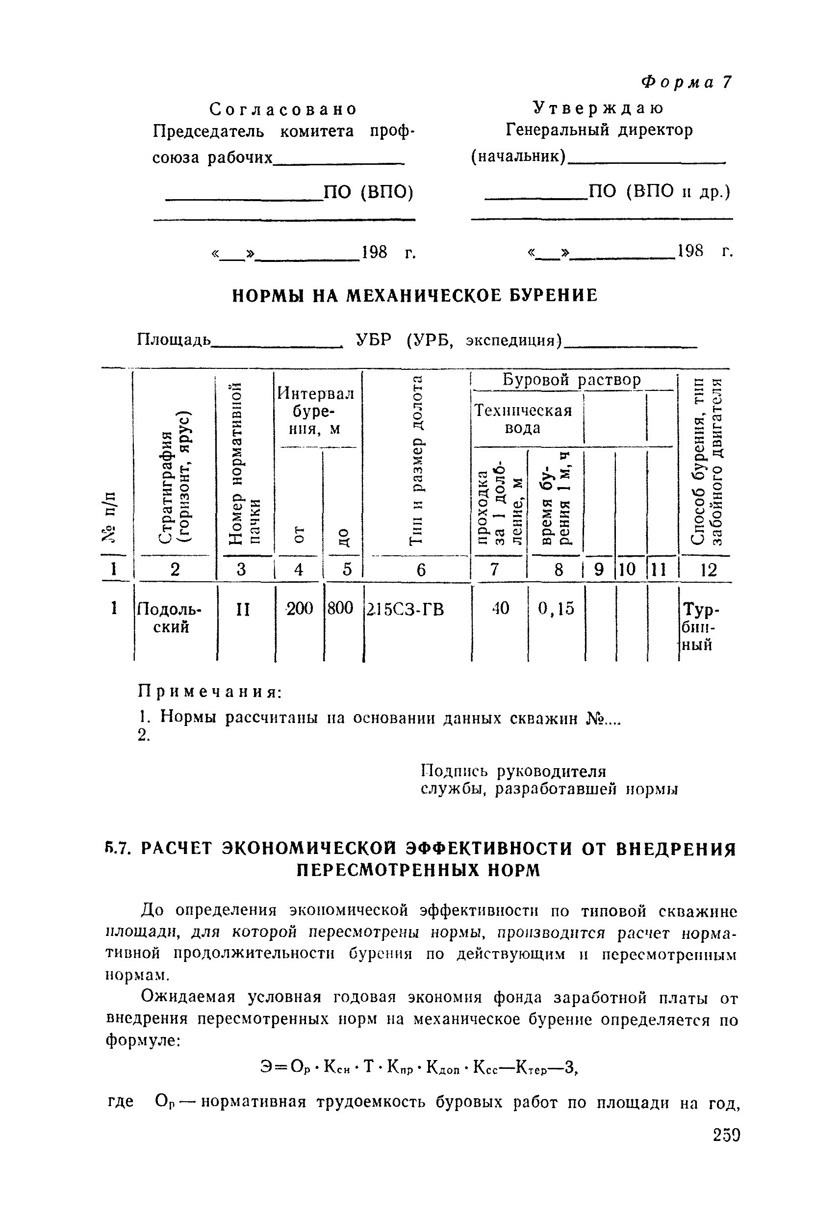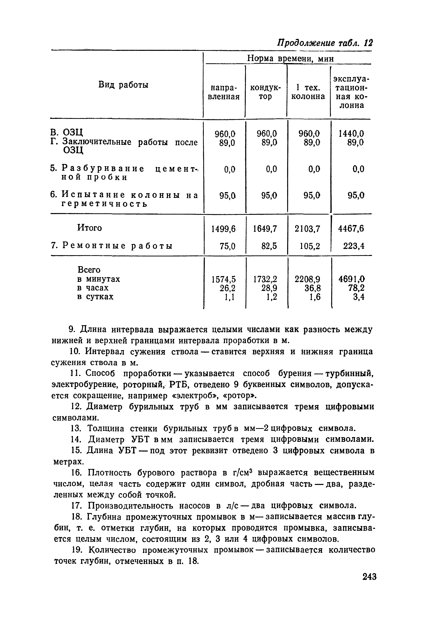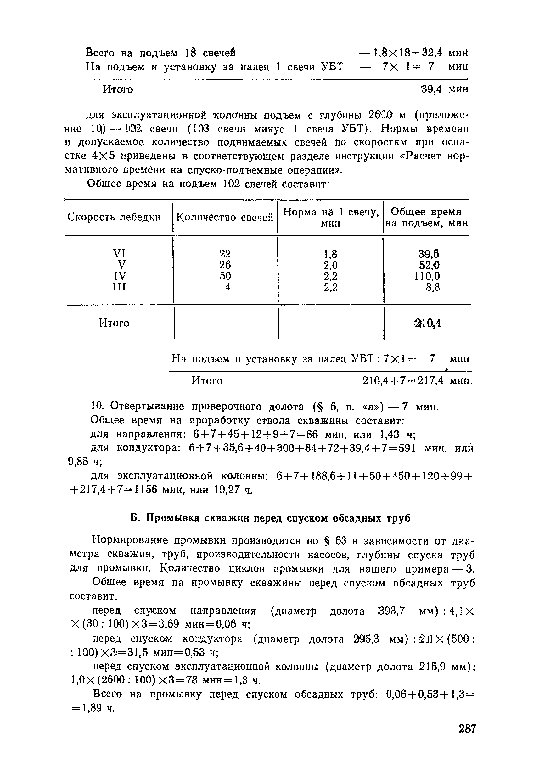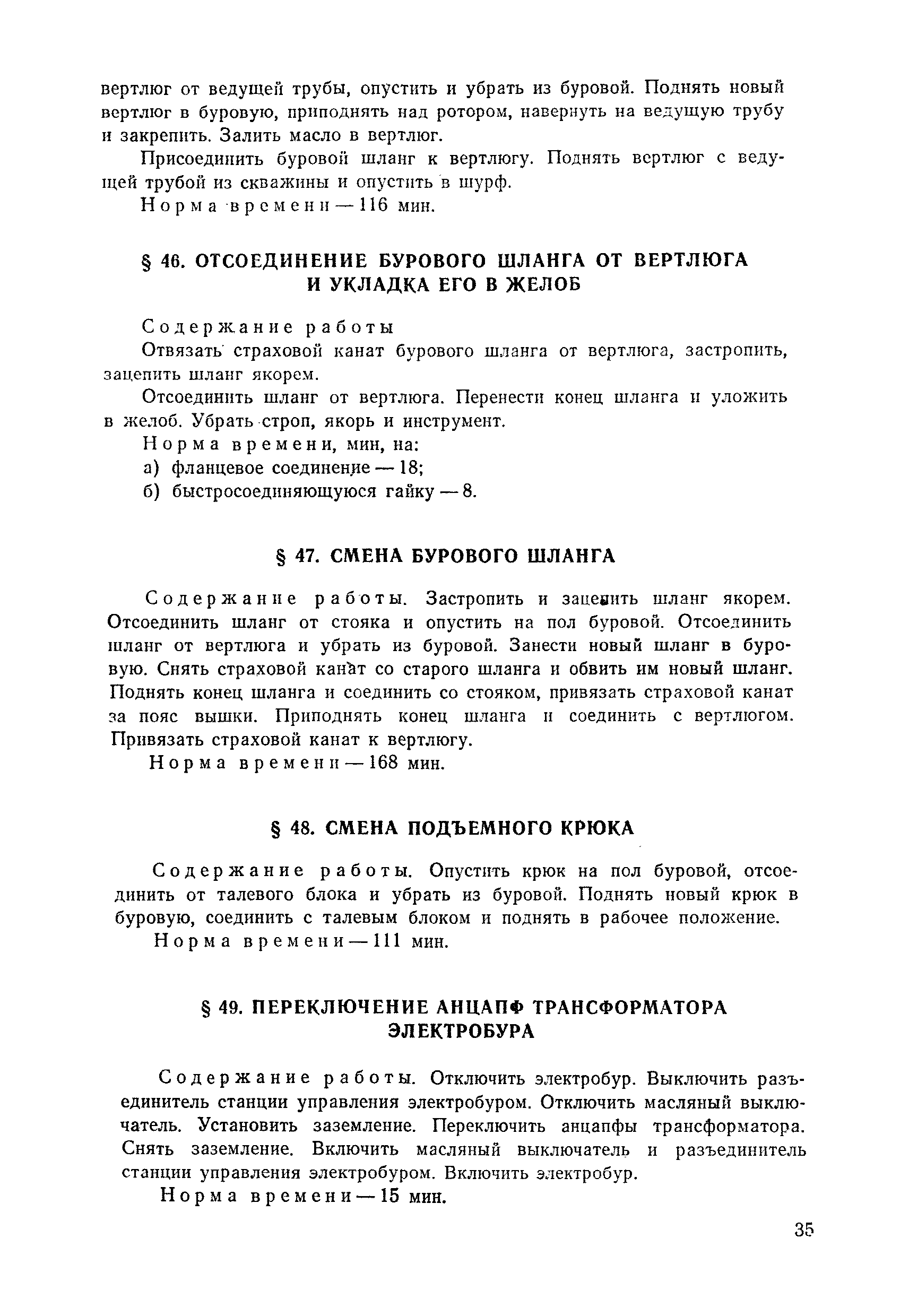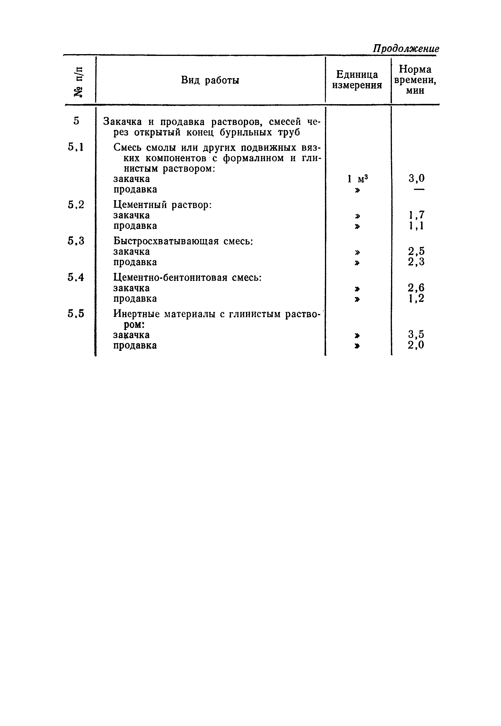 Единые нормы времени на бурение скважин на нефть, газ и другие полезные ископаемые| Статус: | не действует | | Название рус.: | Единые нормы времени на бурение скважин на нефть, газ и другие полезные ископаемые | | Дата добавления в базу: | 01.01.2018 | | Дата актуализации: | 01.01.2021 | | Область применения: | Единые нормы времени на основные виды работ, выполняемые при бурении разведочных, эксплуатационных, опорных, параметрических скважин с применением как роторного способа бурения, так и забойных двигателей, являются обязательными для применения на предприятиях и в организациях, выполняющих указанные работы, независимо от их ведомственной подчиненности и служат для нормирования труда рабочих, находящихся на сдельной оплате труда, а также для разработки нормированных заданий при по- временной оплате труда. Нормы настоящего сборника могут быть использованы для расчета комплексных норм времени. | | Оглавление: | 1. Общая часть 2. Организация труда 3. Нормативная часть 3.1. Нормы времени на подготовительно-заключительные и вспомогательные работы § 1. Подготовительные работы к бурению скважин § 2. Подготовительные работы перед спуском инструмента § 3. Заключительные работы после спуска инструмента § 4. Подготовительные работы перед подъемом инструмента § 5. Наращивание инструмента § 6. Отвертывание долота. Проверка забойного двигателя и укладка на приемный мост § 7. Подъем забойного двигателя в буровую с приемного моста, навертывание долота § 8. Сборка секционного турбобура § 9. Разборка секционного турбобура § 10. Сборка электробура для наклонно-направленного бурения § 11. Разборка электробура для наклонно-направленного бурения § 12. Проверка забойных двигателей § 13. Смена шпинделя турбобура § 14. Сборка колонкового снаряда при роторном бурении и бурении турбобуром с колонковой трубой § 15. Разборка колонкового снаряда при бурении ротором или турбобуром с колонковой трубой (надставкой) § 16. Сборка колонкового турбодолота § 17. Разборка колонкового турбодолота § 18. Подъем и спуск съемной грунтоноски § 19. Сборка колонковых снарядов типа «Недра» и «СКУ» § 20. Разборка колонковых снарядов типа «Недра» и «СКУ» § 21. Сборка утяжеленных бурильных труб § 22. Разборка утяжеленных бурильных труб § 23. Установка утяжеленных бурильных труб за палец § 24. Вывод утяжеленных бурильных труб из-за пальца и спуск в скважину § 25. Спуск утяжеленных бурильных труб в дополнительный шурф (длина свечи 25 м) § 26. Подъем утяжеленных бурильных труб из дополнительного шурфа (длина свечи 25 м) § 27. Подготовительно-заключительные работы при сборке и разборке колонны бурильных труб в скважине или в шурфе при смене диаметра бурильных труб § 28. Сборка колонны бурильных труб § 29. Разборка колонны бурильных труб § 30. Проверка резьбовых соединений бурильных труб ультразвуковой дефектоскопией при спуско-подъемных операциях на скважине § 31. Проверка легкосплавных бурильных труб ультразвуковой дефектоскопией при спуско-подъемных операциях на скважине § 32. Опрессовка свечей бурильных труб на буровой § 33. Сборка элементов компоновки бурильной колонны (расширителей, стабилизаторов, калибраторов, удлинителей, центраторов) § 34. Разборка элементов компоновки бурильной колонны (расширителей, стабилизаторов, калибраторов, удлинителей, центраторов) § 35. Навертывание, отвертывание переводников или вс