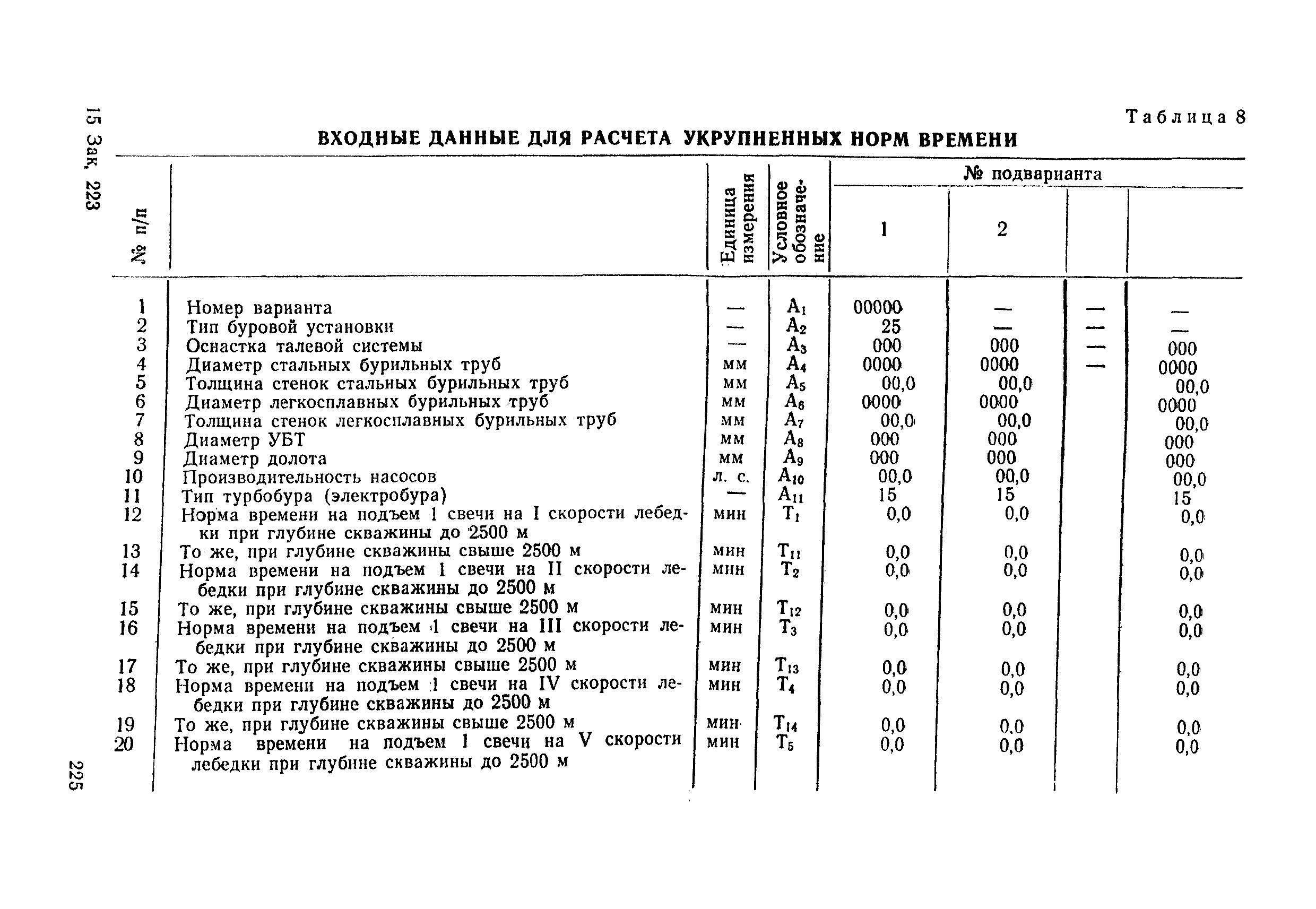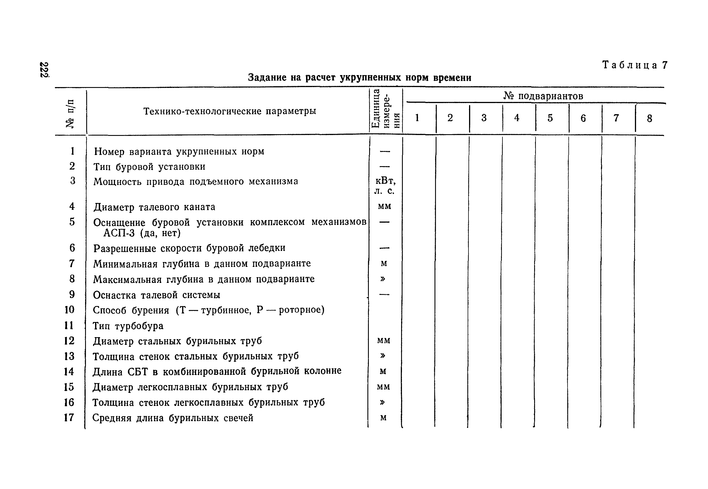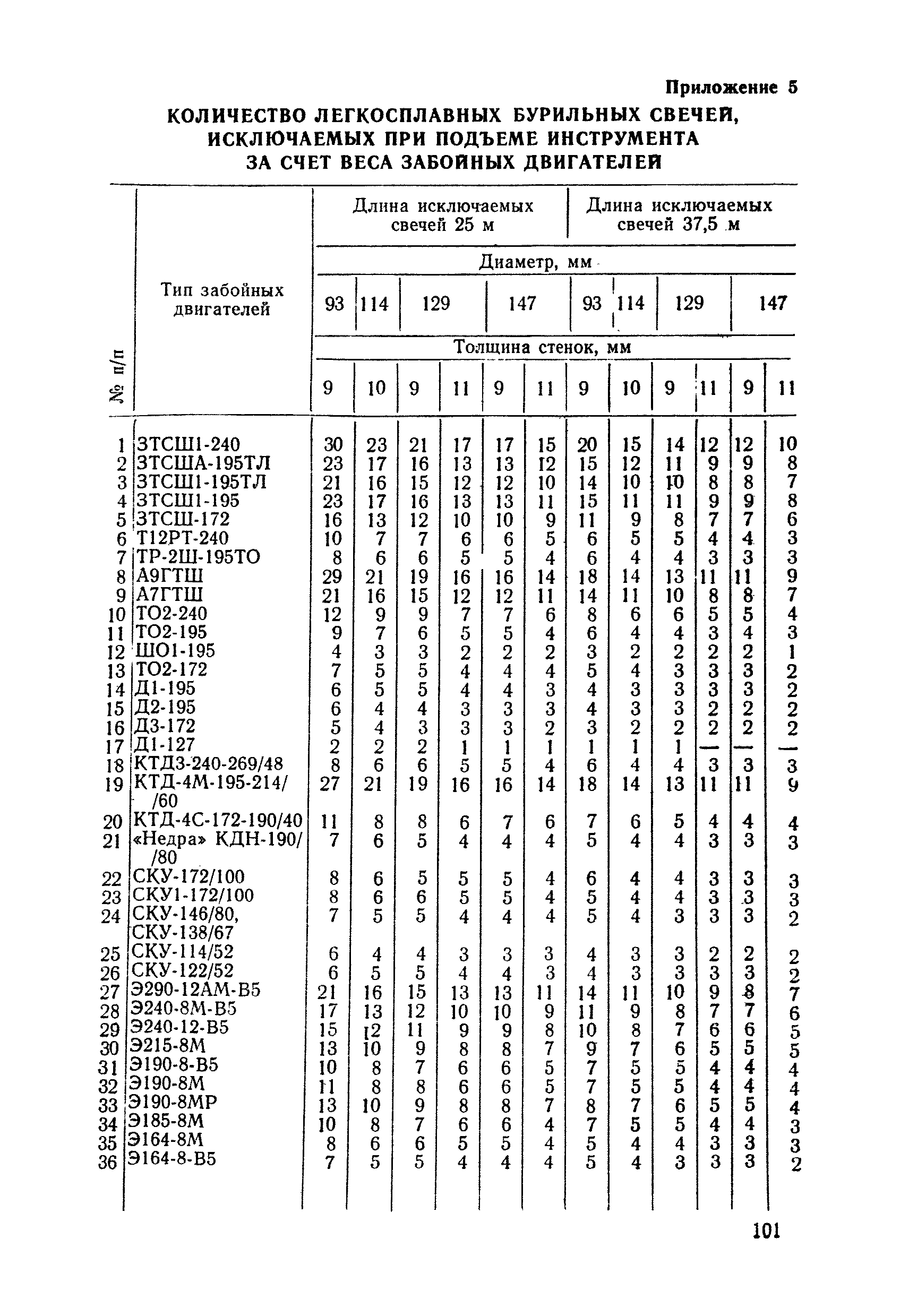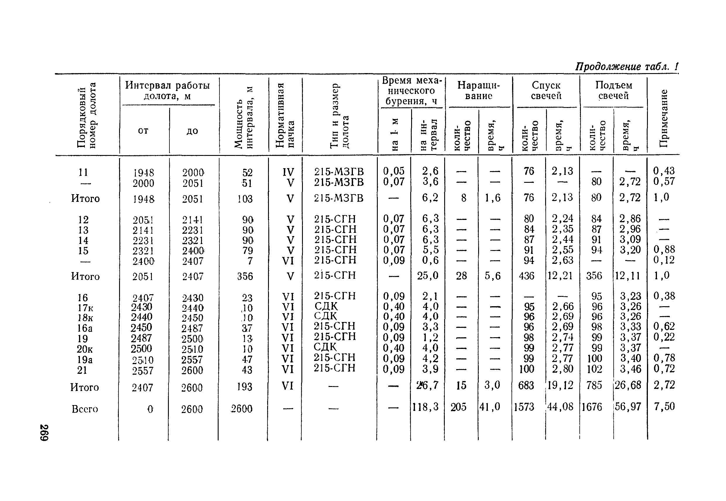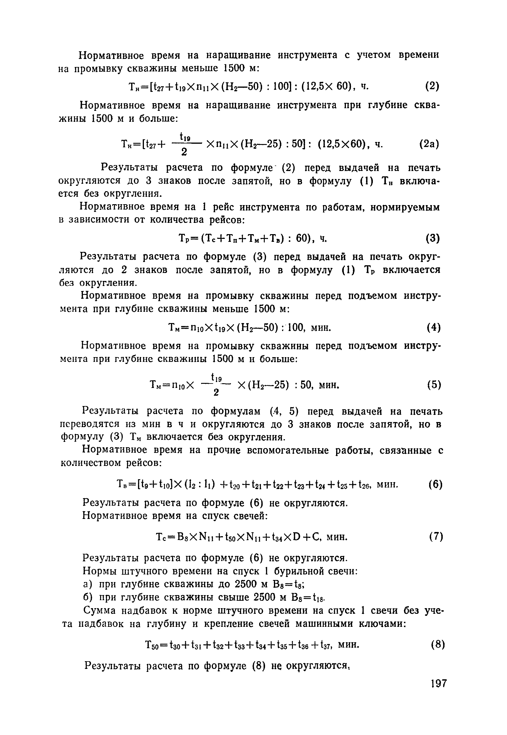 Единые нормы времени на бурение скважин на нефть, газ и другие полезные ископаемые| Статус: | не действует | | Название рус.: | Единые нормы времени на бурение скважин на нефть, газ и другие полезные ископаемые | | Дата добавления в базу: | 01.01.2018 | | Дата актуализации: | 01.01.2021 | | Область применения: | Единые нормы времени на основные виды работ, выполняемые при бурении разведочных, эксплуатационных, опорных, параметрических скважин с применением как роторного способа бурения, так и забойных двигателей, являются обязательными для применения на предприятиях и в организациях, выполняющих указанные работы, независимо от их ведомственной подчиненности и служат для нормирования труда рабочих, находящихся на сдельной оплате труда, а также для разработки нормированных заданий при по- временной оплате труда. Нормы настоящего сборника могут быть использованы для расчета комплексных норм времени. | | Оглавление: | 1. Общая часть 2. Организация труда 3. Нормативная часть 3.1. Нормы времени на подготовительно-заключительные и вспомогательные работы § 1. Подготовительные работы к бурению скважин § 2. Подготовительные работы перед спуском инструмента § 3. Заключительные работы после спуска инструмента § 4. Подготовительные работы перед подъемом инструмента § 5. Наращивание инструмента § 6. Отвертывание долота. Проверка забойного двигателя и укладка на приемный мост § 7. Подъем забойного двигателя в буровую с приемного моста, навертывание долота § 8. Сборка секционного турбобура § 9. Разборка секционного турбобура § 10. Сборка электробура для наклонно-направленного бурения § 11. Разборка электробура для наклонно-направленного бурения § 12. Проверка забойных двигателей § 13. Смена шпинделя турбобура § 14. Сборка колонкового снаряда при роторном бурении и бурении турбобуром с колонковой трубой § 15. Разборка колонкового снаряда при бурении ротором или турбобуром с колонковой трубой (надставкой) § 16. Сборка колонкового турбодолота § 17. Разборка колонкового турбодолота § 18. Подъем и спуск съемной грунтоноски § 19. Сборка колонковых снарядов типа «Недра» и «СКУ» § 20. Разборка колонковых снарядов типа «Недра» и «СКУ» § 21. Сборка утяжеленных бурильных труб § 22. Разборка утяжеленных бурильных труб § 23. Установка утяжеленных бурильных труб за палец § 24. Вывод утяжеленных бурильных труб из-за пальца и спуск в скважину § 25. Спуск утяжеленных бурильных труб в дополнительный шурф (длина свечи 25 м) § 26. Подъем утяжеленных бурильных труб из дополнительного шурфа (длина свечи 25 м) § 27. Подготовительно-заключительные работы при сборке и разборке колонны бурильных труб в скважине или в шурфе при смене диаметра бурильных труб § 28. Сборка колонны бурильных труб § 29. Разборка колонны бурильных труб § 30. Проверка резьбовых соединений бурильных труб ультразвуковой дефектоскопией при спуско-подъемных операциях на скважине § 31. Проверка легкосплавных бурильных труб ультразвуковой дефектоскопией при спуско-подъемных операциях на скважине § 32. Опрессовка свечей бурильных труб на буровой § 33. Сборка элементов компоновки бурильной колонны (расширителей, стабилизаторов, калибраторов, удлинителей, центраторов) § 34. Разборка элементов компоновки бурильной колонны (расширителей, стабилизаторов, калибраторов, удлинителей, центраторов) § 35. Навертывание, отвертывание переводников или вс