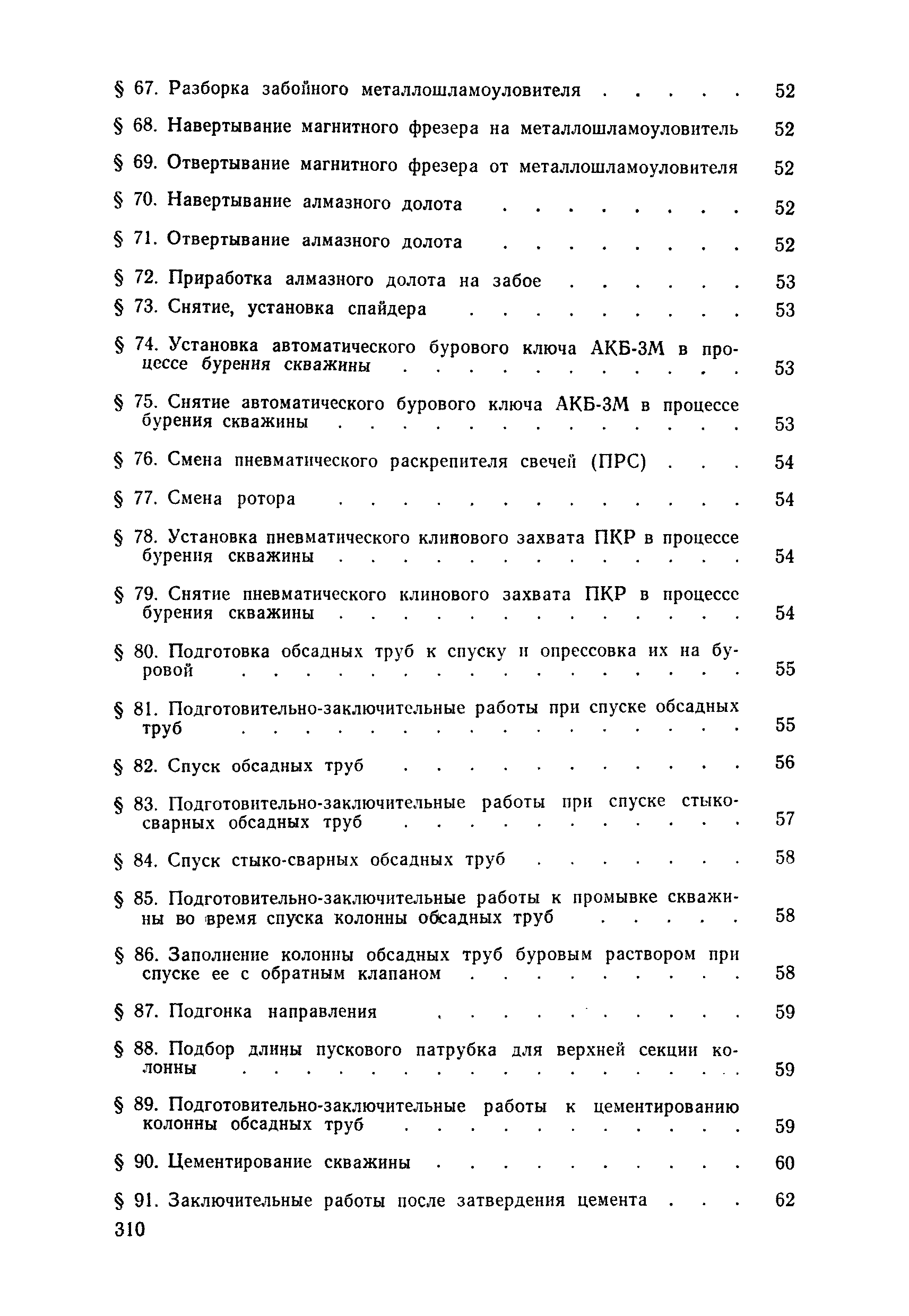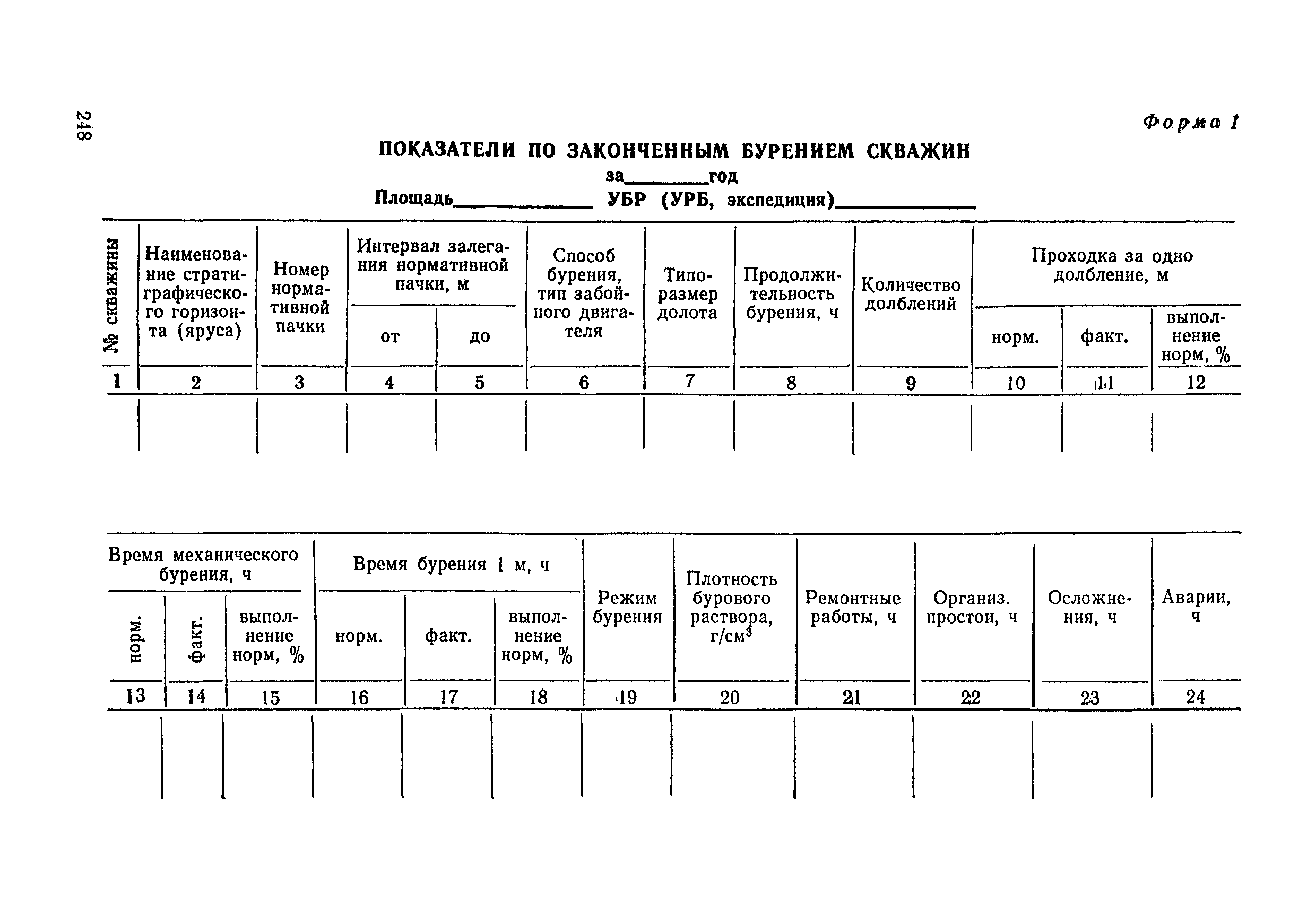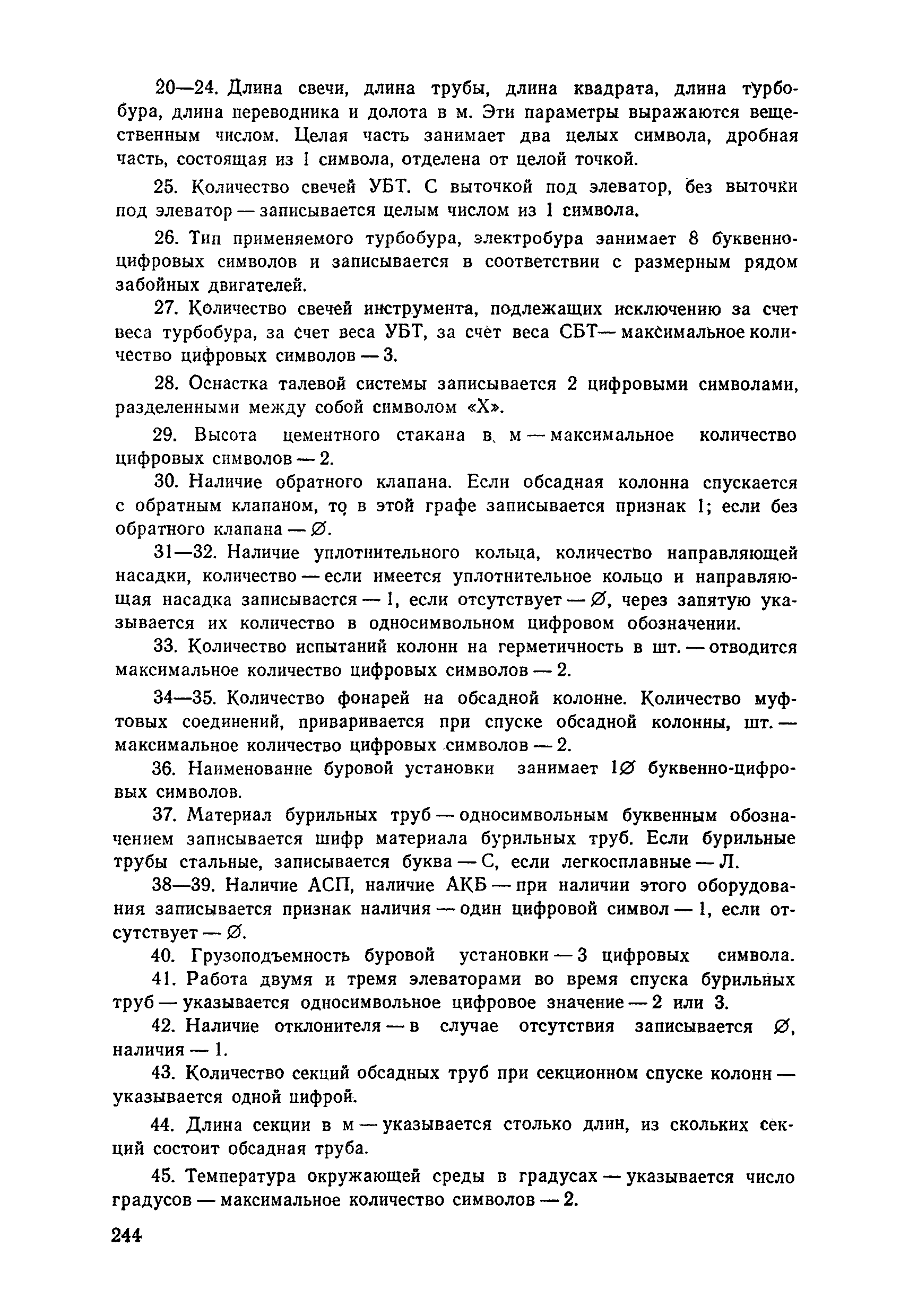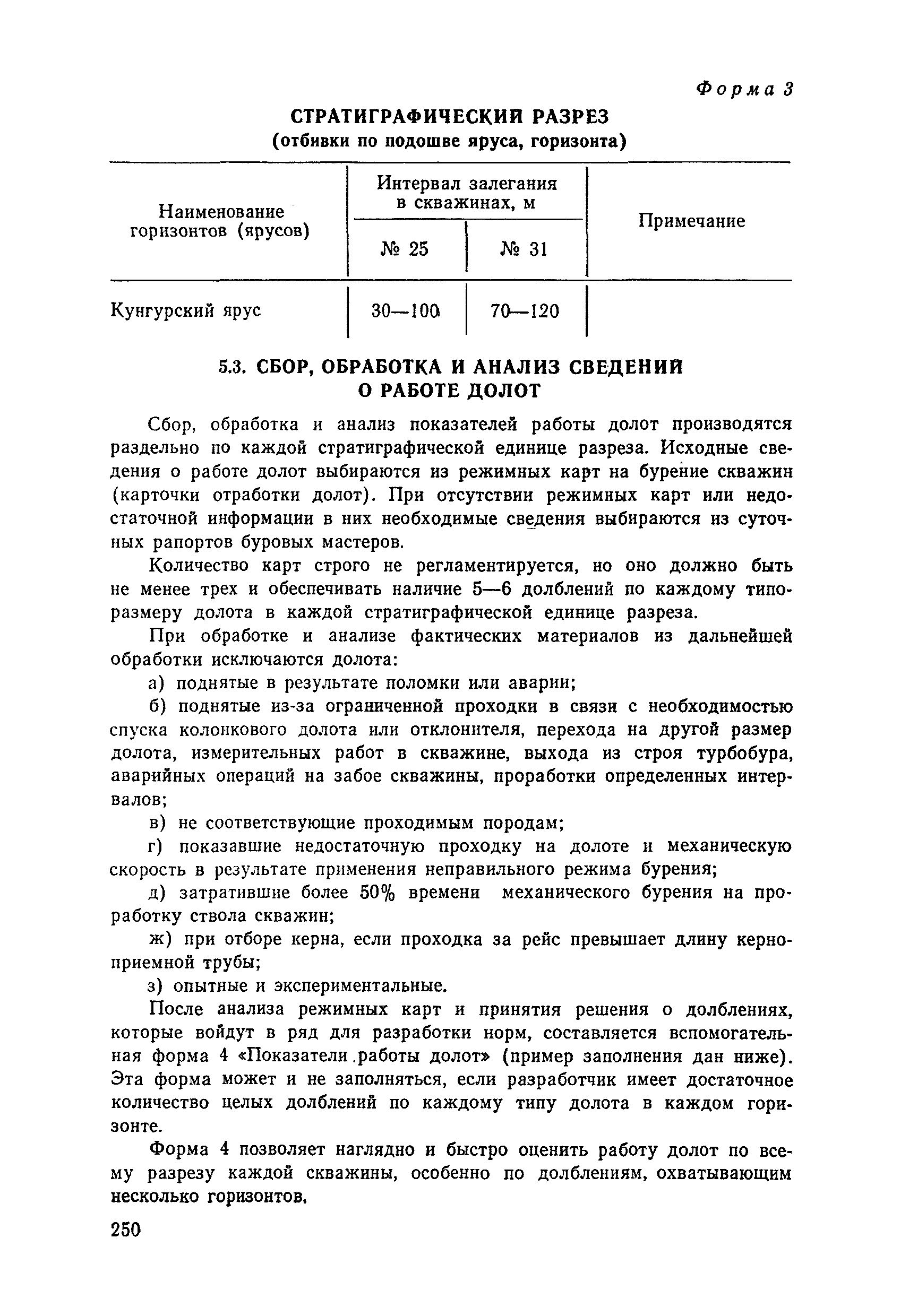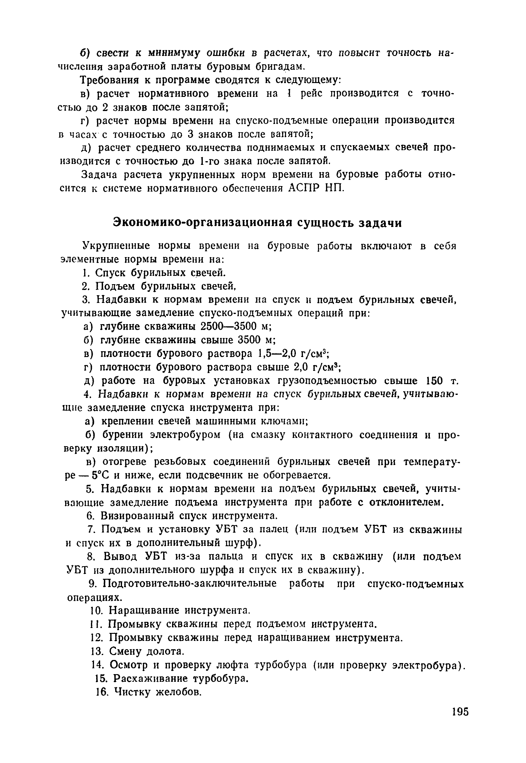 Единые нормы времени на бурение скважин на нефть, газ и другие полезные ископаемые| Статус: | не действует | | Название рус.: | Единые нормы времени на бурение скважин на нефть, газ и другие полезные ископаемые | | Дата добавления в базу: | 01.01.2018 | | Дата актуализации: | 01.01.2021 | | Область применения: | Единые нормы времени на основные виды работ, выполняемые при бурении разведочных, эксплуатационных, опорных, параметрических скважин с применением как роторного способа бурения, так и забойных двигателей, являются обязательными для применения на предприятиях и в организациях, выполняющих указанные работы, независимо от их ведомственной подчиненности и служат для нормирования труда рабочих, находящихся на сдельной оплате труда, а также для разработки нормированных заданий при по- временной оплате труда. Нормы настоящего сборника могут быть использованы для расчета комплексных норм времени. | | Оглавление: | 1. Общая часть 2. Организация труда 3. Нормативная часть 3.1. Нормы времени на подготовительно-заключительные и вспомогательные работы § 1. Подготовительные работы к бурению скважин § 2. Подготовительные работы перед спуском инструмента § 3. Заключительные работы после спуска инструмента § 4. Подготовительные работы перед подъемом инструмента § 5. Наращивание инструмента § 6. Отвертывание долота. Проверка забойного двигателя и укладка на приемный мост § 7. Подъем забойного двигателя в буровую с приемного моста, навертывание долота § 8. Сборка секционного турбобура § 9. Разборка секционного турбобура § 10. Сборка электробура для наклонно-направленного бурения § 11. Разборка электробура для наклонно-направленного бурения § 12. Проверка забойных двигателей § 13. Смена шпинделя турбобура § 14. Сборка колонкового снаряда при роторном бурении и бурении турбобуром с колонковой трубой § 15. Разборка колонкового снаряда при бурении ротором или турбобуром с колонковой трубой (надставкой) § 16. Сборка колонкового турбодолота § 17. Разборка колонкового турбодолота § 18. Подъем и спуск съемной грунтоноски § 19. Сборка колонковых снарядов типа «Недра» и «СКУ» § 20. Разборка колонковых снарядов типа «Недра» и «СКУ» § 21. Сборка утяжеленных бурильных труб § 22. Разборка утяжеленных бурильных труб § 23. Установка утяжеленных бурильных труб за палец § 24. Вывод утяжеленных бурильных труб из-за пальца и спуск в скважину § 25. Спуск утяжеленных бурильных труб в дополнительный шурф (длина свечи 25 м) § 26. Подъем утяжеленных бурильных труб из дополнительного шурфа (длина свечи 25 м) § 27. Подготовительно-заключительные работы при сборке и разборке колонны бурильных труб в скважине или в шурфе при смене диаметра бурильных труб § 28. Сборка колонны бурильных труб § 29. Разборка колонны бурильных труб § 30. Проверка резьбовых соединений бурильных труб ультразвуковой дефектоскопией при спуско-подъемных операциях на скважине § 31. Проверка легкосплавных бурильных труб ультразвуковой дефектоскопией при спуско-подъемных операциях на скважине § 32. Опрессовка свечей бурильных труб на буровой § 33. Сборка элементов компоновки бурильной колонны (расширителей, стабилизаторов, калибраторов, удлинителей, центраторов) § 34. Разборка элементов компоновки бурильной колонны (расширителей, стабилизаторов, калибраторов, удлинителей, центраторов) § 35. Навертывание, отвертывание переводников или вс