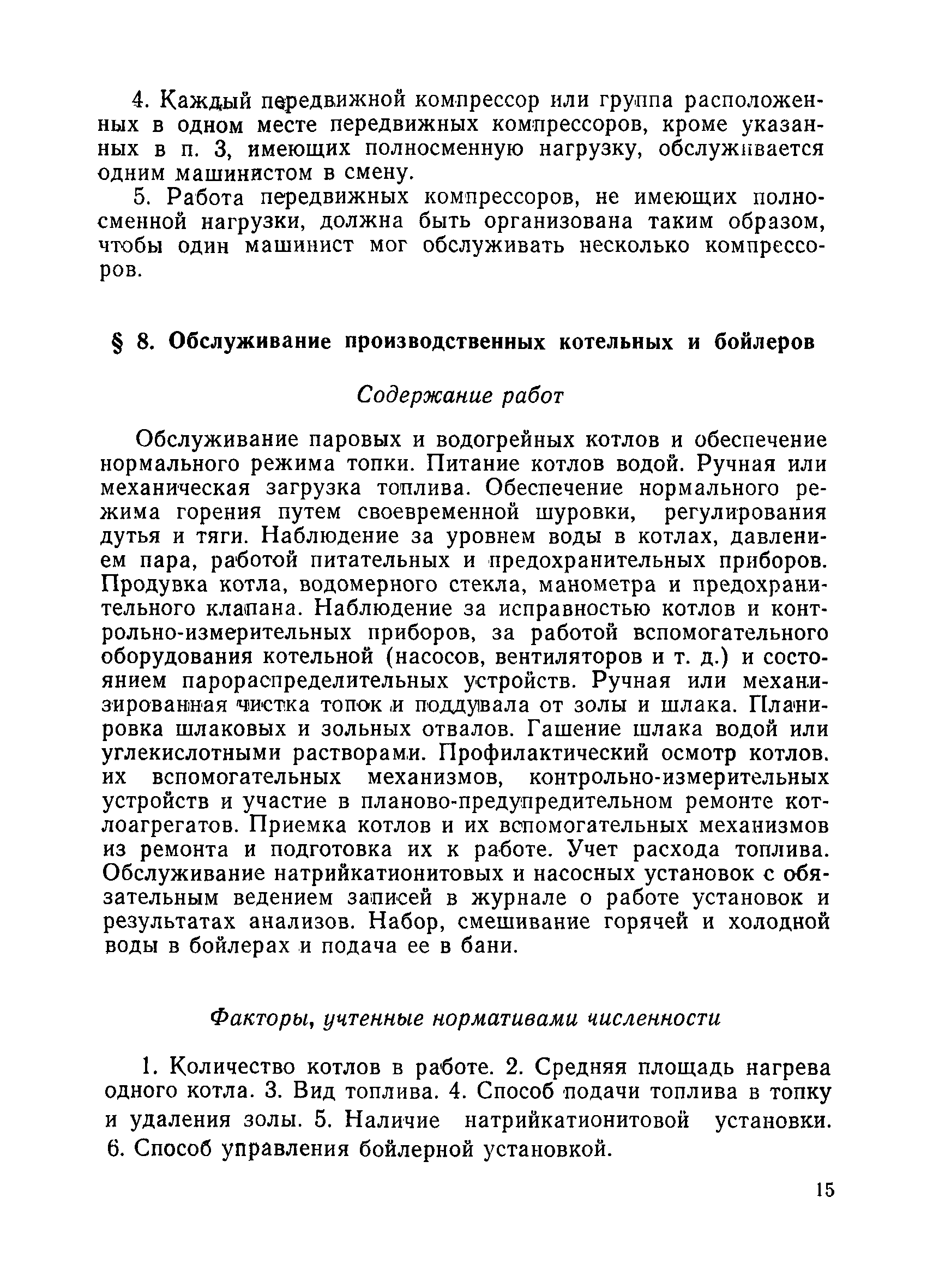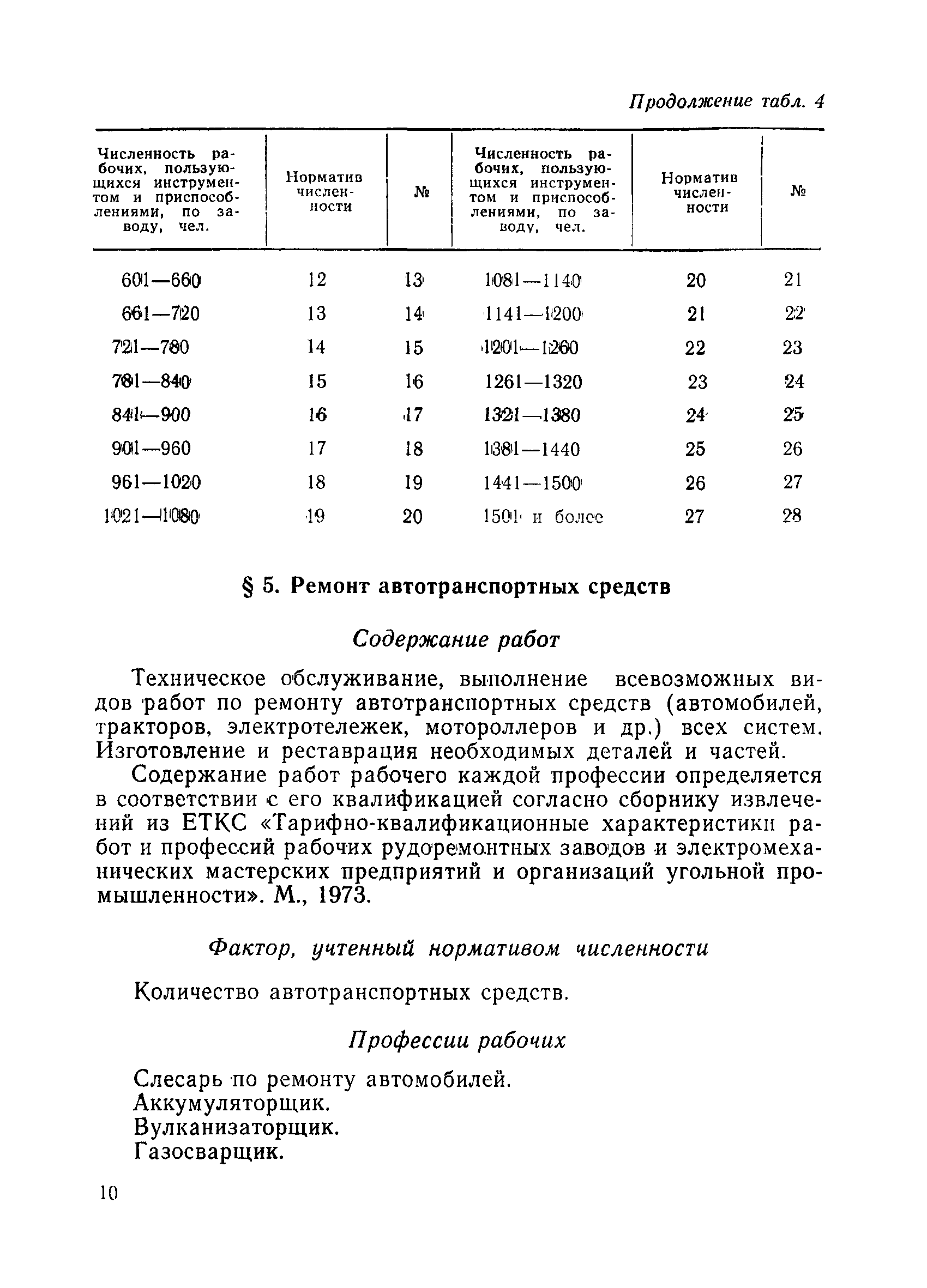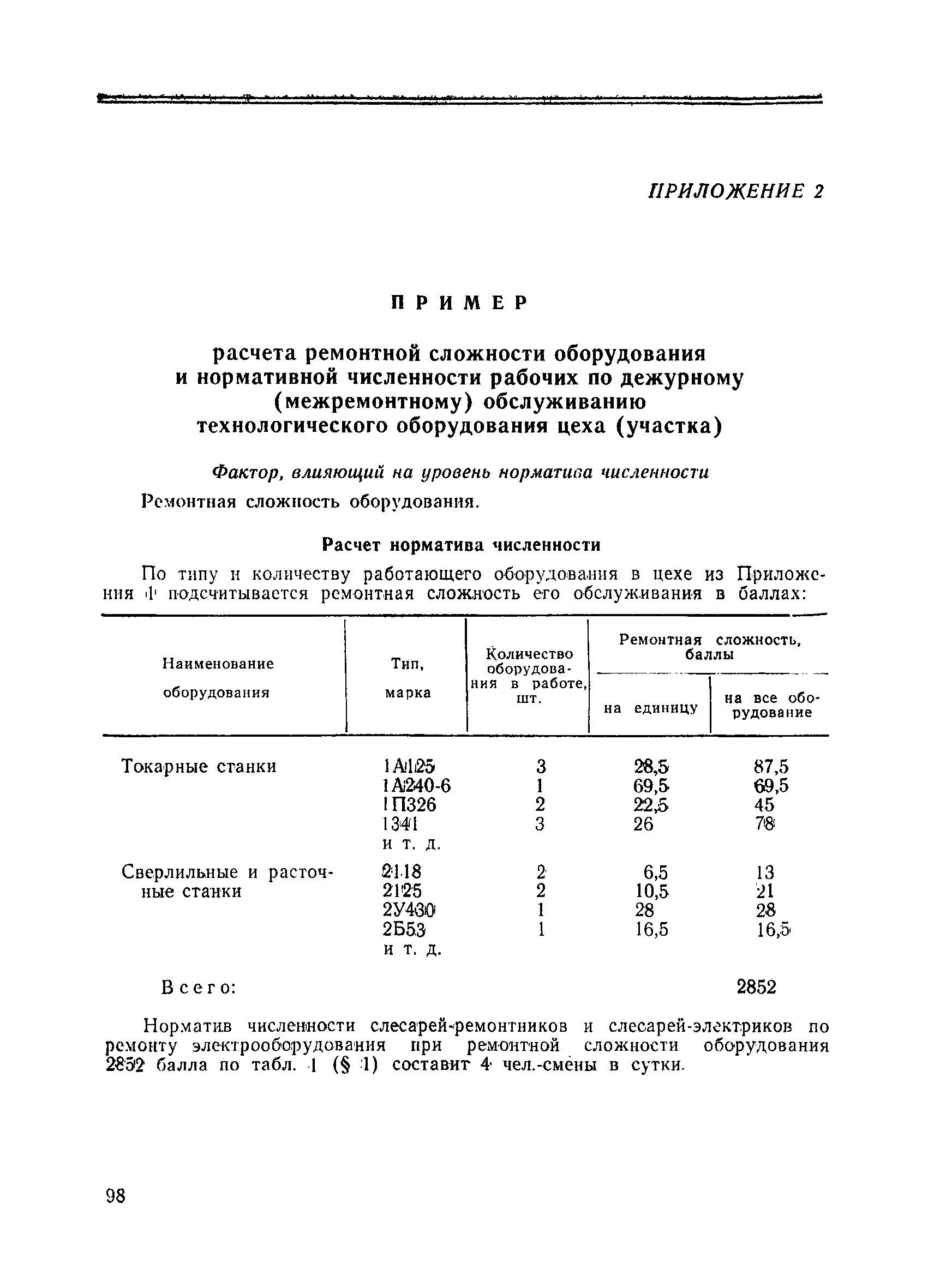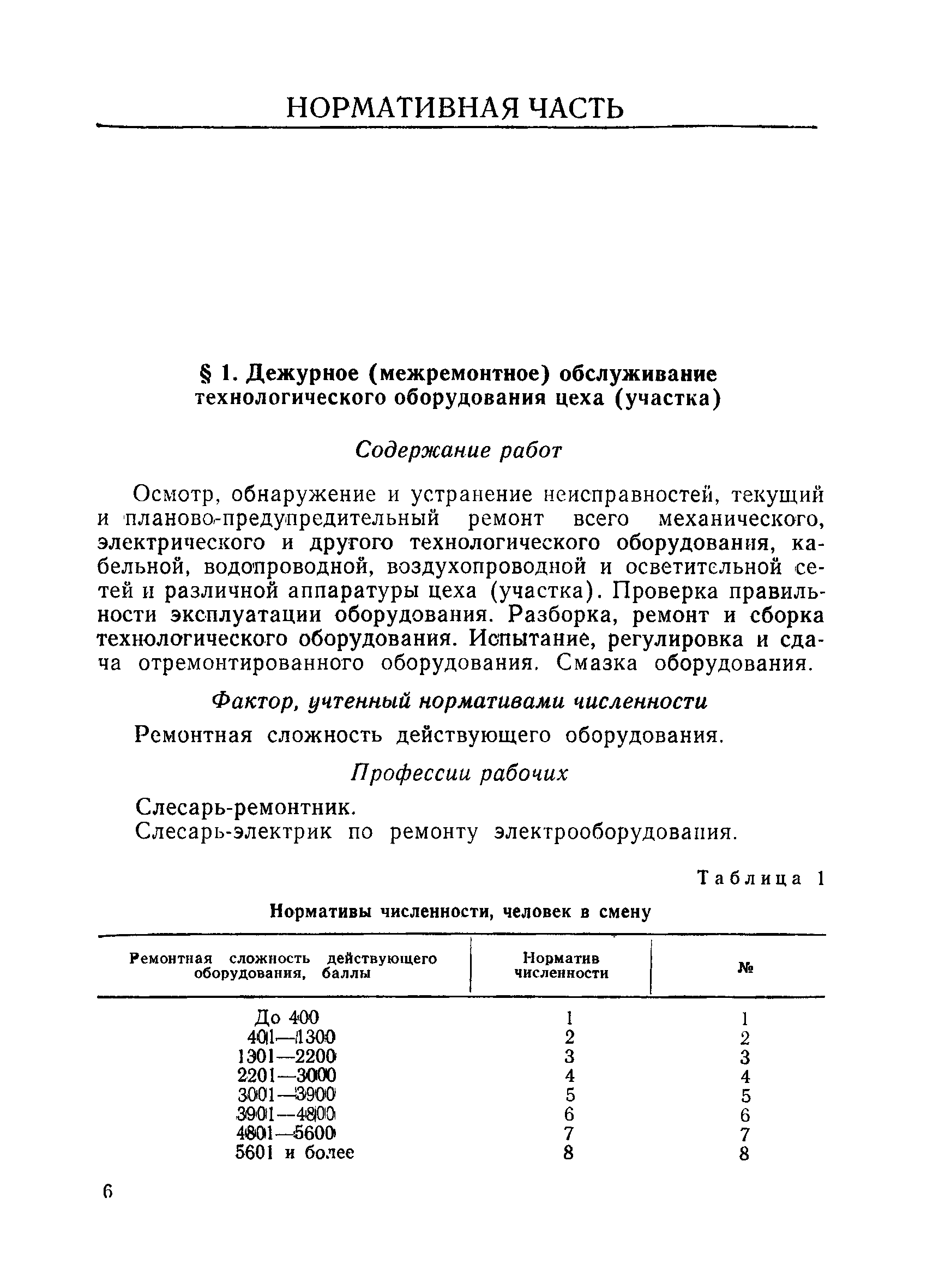 Единые нормативы численности рабочих, занятых на вспомогательных работах ремонтно-механических, рудоремонтных заводов и ЦЭММ| Статус: | не действует | | Название рус.: | Единые нормативы численности рабочих, занятых на вспомогательных работах ремонтно-механических, рудоремонтных заводов и ЦЭММ | | Дата добавления в базу: | 01.01.2018 | | Дата актуализации: | 01.01.2021 | | Область применения: | Нормативы численности сборника обязательны для применения на предприятиях по ремонту горно-шахтного оборудования (РМЗ, РРЗ, ЦЭММ) Минуглепрома СССР и предназначены для планирования численности вспомогательных рабочих и установления рабочим доплат за совмещение профессий и расширение зон обслуживания. Нормативы определяют явочную численность рабочих на смену или сутки при продолжительности смены 8 часов при пятидневной рабочей неделе. | | Оглавление: | Общая часть Нормативная часть 1 Дежурное (межремонтное) обслуживание технологического оборудования цеха (участка) 2 Ремонт технологического оборудования 3 Наладка технологического оборудования 4 Изготовление, ремонт инструмента и приспособлений 5 Ремонт автотранспортных средств 6 Обслуживание кислородных станций 7 Управление компрессорами 8 Обслуживание производственных котельных и бойлеров 9 Обслуживание отопительной, водопроводной и канализационной систем 10 Выдача, прием и хранение инструмента и приспособлений (кроме центральных кладовых) 11 Управление кранами 12 Транспортные и погрузочно-разгрузочные работы в цехах и между цехами 13 Производство анализов и лабораторных испытаний приборов, изделий 14 Контроль качества продукции 15 Обслуживание электрографических установок и светокопировальных аппаратов 16 Уборка производственных помещений 17 Обслуживание сатураторных установок 18 Уборка служебных помещений 19 Стирка спецодежды и ремонт спецобуви 20 Обслуживание душевых Приложение 1. Ремонтная сложность наиболее распространенного технологического оборудования Приложение 2. Пример расчета ремонтной сложности оборудования и нормативной численности рабочих по дежурному (межремонтному) обслуживанию технологического оборудования цеха (участка) | | Утверждён: | 14.02.1979 Министерство угольной промышленности СССР (USSR Ministry of the Coal Industry )
