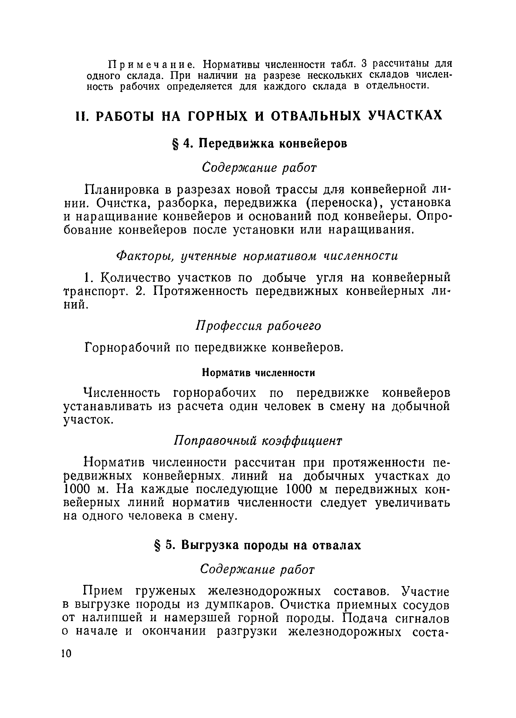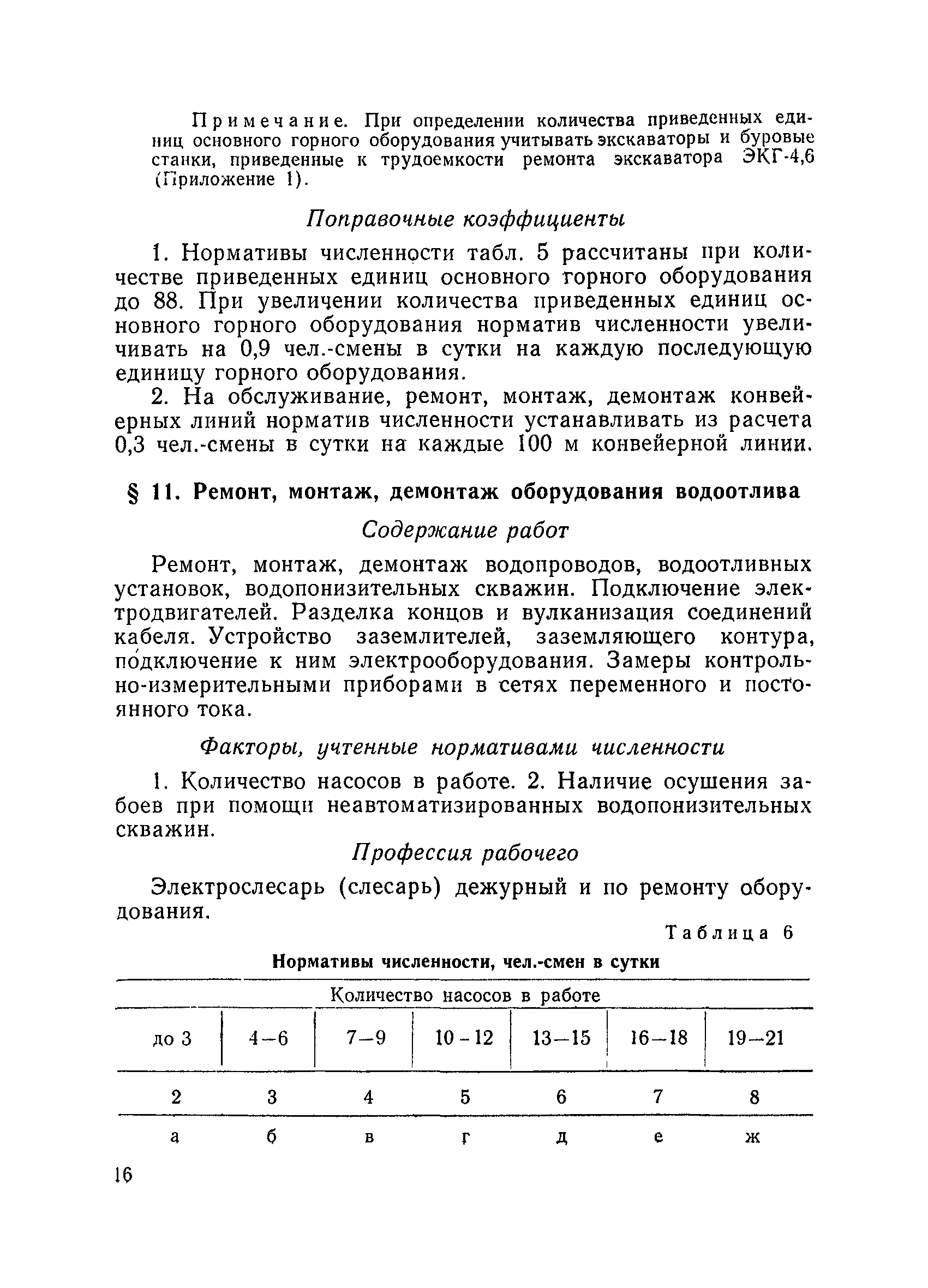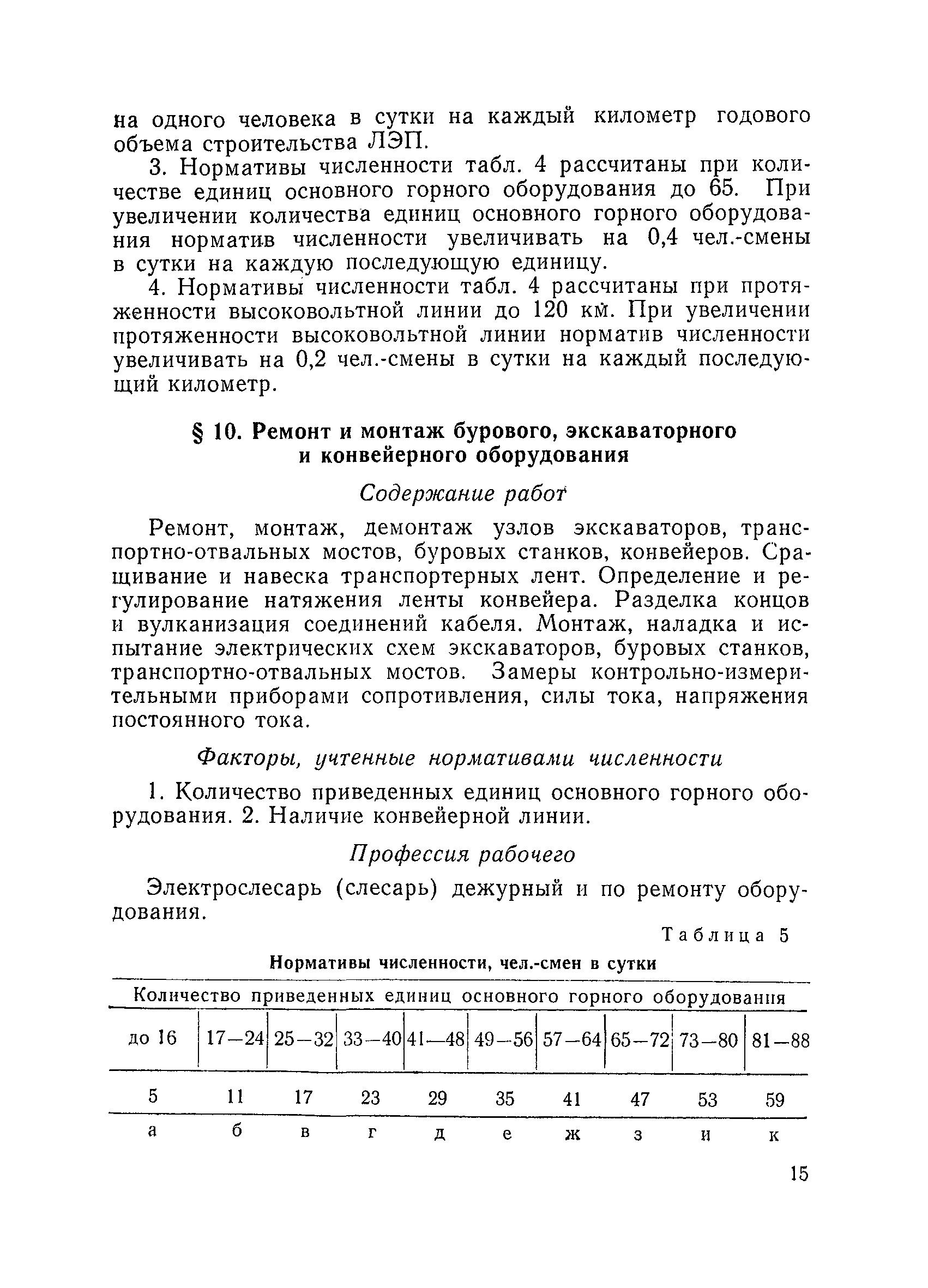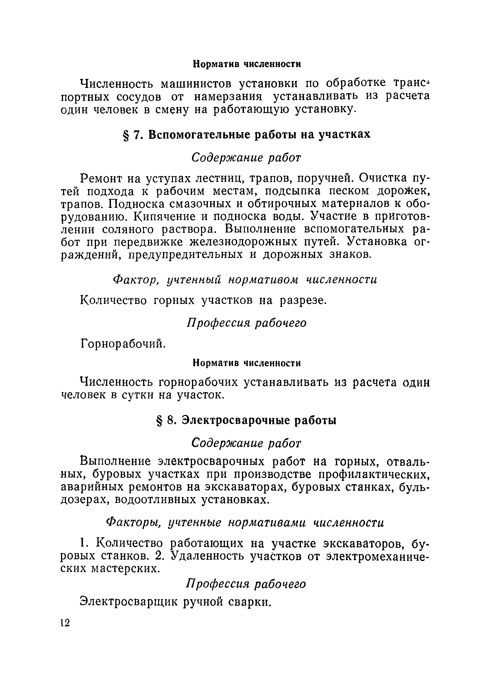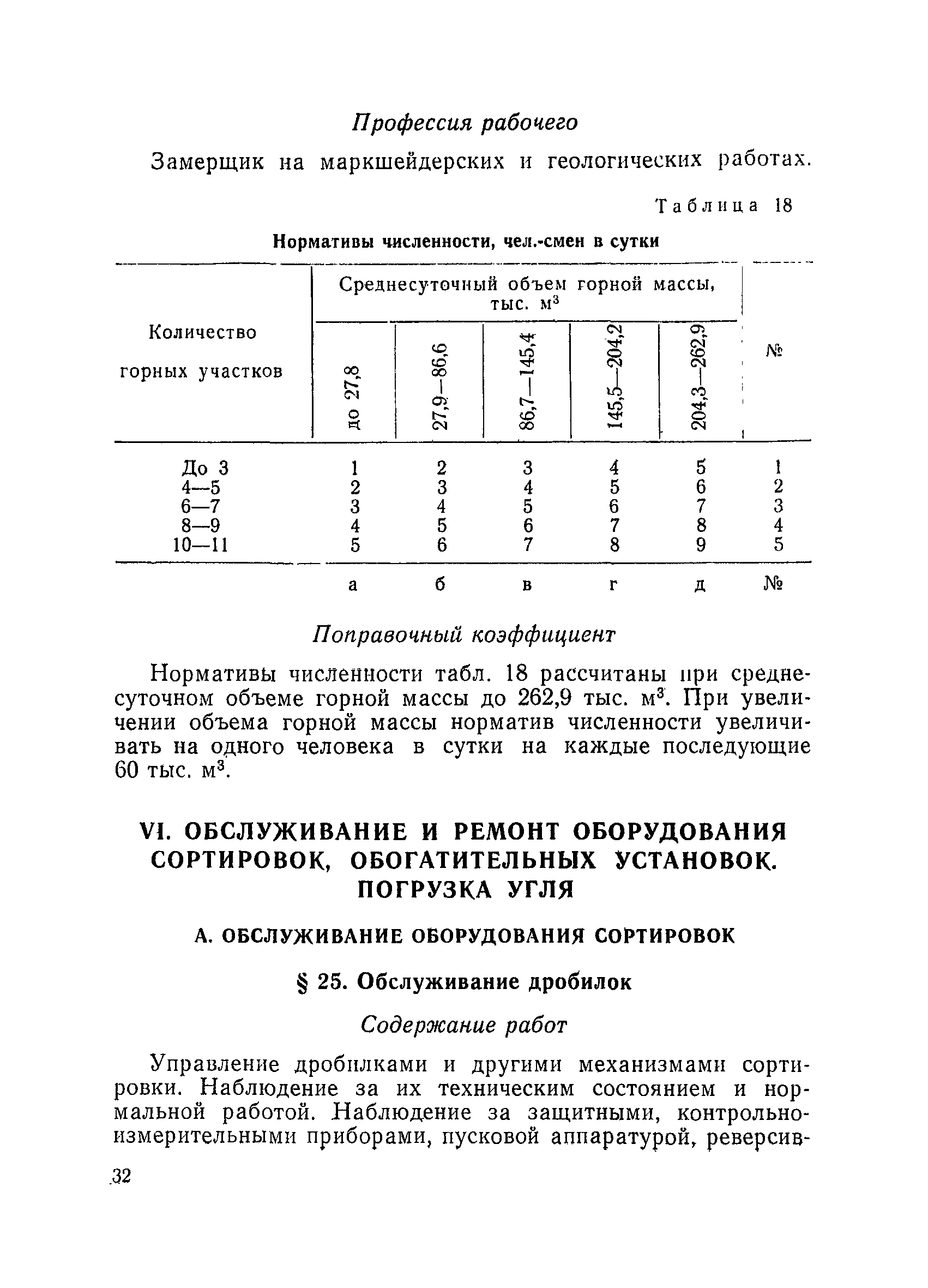 Единые нормативы численности повременно оплачиваемых рабочих разрезов| Статус: | не действует | | Название рус.: | Единые нормативы численности повременно оплачиваемых рабочих разрезов | | Дата добавления в базу: | 01.01.2018 | | Дата актуализации: | 01.01.2021 | | Область применения: | Единые нормативы численности сборника являются обязательными для применения на разрезах Министерства угольной промышленности СССР и предназначены для планирования численности повременно оплачиваемых рабочих и установления доплат рабочим за совмещение профессий, расширение зон обслуживания или увеличение объема выполняемых работ. | | Оглавление: | Общая часть Нормативная часть I Производство и обслуживание взрывных работ § 1. Взрывные работы § 2. Работы по доставке (подноске) взрывчатых материалов § 3. Работы в складах взрывчатых материалов II Работы на горных и отвальных участках . . . § 4. Передвижка конвейеров § 5. Выгрузка породы на отвалах § 6. Обработка транспортных сосудов веществами от намерзания и налипания § 7. Вспомогательные работы на участках § 8. Электросварочные работы III Энергомеханическая служба в разрезе и на поверхности, такелажные работы § 9. Осмотр и ремонт электрооборудования, монтаж, демонтаж линий электропередач горного участка § 10. Ремонт и монтаж бурового, экскаваторного и конвейерного оборудования § 11. Ремонт, монтаж, демонтаж оборудования водоотлива § 12. Работы в электромеханических мастерских § 13. Ремонт автотракторного оборудования § 14. Обслуживание производственных котельных § 15. Обслуживание бойлерной § 16. Доставка оборудования и материалов IV Управление машинами и механизмами § 17. Управление автогрейдером § 18. Управление бульдозером § 19. Управление трактором § 20. Обслуживание насосных установок V Учет и контроль качества продукции § 21. Учет добычи, вскрыши и браковка угля § 22. Набор и разделка проб угля § 23. Взвешивание грузов § 24. Замер горных работ VI Обслуживание и ремонт оборудования сортировок, обогатительных установок. Погрузка угля А. Обслуживание оборудования сортировок § 25. Обслуживание дробилок § 26. Обслуживание грохотов и конвейеров Б. Обслуживание оборудования обогатительных установок § 27. Обслуживание дробилок § 28. Обслуживание транспортных устройств а) Обслуживание конвейеров, расположенных в здании обогатительной установки б) Обслуживание конвейерных линий на мостах и галереях § 29. Обслуживание тяжелосредных и магнитных сепараторов обезвоживающих грохотов § 30. Обслуживание классификационных грохотов § 31. Обслуживание насосных установок § 32. Управление технологическим оборудованием сортировок, обогатительных установок § 33. Выборка породы на сортировках и обогатительных установках § 34. Техническое обслуживание и ремонт технологического и вспомогательного оборудования, трубопроводов и металлоконструкций, сортировок, обогатительных установок § 35. Профилактическое обслуживание и мелкий ремонт оборудования сортировок, обогатительных установок (дежурство в смене) § 36. Осмотр и ремонт электрооборудования и кабельных сетей сортировок и обогатительных установок § 37. Погрузка угля на сортировках, обогатительных установках VII Прочие работы § 38. Обслуживание производственных бань § 39. Обслуживание сатураторных установок § 40. Уборка служебных помещений административно-бытовых комбинатов разрезов § 41. Стирка сп