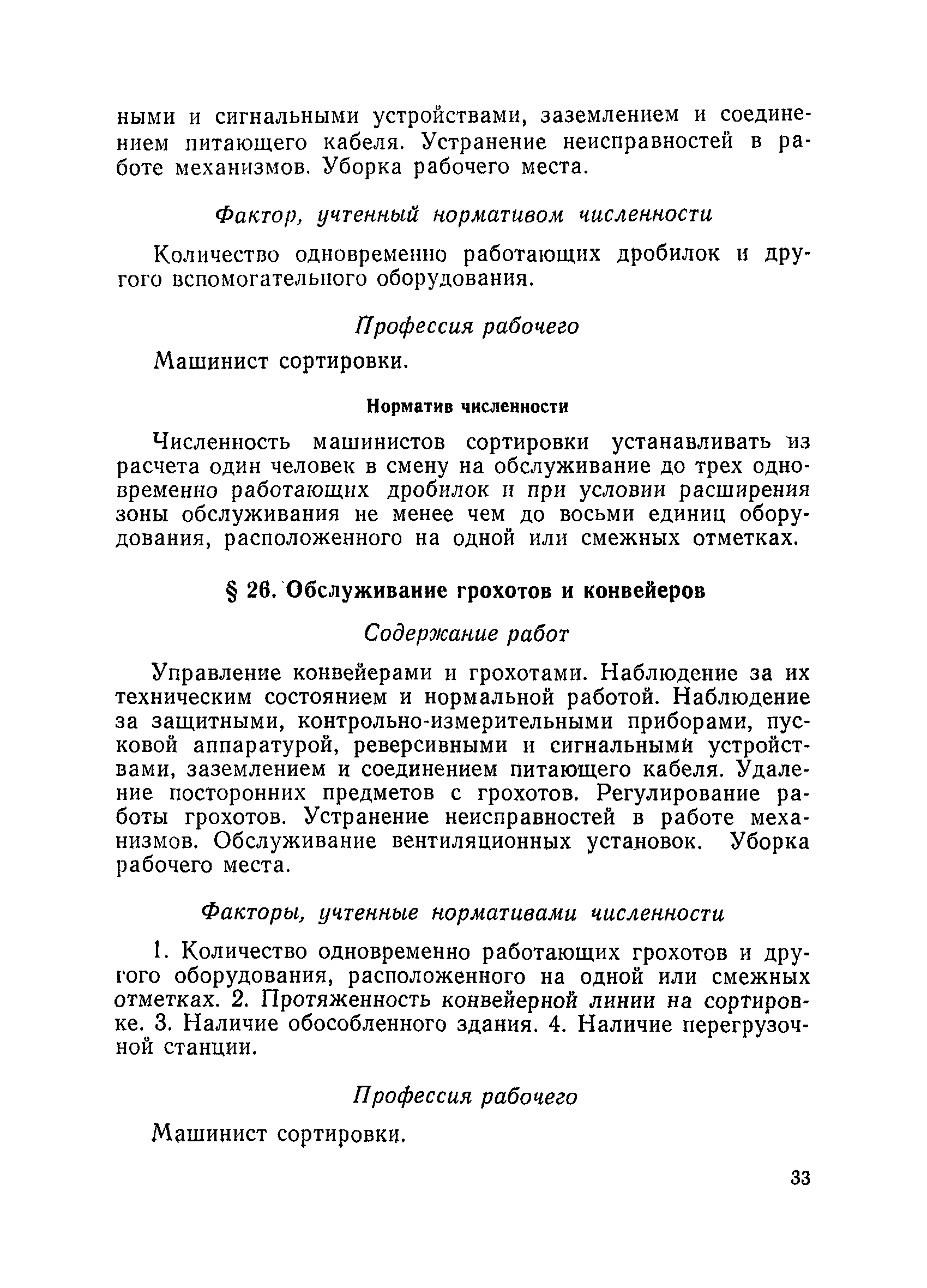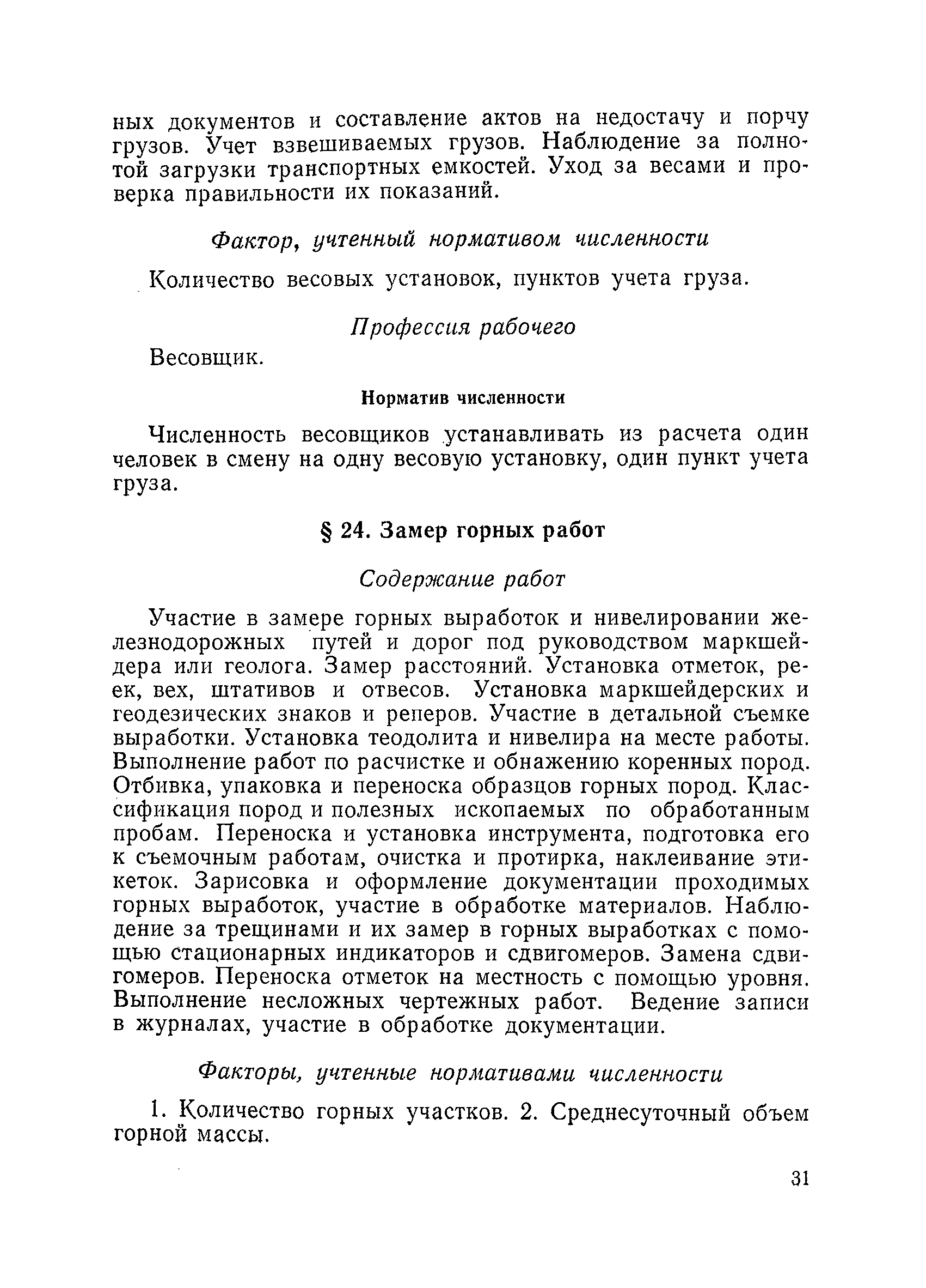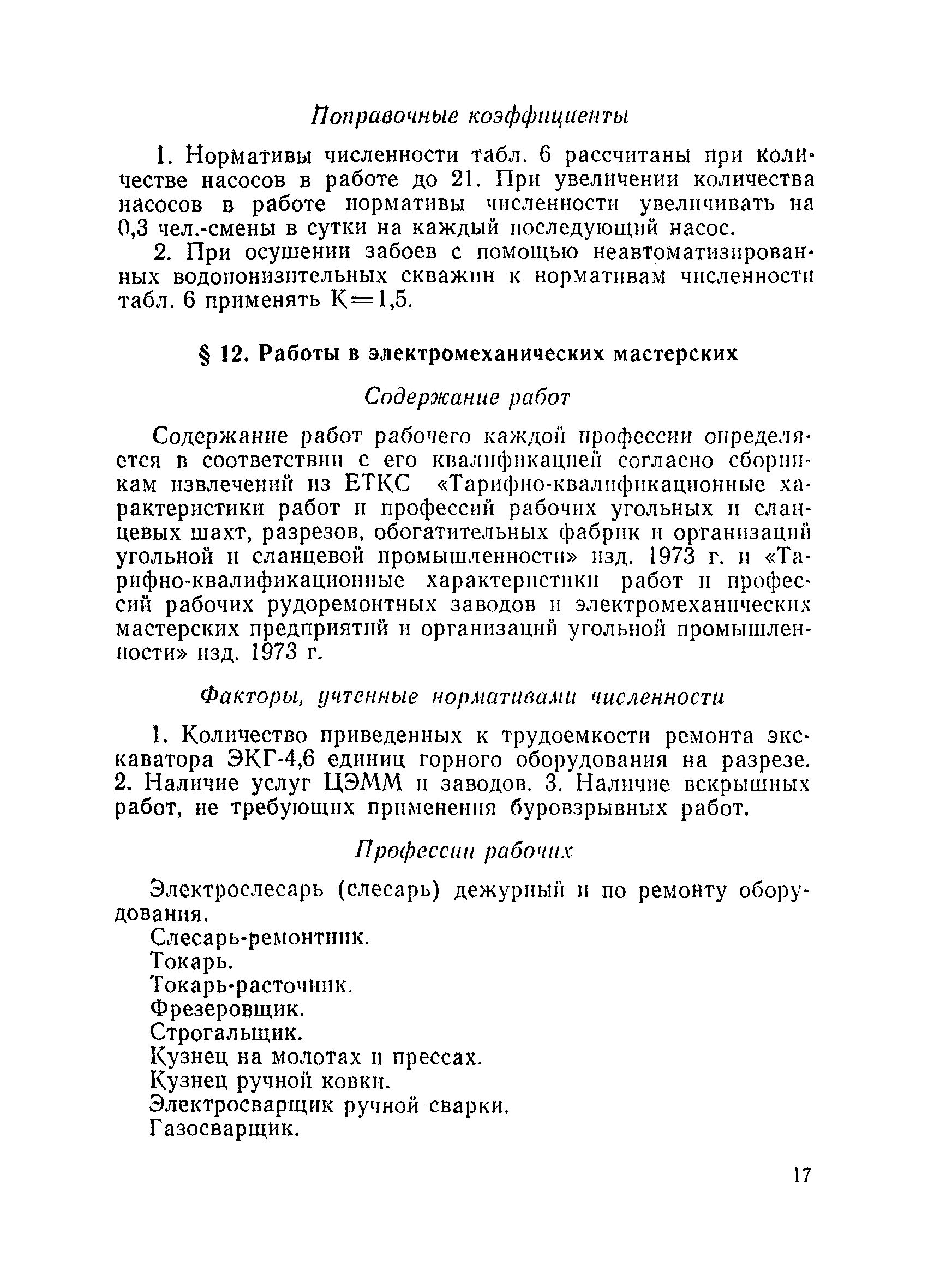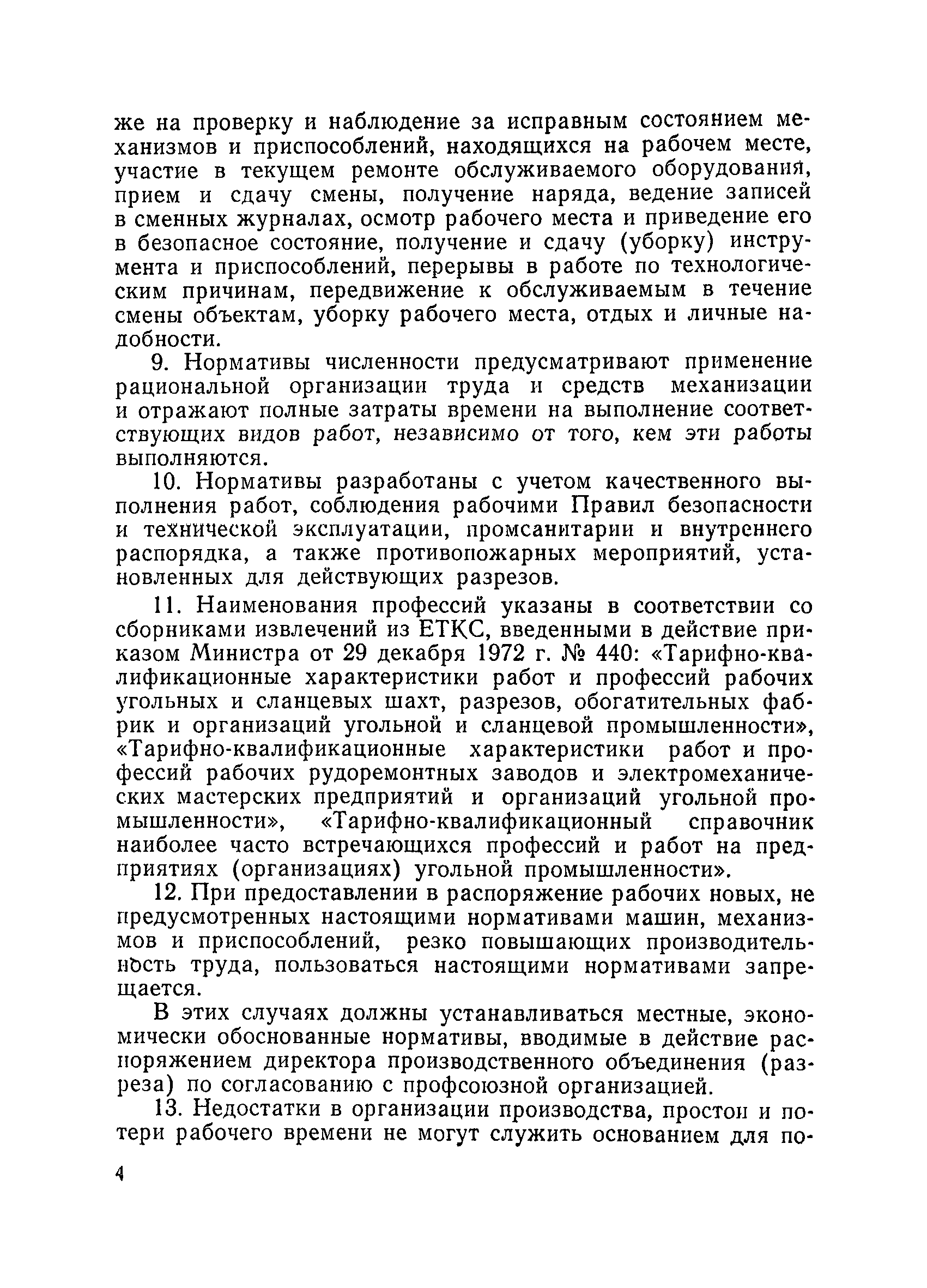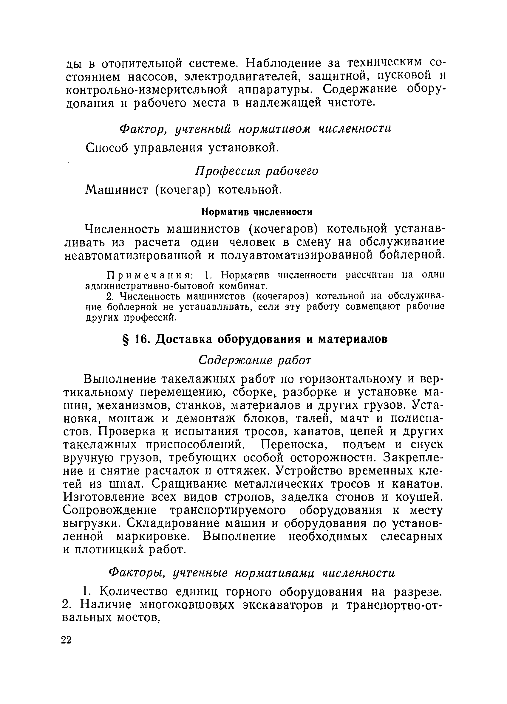 Единые нормативы численности повременно оплачиваемых рабочих разрезов| Статус: | не действует | | Название рус.: | Единые нормативы численности повременно оплачиваемых рабочих разрезов | | Дата добавления в базу: | 01.01.2018 | | Дата актуализации: | 01.01.2021 | | Область применения: | Единые нормативы численности сборника являются обязательными для применения на разрезах Министерства угольной промышленности СССР и предназначены для планирования численности повременно оплачиваемых рабочих и установления доплат рабочим за совмещение профессий, расширение зон обслуживания или увеличение объема выполняемых работ. | | Оглавление: | Общая часть Нормативная часть I Производство и обслуживание взрывных работ § 1. Взрывные работы § 2. Работы по доставке (подноске) взрывчатых материалов § 3. Работы в складах взрывчатых материалов II Работы на горных и отвальных участках . . . § 4. Передвижка конвейеров § 5. Выгрузка породы на отвалах § 6. Обработка транспортных сосудов веществами от намерзания и налипания § 7. Вспомогательные работы на участках § 8. Электросварочные работы III Энергомеханическая служба в разрезе и на поверхности, такелажные работы § 9. Осмотр и ремонт электрооборудования, монтаж, демонтаж линий электропередач горного участка § 10. Ремонт и монтаж бурового, экскаваторного и конвейерного оборудования § 11. Ремонт, монтаж, демонтаж оборудования водоотлива § 12. Работы в электромеханических мастерских § 13. Ремонт автотракторного оборудования § 14. Обслуживание производственных котельных § 15. Обслуживание бойлерной § 16. Доставка оборудования и материалов IV Управление машинами и механизмами § 17. Управление автогрейдером § 18. Управление бульдозером § 19. Управление трактором § 20. Обслуживание насосных установок V Учет и контроль качества продукции § 21. Учет добычи, вскрыши и браковка угля § 22. Набор и разделка проб угля § 23. Взвешивание грузов § 24. Замер горных работ VI Обслуживание и ремонт оборудования сортировок, обогатительных установок. Погрузка угля А. Обслуживание оборудования сортировок § 25. Обслуживание дробилок § 26. Обслуживание грохотов и конвейеров Б. Обслуживание оборудования обогатительных установок § 27. Обслуживание дробилок § 28. Обслуживание транспортных устройств а) Обслуживание конвейеров, расположенных в здании обогатительной установки б) Обслуживание конвейерных линий на мостах и галереях § 29. Обслуживание тяжелосредных и магнитных сепараторов обезвоживающих грохотов § 30. Обслуживание классификационных грохотов § 31. Обслуживание насосных установок § 32. Управление технологическим оборудованием сортировок, обогатительных установок § 33. Выборка породы на сортировках и обогатительных установках § 34. Техническое обслуживание и ремонт технологического и вспомогательного оборудования, трубопроводов и металлоконструкций, сортировок, обогатительных установок § 35. Профилактическое обслуживание и мелкий ремонт оборудования сортировок, обогатительных установок (дежурство в смене) § 36. Осмотр и ремонт электрооборудования и кабельных сетей сортировок и обогатительных установок § 37. Погрузка угля на сортировках, обогатительных установках VII Прочие работы § 38. Обслуживание производственных бань § 39. Обслуживание сатураторных установок § 40. Уборка служебных помещений административно-бытовых комбинатов разрезов § 41. Стирка сп