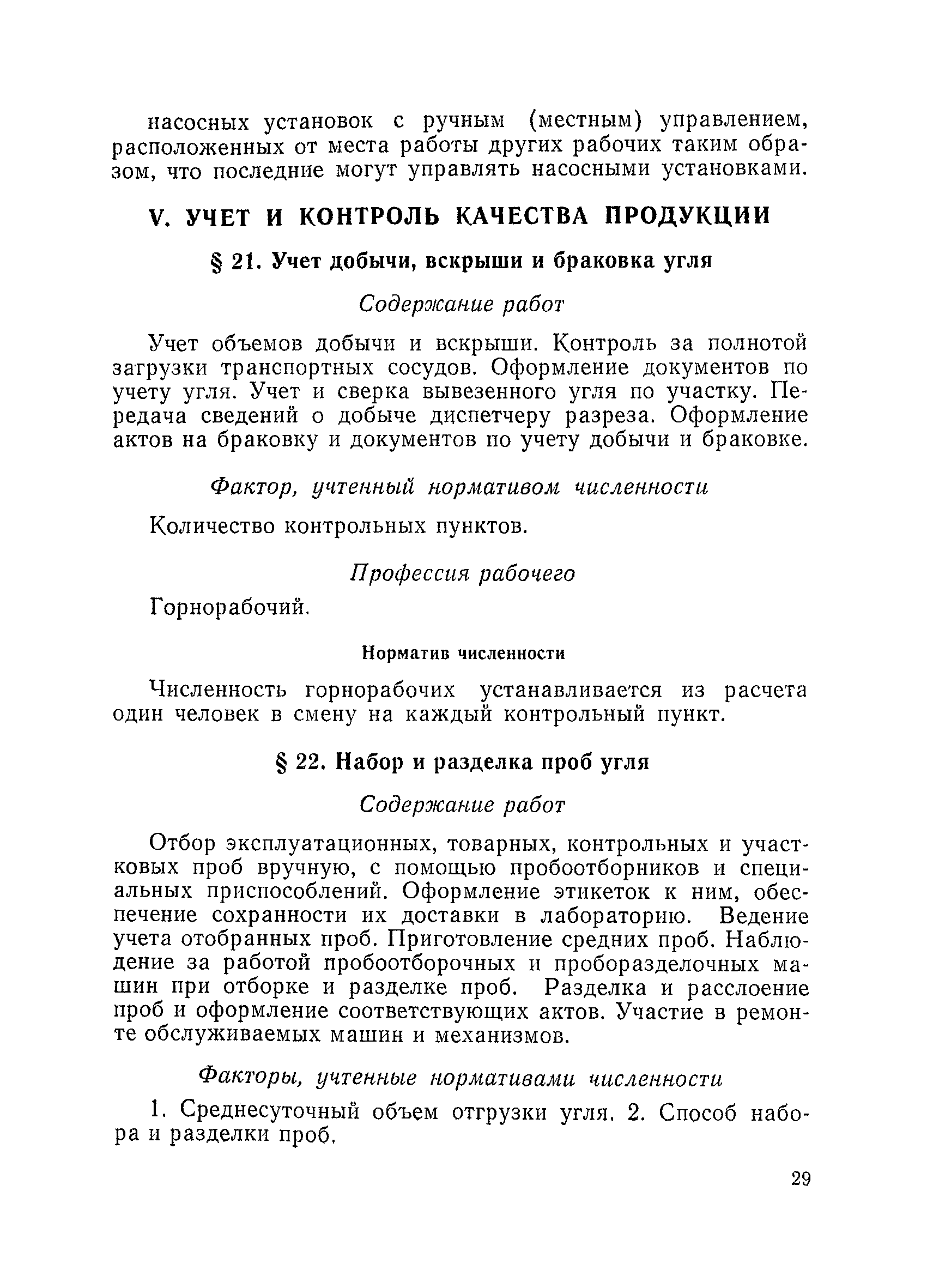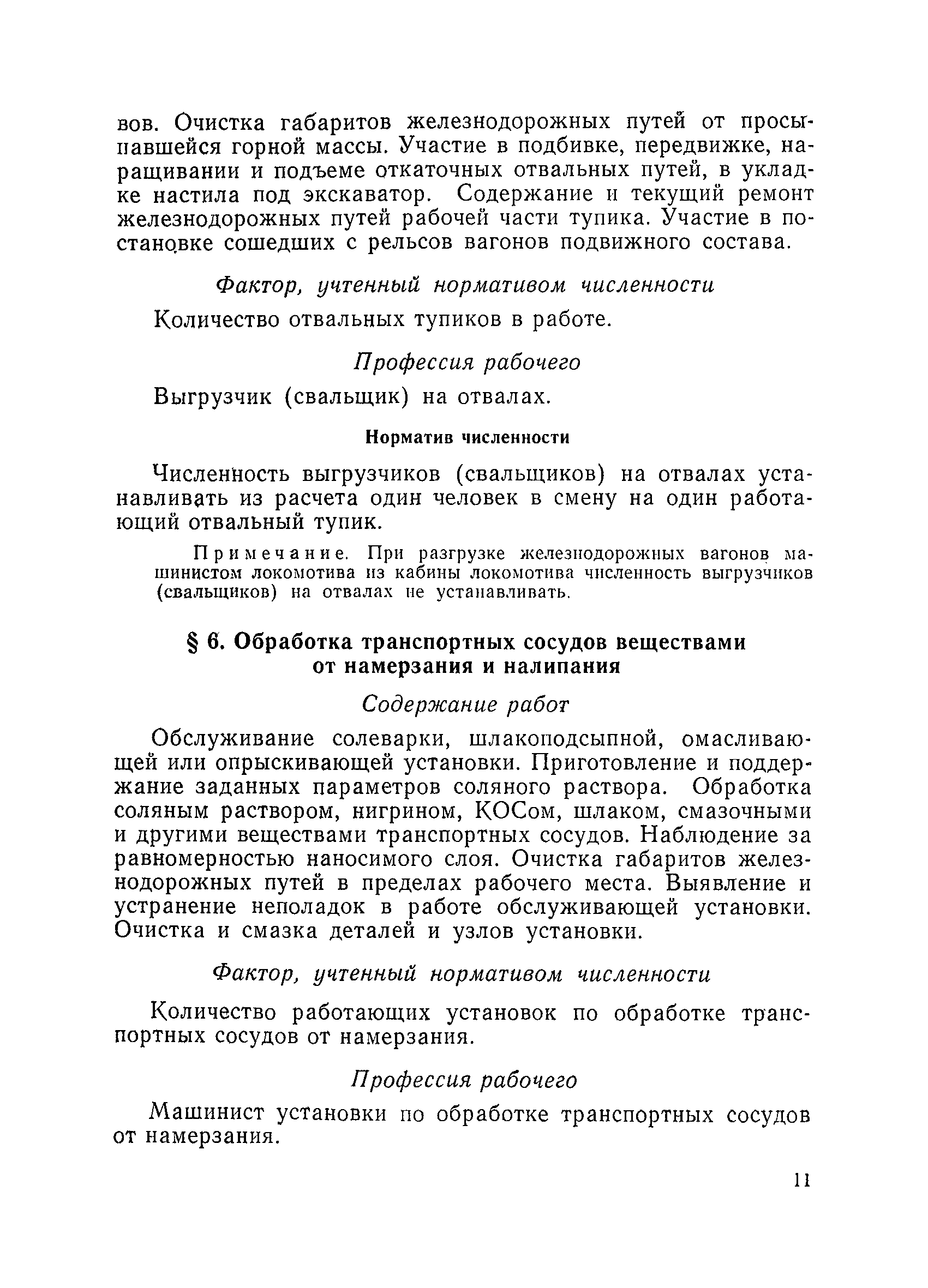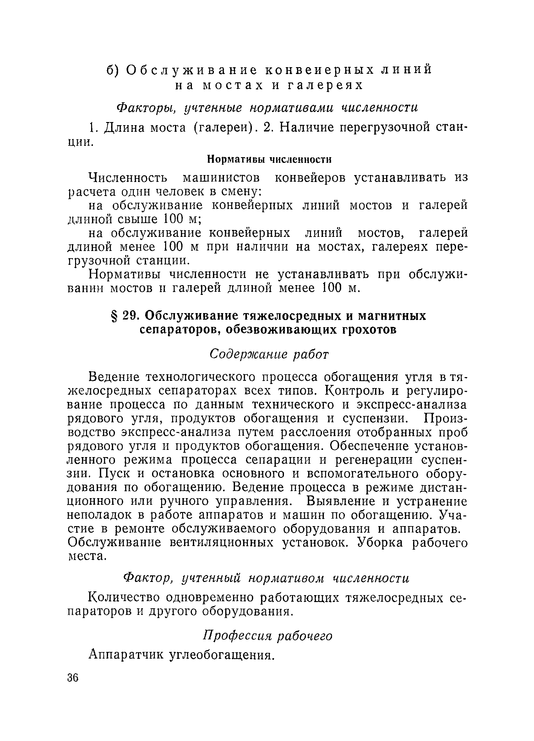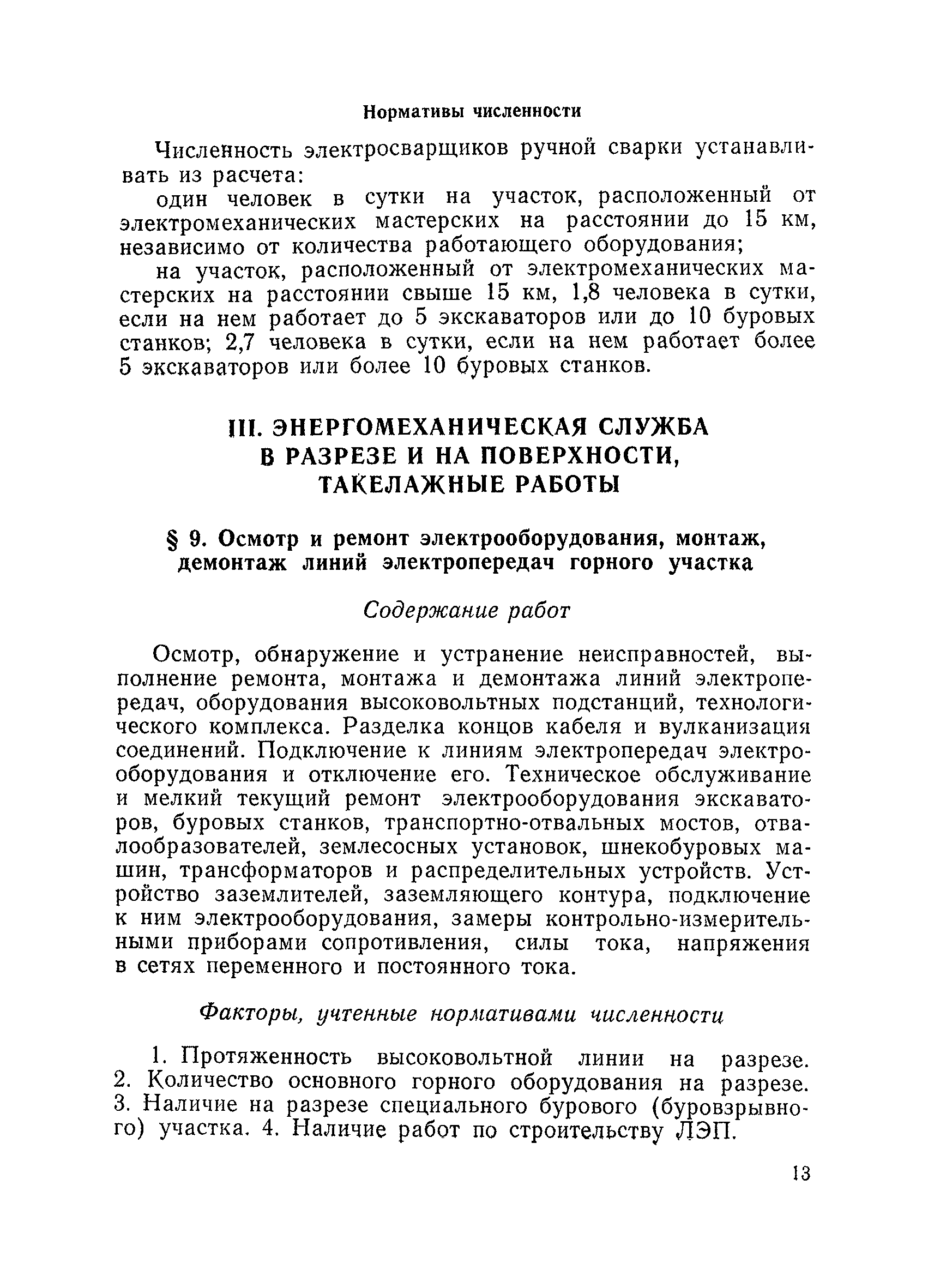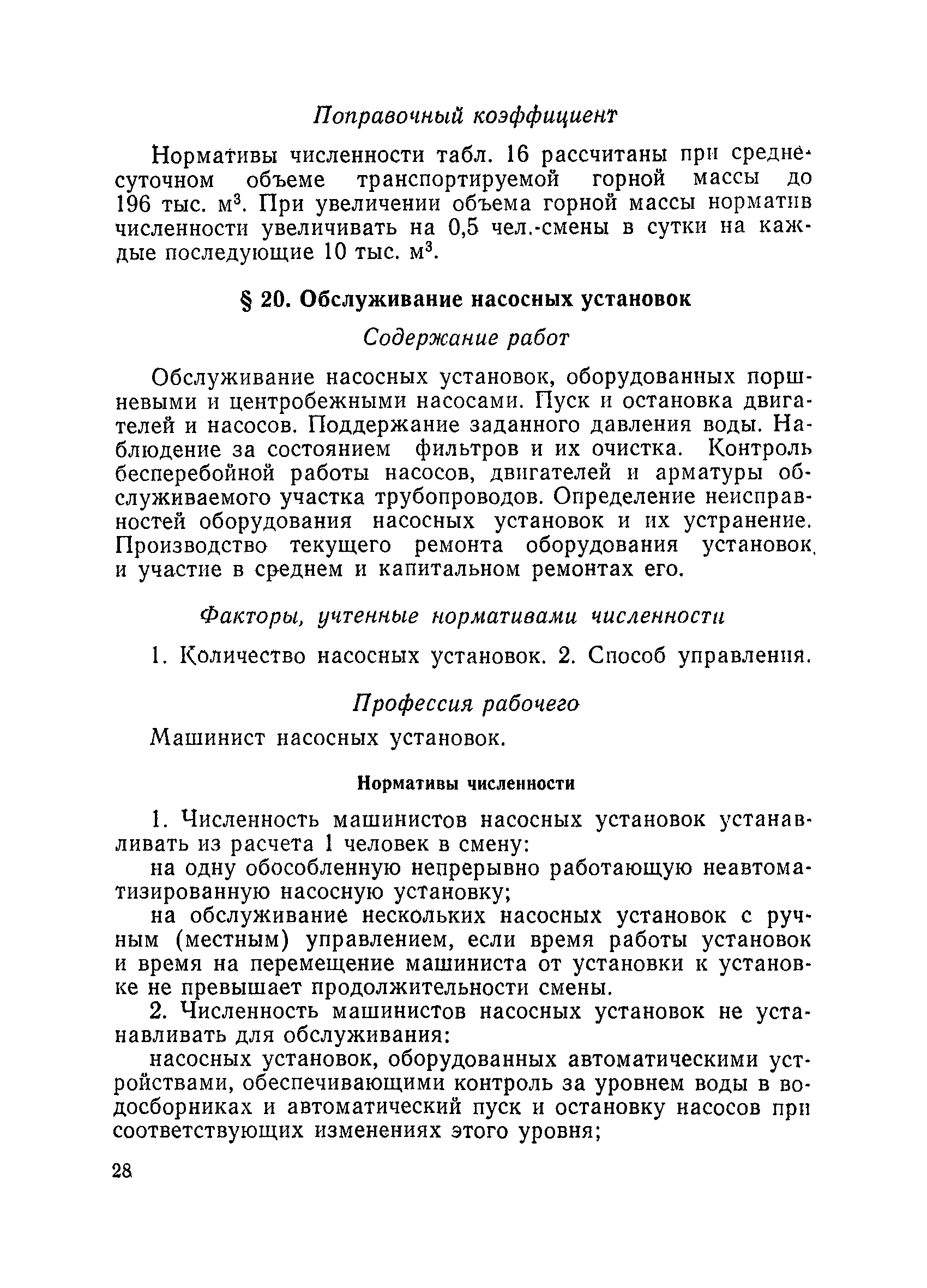 Единые нормативы численности повременно оплачиваемых рабочих разрезов| Статус: | не действует | | Название рус.: | Единые нормативы численности повременно оплачиваемых рабочих разрезов | | Дата добавления в базу: | 01.01.2018 | | Дата актуализации: | 01.01.2021 | | Область применения: | Единые нормативы численности сборника являются обязательными для применения на разрезах Министерства угольной промышленности СССР и предназначены для планирования численности повременно оплачиваемых рабочих и установления доплат рабочим за совмещение профессий, расширение зон обслуживания или увеличение объема выполняемых работ. | | Оглавление: | Общая часть Нормативная часть I Производство и обслуживание взрывных работ § 1. Взрывные работы § 2. Работы по доставке (подноске) взрывчатых материалов § 3. Работы в складах взрывчатых материалов II Работы на горных и отвальных участках . . . § 4. Передвижка конвейеров § 5. Выгрузка породы на отвалах § 6. Обработка транспортных сосудов веществами от намерзания и налипания § 7. Вспомогательные работы на участках § 8. Электросварочные работы III Энергомеханическая служба в разрезе и на поверхности, такелажные работы § 9. Осмотр и ремонт электрооборудования, монтаж, демонтаж линий электропередач горного участка § 10. Ремонт и монтаж бурового, экскаваторного и конвейерного оборудования § 11. Ремонт, монтаж, демонтаж оборудования водоотлива § 12. Работы в электромеханических мастерских § 13. Ремонт автотракторного оборудования § 14. Обслуживание производственных котельных § 15. Обслуживание бойлерной § 16. Доставка оборудования и материалов IV Управление машинами и механизмами § 17. Управление автогрейдером § 18. Управление бульдозером § 19. Управление трактором § 20. Обслуживание насосных установок V Учет и контроль качества продукции § 21. Учет добычи, вскрыши и браковка угля § 22. Набор и разделка проб угля § 23. Взвешивание грузов § 24. Замер горных работ VI Обслуживание и ремонт оборудования сортировок, обогатительных установок. Погрузка угля А. Обслуживание оборудования сортировок § 25. Обслуживание дробилок § 26. Обслуживание грохотов и конвейеров Б. Обслуживание оборудования обогатительных установок § 27. Обслуживание дробилок § 28. Обслуживание транспортных устройств а) Обслуживание конвейеров, расположенных в здании обогатительной установки б) Обслуживание конвейерных линий на мостах и галереях § 29. Обслуживание тяжелосредных и магнитных сепараторов обезвоживающих грохотов § 30. Обслуживание классификационных грохотов § 31. Обслуживание насосных установок § 32. Управление технологическим оборудованием сортировок, обогатительных установок § 33. Выборка породы на сортировках и обогатительных установках § 34. Техническое обслуживание и ремонт технологического и вспомогательного оборудования, трубопроводов и металлоконструкций, сортировок, обогатительных установок § 35. Профилактическое обслуживание и мелкий ремонт оборудования сортировок, обогатительных установок (дежурство в смене) § 36. Осмотр и ремонт электрооборудования и кабельных сетей сортировок и обогатительных установок § 37. Погрузка угля на сортировках, обогатительных установках VII Прочие работы § 38. Обслуживание производственных бань § 39. Обслуживание сатураторных установок § 40. Уборка служебных помещений административно-бытовых комбинатов разрезов § 41. Стирка сп