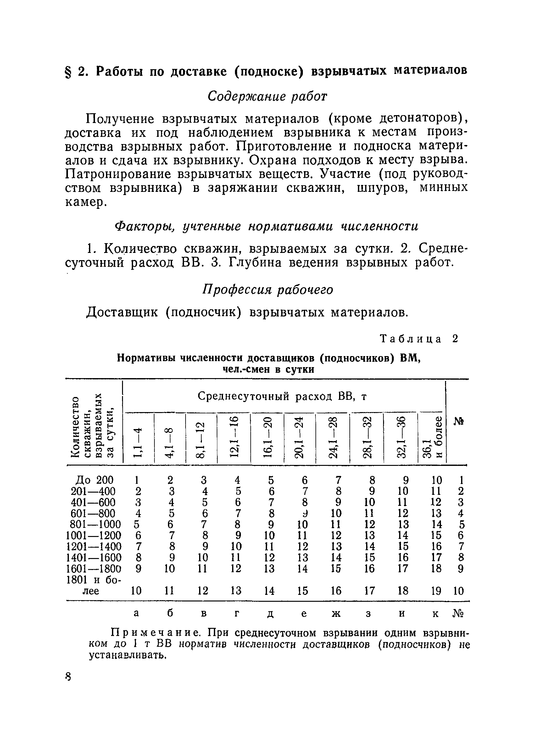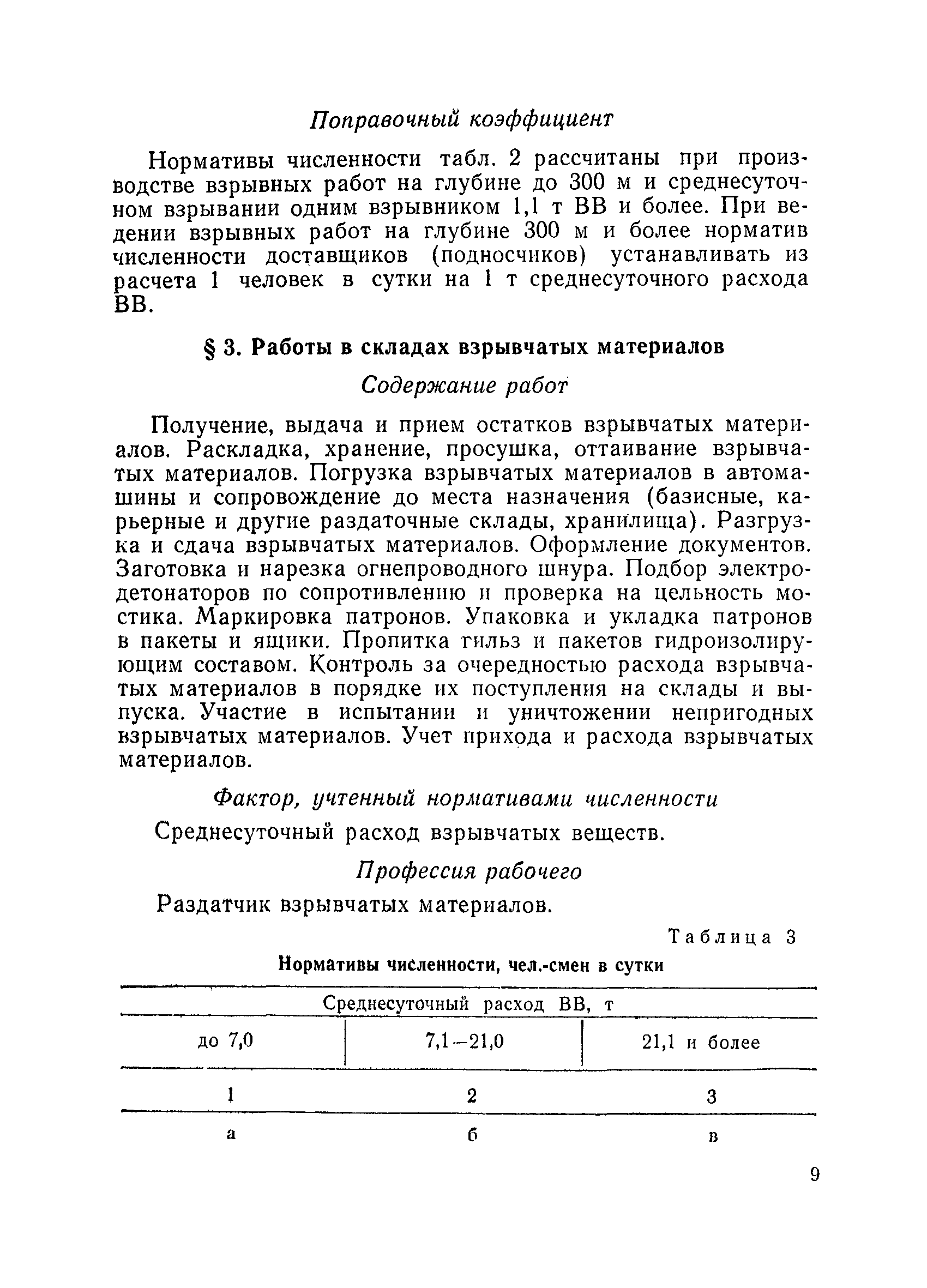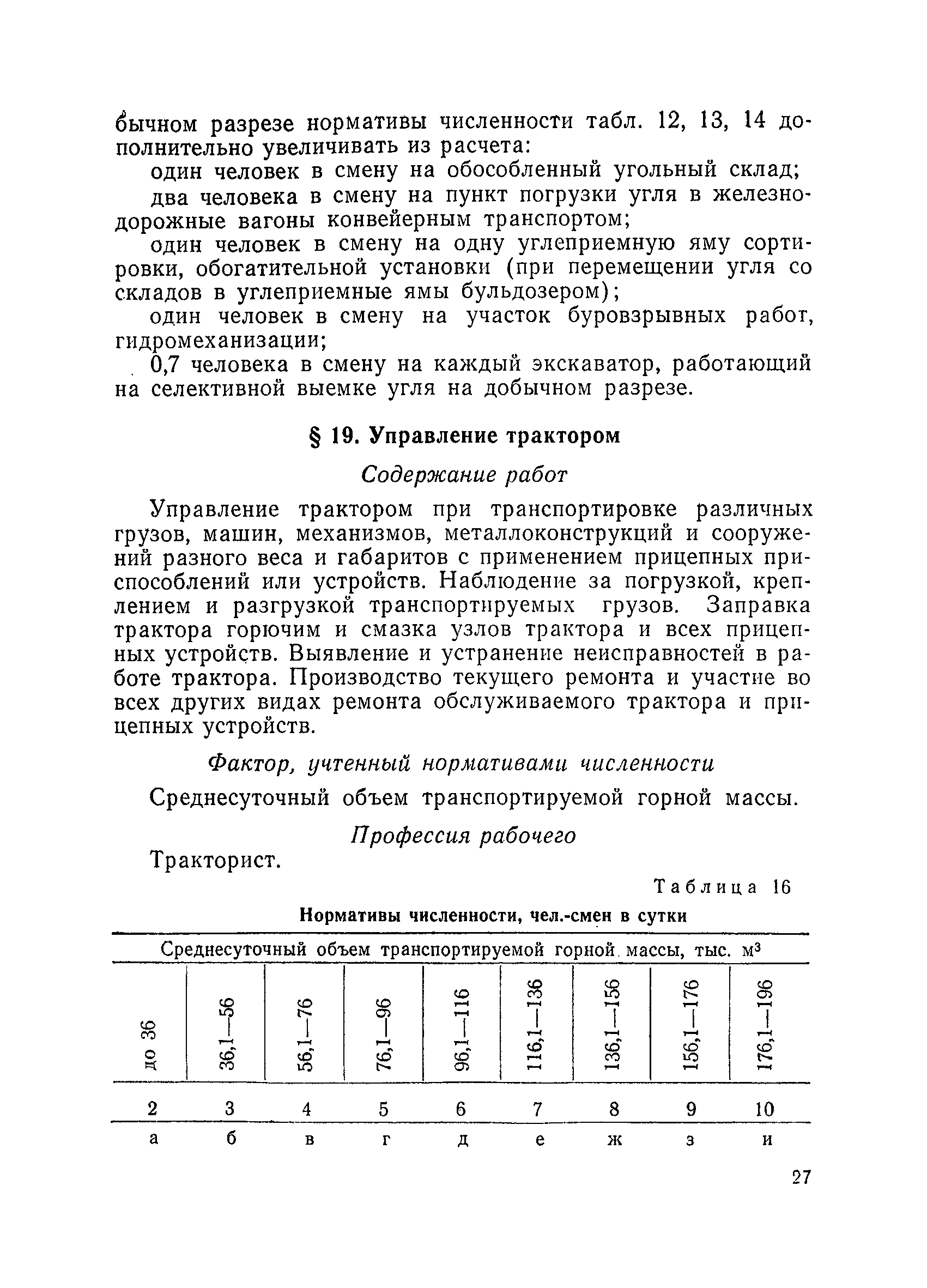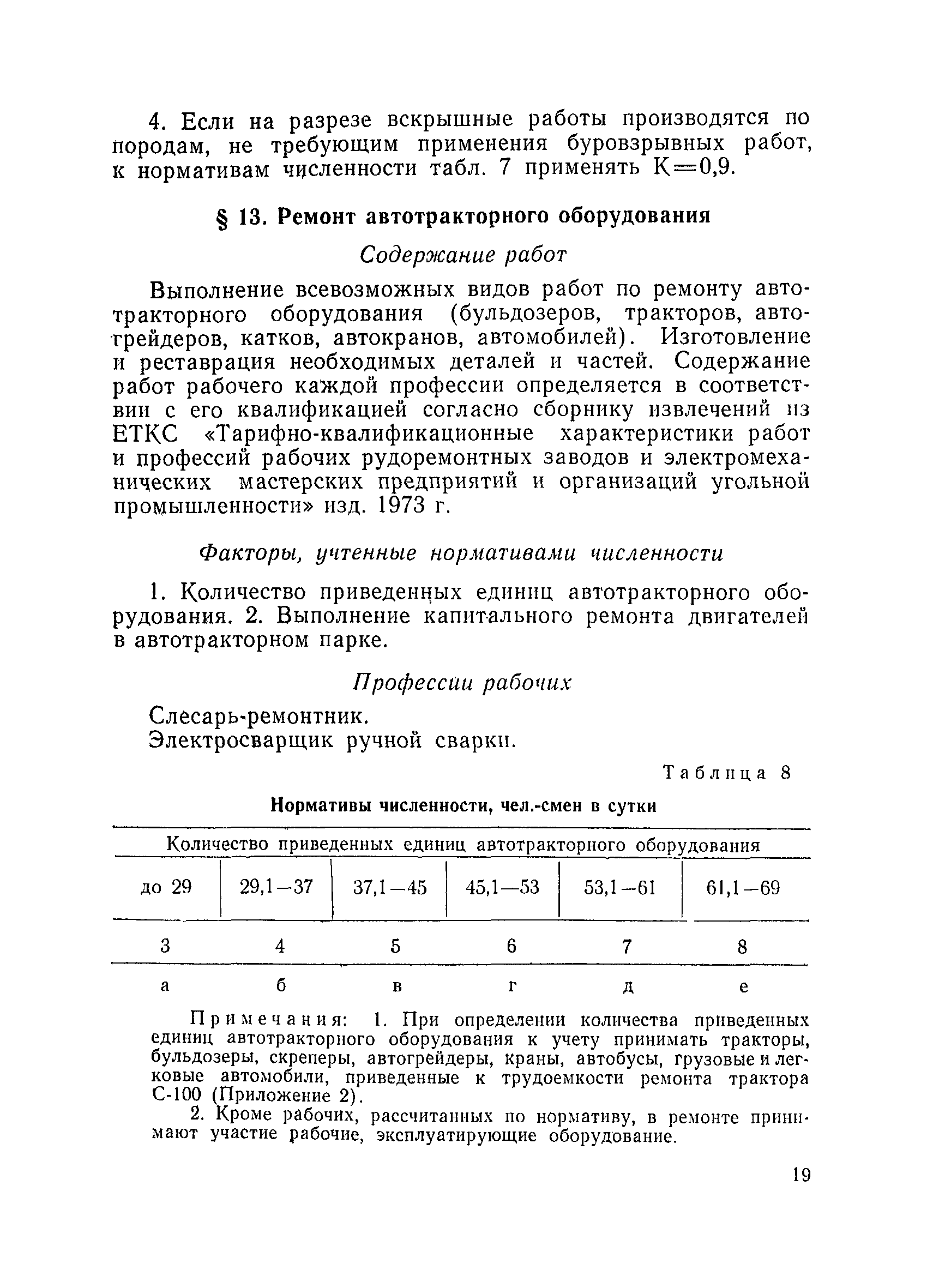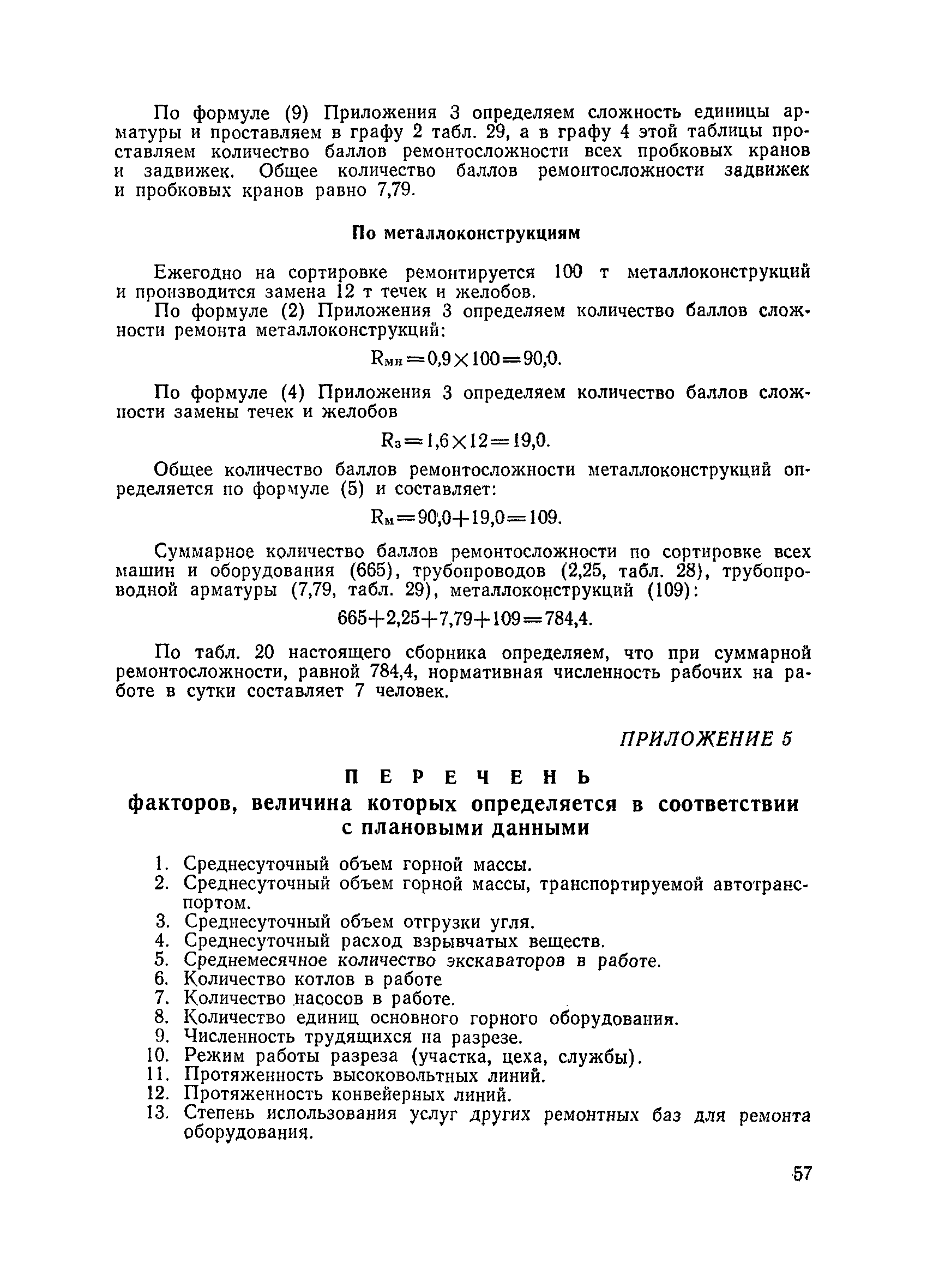 Единые нормативы численности повременно оплачиваемых рабочих разрезов| Статус: | не действует | | Название рус.: | Единые нормативы численности повременно оплачиваемых рабочих разрезов | | Дата добавления в базу: | 01.01.2018 | | Дата актуализации: | 01.01.2021 | | Область применения: | Единые нормативы численности сборника являются обязательными для применения на разрезах Министерства угольной промышленности СССР и предназначены для планирования численности повременно оплачиваемых рабочих и установления доплат рабочим за совмещение профессий, расширение зон обслуживания или увеличение объема выполняемых работ. | | Оглавление: | Общая часть Нормативная часть I Производство и обслуживание взрывных работ § 1. Взрывные работы § 2. Работы по доставке (подноске) взрывчатых материалов § 3. Работы в складах взрывчатых материалов II Работы на горных и отвальных участках . . . § 4. Передвижка конвейеров § 5. Выгрузка породы на отвалах § 6. Обработка транспортных сосудов веществами от намерзания и налипания § 7. Вспомогательные работы на участках § 8. Электросварочные работы III Энергомеханическая служба в разрезе и на поверхности, такелажные работы § 9. Осмотр и ремонт электрооборудования, монтаж, демонтаж линий электропередач горного участка § 10. Ремонт и монтаж бурового, экскаваторного и конвейерного оборудования § 11. Ремонт, монтаж, демонтаж оборудования водоотлива § 12. Работы в электромеханических мастерских § 13. Ремонт автотракторного оборудования § 14. Обслуживание производственных котельных § 15. Обслуживание бойлерной § 16. Доставка оборудования и материалов IV Управление машинами и механизмами § 17. Управление автогрейдером § 18. Управление бульдозером § 19. Управление трактором § 20. Обслуживание насосных установок V Учет и контроль качества продукции § 21. Учет добычи, вскрыши и браковка угля § 22. Набор и разделка проб угля § 23. Взвешивание грузов § 24. Замер горных работ VI Обслуживание и ремонт оборудования сортировок, обогатительных установок. Погрузка угля А. Обслуживание оборудования сортировок § 25. Обслуживание дробилок § 26. Обслуживание грохотов и конвейеров Б. Обслуживание оборудования обогатительных установок § 27. Обслуживание дробилок § 28. Обслуживание транспортных устройств а) Обслуживание конвейеров, расположенных в здании обогатительной установки б) Обслуживание конвейерных линий на мостах и галереях § 29. Обслуживание тяжелосредных и магнитных сепараторов обезвоживающих грохотов § 30. Обслуживание классификационных грохотов § 31. Обслуживание насосных установок § 32. Управление технологическим оборудованием сортировок, обогатительных установок § 33. Выборка породы на сортировках и обогатительных установках § 34. Техническое обслуживание и ремонт технологического и вспомогательного оборудования, трубопроводов и металлоконструкций, сортировок, обогатительных установок § 35. Профилактическое обслуживание и мелкий ремонт оборудования сортировок, обогатительных установок (дежурство в смене) § 36. Осмотр и ремонт электрооборудования и кабельных сетей сортировок и обогатительных установок § 37. Погрузка угля на сортировках, обогатительных установках VII Прочие работы § 38. Обслуживание производственных бань § 39. Обслуживание сатураторных установок § 40. Уборка служебных помещений административно-бытовых комбинатов разрезов § 41. Стирка сп
