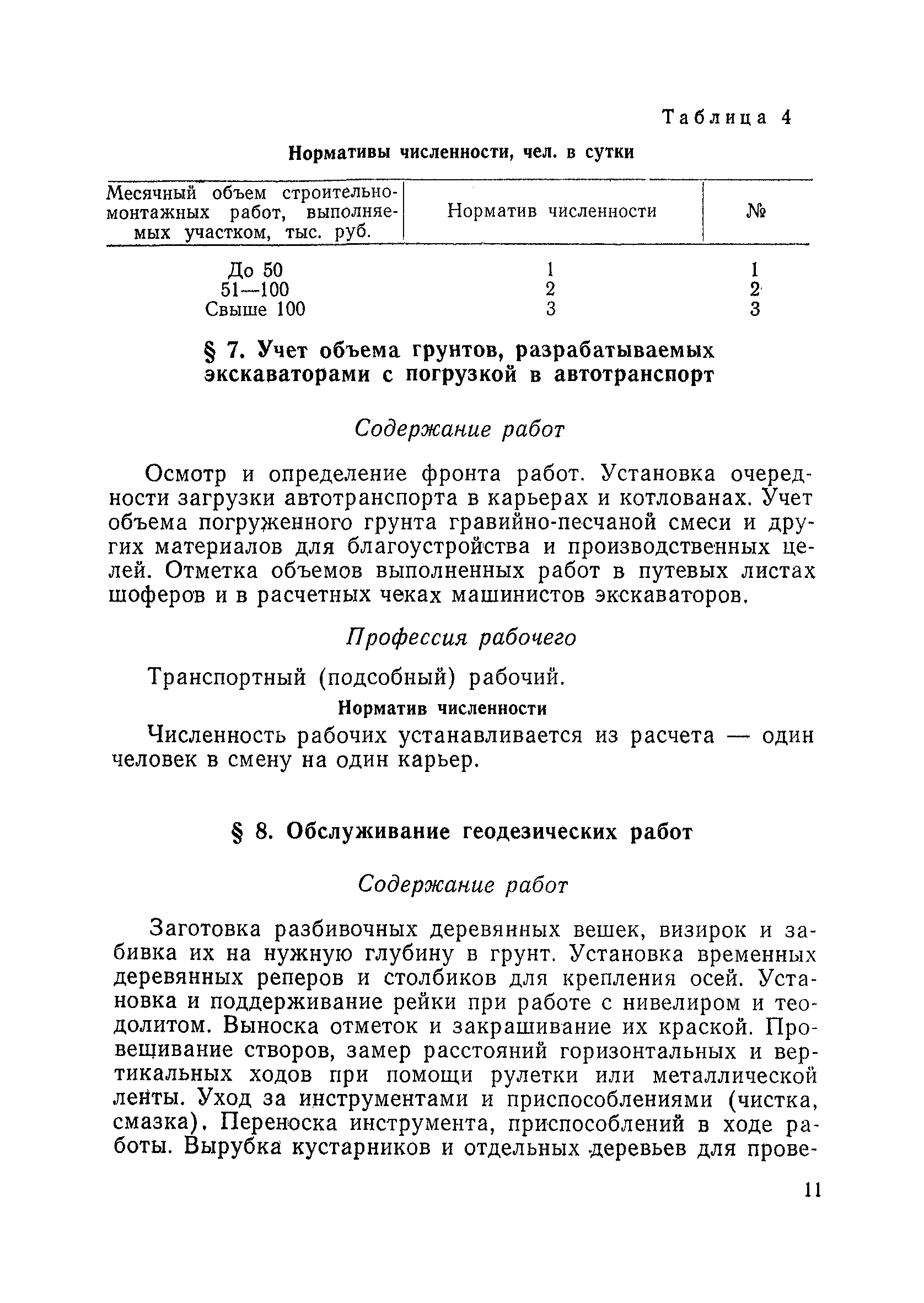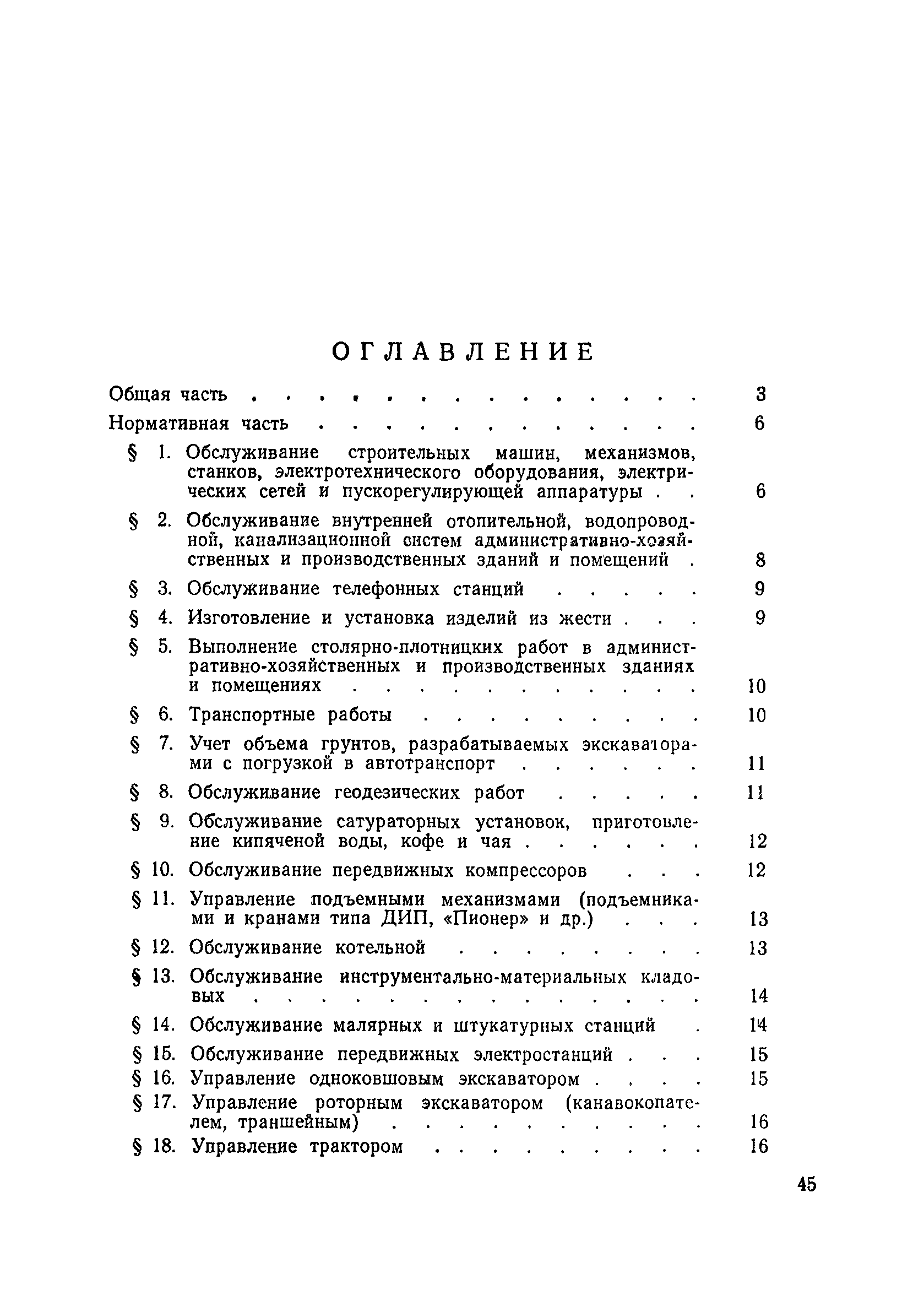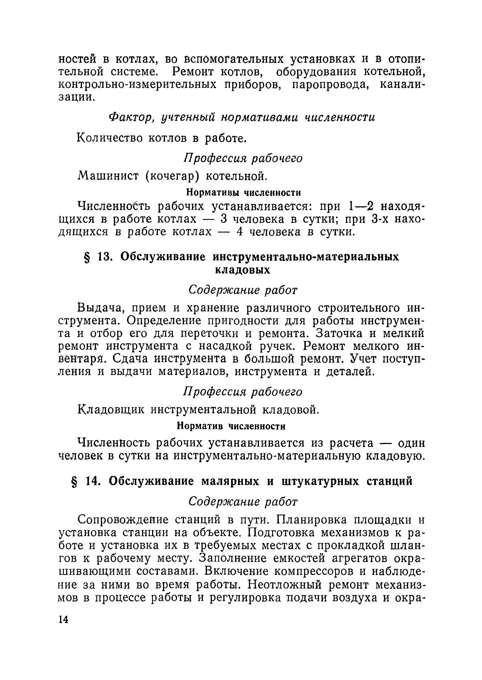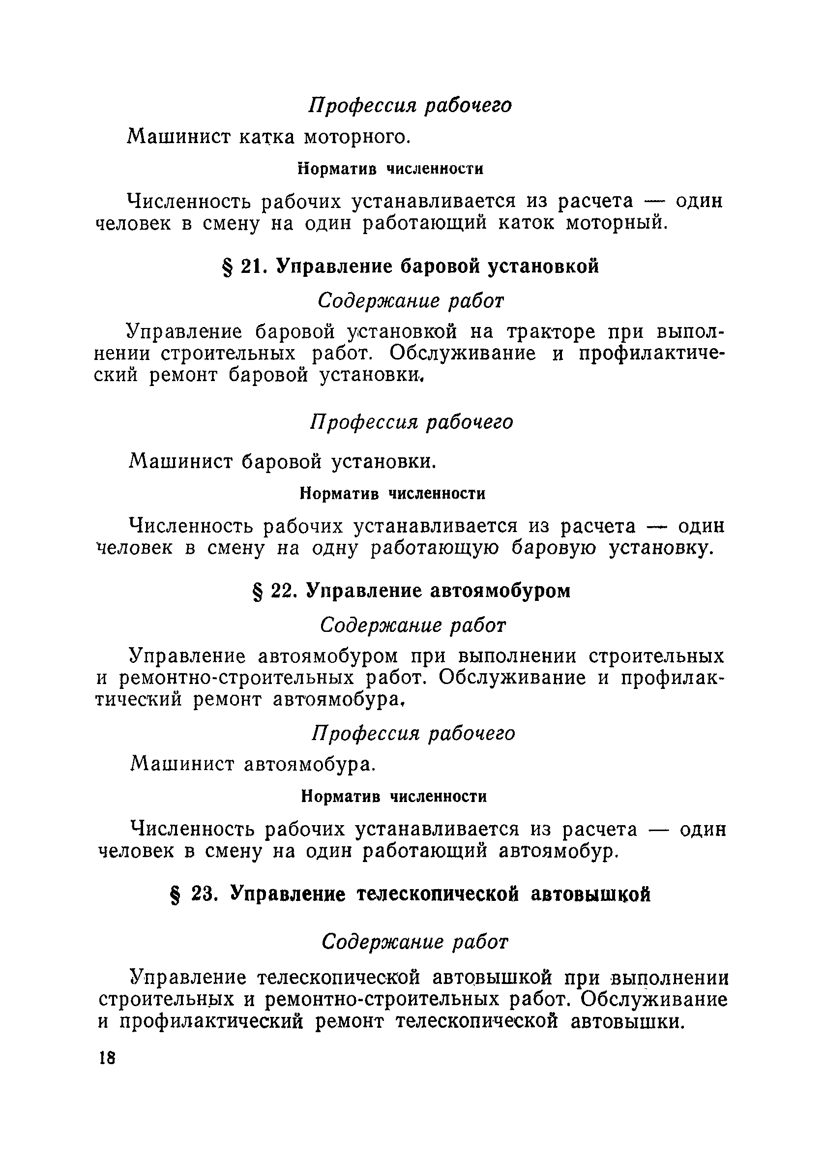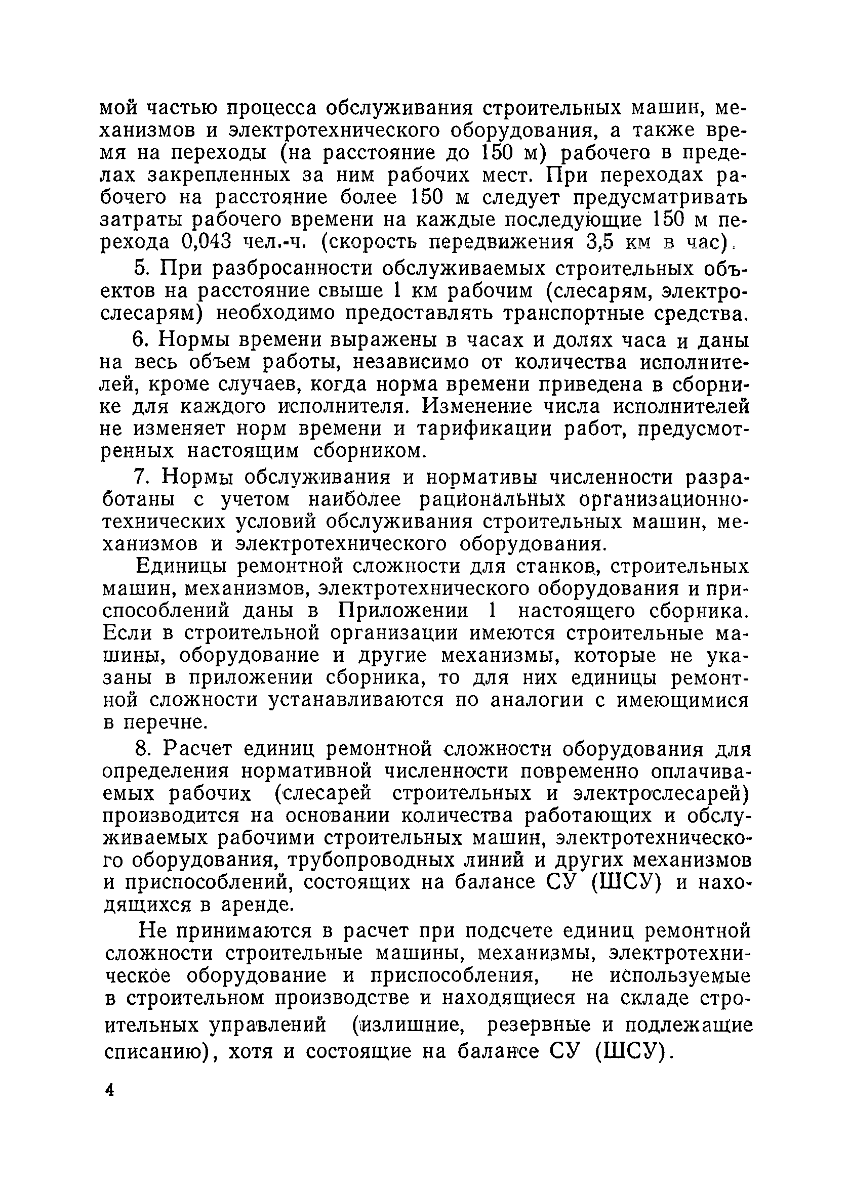 Единые нормативы численности повременно оплачиваемых рабочих, занятых на вспомогательных работах в основном и подсобном производстве строительных организаций| Статус: | не действует | | Название рус.: | Единые нормативы численности повременно оплачиваемых рабочих, занятых на вспомогательных работах в основном и подсобном производстве строительных организаций | | Дата добавления в базу: | 01.01.2018 | | Дата актуализации: | 01.01.2021 | | Область применения: | Нормативы численности сборника являются обязательными для применения в строительных организациях и их вспомогательных службах Минуглепрома СССР и предназначены для планирования численности повременно оплачиваемых рабочих и установления доплат рабочим за совмещение профессий и расширение зон обслуживания. Нормативы определяют явочную численность рабочих на смену или сутки при продолжительности рабочей смены 8 часов при пятидневной рабочей неделе. | | Оглавление: | Общая часть Нормативная часть 1 Обслуживание строительных машин, механизмов, станков, электротехнического оборудования, электрических сетей и пускорегулирующей аппаратуры 2 Обслуживание внутренней отопительной, водопроводной, канализационной систем административно-хозяйственных и производственных зданий и помещений 3 Обслуживание телефонных станций 4 Изготовление и установка изделий из жести 5 Выполнение столярно-плотницких работ в административно-хозяйственных и производственных зданиях и помещениях 6 Транспортные работы 7 Учет объема грунтов, разрабатываемых экскаваторами с погрузкой в автотранспорт 8 Обслуживание геодезических работ 9 Обслуживание сатураторных установок, приготовление кипяченой воды, кофе и чая 10 Обслуживание передвижных компрессоров 11 Управление подъемными механизмами (подъемниками и кранами типа ДИП, "Пионер" и др.) 12 Обслуживание котельной 13 Обслуживание инструментально-материальных кладовых 14. Обслуживание малярных и штукатурных станций 15. Обслуживание передвижных электростанций 16. Управление одноковшовым экскаватором 17. Управление роторным экскаватором (канавокопателем, траншейным) 18. Управление трактором 19. Управление бульдозером и скрепером 20. Управление моторным катком 21. Управление баровой установкой 22. Управление автоямобуром 23. Управление телескопической автовышкой 24. Управление автогрейдером 25. Управление автомобильным погрузчиком 26. Управление механическим и гидравлическим тракторными погрузчиками 27. Управление башенным самоходным и стационарным кранами 28, Управление кранами на гусеничном и пневмоколесном ходу 29. Управление краном-трубоукладчиком 30. Управление автомобильным краном 31. Управление укладчиком асфальтобетона 32. Управление автогудронатором 33. Зарядка и ремонт аккумуляторов 34. Вулканизационные работы 35. Медницкие работы Приложение 1. Перечень машин и механизмов, применяемых в строительстве и подсобных производствах строительных организаций и ремонтная сложность их обслуживания в баллах Приложение 2. Пример расчета суммарной ремонтной сложности действующего оборудования и норматива численности слесарей строительных и электрослесарей по участку строительного управления | | Разработан: | ЦНИС по труду МУП СССР