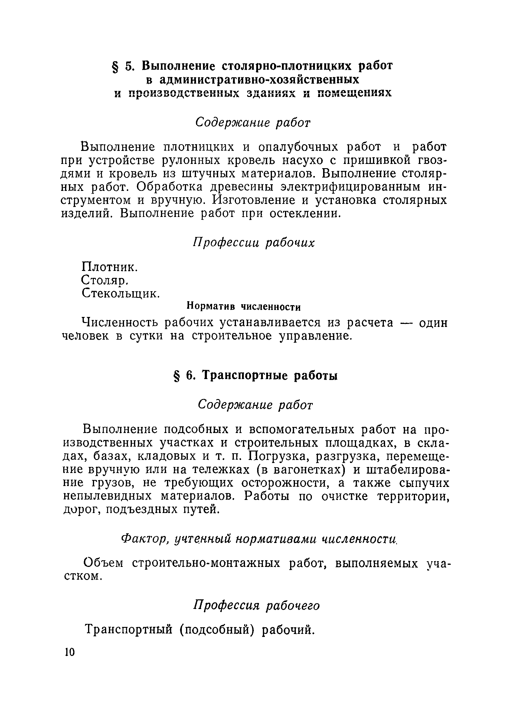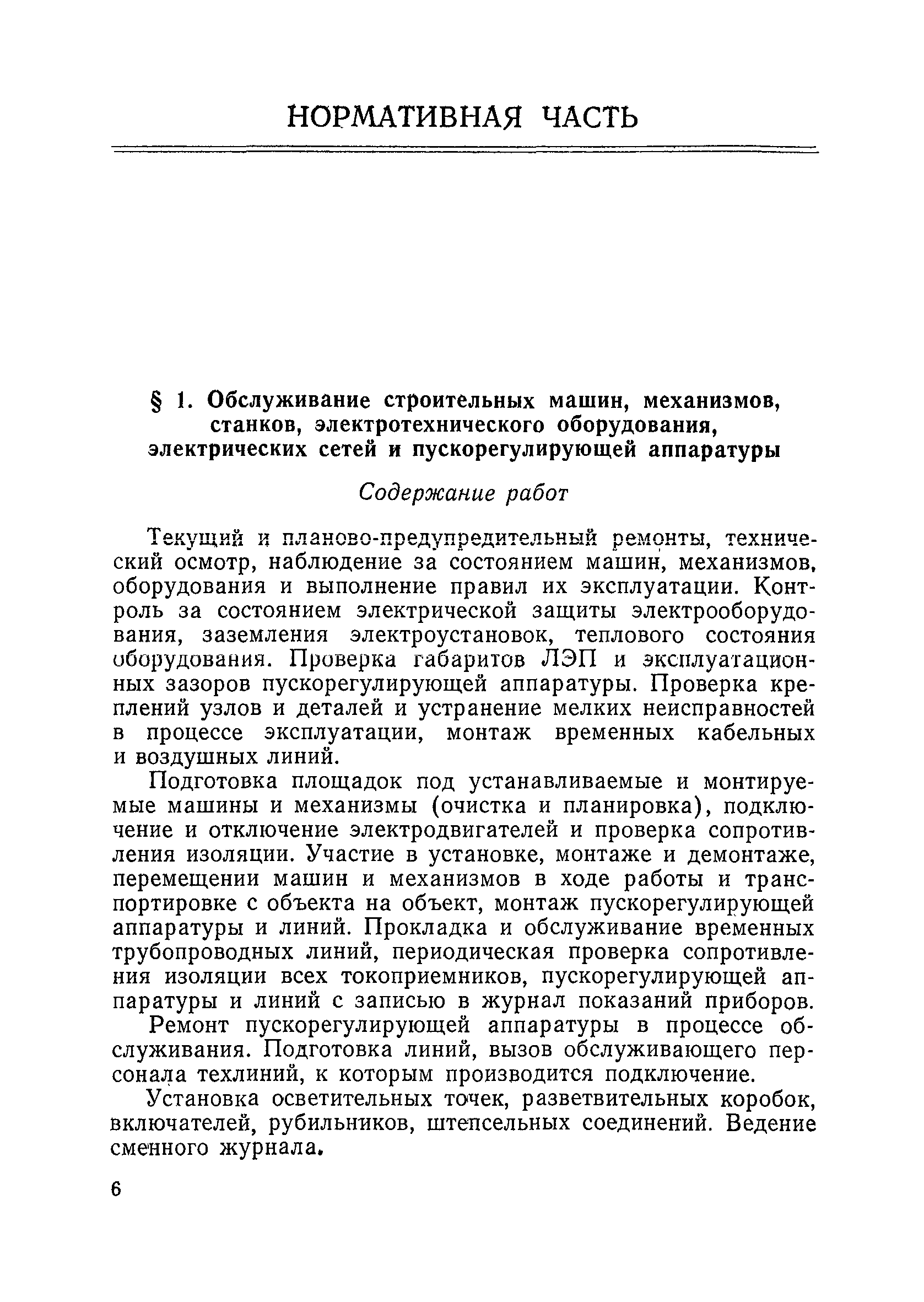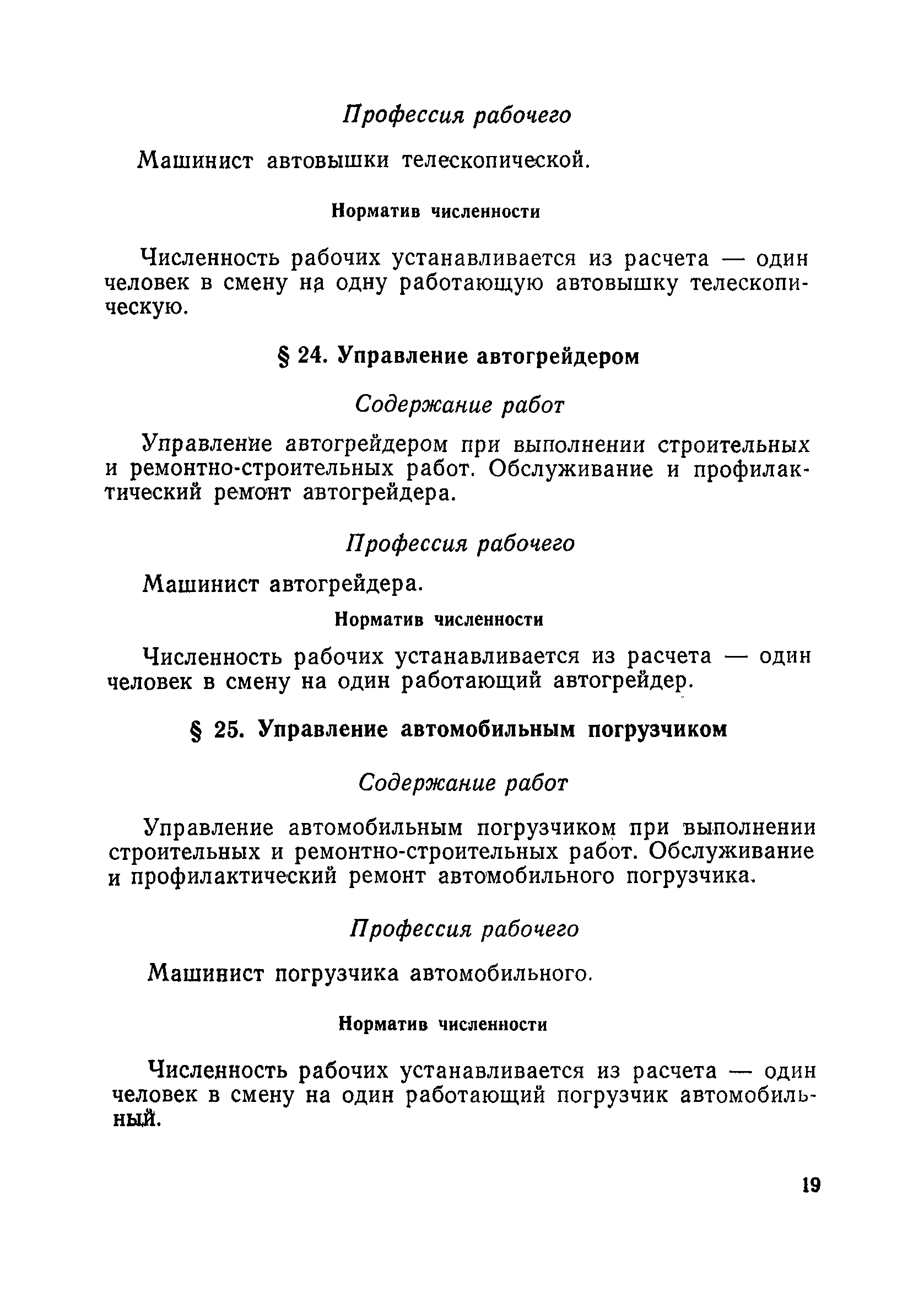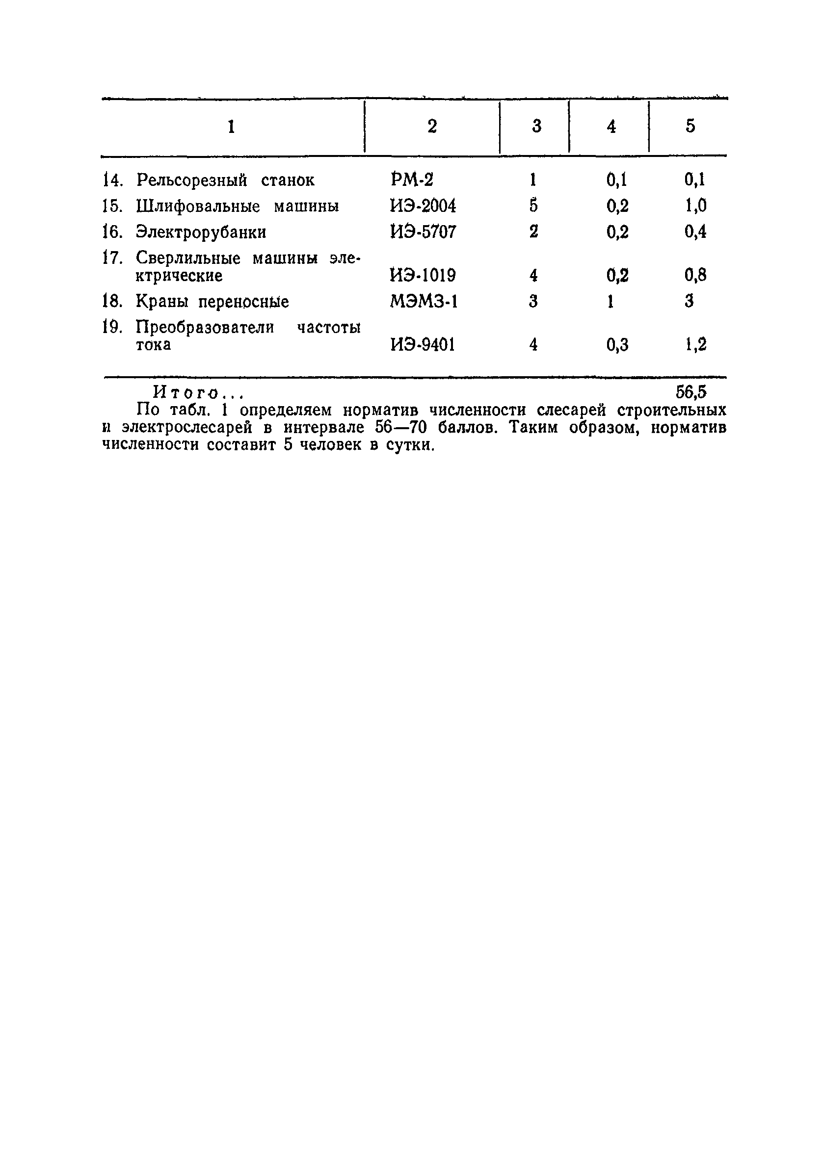 Единые нормативы численности повременно оплачиваемых рабочих, занятых на вспомогательных работах в основном и подсобном производстве строительных организаций| Статус: | не действует | | Название рус.: | Единые нормативы численности повременно оплачиваемых рабочих, занятых на вспомогательных работах в основном и подсобном производстве строительных организаций | | Дата добавления в базу: | 01.01.2018 | | Дата актуализации: | 01.01.2021 | | Область применения: | Нормативы численности сборника являются обязательными для применения в строительных организациях и их вспомогательных службах Минуглепрома СССР и предназначены для планирования численности повременно оплачиваемых рабочих и установления доплат рабочим за совмещение профессий и расширение зон обслуживания. Нормативы определяют явочную численность рабочих на смену или сутки при продолжительности рабочей смены 8 часов при пятидневной рабочей неделе. | | Оглавление: | Общая часть Нормативная часть 1 Обслуживание строительных машин, механизмов, станков, электротехнического оборудования, электрических сетей и пускорегулирующей аппаратуры 2 Обслуживание внутренней отопительной, водопроводной, канализационной систем административно-хозяйственных и производственных зданий и помещений 3 Обслуживание телефонных станций 4 Изготовление и установка изделий из жести 5 Выполнение столярно-плотницких работ в административно-хозяйственных и производственных зданиях и помещениях 6 Транспортные работы 7 Учет объема грунтов, разрабатываемых экскаваторами с погрузкой в автотранспорт 8 Обслуживание геодезических работ 9 Обслуживание сатураторных установок, приготовление кипяченой воды, кофе и чая 10 Обслуживание передвижных компрессоров 11 Управление подъемными механизмами (подъемниками и кранами типа ДИП, "Пионер" и др.) 12 Обслуживание котельной 13 Обслуживание инструментально-материальных кладовых 14. Обслуживание малярных и штукатурных станций 15. Обслуживание передвижных электростанций 16. Управление одноковшовым экскаватором 17. Управление роторным экскаватором (канавокопателем, траншейным) 18. Управление трактором 19. Управление бульдозером и скрепером 20. Управление моторным катком 21. Управление баровой установкой 22. Управление автоямобуром 23. Управление телескопической автовышкой 24. Управление автогрейдером 25. Управление автомобильным погрузчиком 26. Управление механическим и гидравлическим тракторными погрузчиками 27. Управление башенным самоходным и стационарным кранами 28, Управление кранами на гусеничном и пневмоколесном ходу 29. Управление краном-трубоукладчиком 30. Управление автомобильным краном 31. Управление укладчиком асфальтобетона 32. Управление автогудронатором 33. Зарядка и ремонт аккумуляторов 34. Вулканизационные работы 35. Медницкие работы Приложение 1. Перечень машин и механизмов, применяемых в строительстве и подсобных производствах строительных организаций и ремонтная сложность их обслуживания в баллах Приложение 2. Пример расчета суммарной ремонтной сложности действующего оборудования и норматива численности слесарей строительных и электрослесарей по участку строительного управления | | Разработан: | ЦНИС по труду МУП СССР