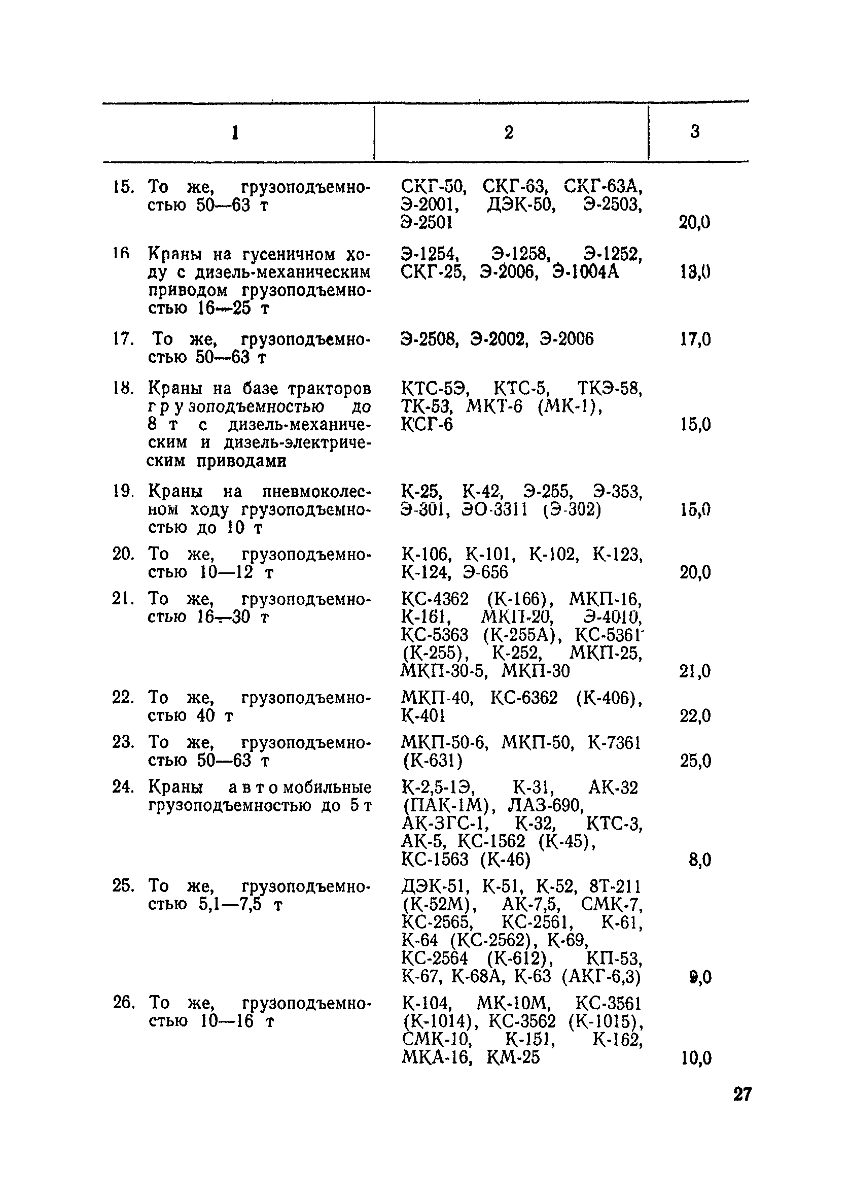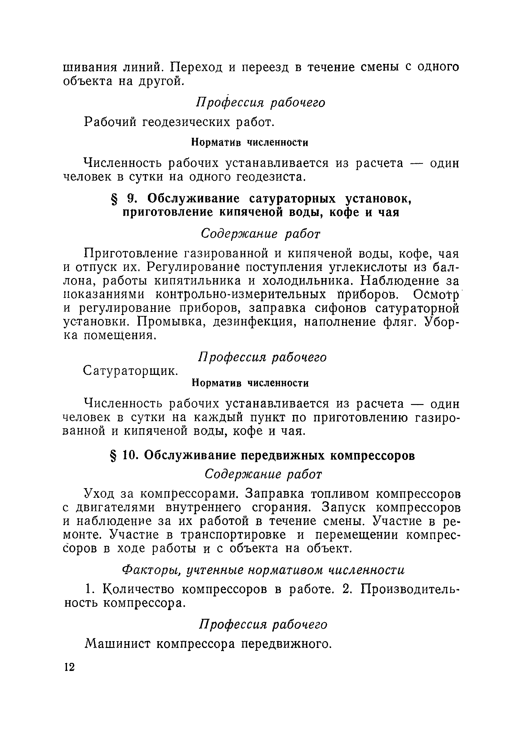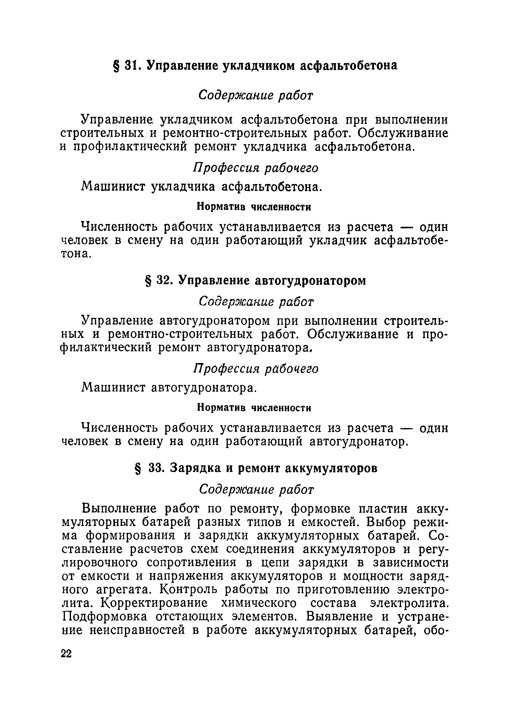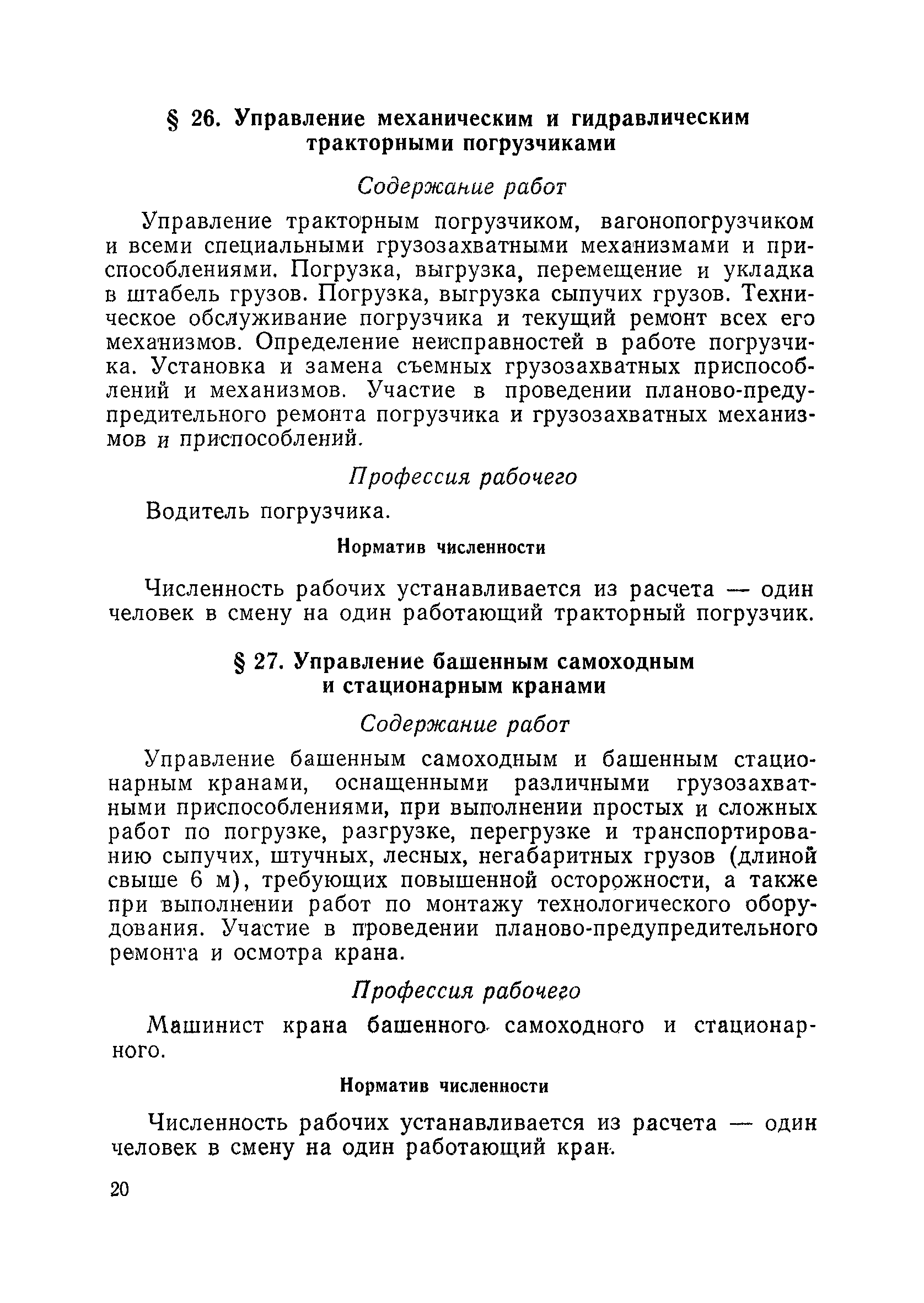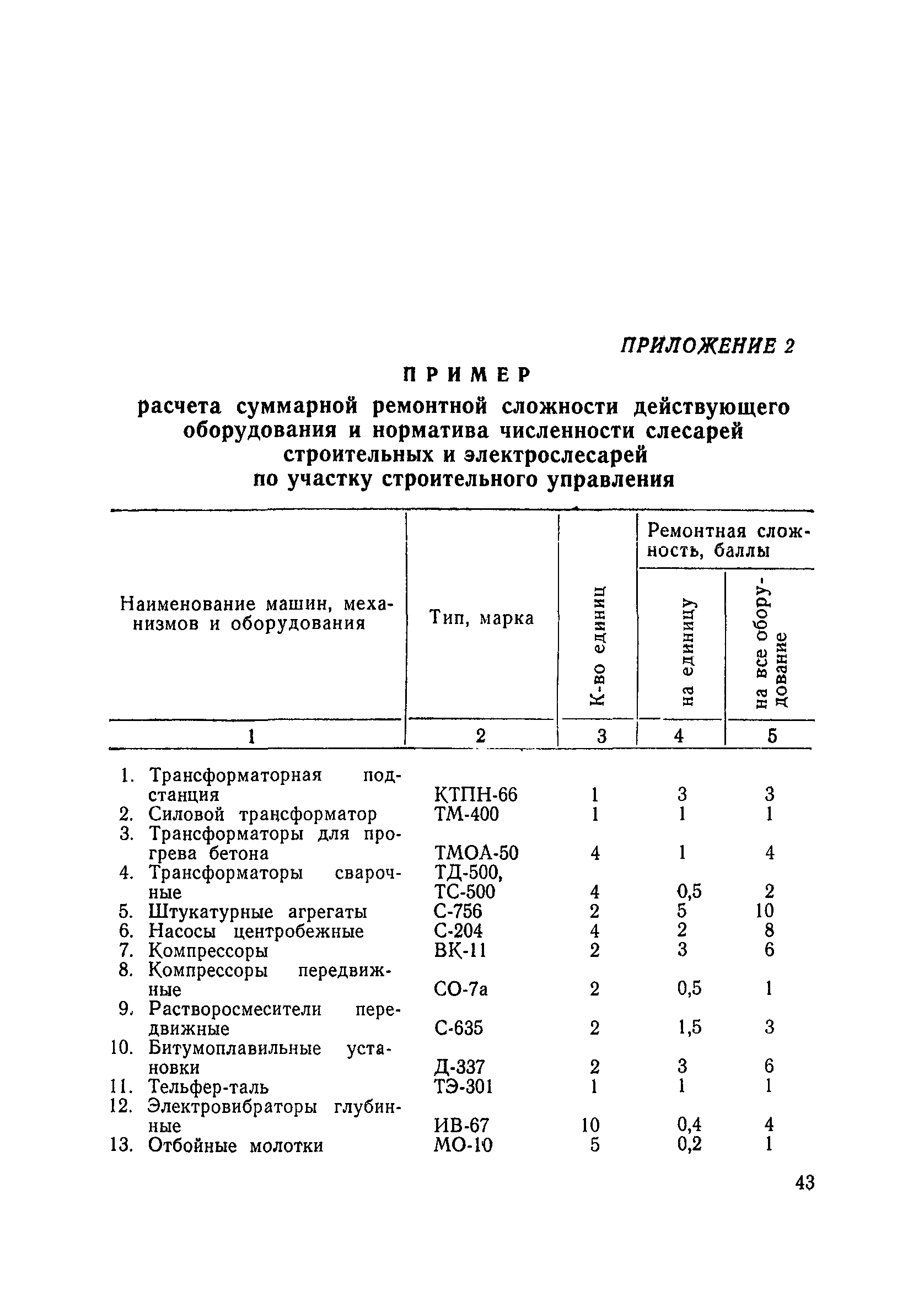 Единые нормативы численности повременно оплачиваемых рабочих, занятых на вспомогательных работах в основном и подсобном производстве строительных организаций| Статус: | не действует | | Название рус.: | Единые нормативы численности повременно оплачиваемых рабочих, занятых на вспомогательных работах в основном и подсобном производстве строительных организаций | | Дата добавления в базу: | 01.01.2018 | | Дата актуализации: | 01.01.2021 | | Область применения: | Нормативы численности сборника являются обязательными для применения в строительных организациях и их вспомогательных службах Минуглепрома СССР и предназначены для планирования численности повременно оплачиваемых рабочих и установления доплат рабочим за совмещение профессий и расширение зон обслуживания. Нормативы определяют явочную численность рабочих на смену или сутки при продолжительности рабочей смены 8 часов при пятидневной рабочей неделе. | | Оглавление: | Общая часть Нормативная часть 1 Обслуживание строительных машин, механизмов, станков, электротехнического оборудования, электрических сетей и пускорегулирующей аппаратуры 2 Обслуживание внутренней отопительной, водопроводной, канализационной систем административно-хозяйственных и производственных зданий и помещений 3 Обслуживание телефонных станций 4 Изготовление и установка изделий из жести 5 Выполнение столярно-плотницких работ в административно-хозяйственных и производственных зданиях и помещениях 6 Транспортные работы 7 Учет объема грунтов, разрабатываемых экскаваторами с погрузкой в автотранспорт 8 Обслуживание геодезических работ 9 Обслуживание сатураторных установок, приготовление кипяченой воды, кофе и чая 10 Обслуживание передвижных компрессоров 11 Управление подъемными механизмами (подъемниками и кранами типа ДИП, "Пионер" и др.) 12 Обслуживание котельной 13 Обслуживание инструментально-материальных кладовых 14. Обслуживание малярных и штукатурных станций 15. Обслуживание передвижных электростанций 16. Управление одноковшовым экскаватором 17. Управление роторным экскаватором (канавокопателем, траншейным) 18. Управление трактором 19. Управление бульдозером и скрепером 20. Управление моторным катком 21. Управление баровой установкой 22. Управление автоямобуром 23. Управление телескопической автовышкой 24. Управление автогрейдером 25. Управление автомобильным погрузчиком 26. Управление механическим и гидравлическим тракторными погрузчиками 27. Управление башенным самоходным и стационарным кранами 28, Управление кранами на гусеничном и пневмоколесном ходу 29. Управление краном-трубоукладчиком 30. Управление автомобильным краном 31. Управление укладчиком асфальтобетона 32. Управление автогудронатором 33. Зарядка и ремонт аккумуляторов 34. Вулканизационные работы 35. Медницкие работы Приложение 1. Перечень машин и механизмов, применяемых в строительстве и подсобных производствах строительных организаций и ремонтная сложность их обслуживания в баллах Приложение 2. Пример расчета суммарной ремонтной сложности действующего оборудования и норматива численности слесарей строительных и электрослесарей по участку строительного управления | | Разработан: | ЦНИС по труду МУП СССР