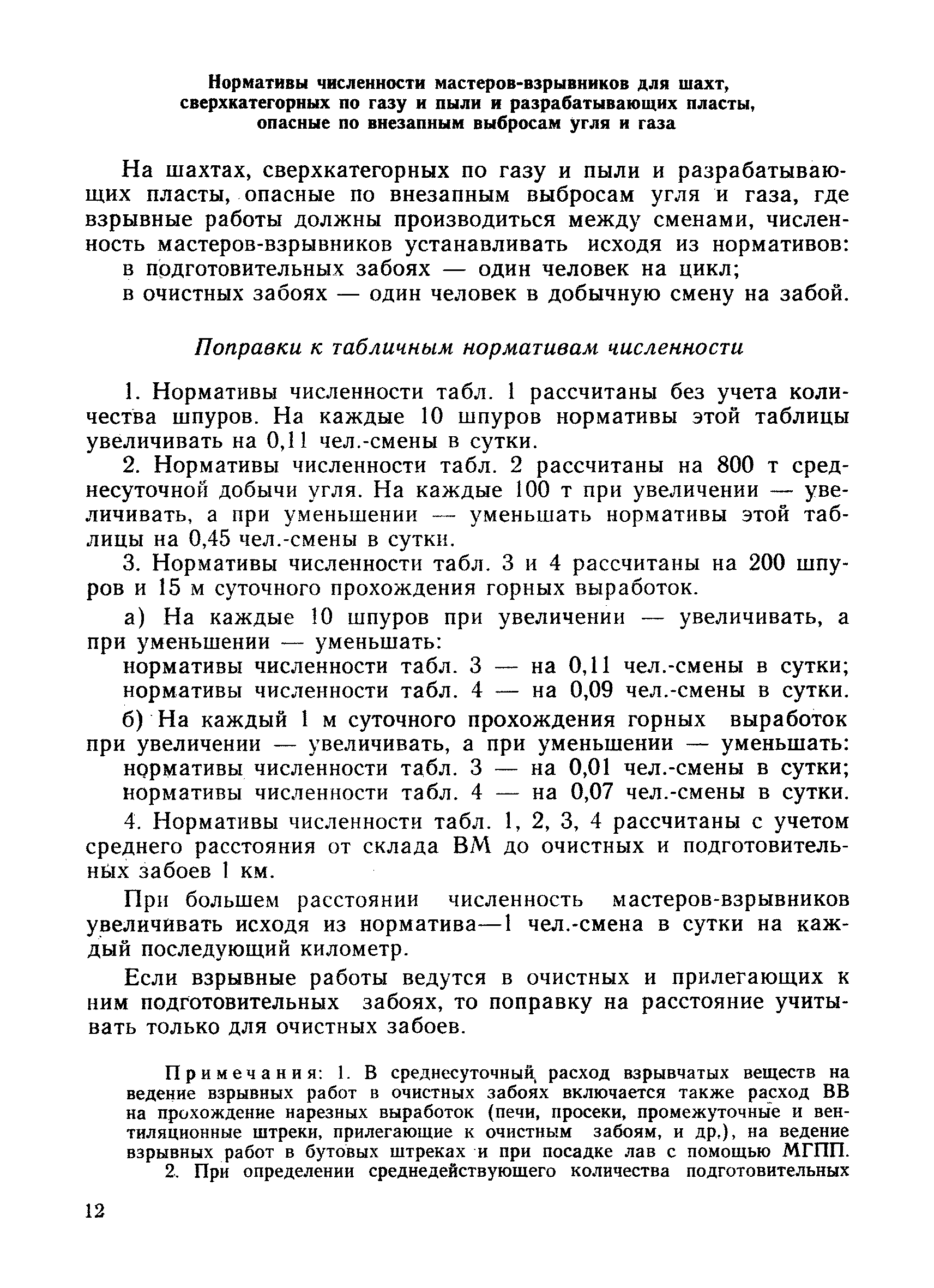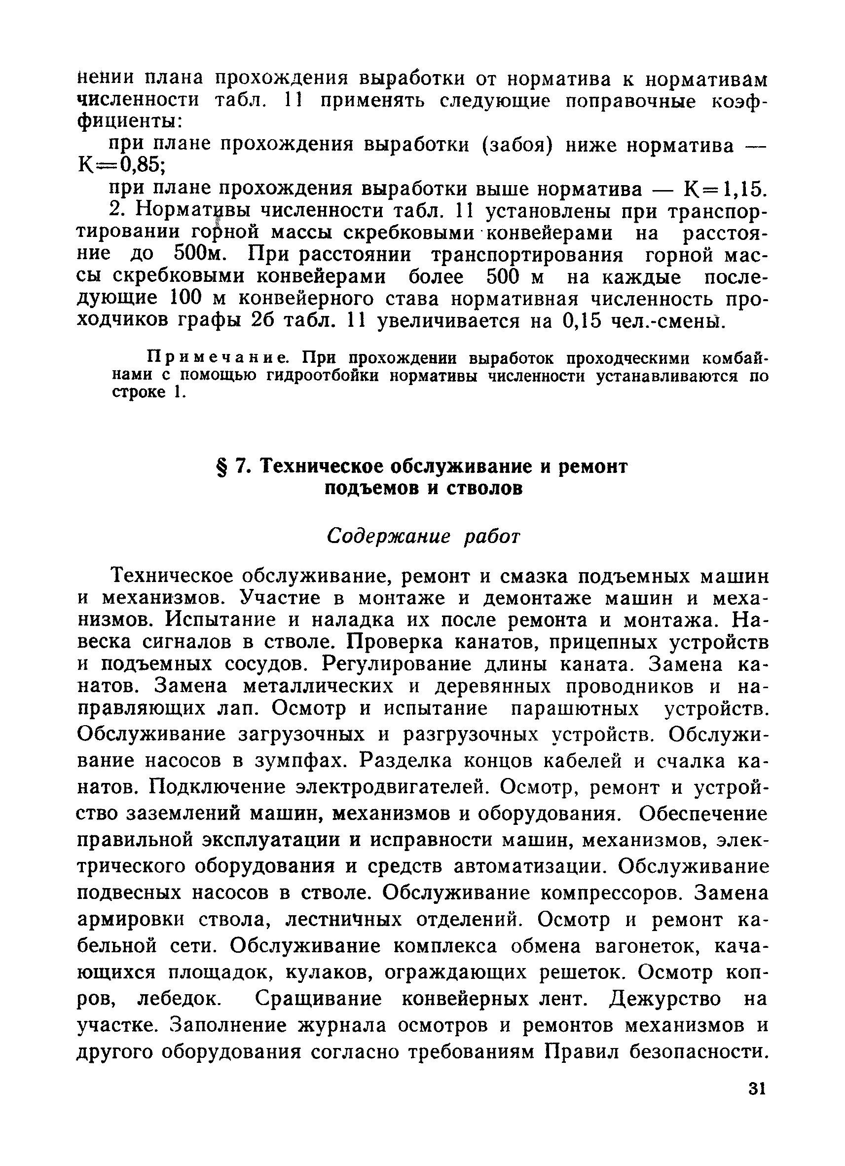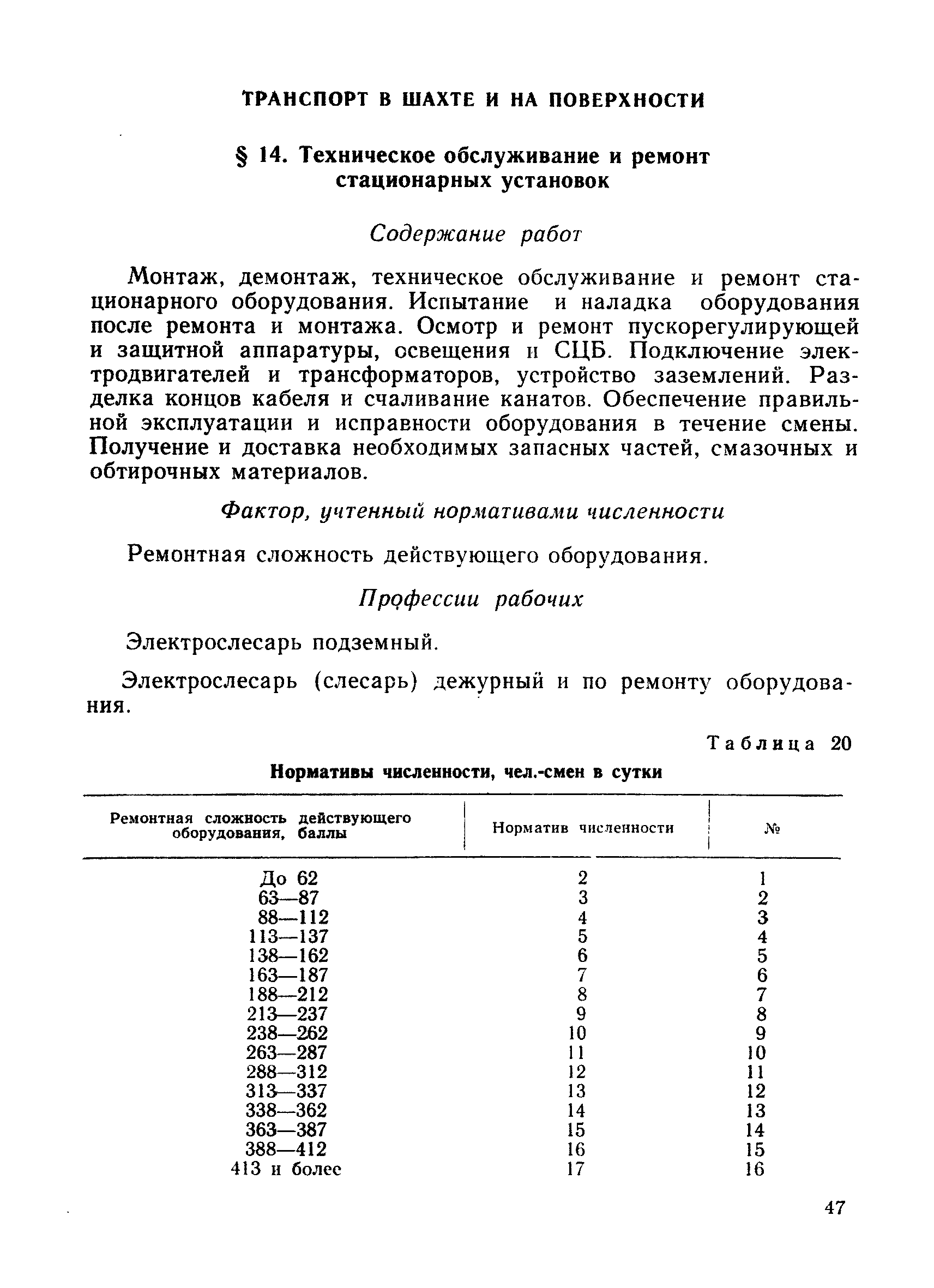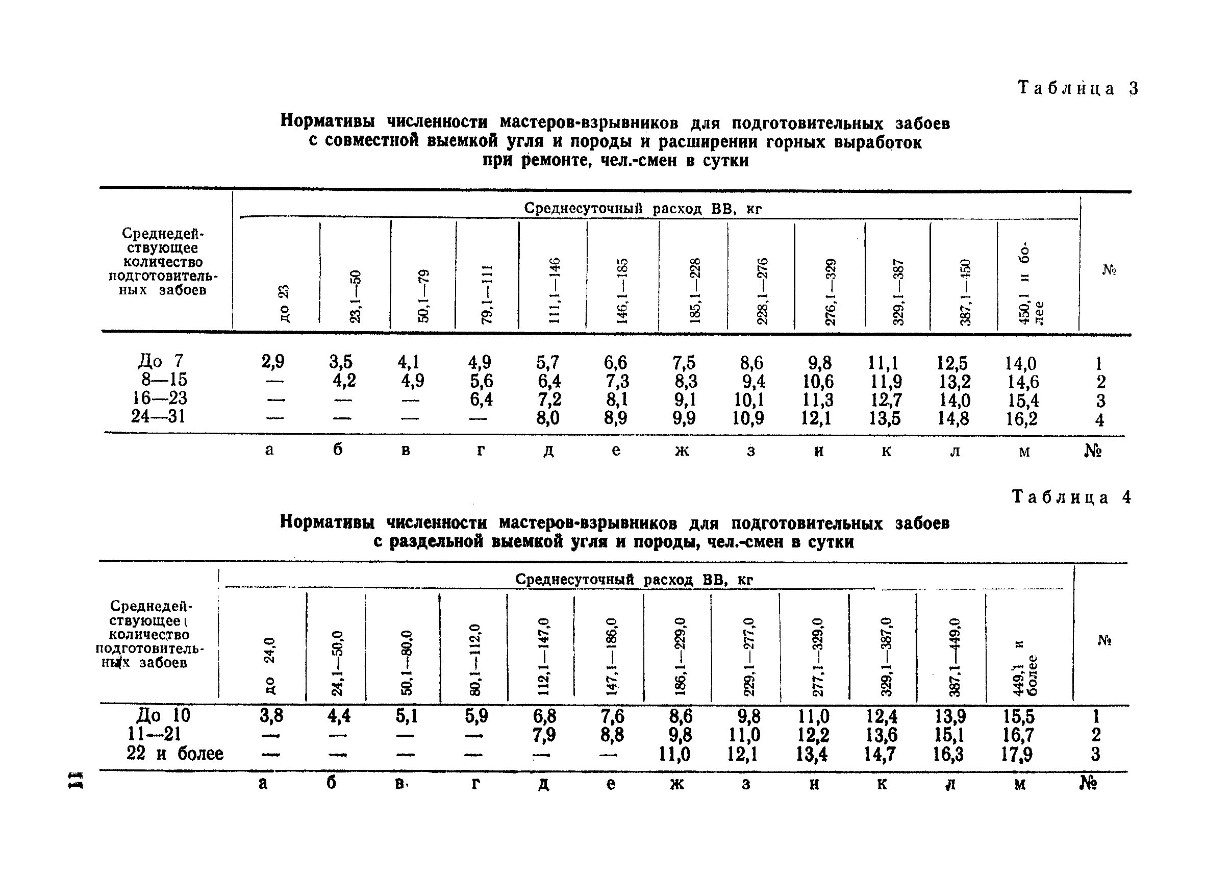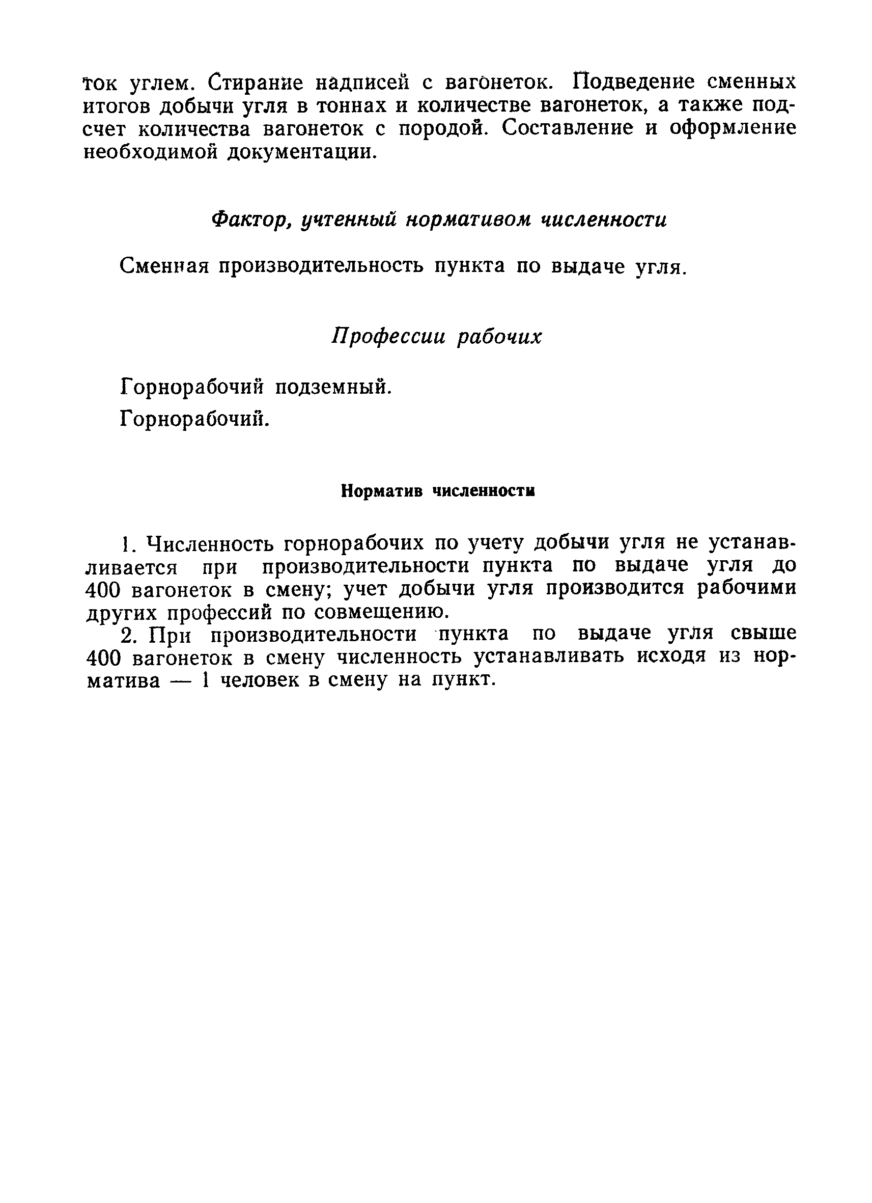 Единые нормативы численности повременно оплачиваемых рабочих для шахт Донецкого и Львовско-Волынского угольных бассейнов| Статус: | не действует | | Название рус.: | Единые нормативы численности повременно оплачиваемых рабочих для шахт Донецкого и Львовско-Волынского угольных бассейнов | | Дата добавления в базу: | 01.01.2018 | | Дата актуализации: | 01.01.2021 | | Область применения: | Единые нормативы численности сборника обязательны для применения на всех шахтах Донецкого (включая производственные объединения "Ростовуголь" и "Гуковуголь") и Львовско-Волынского угольных бассейнов и предназначены для планирования численности повременно оплачиваемых рабочих и установления доплат рабочим за совмещение профессий, расширение зон обслуживания и увеличение объема выполняемых работ. | | Оглавление: | Общая часть Нормативная часть I. Производство и обслуживание взрывных работ 1 Взрывные работы 2 Работы в складах взрывчатых материалов (в шахте и на поверхности) II. Электромеханическая служба в шахте и на поверхности 3 Техническое обслуживание и ремонт оборудования добычного участка 4 Техническое обслуживание и ремонт оборудования очистных забоев в ремонтно-подготовительную смену 5 Техническое обслуживание и ремонт оборудования подготовительного участка 6 Ежесуточное техническое обслуживание и ремонт оборудования подготовительных забоев, проходимых комбайнами 7 Техническое обслуживание и ремонт подъемов и стволов Общешахтное подземное оборудование 8 Техническое обслуживание и ремонт насосных установок, водопроводов и воздуховодов 9 Техническое обслуживание и ремонт забойного оборудования 10 Техническое обслуживание я ремонт общешахтного электротехнического оборудования и кабельной сети 11 Техническое обслуживание и ремонт средств автоматизации 12 Техническое обслуживание и ремонт аппаратуры по вентиляции и технике безопасности 13 Техническое обслуживание и ремонт оборудования участка профилактических работ по технике безопасности Транспорт в шахте и на поверхности 14 Техническое обслуживание и ремонт стационарных установок 15 Техническое обслуживание и ремонт конвейерных линий в шахте 16 Техническое обслуживание и ремонт электровозов и контактной сети 17 Зарядка батарей аккумуляторных электровозов 18 Техническое обслуживание и ремонт шахтных вагонеток Общешахтное оборудование на поверхности 19 Техническое обслуживание и ремонт вентиляторных установок 20 Техническое обслуживание и ремонт стационарных компрессорных установок 21 Техническое обслуживание и ремонт оборудования шахтных котельных 22 Техническое обслуживание о ремонт общешахтного электротехнического оборудования, кабельной и воздушной сети электропередач 23 Техническое обслуживание и ремонт средств автоматизации 24 Техническое обслуживание и ремонт оборудования технологического комплекса 25 Техническое обслуживание и ремонт оборудования административно-бытовых комбинатов 26 Техническое обслуживание и ремонт оборудования канатно-подвесных дорог с кольцевым движением вагонеток 27 Работы в шахтных электромеханических мастерских III. Управление машинами и механизмами 28 Управление конвейерами (питателями) 29 Управление подъемными машинами 30 Управление опрокидывателями и обслуживание разгрузочных пунктов (для вагонеток с разгрузкой через дно) 31 Управлени