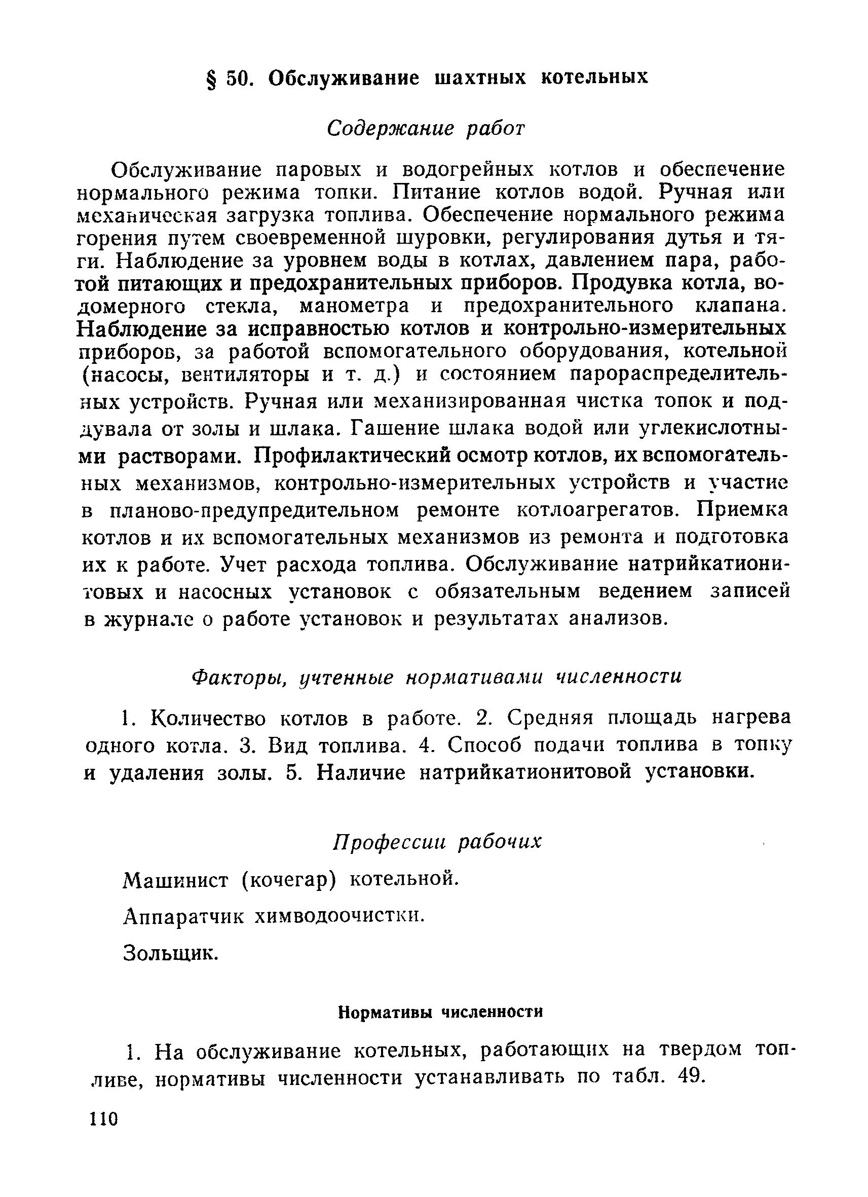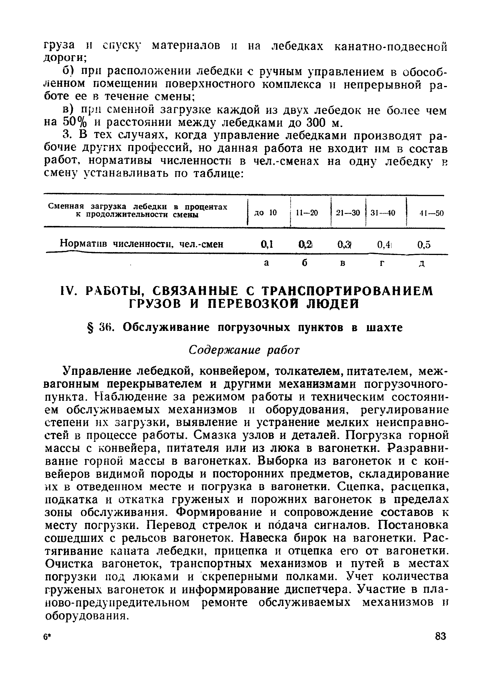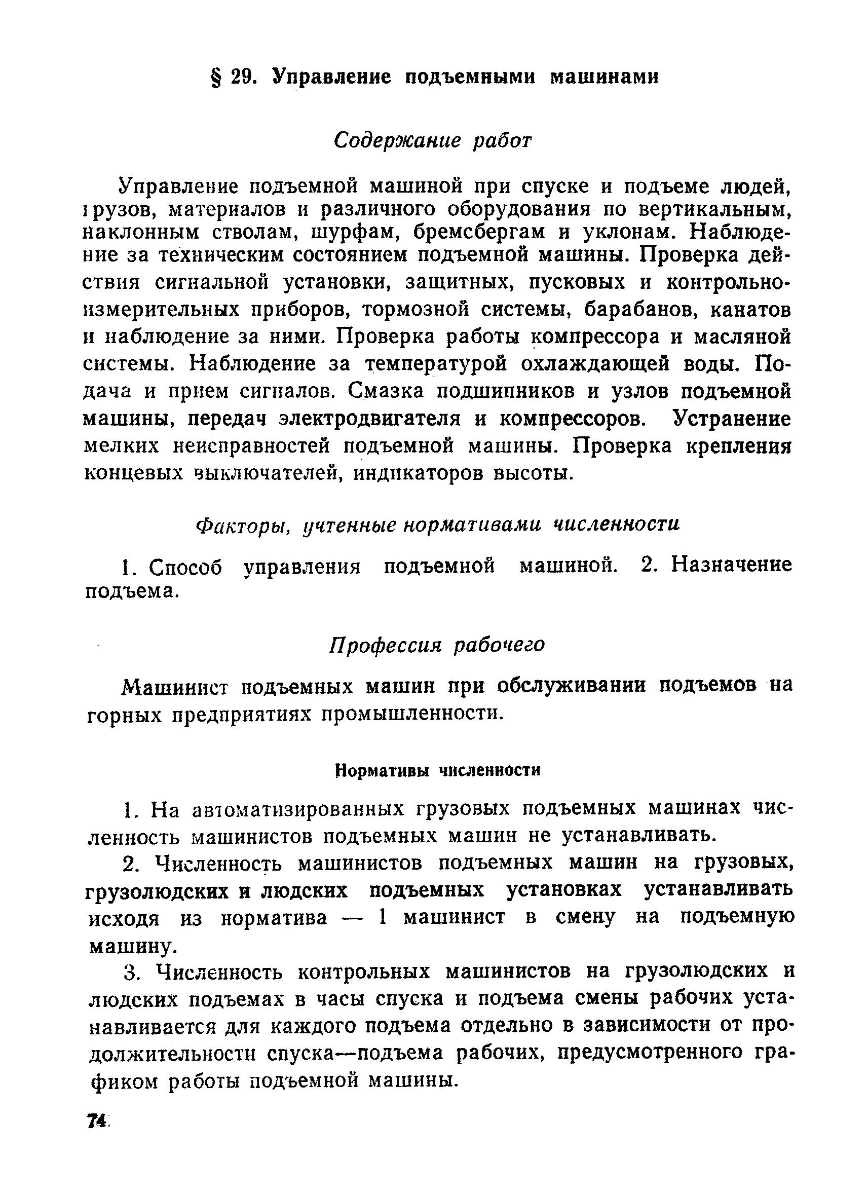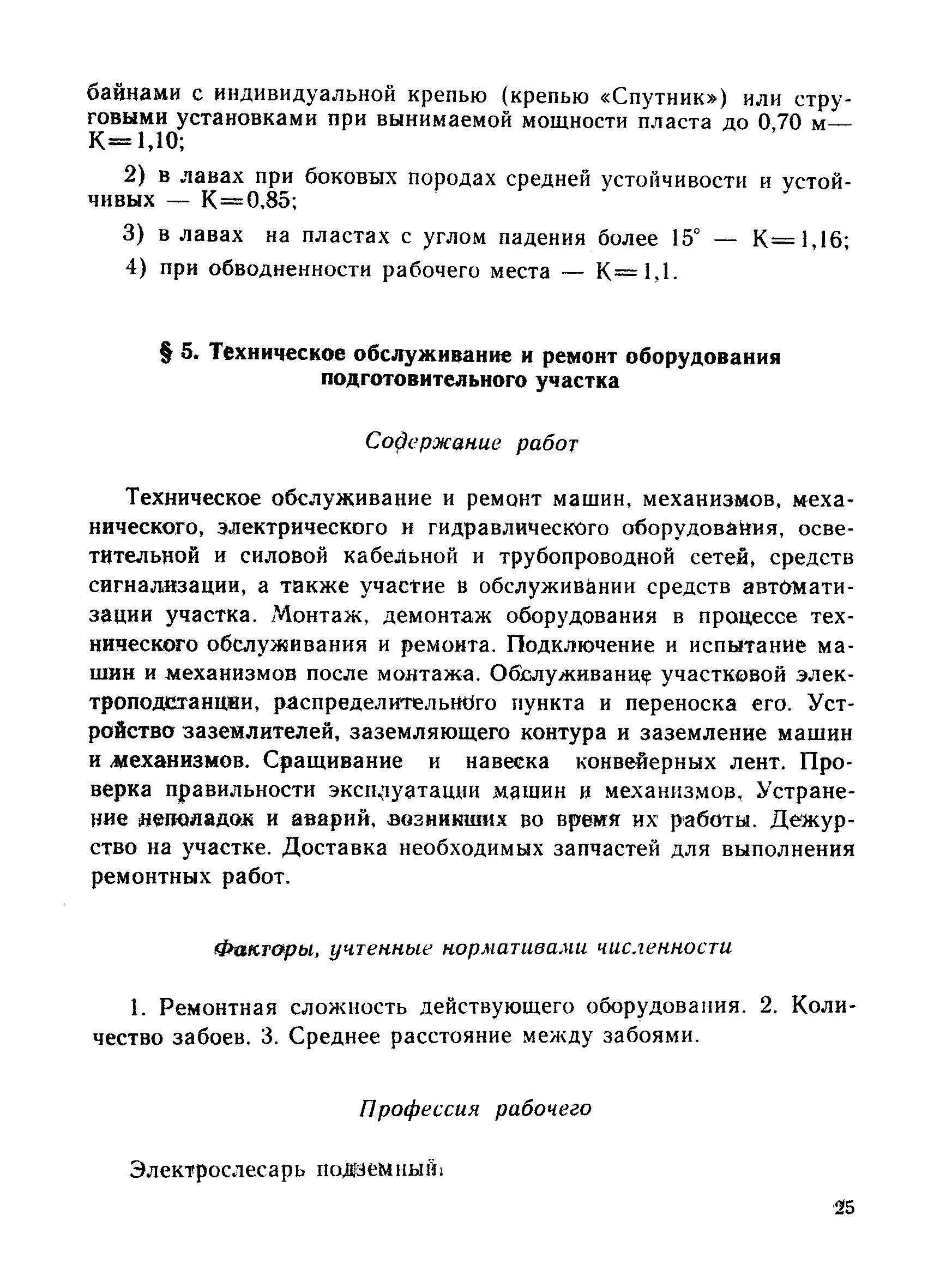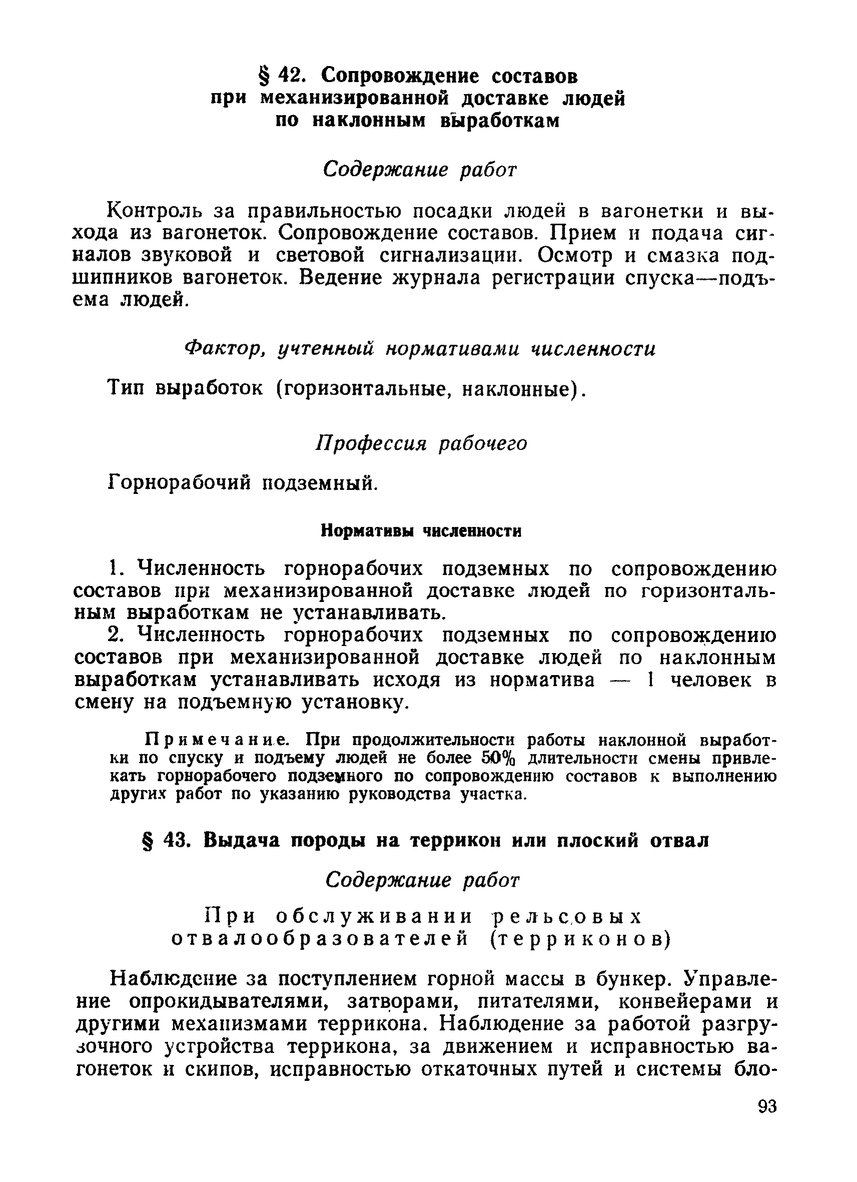 Единые нормативы численности повременно оплачиваемых рабочих для шахт Донецкого и Львовско-Волынского угольных бассейнов| Статус: | не действует | | Название рус.: | Единые нормативы численности повременно оплачиваемых рабочих для шахт Донецкого и Львовско-Волынского угольных бассейнов | | Дата добавления в базу: | 01.01.2018 | | Дата актуализации: | 01.01.2021 | | Область применения: | Единые нормативы численности сборника обязательны для применения на всех шахтах Донецкого (включая производственные объединения "Ростовуголь" и "Гуковуголь") и Львовско-Волынского угольных бассейнов и предназначены для планирования численности повременно оплачиваемых рабочих и установления доплат рабочим за совмещение профессий, расширение зон обслуживания и увеличение объема выполняемых работ. | | Оглавление: | Общая часть Нормативная часть I. Производство и обслуживание взрывных работ 1 Взрывные работы 2 Работы в складах взрывчатых материалов (в шахте и на поверхности) II. Электромеханическая служба в шахте и на поверхности 3 Техническое обслуживание и ремонт оборудования добычного участка 4 Техническое обслуживание и ремонт оборудования очистных забоев в ремонтно-подготовительную смену 5 Техническое обслуживание и ремонт оборудования подготовительного участка 6 Ежесуточное техническое обслуживание и ремонт оборудования подготовительных забоев, проходимых комбайнами 7 Техническое обслуживание и ремонт подъемов и стволов Общешахтное подземное оборудование 8 Техническое обслуживание и ремонт насосных установок, водопроводов и воздуховодов 9 Техническое обслуживание и ремонт забойного оборудования 10 Техническое обслуживание я ремонт общешахтного электротехнического оборудования и кабельной сети 11 Техническое обслуживание и ремонт средств автоматизации 12 Техническое обслуживание и ремонт аппаратуры по вентиляции и технике безопасности 13 Техническое обслуживание и ремонт оборудования участка профилактических работ по технике безопасности Транспорт в шахте и на поверхности 14 Техническое обслуживание и ремонт стационарных установок 15 Техническое обслуживание и ремонт конвейерных линий в шахте 16 Техническое обслуживание и ремонт электровозов и контактной сети 17 Зарядка батарей аккумуляторных электровозов 18 Техническое обслуживание и ремонт шахтных вагонеток Общешахтное оборудование на поверхности 19 Техническое обслуживание и ремонт вентиляторных установок 20 Техническое обслуживание и ремонт стационарных компрессорных установок 21 Техническое обслуживание и ремонт оборудования шахтных котельных 22 Техническое обслуживание о ремонт общешахтного электротехнического оборудования, кабельной и воздушной сети электропередач 23 Техническое обслуживание и ремонт средств автоматизации 24 Техническое обслуживание и ремонт оборудования технологического комплекса 25 Техническое обслуживание и ремонт оборудования административно-бытовых комбинатов 26 Техническое обслуживание и ремонт оборудования канатно-подвесных дорог с кольцевым движением вагонеток 27 Работы в шахтных электромеханических мастерских III. Управление машинами и механизмами 28 Управление конвейерами (питателями) 29 Управление подъемными машинами 30 Управление опрокидывателями и обслуживание разгрузочных пунктов (для вагонеток с разгрузкой через дно) 31 Управлени