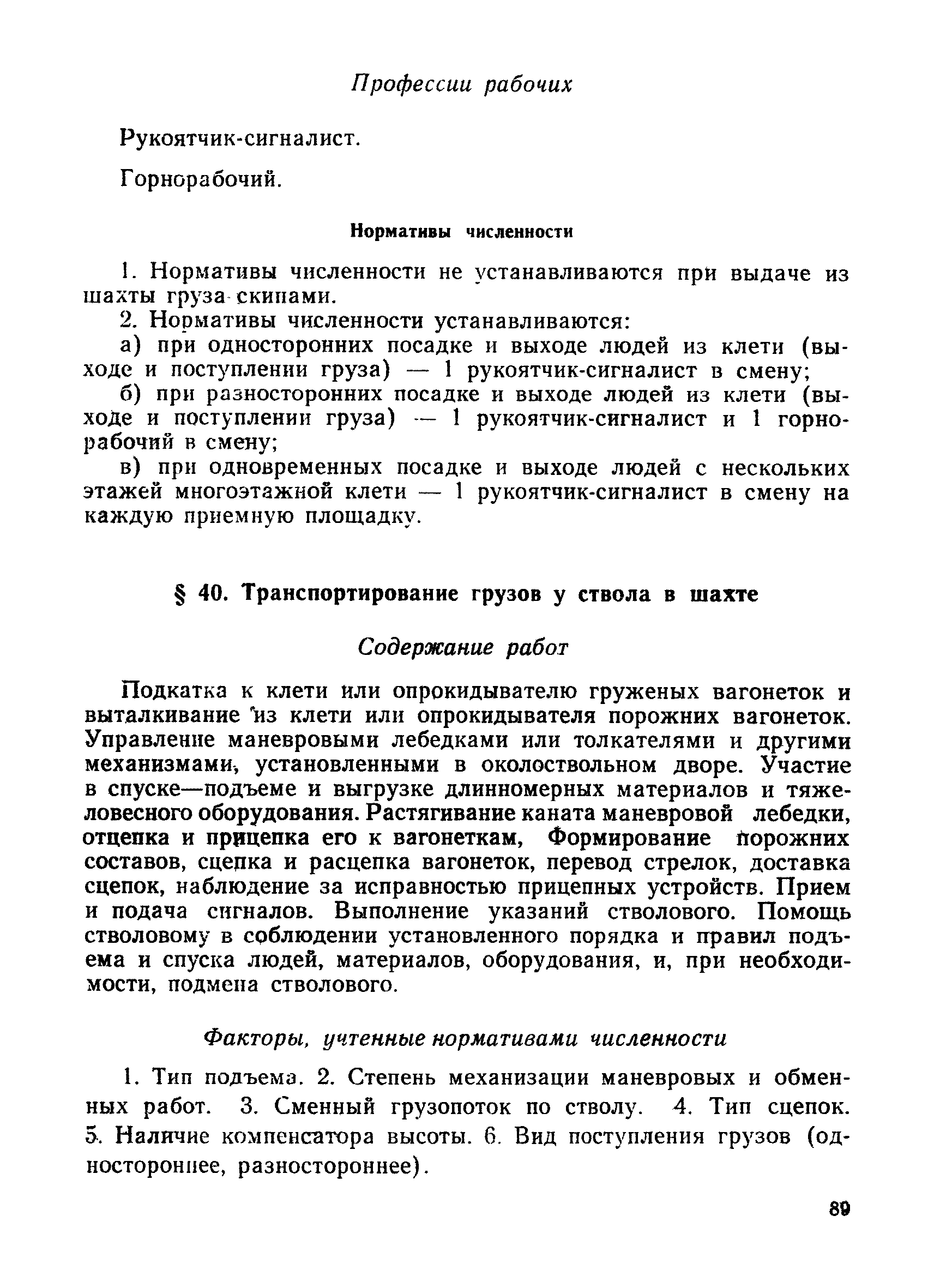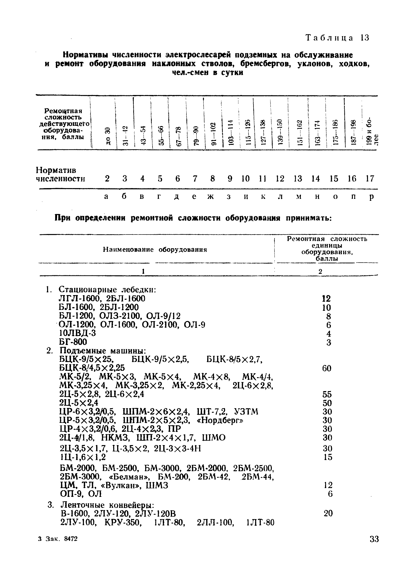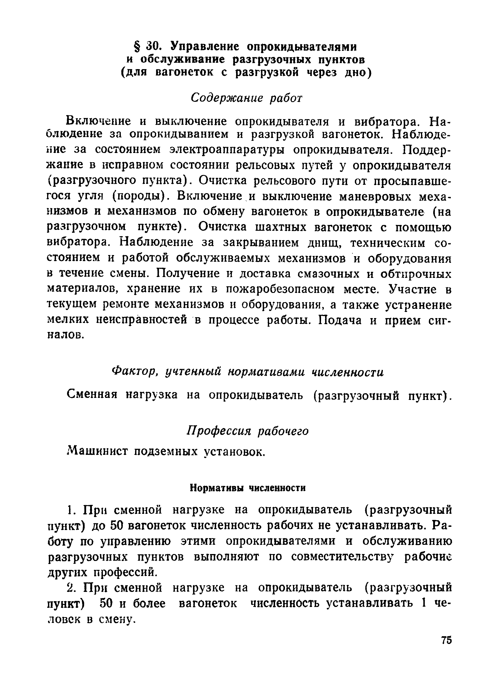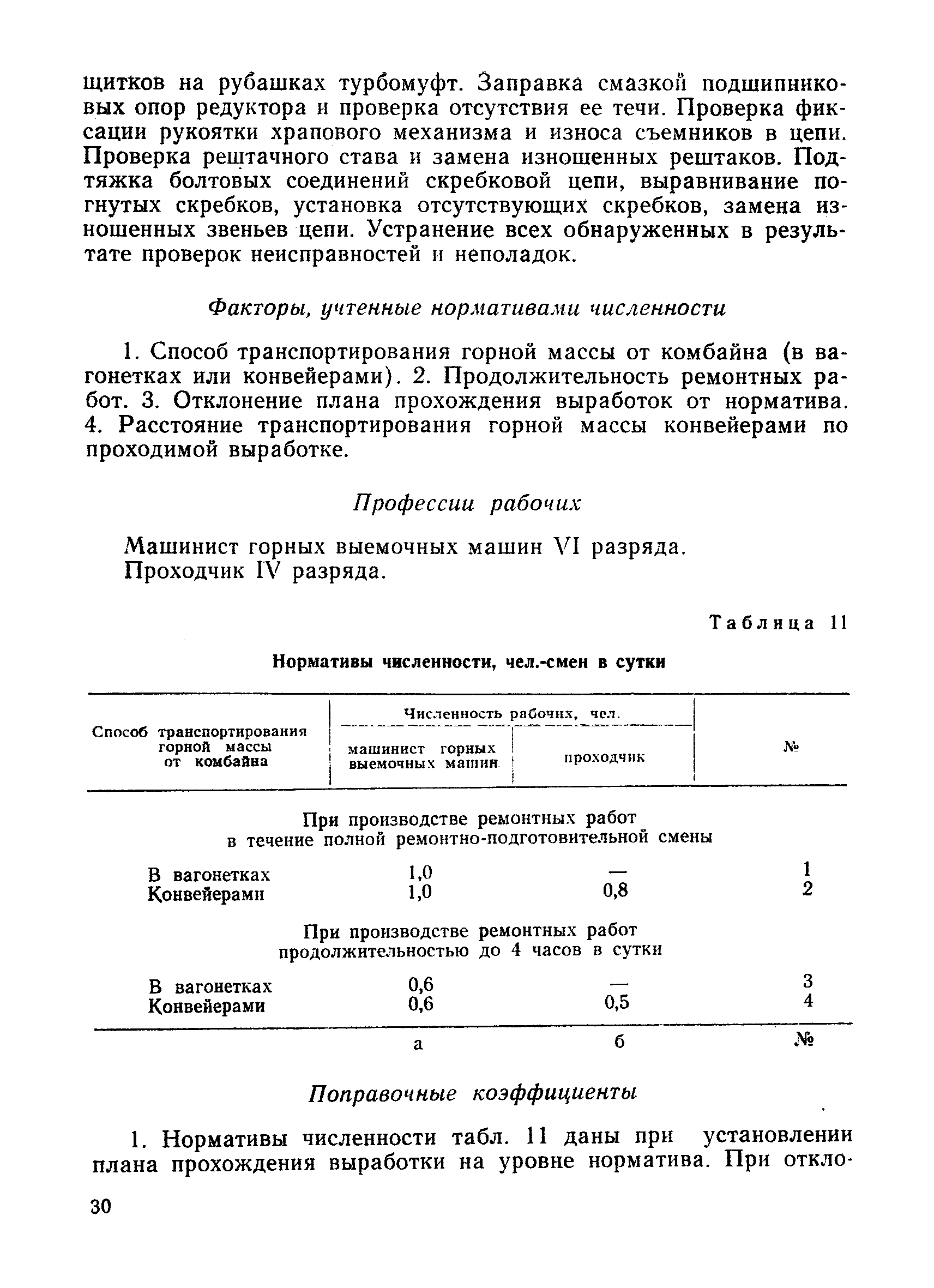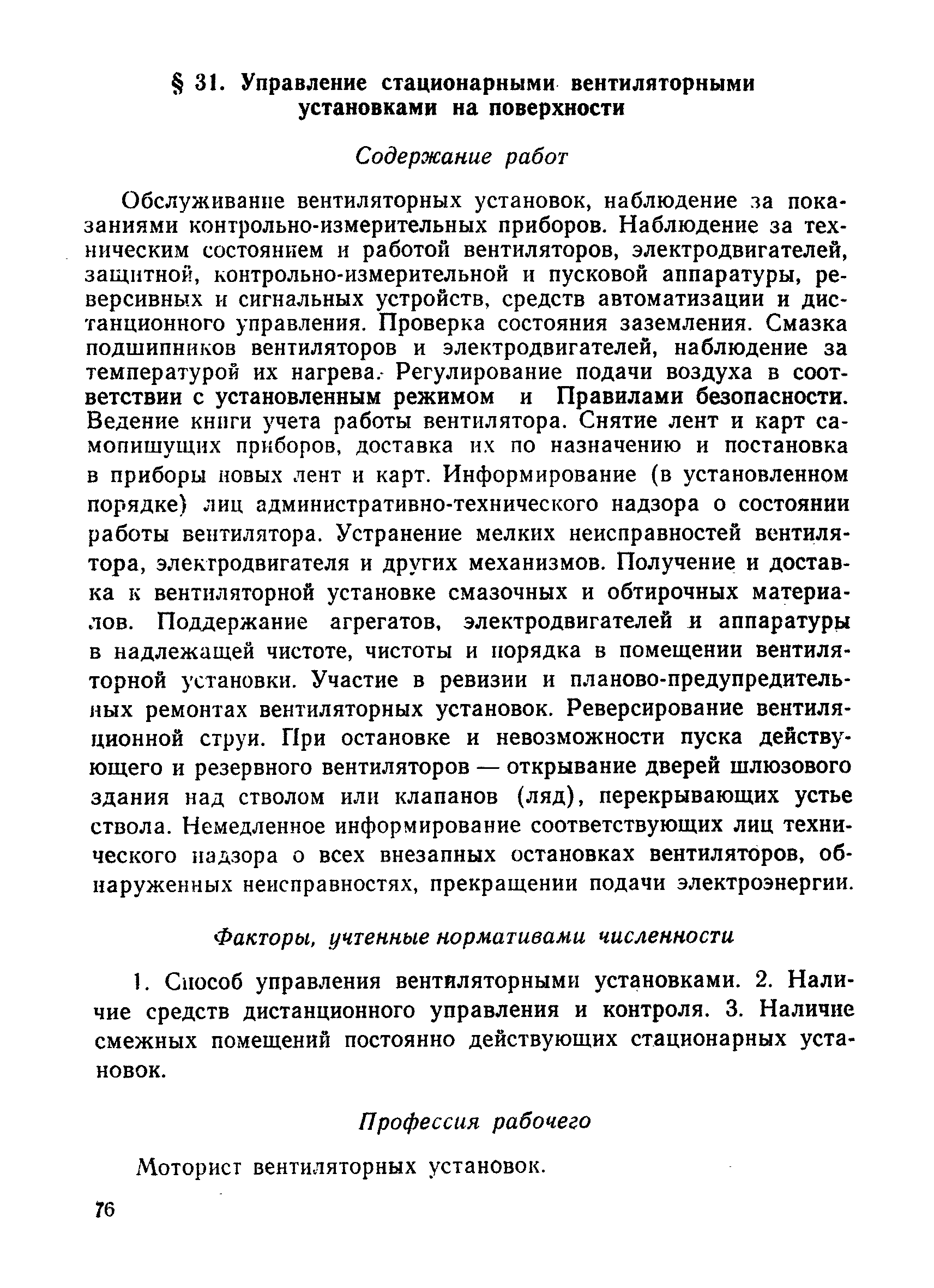 Единые нормативы численности повременно оплачиваемых рабочих для шахт Донецкого и Львовско-Волынского угольных бассейнов| Статус: | не действует | | Название рус.: | Единые нормативы численности повременно оплачиваемых рабочих для шахт Донецкого и Львовско-Волынского угольных бассейнов | | Дата добавления в базу: | 01.01.2018 | | Дата актуализации: | 01.01.2021 | | Область применения: | Единые нормативы численности сборника обязательны для применения на всех шахтах Донецкого (включая производственные объединения "Ростовуголь" и "Гуковуголь") и Львовско-Волынского угольных бассейнов и предназначены для планирования численности повременно оплачиваемых рабочих и установления доплат рабочим за совмещение профессий, расширение зон обслуживания и увеличение объема выполняемых работ. | | Оглавление: | Общая часть Нормативная часть I. Производство и обслуживание взрывных работ 1 Взрывные работы 2 Работы в складах взрывчатых материалов (в шахте и на поверхности) II. Электромеханическая служба в шахте и на поверхности 3 Техническое обслуживание и ремонт оборудования добычного участка 4 Техническое обслуживание и ремонт оборудования очистных забоев в ремонтно-подготовительную смену 5 Техническое обслуживание и ремонт оборудования подготовительного участка 6 Ежесуточное техническое обслуживание и ремонт оборудования подготовительных забоев, проходимых комбайнами 7 Техническое обслуживание и ремонт подъемов и стволов Общешахтное подземное оборудование 8 Техническое обслуживание и ремонт насосных установок, водопроводов и воздуховодов 9 Техническое обслуживание и ремонт забойного оборудования 10 Техническое обслуживание я ремонт общешахтного электротехнического оборудования и кабельной сети 11 Техническое обслуживание и ремонт средств автоматизации 12 Техническое обслуживание и ремонт аппаратуры по вентиляции и технике безопасности 13 Техническое обслуживание и ремонт оборудования участка профилактических работ по технике безопасности Транспорт в шахте и на поверхности 14 Техническое обслуживание и ремонт стационарных установок 15 Техническое обслуживание и ремонт конвейерных линий в шахте 16 Техническое обслуживание и ремонт электровозов и контактной сети 17 Зарядка батарей аккумуляторных электровозов 18 Техническое обслуживание и ремонт шахтных вагонеток Общешахтное оборудование на поверхности 19 Техническое обслуживание и ремонт вентиляторных установок 20 Техническое обслуживание и ремонт стационарных компрессорных установок 21 Техническое обслуживание и ремонт оборудования шахтных котельных 22 Техническое обслуживание о ремонт общешахтного электротехнического оборудования, кабельной и воздушной сети электропередач 23 Техническое обслуживание и ремонт средств автоматизации 24 Техническое обслуживание и ремонт оборудования технологического комплекса 25 Техническое обслуживание и ремонт оборудования административно-бытовых комбинатов 26 Техническое обслуживание и ремонт оборудования канатно-подвесных дорог с кольцевым движением вагонеток 27 Работы в шахтных электромеханических мастерских III. Управление машинами и механизмами 28 Управление конвейерами (питателями) 29 Управление подъемными машинами 30 Управление опрокидывателями и обслуживание разгрузочных пунктов (для вагонеток с разгрузкой через дно) 31 Управлени