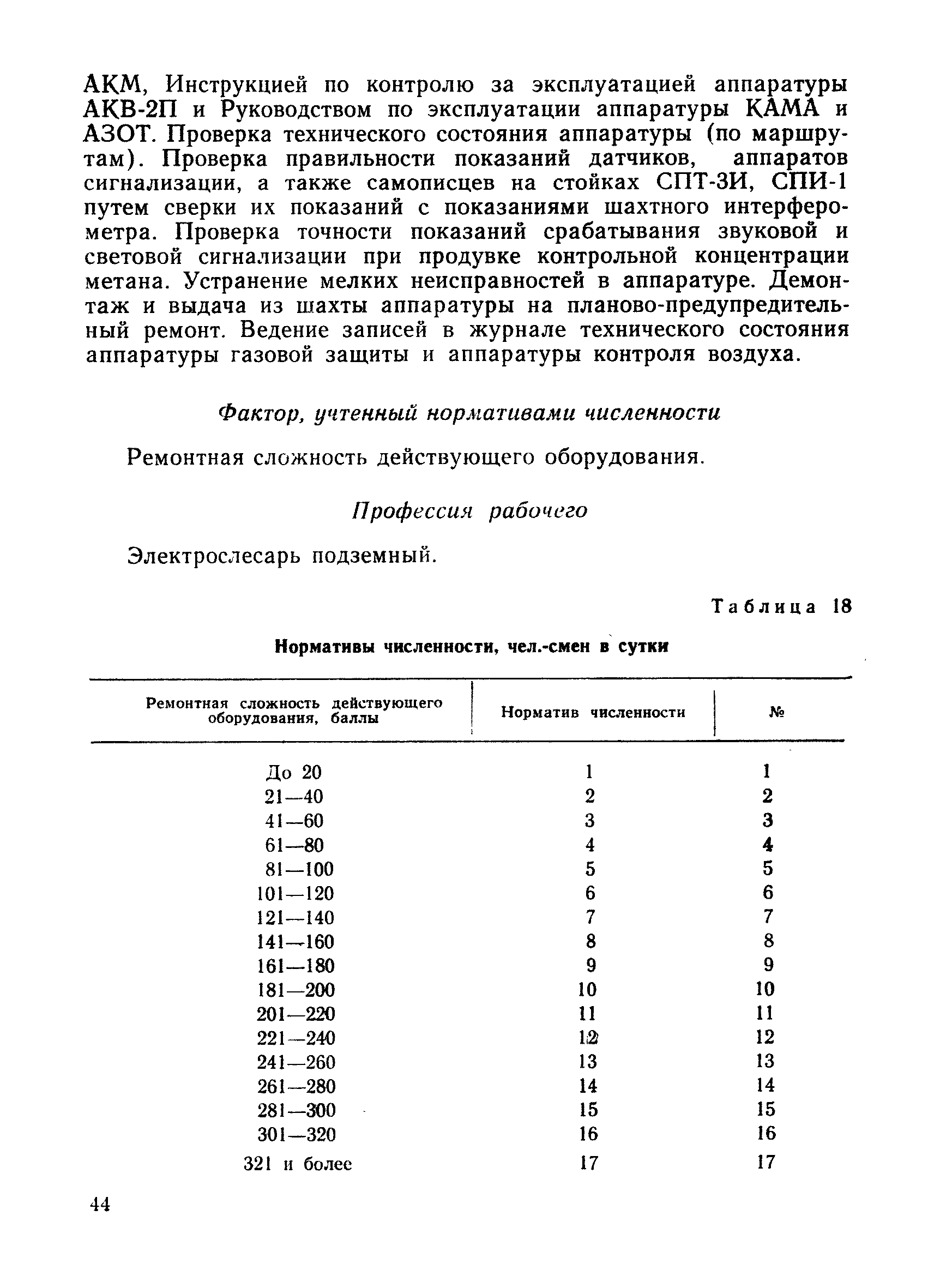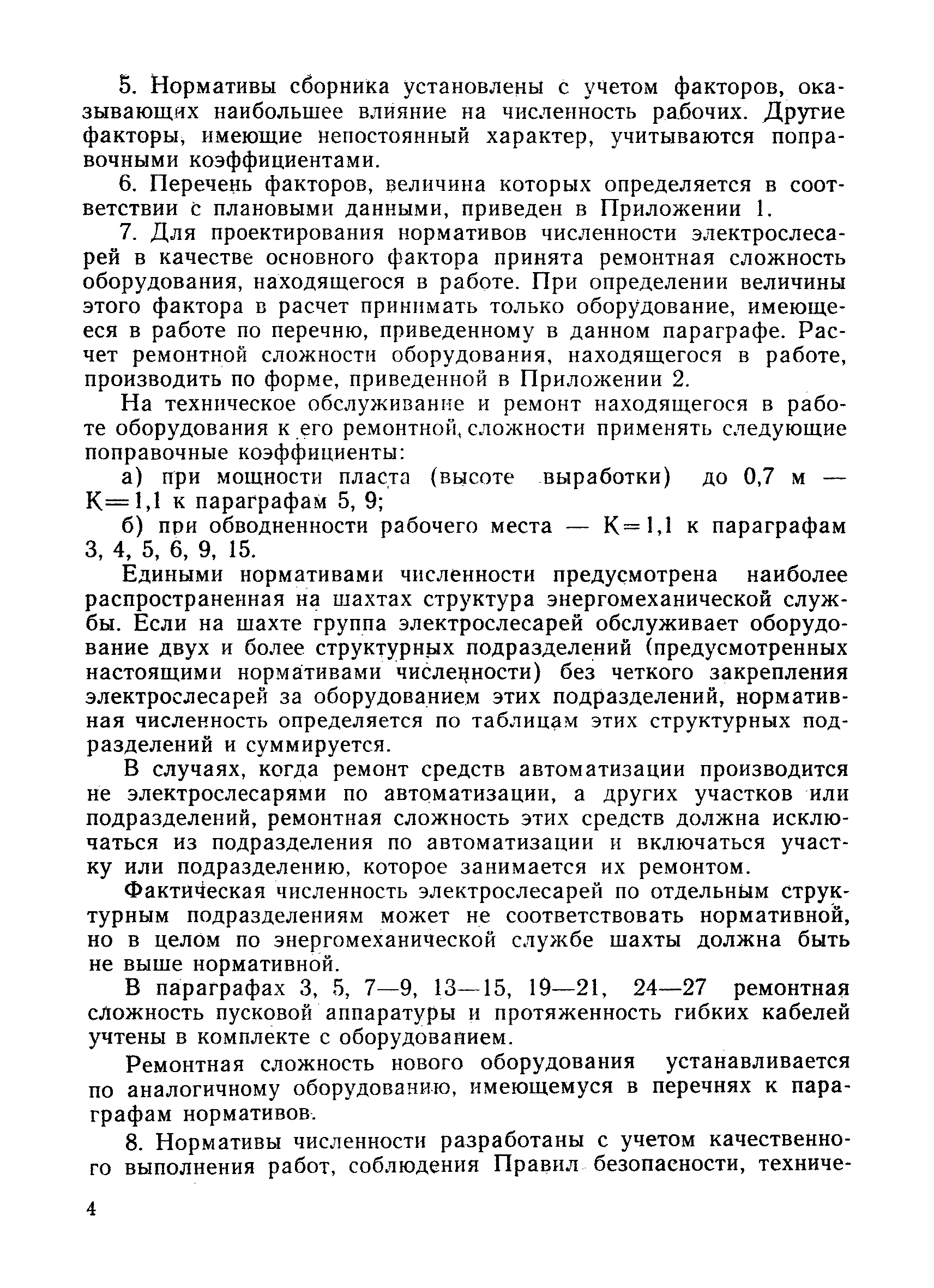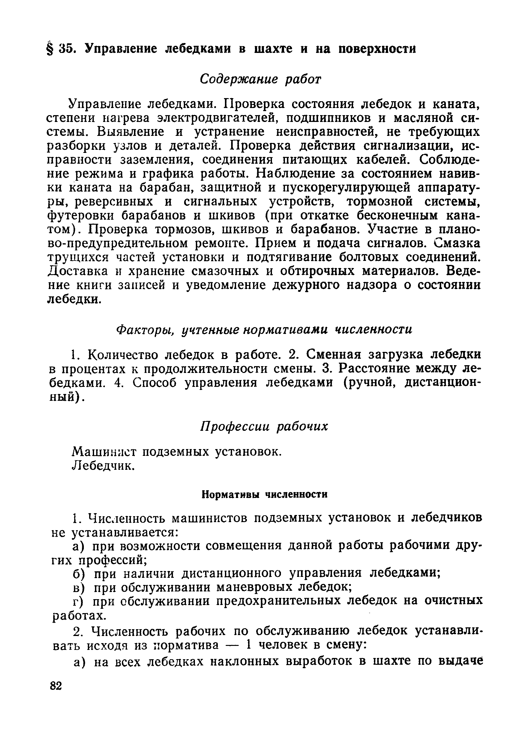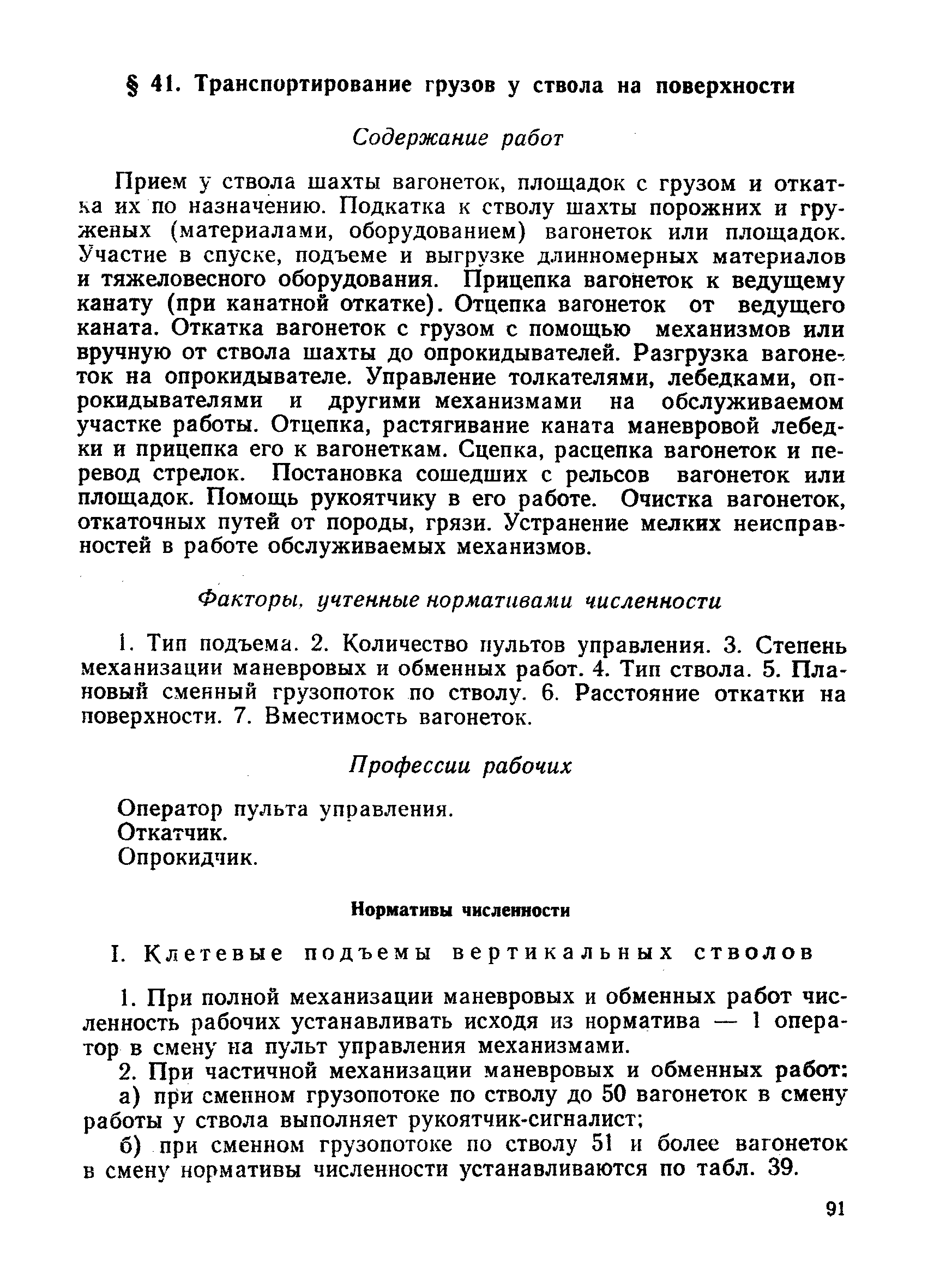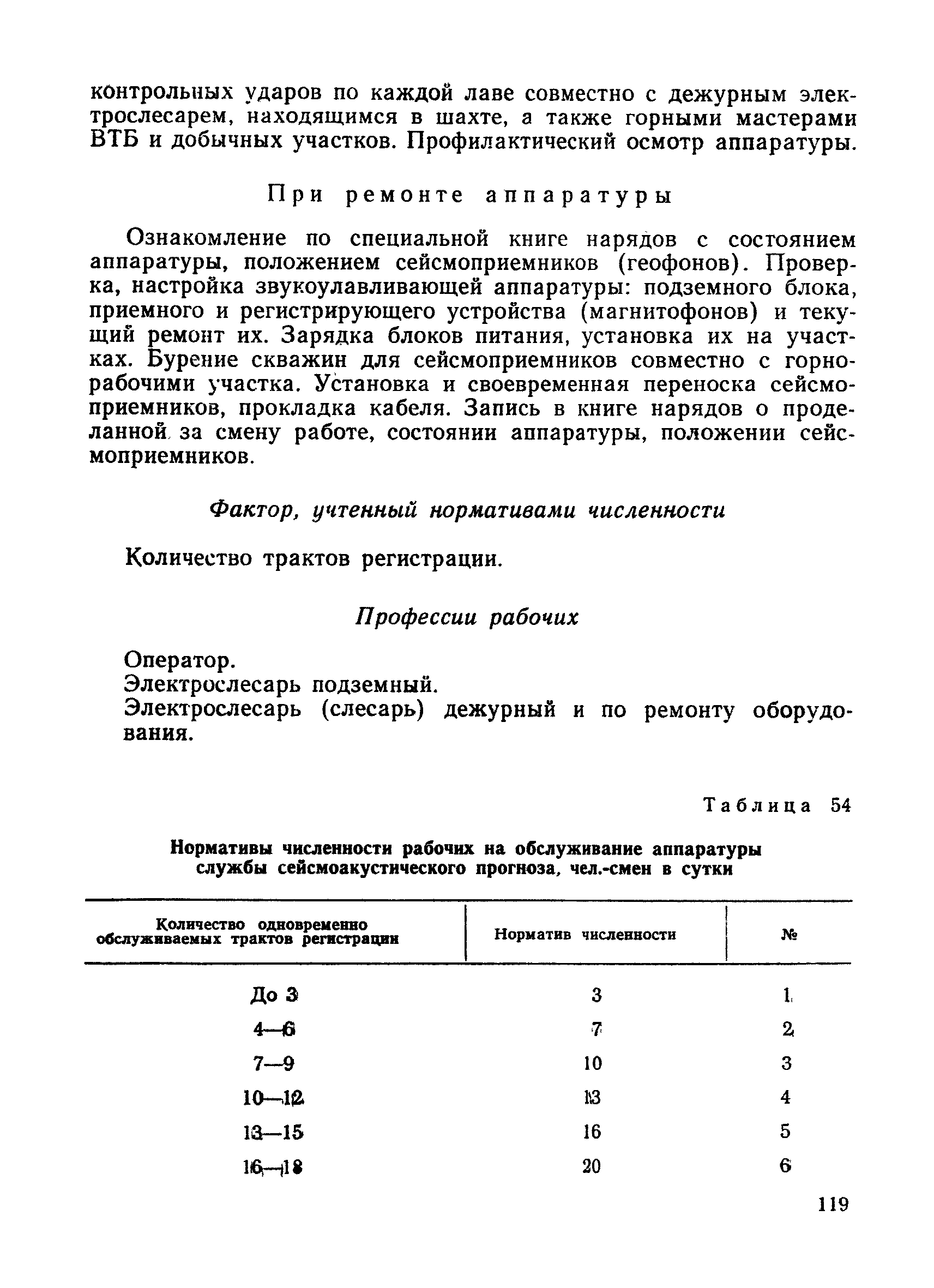 Единые нормативы численности повременно оплачиваемых рабочих для шахт Донецкого и Львовско-Волынского угольных бассейнов| Статус: | не действует | | Название рус.: | Единые нормативы численности повременно оплачиваемых рабочих для шахт Донецкого и Львовско-Волынского угольных бассейнов | | Дата добавления в базу: | 01.01.2018 | | Дата актуализации: | 01.01.2021 | | Область применения: | Единые нормативы численности сборника обязательны для применения на всех шахтах Донецкого (включая производственные объединения "Ростовуголь" и "Гуковуголь") и Львовско-Волынского угольных бассейнов и предназначены для планирования численности повременно оплачиваемых рабочих и установления доплат рабочим за совмещение профессий, расширение зон обслуживания и увеличение объема выполняемых работ. | | Оглавление: | Общая часть Нормативная часть I. Производство и обслуживание взрывных работ 1 Взрывные работы 2 Работы в складах взрывчатых материалов (в шахте и на поверхности) II. Электромеханическая служба в шахте и на поверхности 3 Техническое обслуживание и ремонт оборудования добычного участка 4 Техническое обслуживание и ремонт оборудования очистных забоев в ремонтно-подготовительную смену 5 Техническое обслуживание и ремонт оборудования подготовительного участка 6 Ежесуточное техническое обслуживание и ремонт оборудования подготовительных забоев, проходимых комбайнами 7 Техническое обслуживание и ремонт подъемов и стволов Общешахтное подземное оборудование 8 Техническое обслуживание и ремонт насосных установок, водопроводов и воздуховодов 9 Техническое обслуживание и ремонт забойного оборудования 10 Техническое обслуживание я ремонт общешахтного электротехнического оборудования и кабельной сети 11 Техническое обслуживание и ремонт средств автоматизации 12 Техническое обслуживание и ремонт аппаратуры по вентиляции и технике безопасности 13 Техническое обслуживание и ремонт оборудования участка профилактических работ по технике безопасности Транспорт в шахте и на поверхности 14 Техническое обслуживание и ремонт стационарных установок 15 Техническое обслуживание и ремонт конвейерных линий в шахте 16 Техническое обслуживание и ремонт электровозов и контактной сети 17 Зарядка батарей аккумуляторных электровозов 18 Техническое обслуживание и ремонт шахтных вагонеток Общешахтное оборудование на поверхности 19 Техническое обслуживание и ремонт вентиляторных установок 20 Техническое обслуживание и ремонт стационарных компрессорных установок 21 Техническое обслуживание и ремонт оборудования шахтных котельных 22 Техническое обслуживание о ремонт общешахтного электротехнического оборудования, кабельной и воздушной сети электропередач 23 Техническое обслуживание и ремонт средств автоматизации 24 Техническое обслуживание и ремонт оборудования технологического комплекса 25 Техническое обслуживание и ремонт оборудования административно-бытовых комбинатов 26 Техническое обслуживание и ремонт оборудования канатно-подвесных дорог с кольцевым движением вагонеток 27 Работы в шахтных электромеханических мастерских III. Управление машинами и механизмами 28 Управление конвейерами (питателями) 29 Управление подъемными машинами 30 Управление опрокидывателями и обслуживание разгрузочных пунктов (для вагонеток с разгрузкой через дно) 31 Управлени
