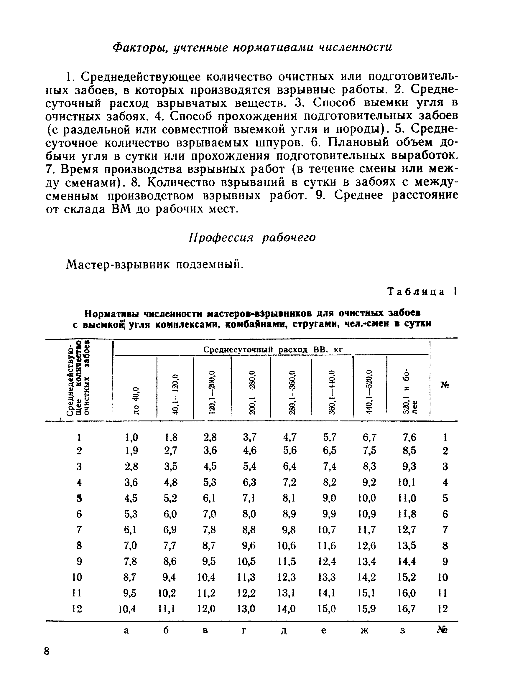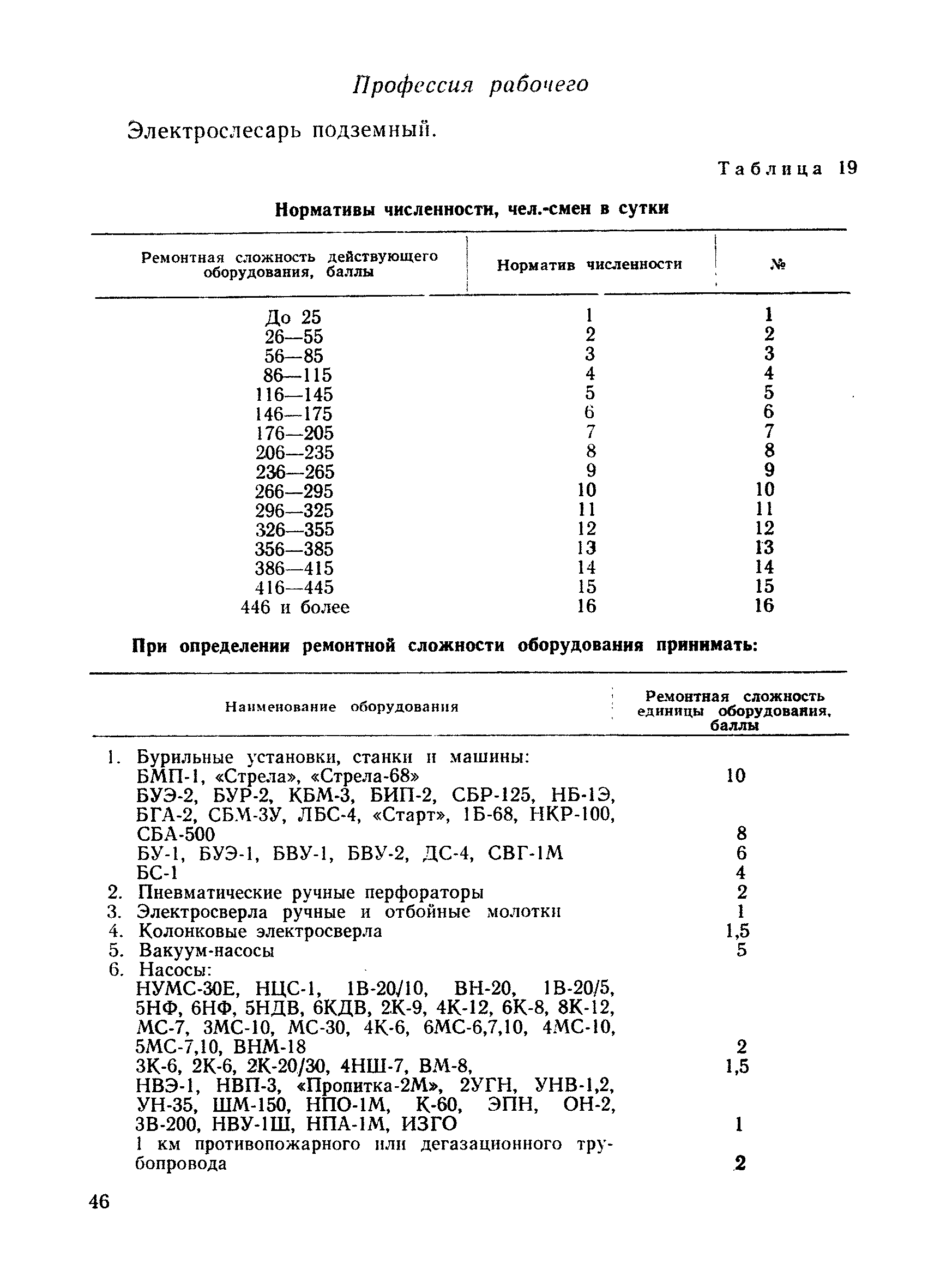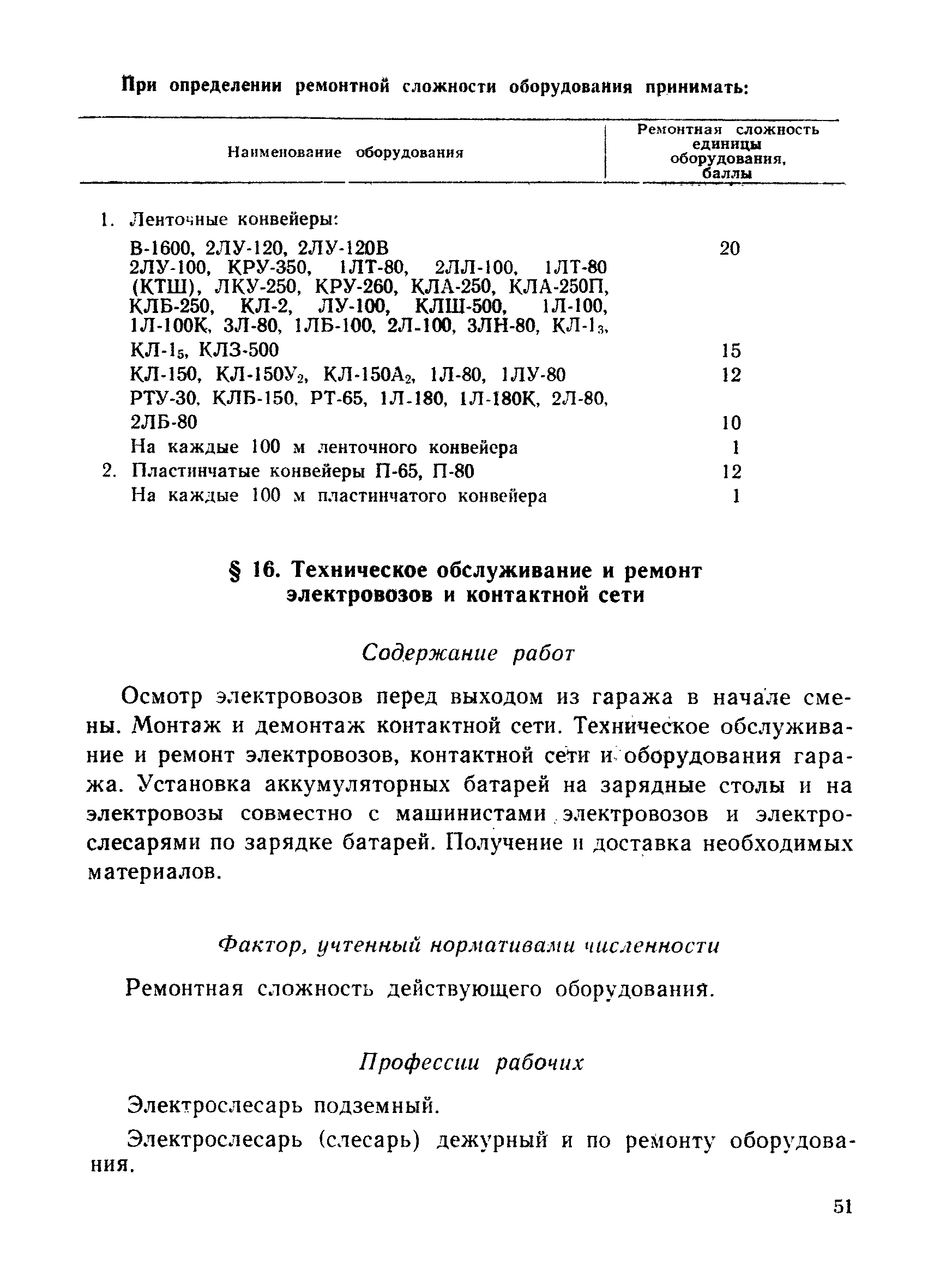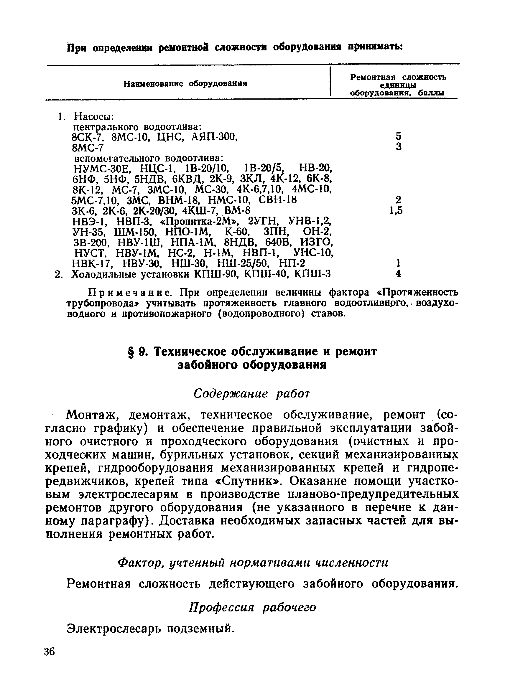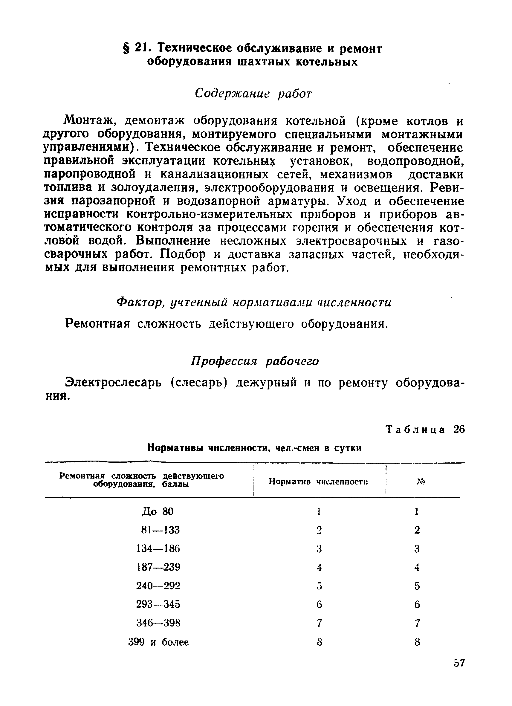 Единые нормативы численности повременно оплачиваемых рабочих для шахт Донецкого и Львовско-Волынского угольных бассейнов| Статус: | не действует | | Название рус.: | Единые нормативы численности повременно оплачиваемых рабочих для шахт Донецкого и Львовско-Волынского угольных бассейнов | | Дата добавления в базу: | 01.01.2018 | | Дата актуализации: | 01.01.2021 | | Область применения: | Единые нормативы численности сборника обязательны для применения на всех шахтах Донецкого (включая производственные объединения "Ростовуголь" и "Гуковуголь") и Львовско-Волынского угольных бассейнов и предназначены для планирования численности повременно оплачиваемых рабочих и установления доплат рабочим за совмещение профессий, расширение зон обслуживания и увеличение объема выполняемых работ. | | Оглавление: | Общая часть Нормативная часть I. Производство и обслуживание взрывных работ 1 Взрывные работы 2 Работы в складах взрывчатых материалов (в шахте и на поверхности) II. Электромеханическая служба в шахте и на поверхности 3 Техническое обслуживание и ремонт оборудования добычного участка 4 Техническое обслуживание и ремонт оборудования очистных забоев в ремонтно-подготовительную смену 5 Техническое обслуживание и ремонт оборудования подготовительного участка 6 Ежесуточное техническое обслуживание и ремонт оборудования подготовительных забоев, проходимых комбайнами 7 Техническое обслуживание и ремонт подъемов и стволов Общешахтное подземное оборудование 8 Техническое обслуживание и ремонт насосных установок, водопроводов и воздуховодов 9 Техническое обслуживание и ремонт забойного оборудования 10 Техническое обслуживание я ремонт общешахтного электротехнического оборудования и кабельной сети 11 Техническое обслуживание и ремонт средств автоматизации 12 Техническое обслуживание и ремонт аппаратуры по вентиляции и технике безопасности 13 Техническое обслуживание и ремонт оборудования участка профилактических работ по технике безопасности Транспорт в шахте и на поверхности 14 Техническое обслуживание и ремонт стационарных установок 15 Техническое обслуживание и ремонт конвейерных линий в шахте 16 Техническое обслуживание и ремонт электровозов и контактной сети 17 Зарядка батарей аккумуляторных электровозов 18 Техническое обслуживание и ремонт шахтных вагонеток Общешахтное оборудование на поверхности 19 Техническое обслуживание и ремонт вентиляторных установок 20 Техническое обслуживание и ремонт стационарных компрессорных установок 21 Техническое обслуживание и ремонт оборудования шахтных котельных 22 Техническое обслуживание о ремонт общешахтного электротехнического оборудования, кабельной и воздушной сети электропередач 23 Техническое обслуживание и ремонт средств автоматизации 24 Техническое обслуживание и ремонт оборудования технологического комплекса 25 Техническое обслуживание и ремонт оборудования административно-бытовых комбинатов 26 Техническое обслуживание и ремонт оборудования канатно-подвесных дорог с кольцевым движением вагонеток 27 Работы в шахтных электромеханических мастерских III. Управление машинами и механизмами 28 Управление конвейерами (питателями) 29 Управление подъемными машинами 30 Управление опрокидывателями и обслуживание разгрузочных пунктов (для вагонеток с разгрузкой через дно) 31 Управлени