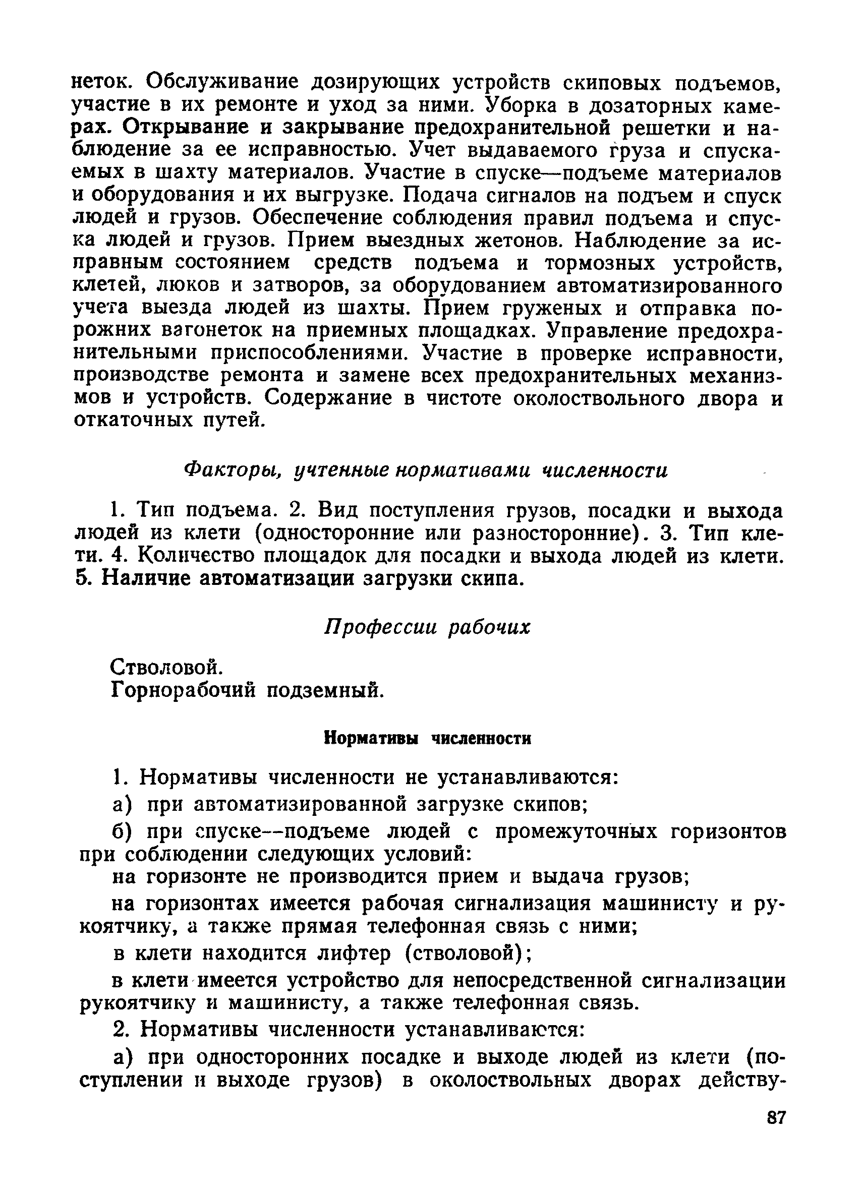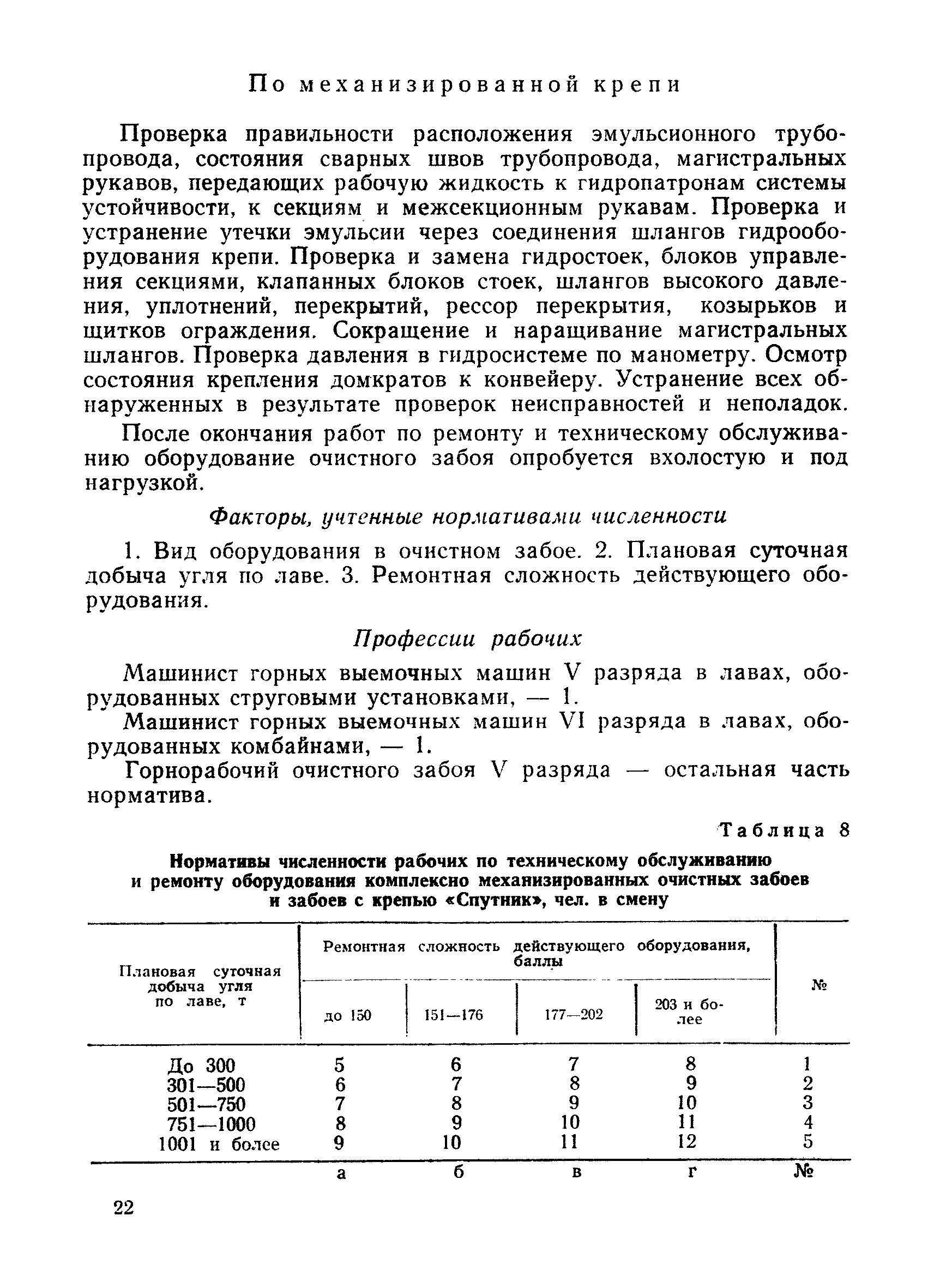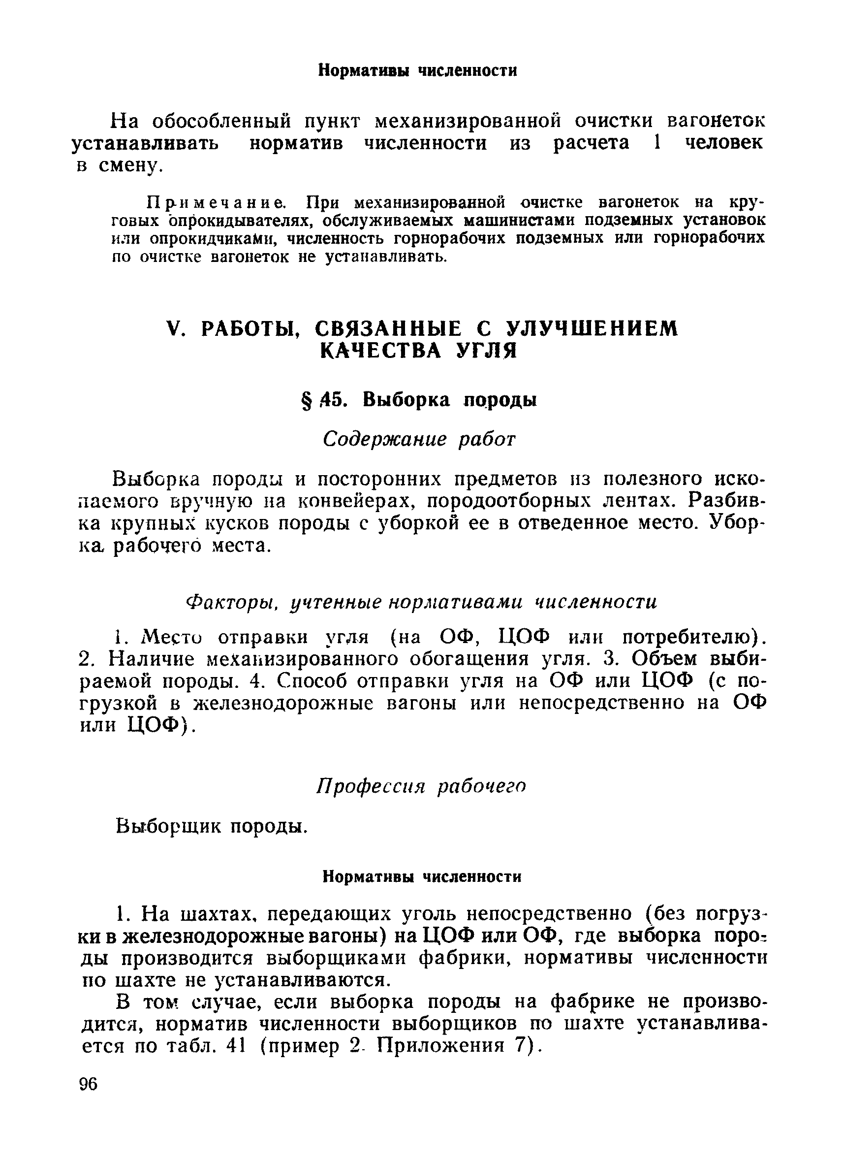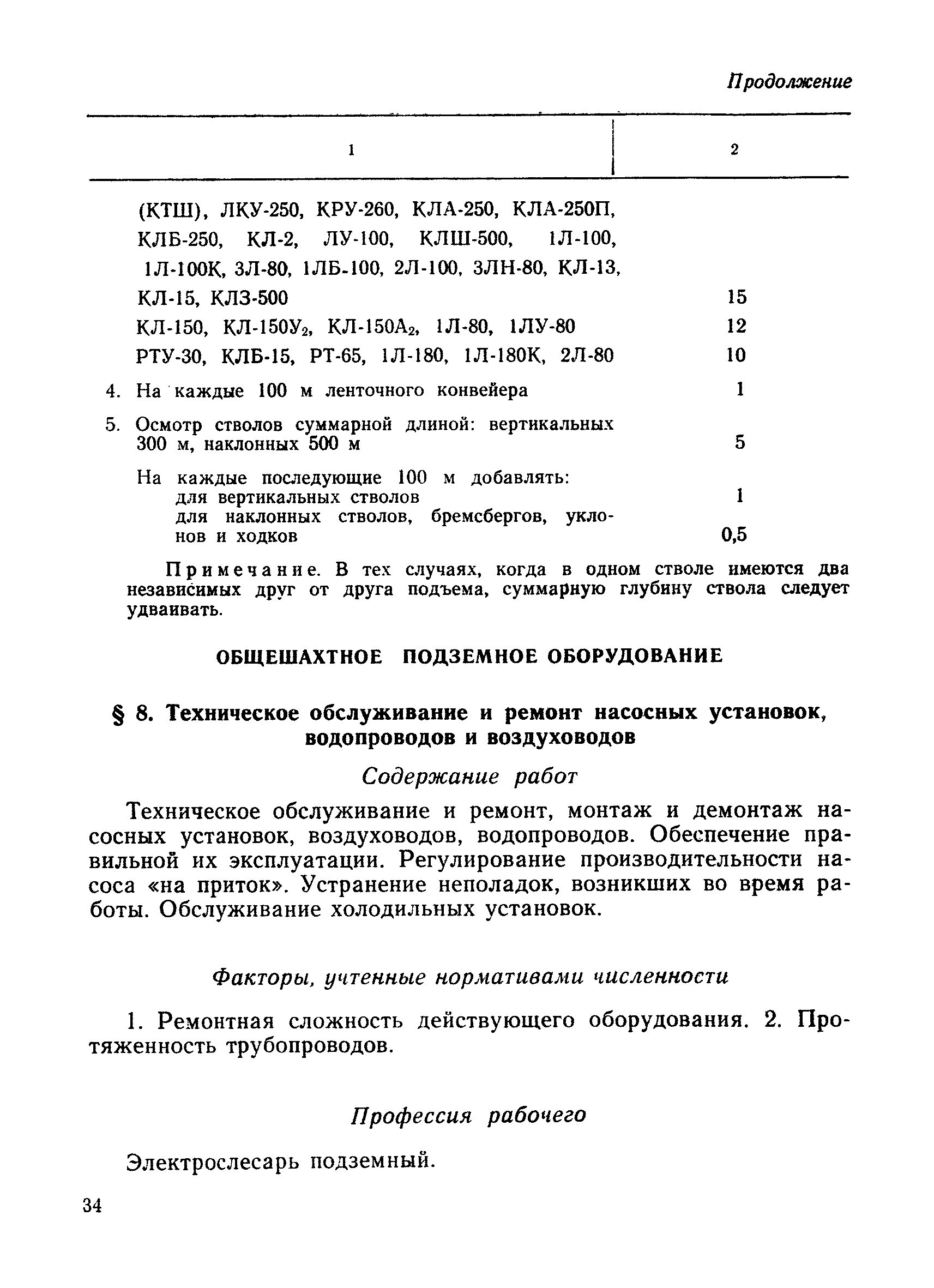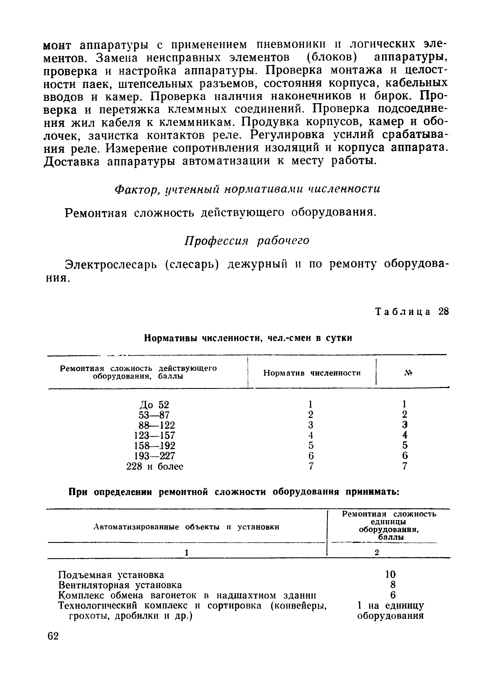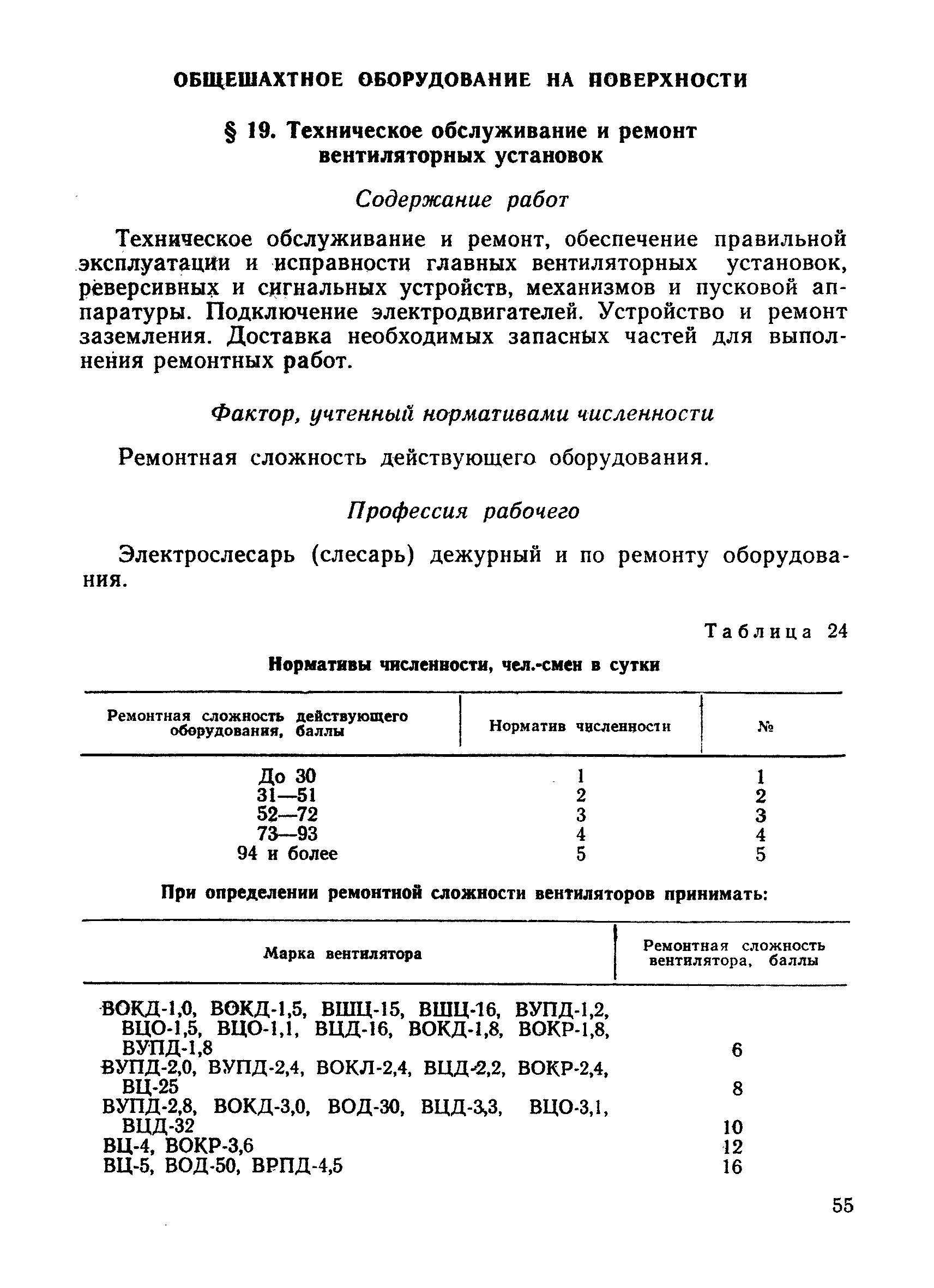 Единые нормативы численности повременно оплачиваемых рабочих для шахт Донецкого и Львовско-Волынского угольных бассейнов| Статус: | не действует | | Название рус.: | Единые нормативы численности повременно оплачиваемых рабочих для шахт Донецкого и Львовско-Волынского угольных бассейнов | | Дата добавления в базу: | 01.01.2018 | | Дата актуализации: | 01.01.2021 | | Область применения: | Единые нормативы численности сборника обязательны для применения на всех шахтах Донецкого (включая производственные объединения "Ростовуголь" и "Гуковуголь") и Львовско-Волынского угольных бассейнов и предназначены для планирования численности повременно оплачиваемых рабочих и установления доплат рабочим за совмещение профессий, расширение зон обслуживания и увеличение объема выполняемых работ. | | Оглавление: | Общая часть Нормативная часть I. Производство и обслуживание взрывных работ 1 Взрывные работы 2 Работы в складах взрывчатых материалов (в шахте и на поверхности) II. Электромеханическая служба в шахте и на поверхности 3 Техническое обслуживание и ремонт оборудования добычного участка 4 Техническое обслуживание и ремонт оборудования очистных забоев в ремонтно-подготовительную смену 5 Техническое обслуживание и ремонт оборудования подготовительного участка 6 Ежесуточное техническое обслуживание и ремонт оборудования подготовительных забоев, проходимых комбайнами 7 Техническое обслуживание и ремонт подъемов и стволов Общешахтное подземное оборудование 8 Техническое обслуживание и ремонт насосных установок, водопроводов и воздуховодов 9 Техническое обслуживание и ремонт забойного оборудования 10 Техническое обслуживание я ремонт общешахтного электротехнического оборудования и кабельной сети 11 Техническое обслуживание и ремонт средств автоматизации 12 Техническое обслуживание и ремонт аппаратуры по вентиляции и технике безопасности 13 Техническое обслуживание и ремонт оборудования участка профилактических работ по технике безопасности Транспорт в шахте и на поверхности 14 Техническое обслуживание и ремонт стационарных установок 15 Техническое обслуживание и ремонт конвейерных линий в шахте 16 Техническое обслуживание и ремонт электровозов и контактной сети 17 Зарядка батарей аккумуляторных электровозов 18 Техническое обслуживание и ремонт шахтных вагонеток Общешахтное оборудование на поверхности 19 Техническое обслуживание и ремонт вентиляторных установок 20 Техническое обслуживание и ремонт стационарных компрессорных установок 21 Техническое обслуживание и ремонт оборудования шахтных котельных 22 Техническое обслуживание о ремонт общешахтного электротехнического оборудования, кабельной и воздушной сети электропередач 23 Техническое обслуживание и ремонт средств автоматизации 24 Техническое обслуживание и ремонт оборудования технологического комплекса 25 Техническое обслуживание и ремонт оборудования административно-бытовых комбинатов 26 Техническое обслуживание и ремонт оборудования канатно-подвесных дорог с кольцевым движением вагонеток 27 Работы в шахтных электромеханических мастерских III. Управление машинами и механизмами 28 Управление конвейерами (питателями) 29 Управление подъемными машинами 30 Управление опрокидывателями и обслуживание разгрузочных пунктов (для вагонеток с разгрузкой через дно) 31 Управлени