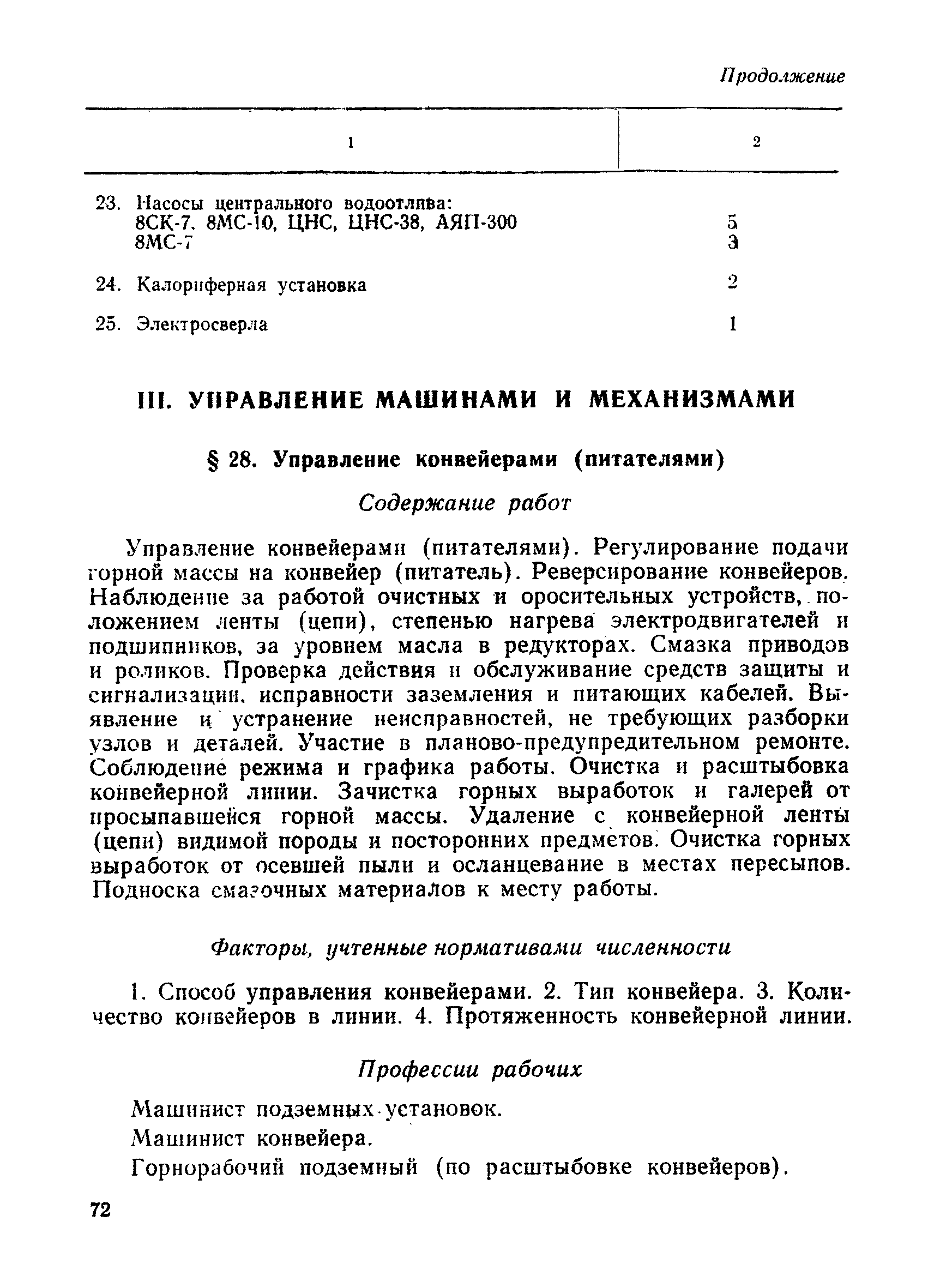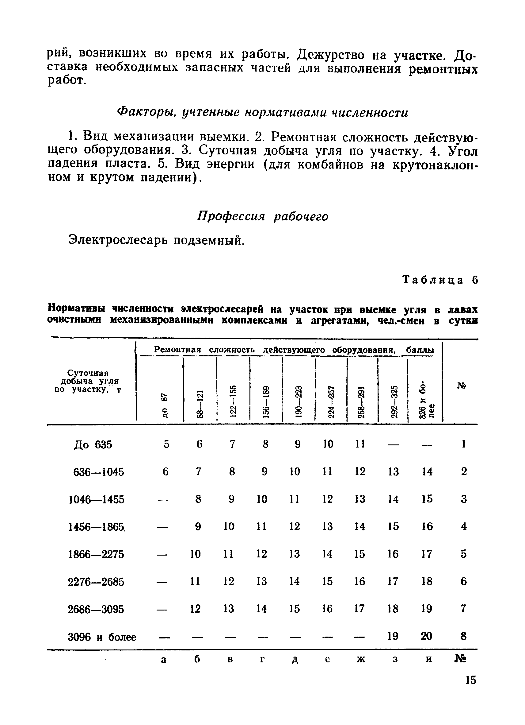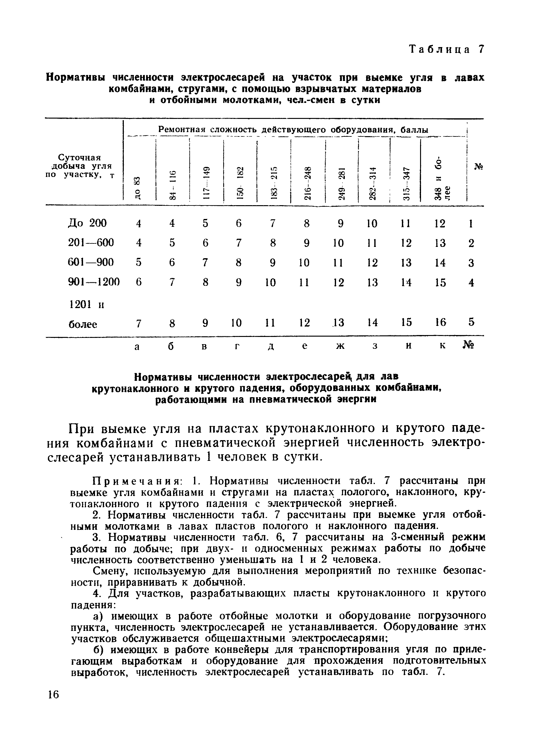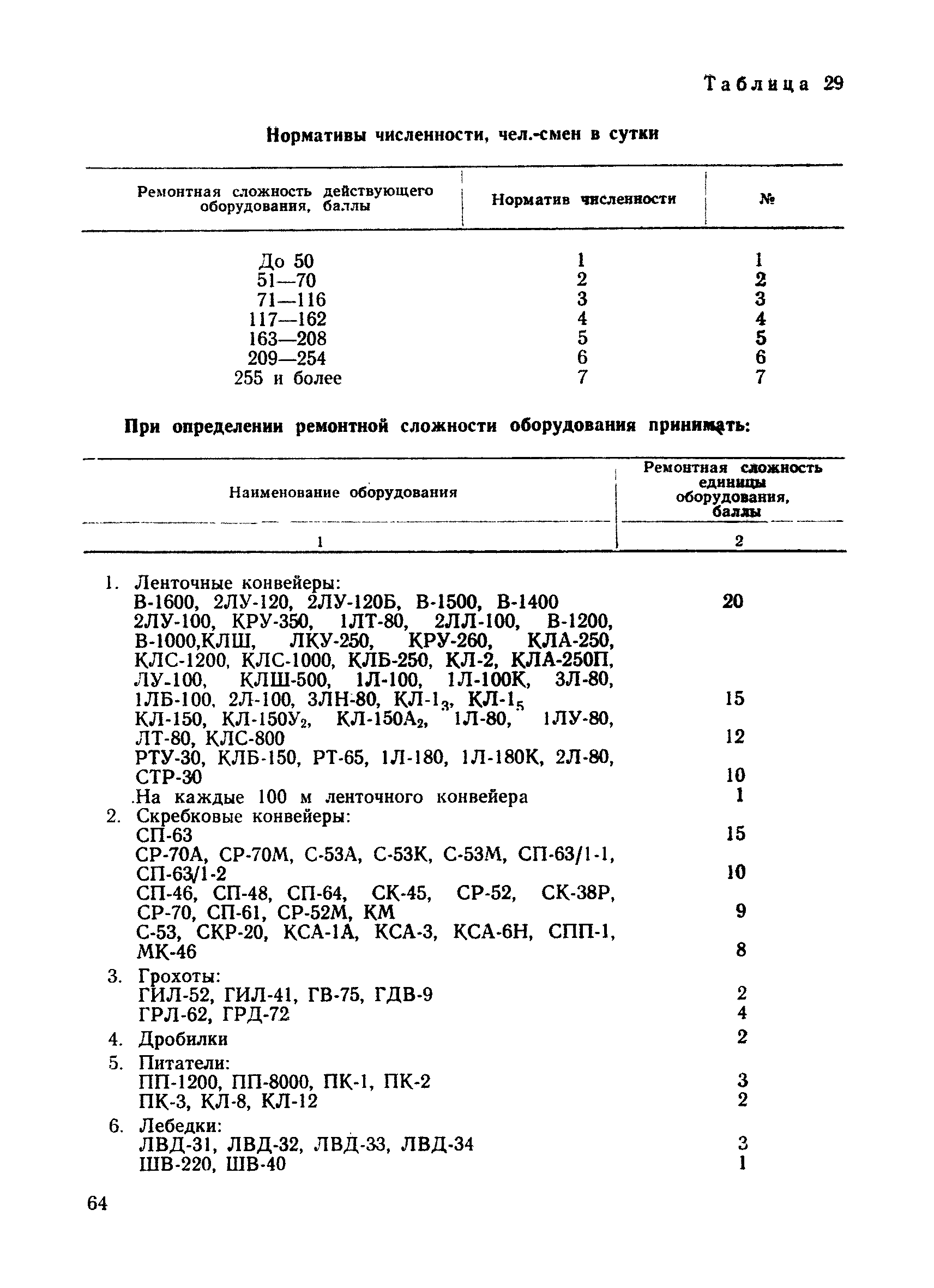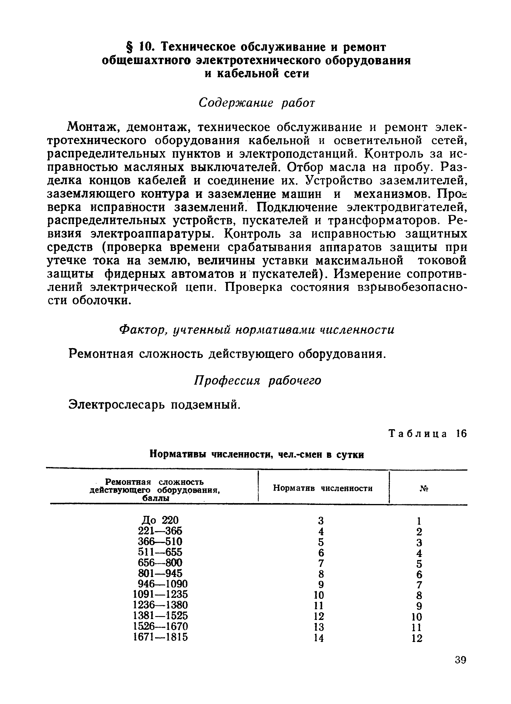 Единые нормативы численности повременно оплачиваемых рабочих для шахт Донецкого и Львовско-Волынского угольных бассейнов| Статус: | не действует | | Название рус.: | Единые нормативы численности повременно оплачиваемых рабочих для шахт Донецкого и Львовско-Волынского угольных бассейнов | | Дата добавления в базу: | 01.01.2018 | | Дата актуализации: | 01.01.2021 | | Область применения: | Единые нормативы численности сборника обязательны для применения на всех шахтах Донецкого (включая производственные объединения "Ростовуголь" и "Гуковуголь") и Львовско-Волынского угольных бассейнов и предназначены для планирования численности повременно оплачиваемых рабочих и установления доплат рабочим за совмещение профессий, расширение зон обслуживания и увеличение объема выполняемых работ. | | Оглавление: | Общая часть Нормативная часть I. Производство и обслуживание взрывных работ 1 Взрывные работы 2 Работы в складах взрывчатых материалов (в шахте и на поверхности) II. Электромеханическая служба в шахте и на поверхности 3 Техническое обслуживание и ремонт оборудования добычного участка 4 Техническое обслуживание и ремонт оборудования очистных забоев в ремонтно-подготовительную смену 5 Техническое обслуживание и ремонт оборудования подготовительного участка 6 Ежесуточное техническое обслуживание и ремонт оборудования подготовительных забоев, проходимых комбайнами 7 Техническое обслуживание и ремонт подъемов и стволов Общешахтное подземное оборудование 8 Техническое обслуживание и ремонт насосных установок, водопроводов и воздуховодов 9 Техническое обслуживание и ремонт забойного оборудования 10 Техническое обслуживание я ремонт общешахтного электротехнического оборудования и кабельной сети 11 Техническое обслуживание и ремонт средств автоматизации 12 Техническое обслуживание и ремонт аппаратуры по вентиляции и технике безопасности 13 Техническое обслуживание и ремонт оборудования участка профилактических работ по технике безопасности Транспорт в шахте и на поверхности 14 Техническое обслуживание и ремонт стационарных установок 15 Техническое обслуживание и ремонт конвейерных линий в шахте 16 Техническое обслуживание и ремонт электровозов и контактной сети 17 Зарядка батарей аккумуляторных электровозов 18 Техническое обслуживание и ремонт шахтных вагонеток Общешахтное оборудование на поверхности 19 Техническое обслуживание и ремонт вентиляторных установок 20 Техническое обслуживание и ремонт стационарных компрессорных установок 21 Техническое обслуживание и ремонт оборудования шахтных котельных 22 Техническое обслуживание о ремонт общешахтного электротехнического оборудования, кабельной и воздушной сети электропередач 23 Техническое обслуживание и ремонт средств автоматизации 24 Техническое обслуживание и ремонт оборудования технологического комплекса 25 Техническое обслуживание и ремонт оборудования административно-бытовых комбинатов 26 Техническое обслуживание и ремонт оборудования канатно-подвесных дорог с кольцевым движением вагонеток 27 Работы в шахтных электромеханических мастерских III. Управление машинами и механизмами 28 Управление конвейерами (питателями) 29 Управление подъемными машинами 30 Управление опрокидывателями и обслуживание разгрузочных пунктов (для вагонеток с разгрузкой через дно) 31 Управлени