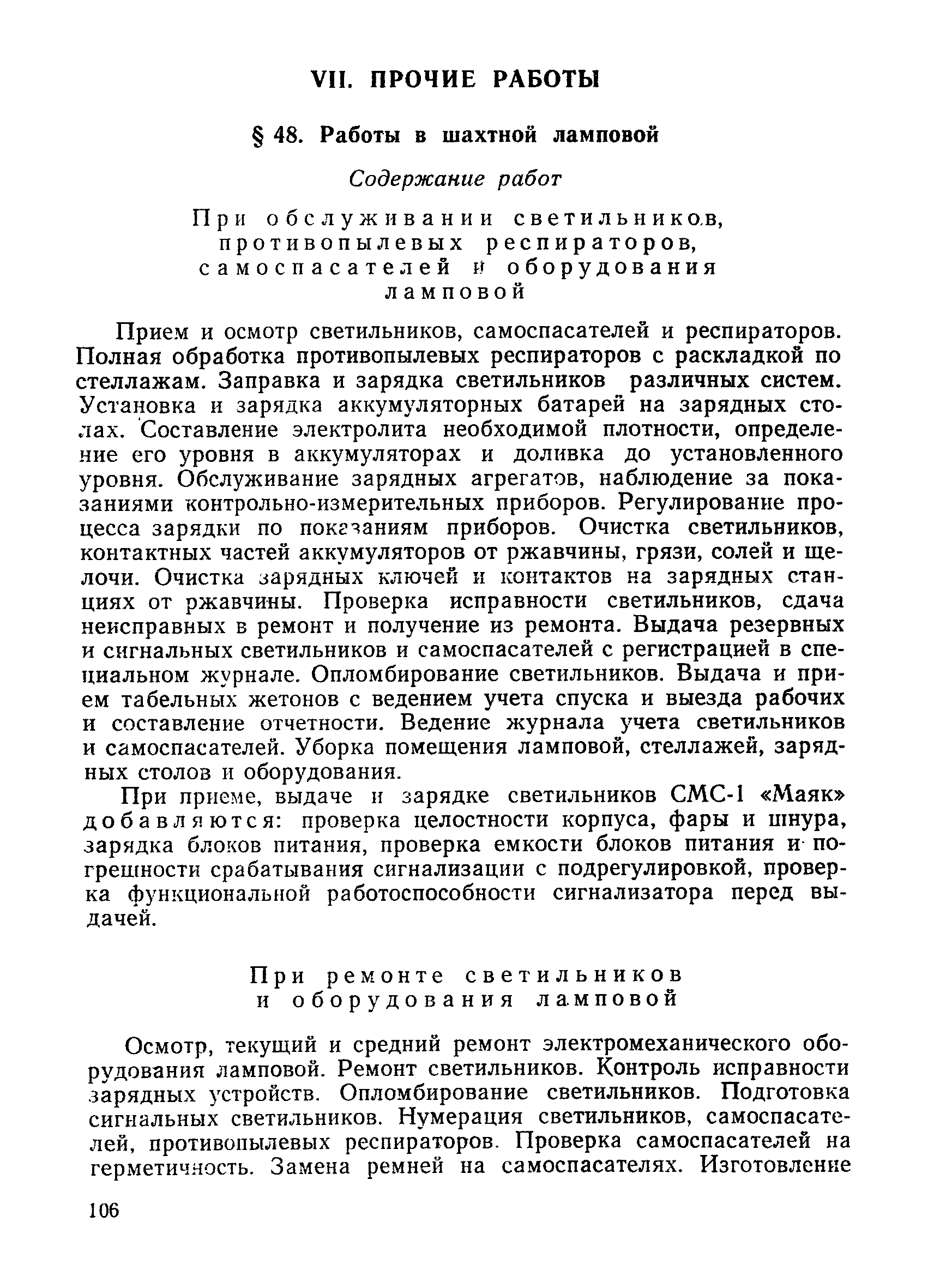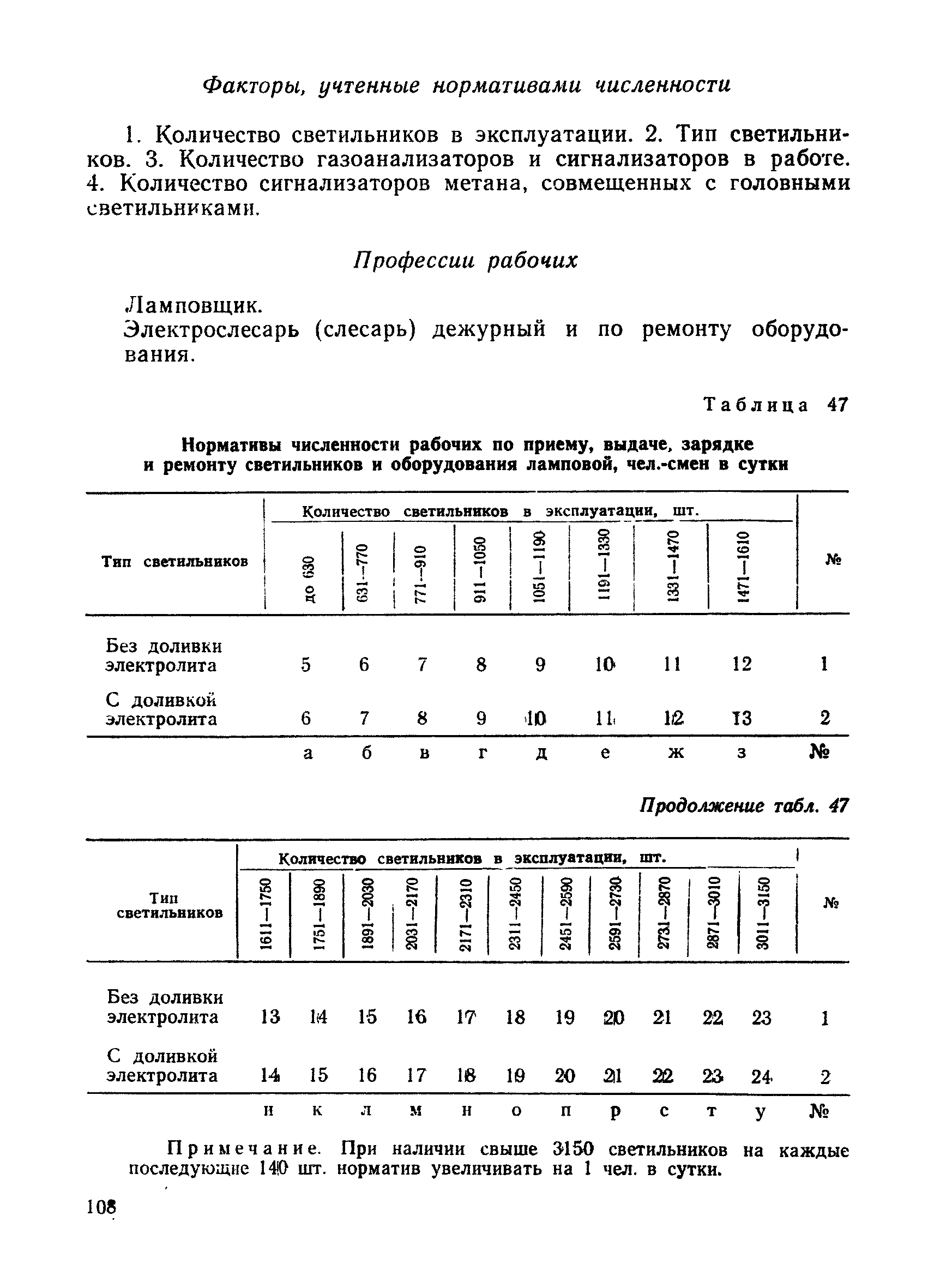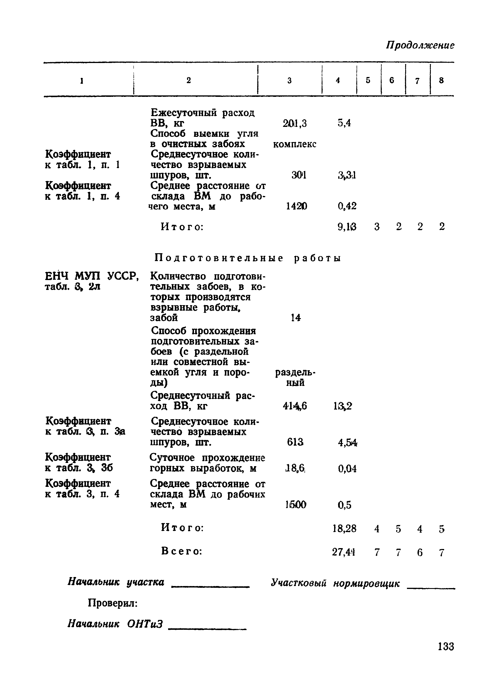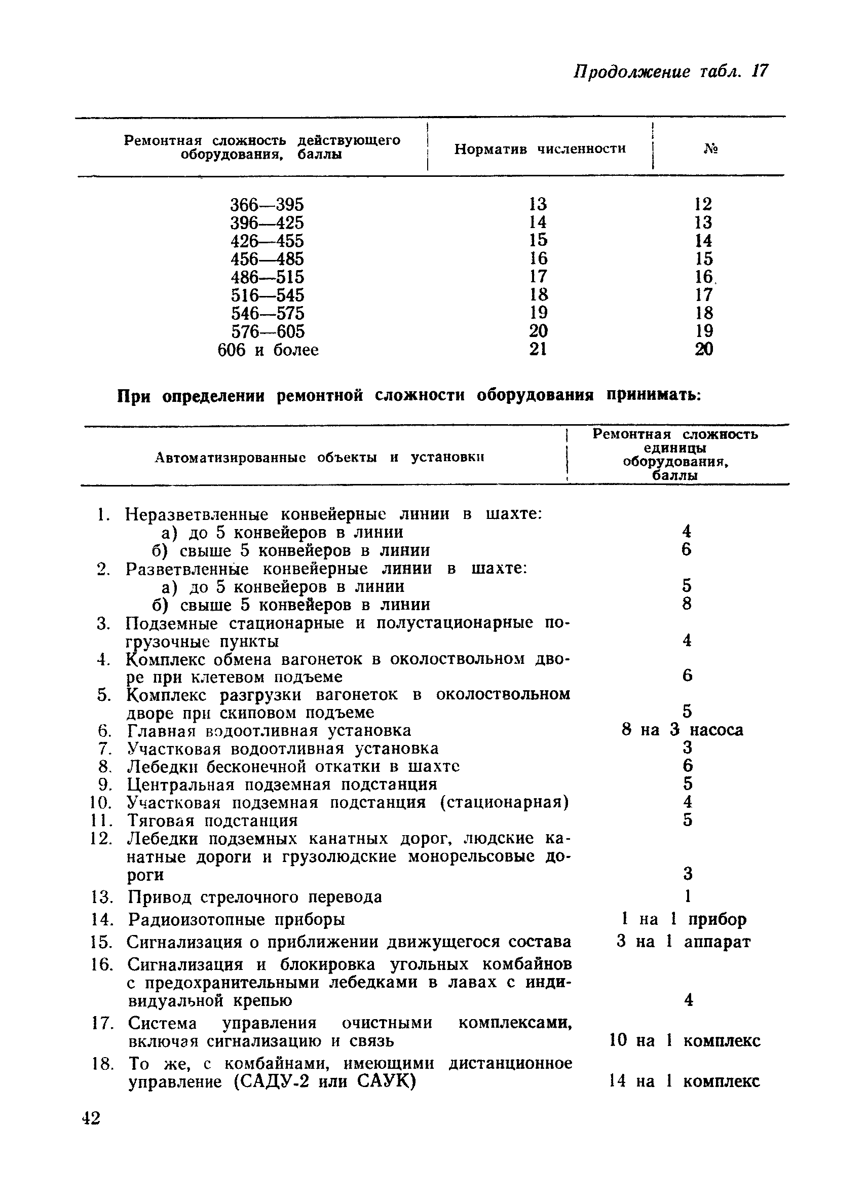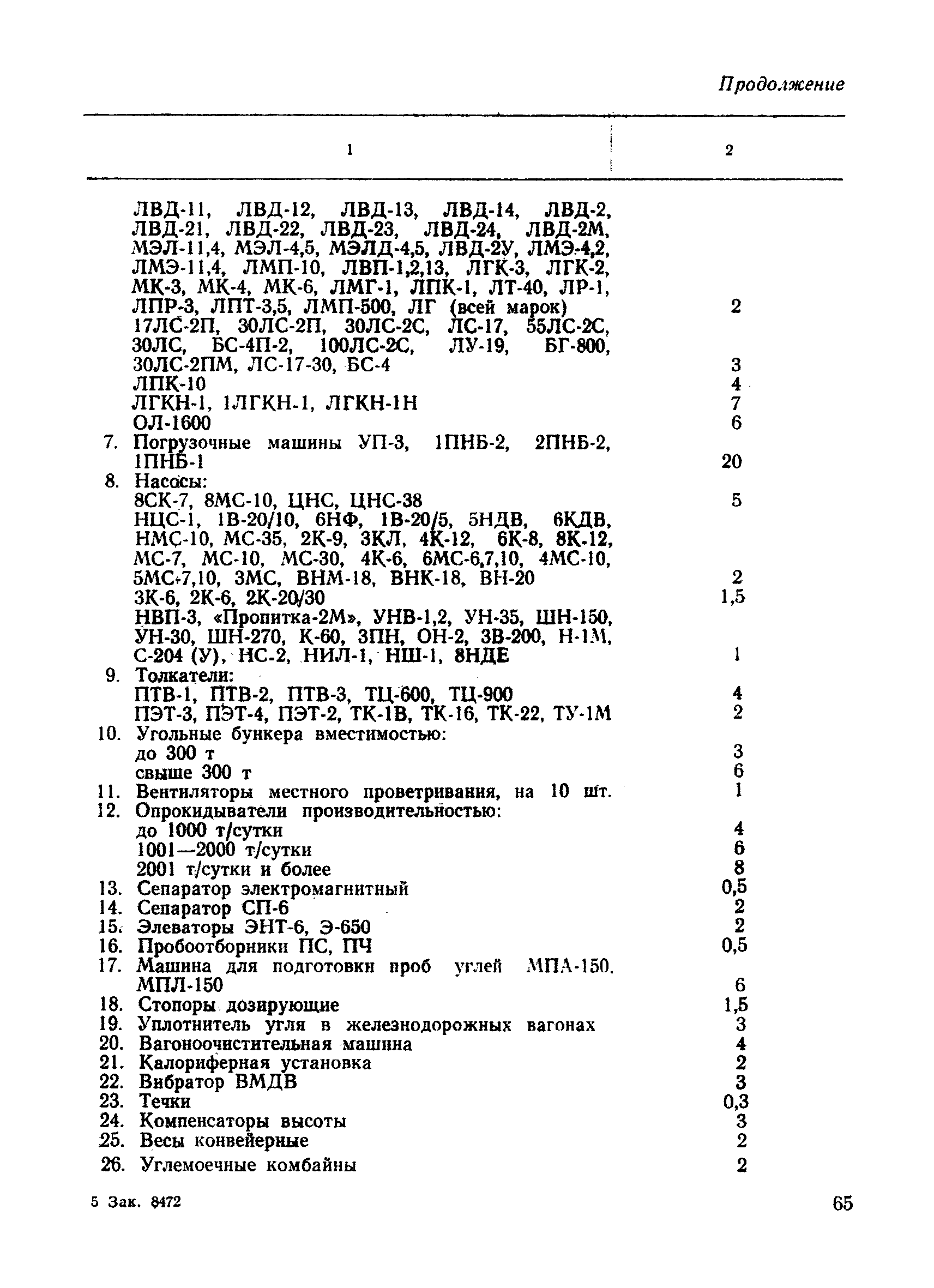 Единые нормативы численности повременно оплачиваемых рабочих для шахт Донецкого и Львовско-Волынского угольных бассейнов| Статус: | не действует | | Название рус.: | Единые нормативы численности повременно оплачиваемых рабочих для шахт Донецкого и Львовско-Волынского угольных бассейнов | | Дата добавления в базу: | 01.01.2018 | | Дата актуализации: | 01.01.2021 | | Область применения: | Единые нормативы численности сборника обязательны для применения на всех шахтах Донецкого (включая производственные объединения "Ростовуголь" и "Гуковуголь") и Львовско-Волынского угольных бассейнов и предназначены для планирования численности повременно оплачиваемых рабочих и установления доплат рабочим за совмещение профессий, расширение зон обслуживания и увеличение объема выполняемых работ. | | Оглавление: | Общая часть Нормативная часть I. Производство и обслуживание взрывных работ 1 Взрывные работы 2 Работы в складах взрывчатых материалов (в шахте и на поверхности) II. Электромеханическая служба в шахте и на поверхности 3 Техническое обслуживание и ремонт оборудования добычного участка 4 Техническое обслуживание и ремонт оборудования очистных забоев в ремонтно-подготовительную смену 5 Техническое обслуживание и ремонт оборудования подготовительного участка 6 Ежесуточное техническое обслуживание и ремонт оборудования подготовительных забоев, проходимых комбайнами 7 Техническое обслуживание и ремонт подъемов и стволов Общешахтное подземное оборудование 8 Техническое обслуживание и ремонт насосных установок, водопроводов и воздуховодов 9 Техническое обслуживание и ремонт забойного оборудования 10 Техническое обслуживание я ремонт общешахтного электротехнического оборудования и кабельной сети 11 Техническое обслуживание и ремонт средств автоматизации 12 Техническое обслуживание и ремонт аппаратуры по вентиляции и технике безопасности 13 Техническое обслуживание и ремонт оборудования участка профилактических работ по технике безопасности Транспорт в шахте и на поверхности 14 Техническое обслуживание и ремонт стационарных установок 15 Техническое обслуживание и ремонт конвейерных линий в шахте 16 Техническое обслуживание и ремонт электровозов и контактной сети 17 Зарядка батарей аккумуляторных электровозов 18 Техническое обслуживание и ремонт шахтных вагонеток Общешахтное оборудование на поверхности 19 Техническое обслуживание и ремонт вентиляторных установок 20 Техническое обслуживание и ремонт стационарных компрессорных установок 21 Техническое обслуживание и ремонт оборудования шахтных котельных 22 Техническое обслуживание о ремонт общешахтного электротехнического оборудования, кабельной и воздушной сети электропередач 23 Техническое обслуживание и ремонт средств автоматизации 24 Техническое обслуживание и ремонт оборудования технологического комплекса 25 Техническое обслуживание и ремонт оборудования административно-бытовых комбинатов 26 Техническое обслуживание и ремонт оборудования канатно-подвесных дорог с кольцевым движением вагонеток 27 Работы в шахтных электромеханических мастерских III. Управление машинами и механизмами 28 Управление конвейерами (питателями) 29 Управление подъемными машинами 30 Управление опрокидывателями и обслуживание разгрузочных пунктов (для вагонеток с разгрузкой через дно) 31 Управлени