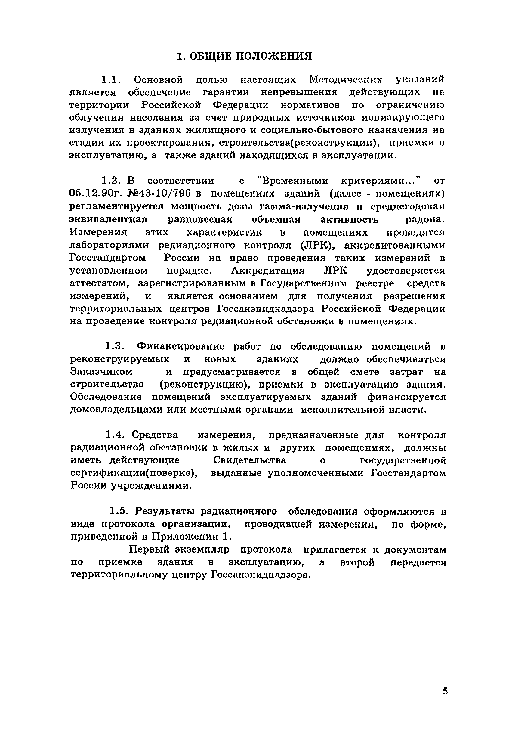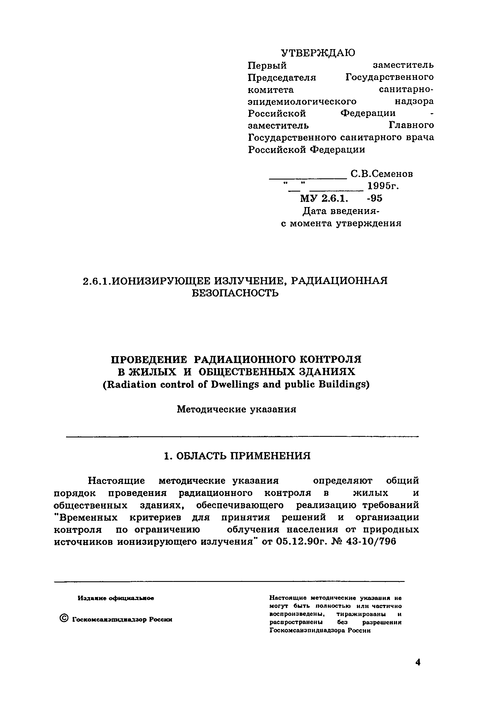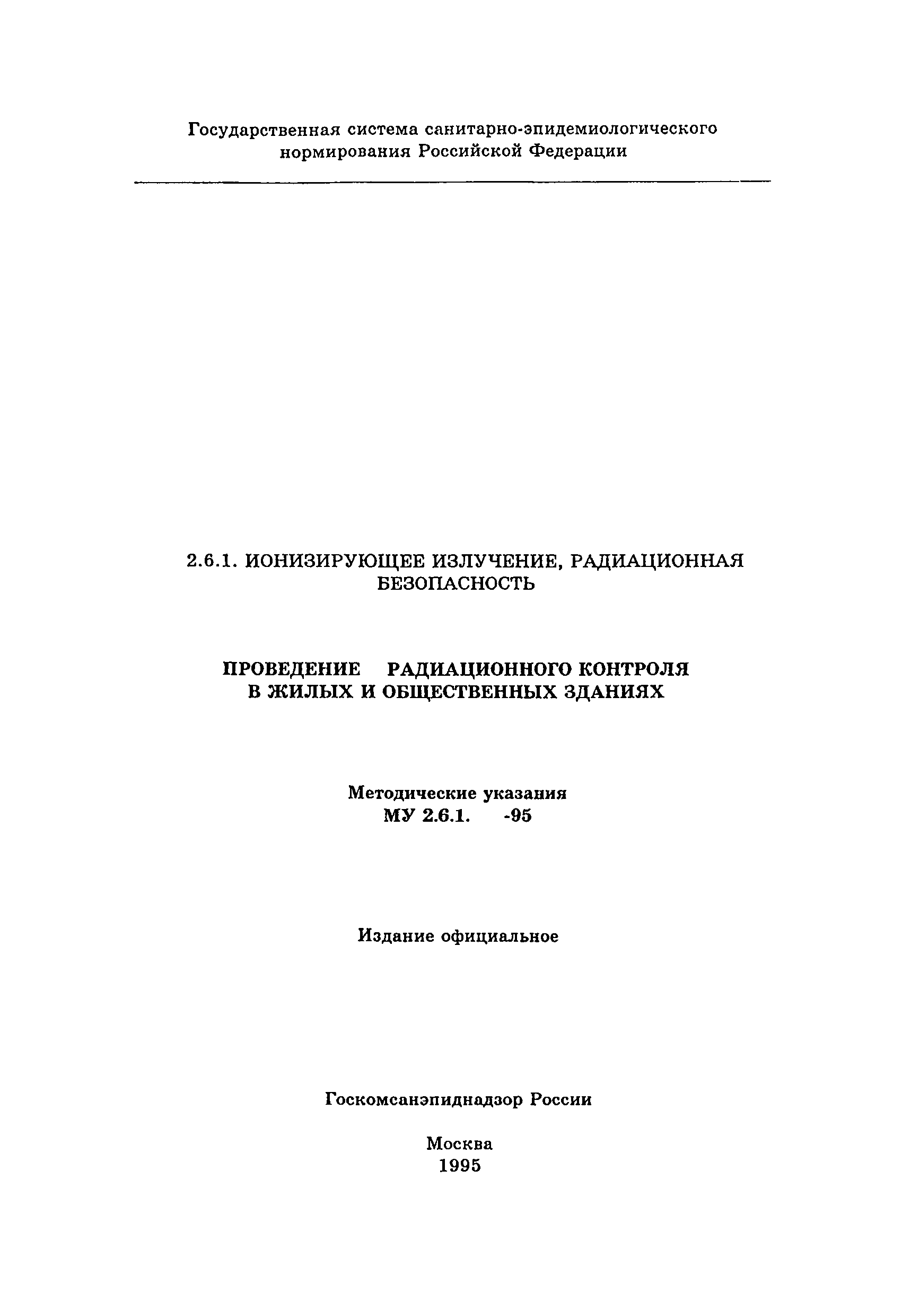 | Область применения: | Методические указания определяют общий порядок проведения радиационного контроля в жилых и общественных зданиях. |