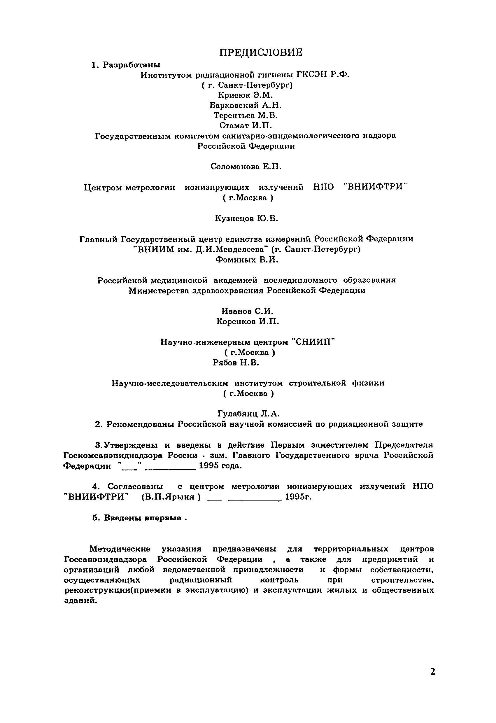 | Разработан: | Российская медицинская академия последипломного образования МЗ РФ Институт радиационной гигиены ГКСЭН Р.Ф. Государственный комитет санитарно-эпидемиологического надзора Центр метрологии ионизирующих излучений НПО ВНИИФТРИ Главный государственный центр единства измерений Российской Федерации ВНИИМ им. Д.И. Менделеева Научно-инженерный центр СНИИП Научно-исследовательский институт строительной физики