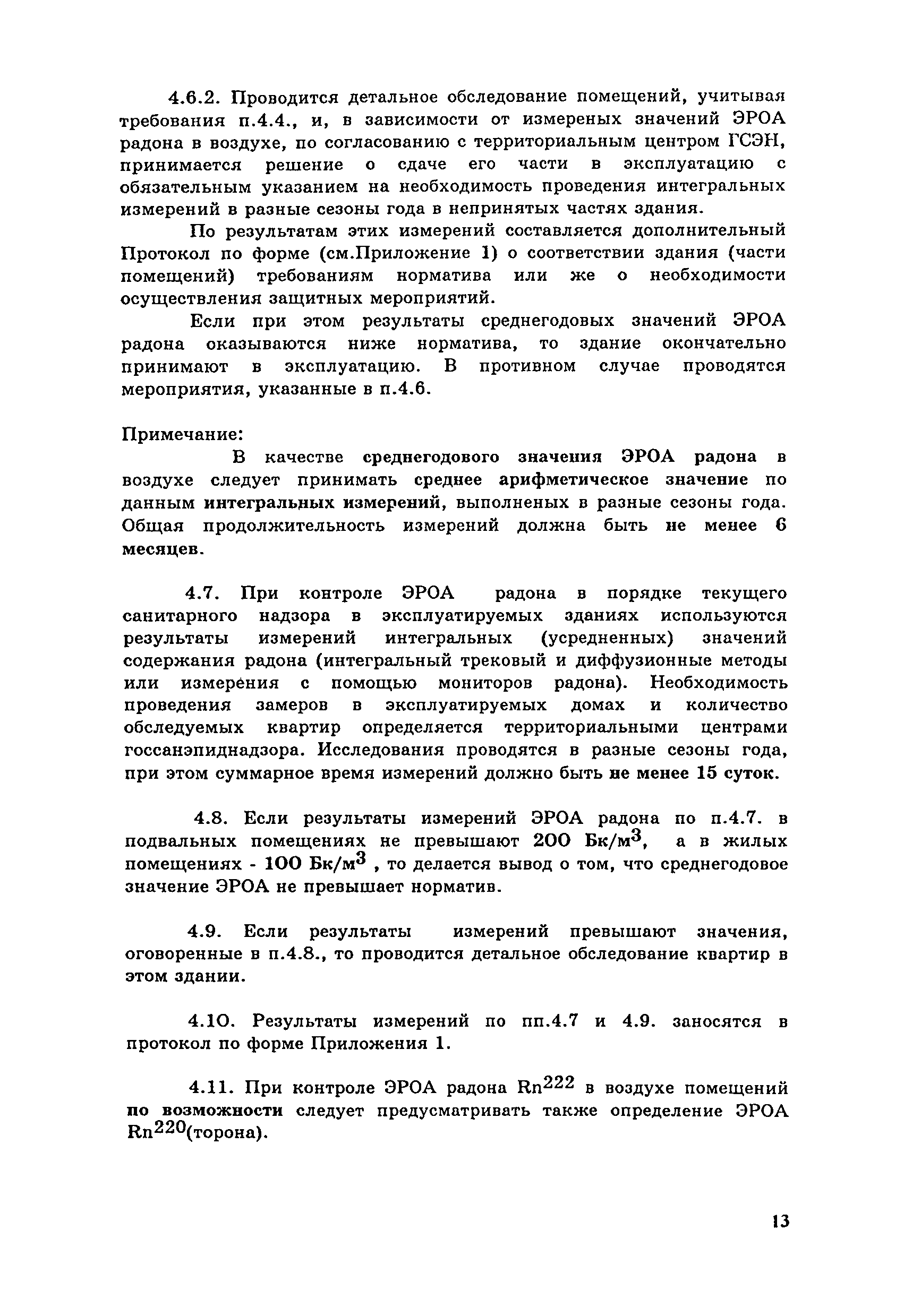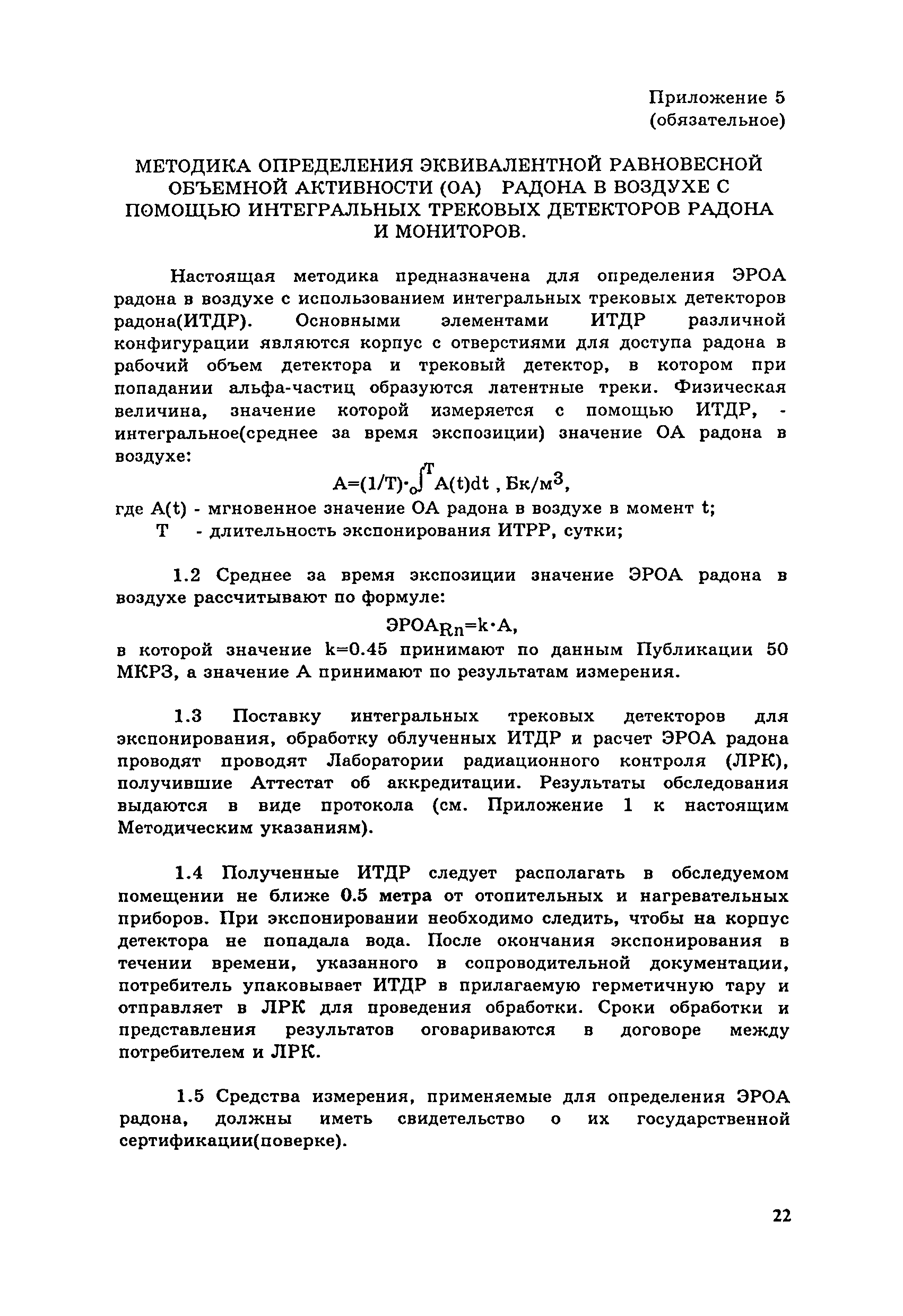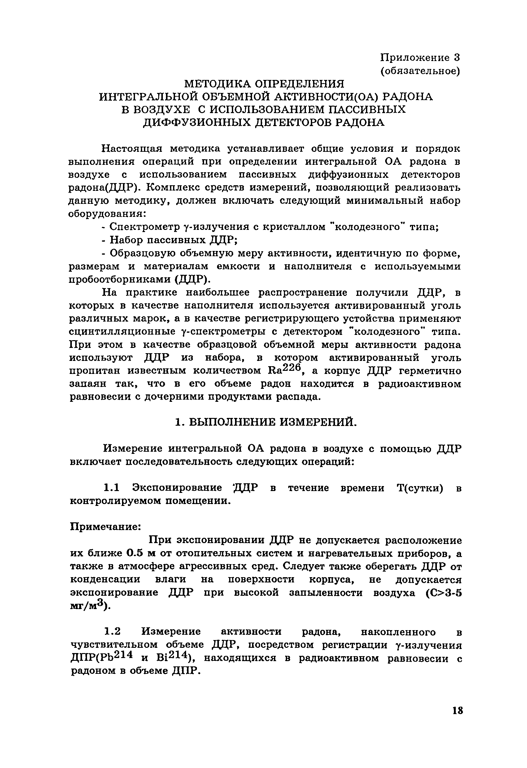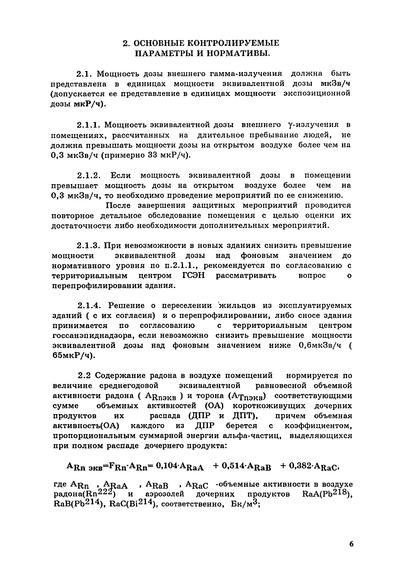| Оглавление: | Область применения 1. Общие положения 2. Основные контролируемые параметры и нормативы 3. Контроль мощности эквивалентной дозы внешнего гамма-излучения в помещениях зданий 4. Контроль эквивалентной равновесной объемной активности радона в воздухе помещений Приложение 1. Протокол радиационного обследования объекта Приложение 2. Перечень приборов, рекомендуемых для применения при контроле мощности дозы в помещениях зданий Приложение 3. Методика определения интегральной ОА радона в воздухе с использованием пассивных диффузионных детекторов радона Приложение 4. Методика выполнения измерений мгновенных значений ОА радона в помещениях зданий с использованием радиометра РРА-01М Приложение 5. Методика измерений эквивалентной равновесной объемной активности радона с помощью интегральных трековых детекторов и мониторов |