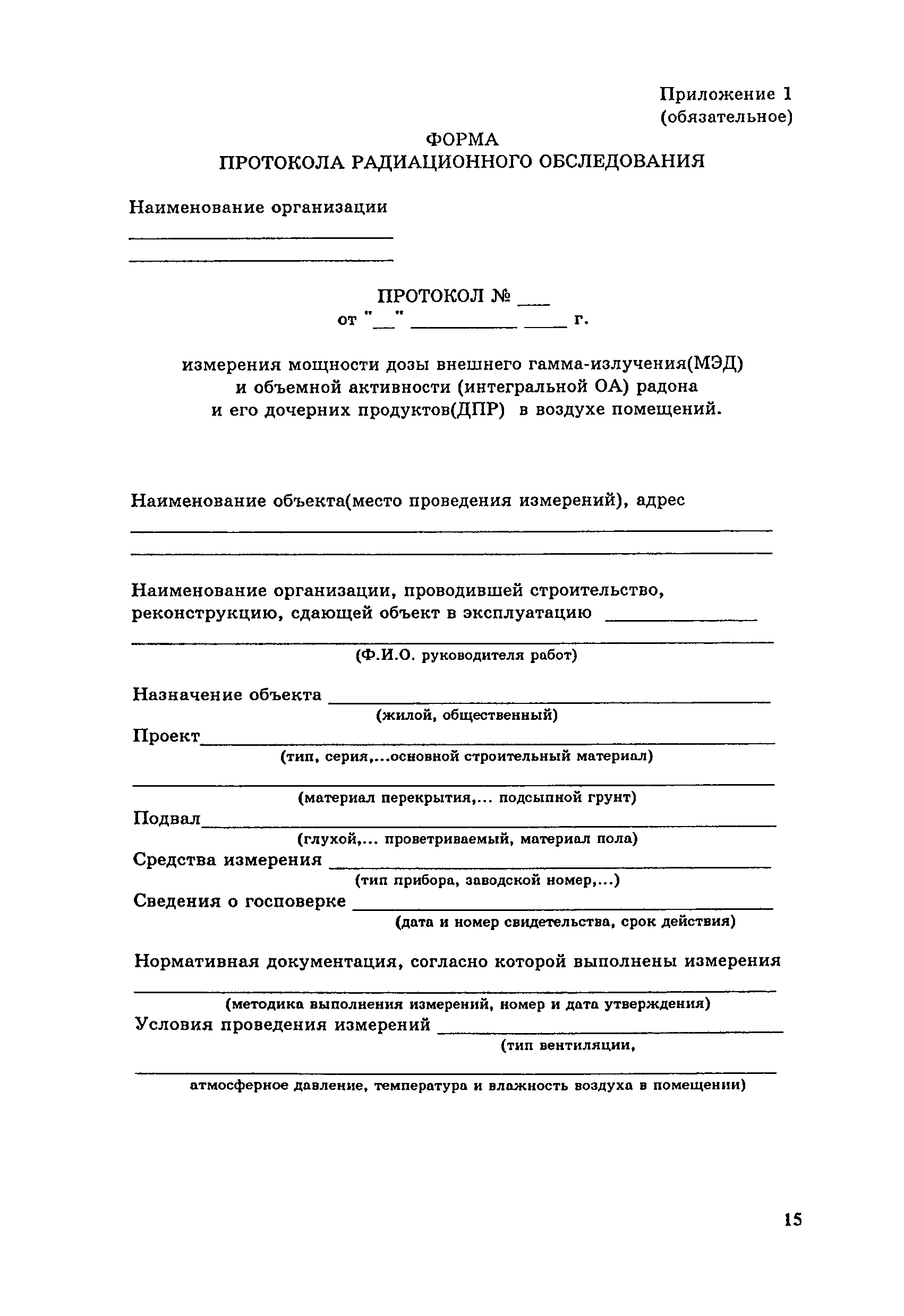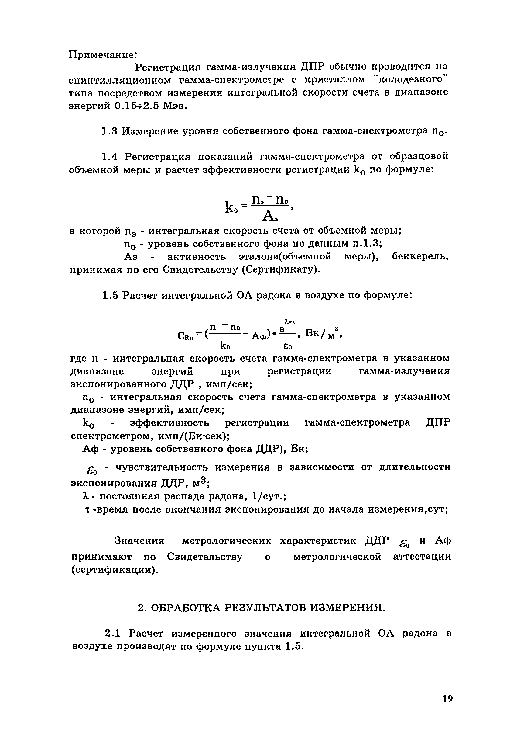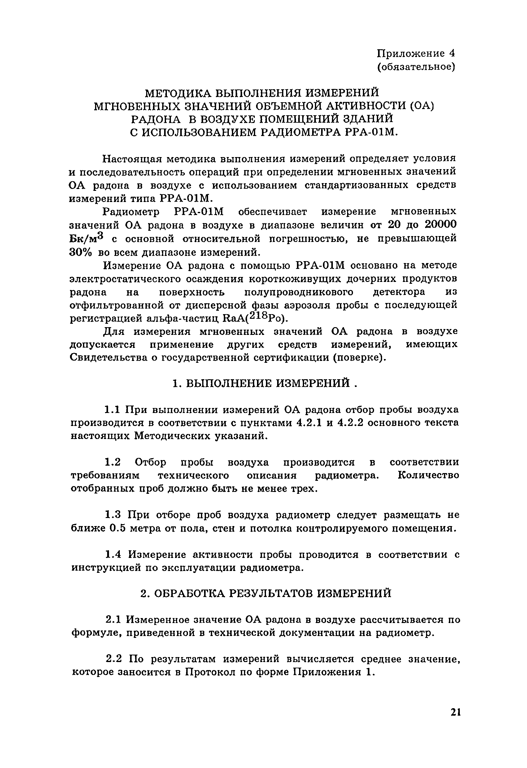 | Оглавление: | Область применения 1. Общие положения 2. Основные контролируемые параметры и нормативы 3. Контроль мощности эквивалентной дозы внешнего гамма-излучения в помещениях зданий 4. Контроль эквивалентной равновесной объемной активности радона в воздухе помещений Приложение 1. Протокол радиационного обследования объекта Приложение 2. Перечень приборов, рекомендуемых для применения при контроле мощности дозы в помещениях зданий Приложение 3. Методика определения интегральной ОА радона в воздухе с использованием пассивных диффузионных детекторов радона Приложение 4. Методика выполнения измерений мгновенных значений ОА радона в помещениях зданий с использованием радиометра РРА-01М Приложение 5. Методика измерений эквивалентной равновесной объемной активности радона с помощью интегральных трековых детекторов и мониторов |