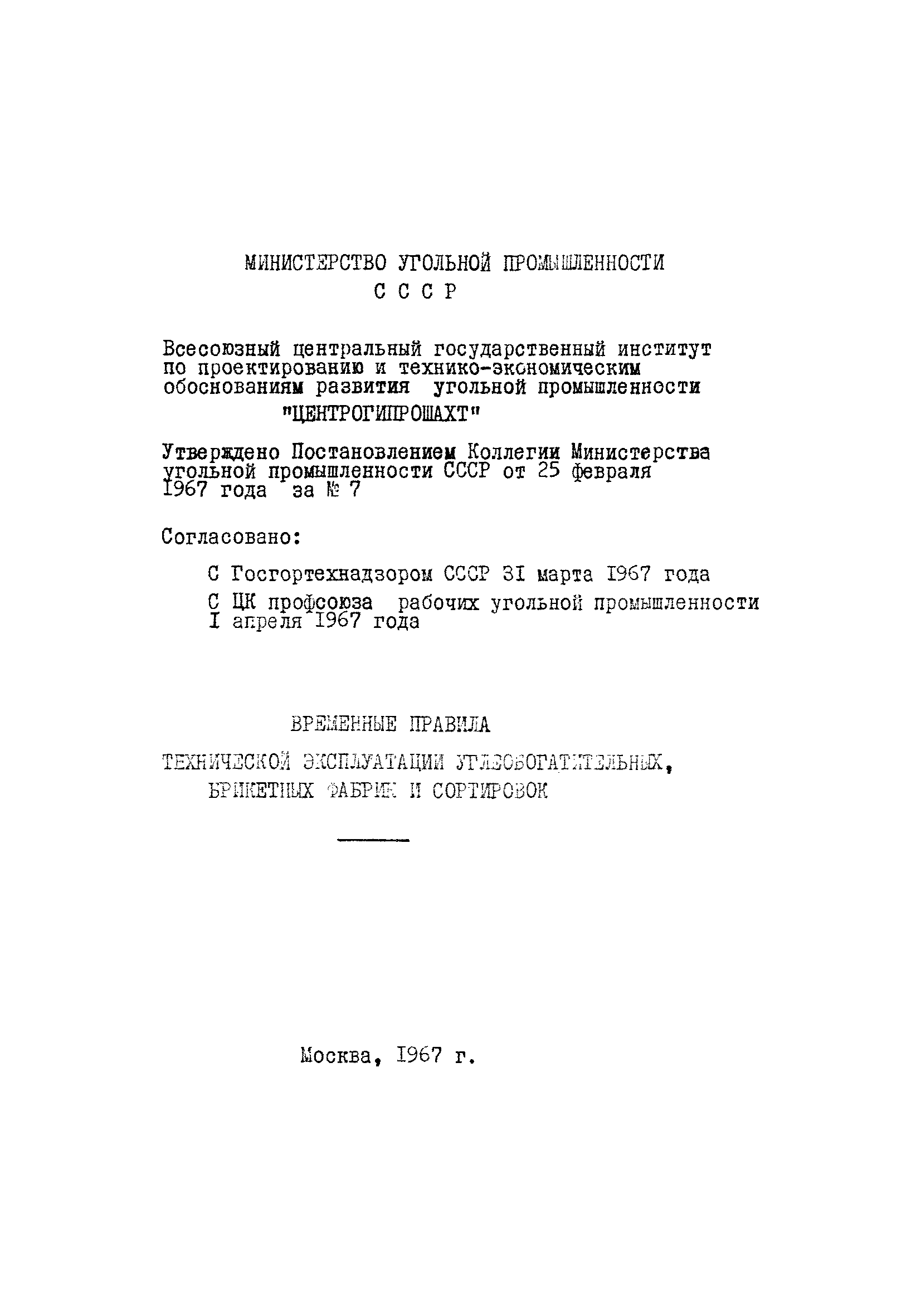 | | Утверждён: | 25.02.1967 Министерство угольной промышленности СССР (USSR Ministry of the Coal Industry 7)