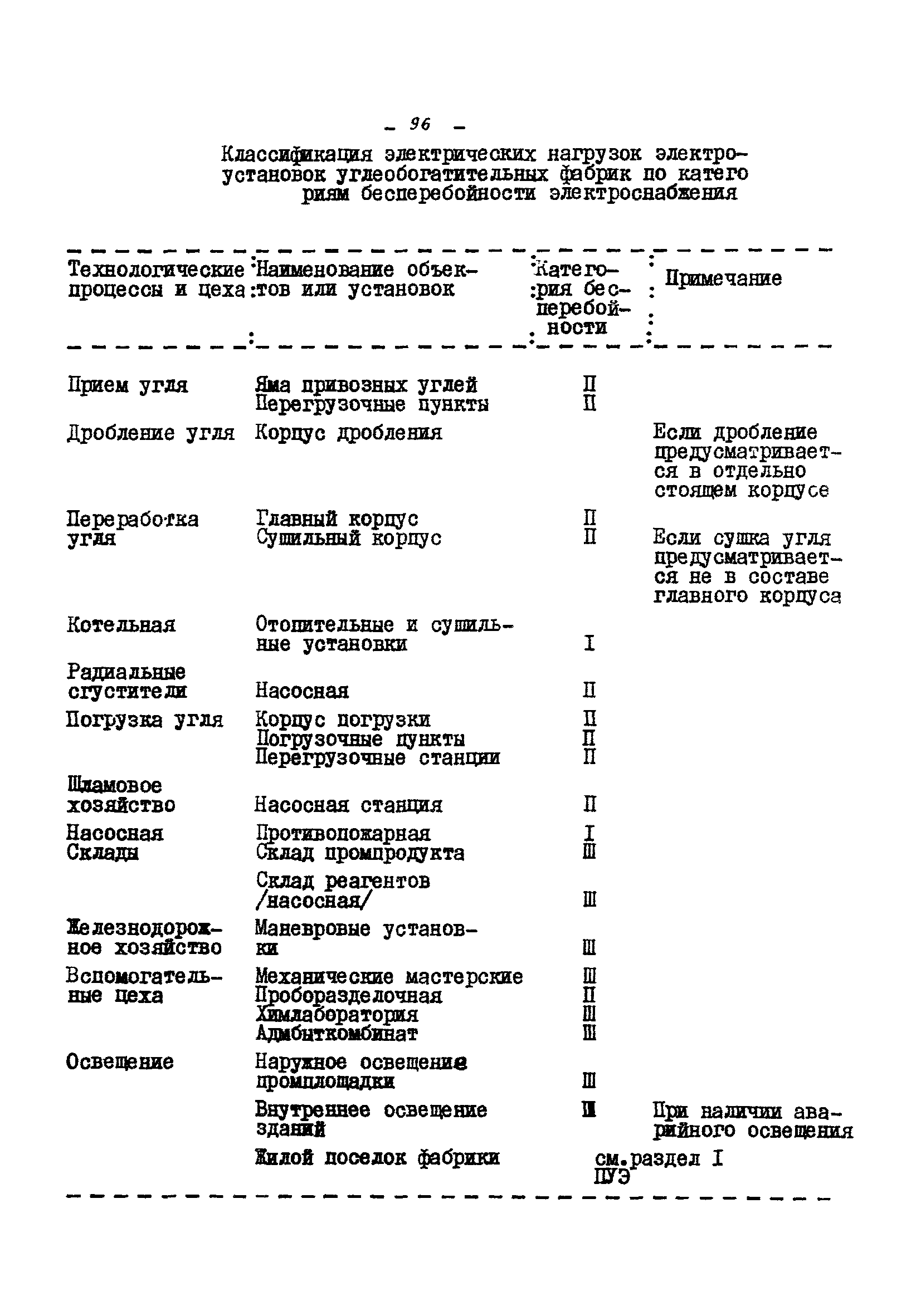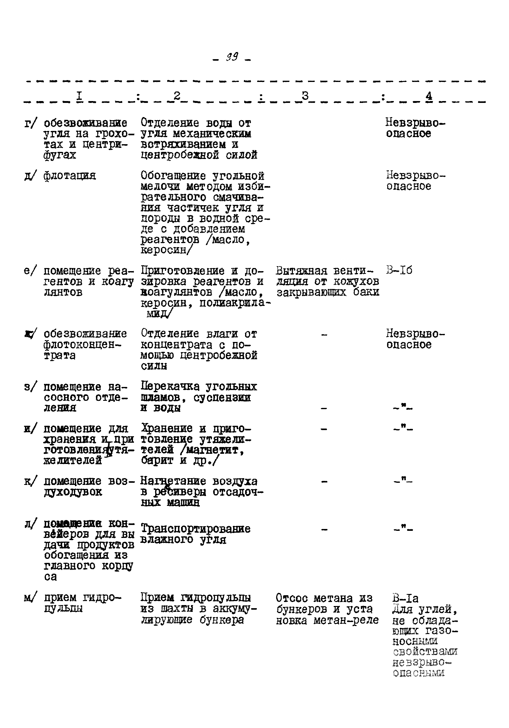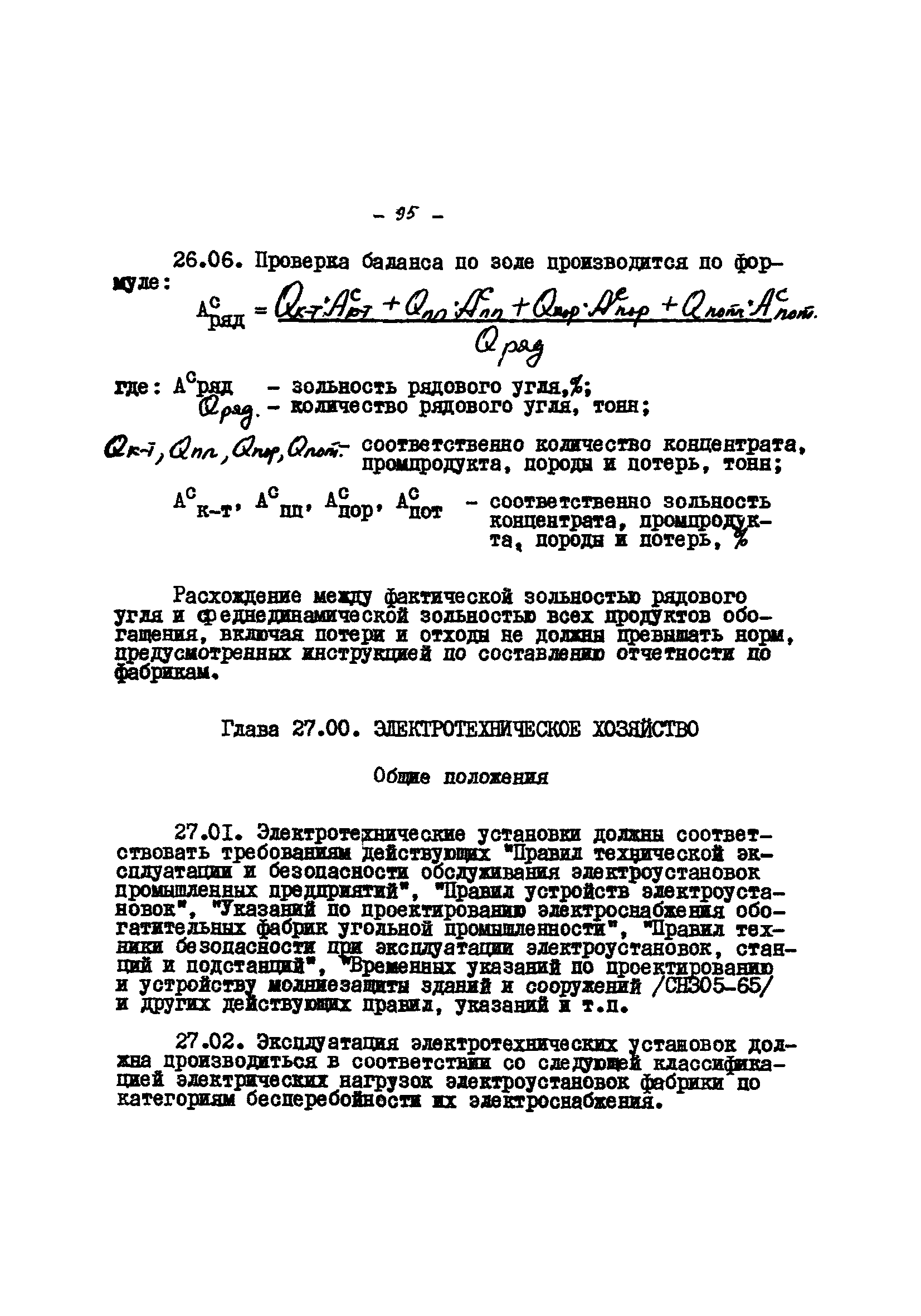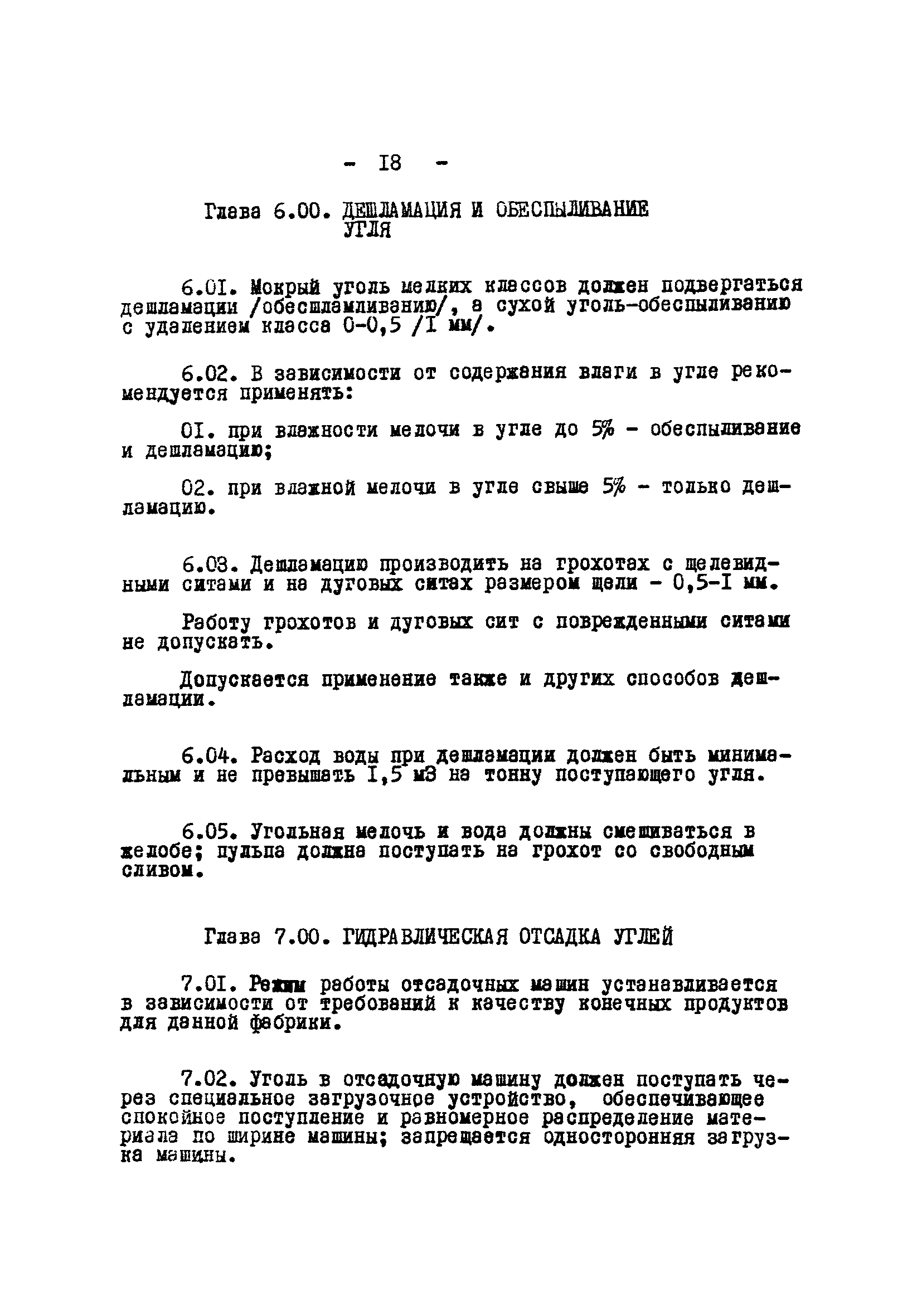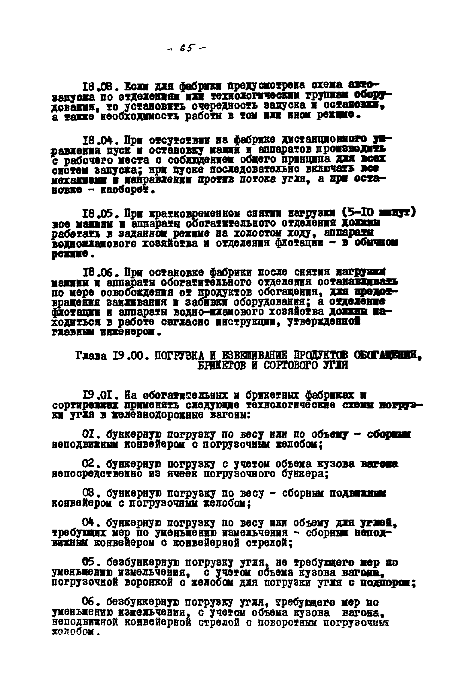 Временные правила технической эксплуатации углеобогатительных, брикетных фабрик и сортировок| Статус: | справочные материалы, мп, тпр | | Название рус.: | Временные правила технической эксплуатации углеобогатительных, брикетных фабрик и сортировок | | Дата добавления в базу: | 01.01.2018 | | Дата актуализации: | 01.01.2021 | | Область применения: | Правила обязательны для выполнения всеми предприятиями и организациями Министерства угольной промышленности СССР. | | Оглавление: | 1 Общие положения 2 Качество углей Общие положения Приемка углей 3 Разгрузка рядовых углей и утяжелителей 4 Дозировка и смешение углей 5 Дробление, грохочение и удаление из угля посторонних предметов Дробление угля Грохочение угля Удаление посторонних предметов 6 Дешламация и обемпыливание угля 7 Гидравлическая отсадка углей 8 Обогащение в тяжелых водно-минеральных суспензиях 9 Обогащение в моечных желобах 10 Пневматическое обогащение 11 Флотация угольной пыли и шламов 12 Обезвоживание 13 Водно-плановое хозяйство 14 Подготовка и сушка угля перед брикетированием 15 Прием и присадка связующих веществ 16 Прессование углей 17 Сушка угля Сушка в газовых барабанных и трубах—сушилках Слоевые топки Пылеугольные топки Шлак золоудаление Паровые трубчатые барабанные сушилки 18 Пуск и остановка оборудования фабрики 19 Погрузка и взвешивание продуктов обогащения, брикетов и сортового угля 20 Хранение угля и продуктов его переработки 21 Отвальное хозяйство Обычные отвалы Гидроотвалы 22 Внутрифабричный транспорт Подвесные канатные дороги Грузоподъемные краны Лифты 23 Водоснабжение и канализация Хозяйственно-питьевое водоснабжение Техническое и противопожарное водоснабжение Канализация 24 Технический контроль 25 Контроль технологического процесса 26 Качественно-количественный баланс 27 Электротехническое хозяйство Общие положения Электроснабжение Распределение электрической энергии Электрооборудование Крановое электрооборудование Автоматика и релейная защита Электроизмерительные приборы Заземление Надзор и контроль 28 Диспетчерская служба 29 Производственная сигнализация 30 Телефонная, громкоговорящая и другие способы связи 31 Компрессорные установки 32 Ремонтная служба 33 Пылеулавливание. Промышленная санитария и гигиена Гидрообеспыливание Уборка помещений Промышленная вентиляция Отопление 34 Санитарно-технические и бытовые службы 35 Первая медицинская помощь 36 Эксплуатация зданий и сооружений 37 Учет продукции 38 Производственный и технологический режим работы фабрик и сортировок 39 Техническое нормирование 40 Организация социалистического соревнования 41 Инструктаж рабочих 42 Управление фабрикой 43 Паспорт фабрики (паспортизация зданий, сооружений, оборудования и средств автоматизации) 44 Производственные инструкции, техника безопасности и противопожарные мероприятия Производственные инструкции Техника безопасности Противопожарные мероприятия 45 Ответственность за нарушение правил технической эксплуатации | | Разработан: | Центрогипрошахт