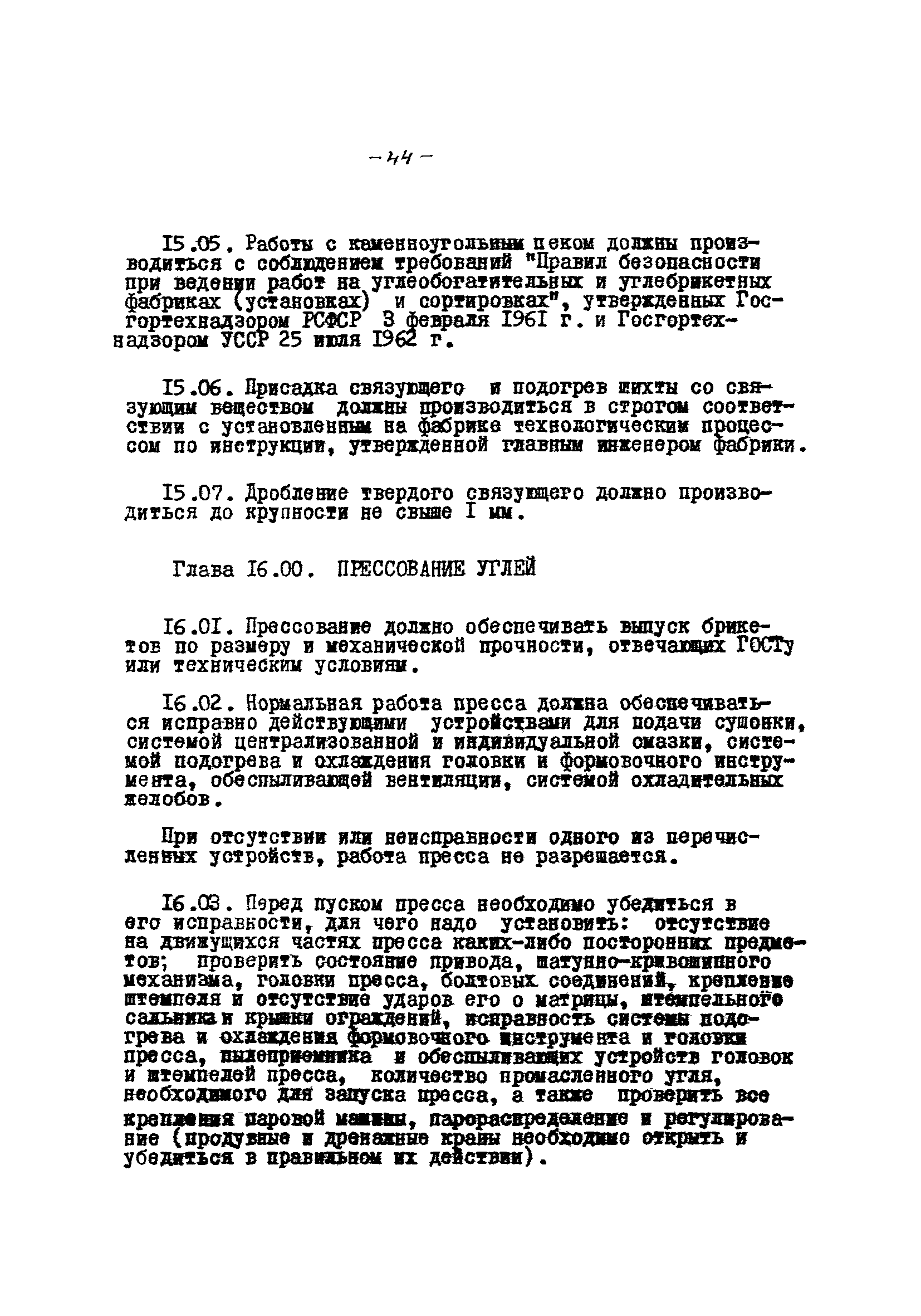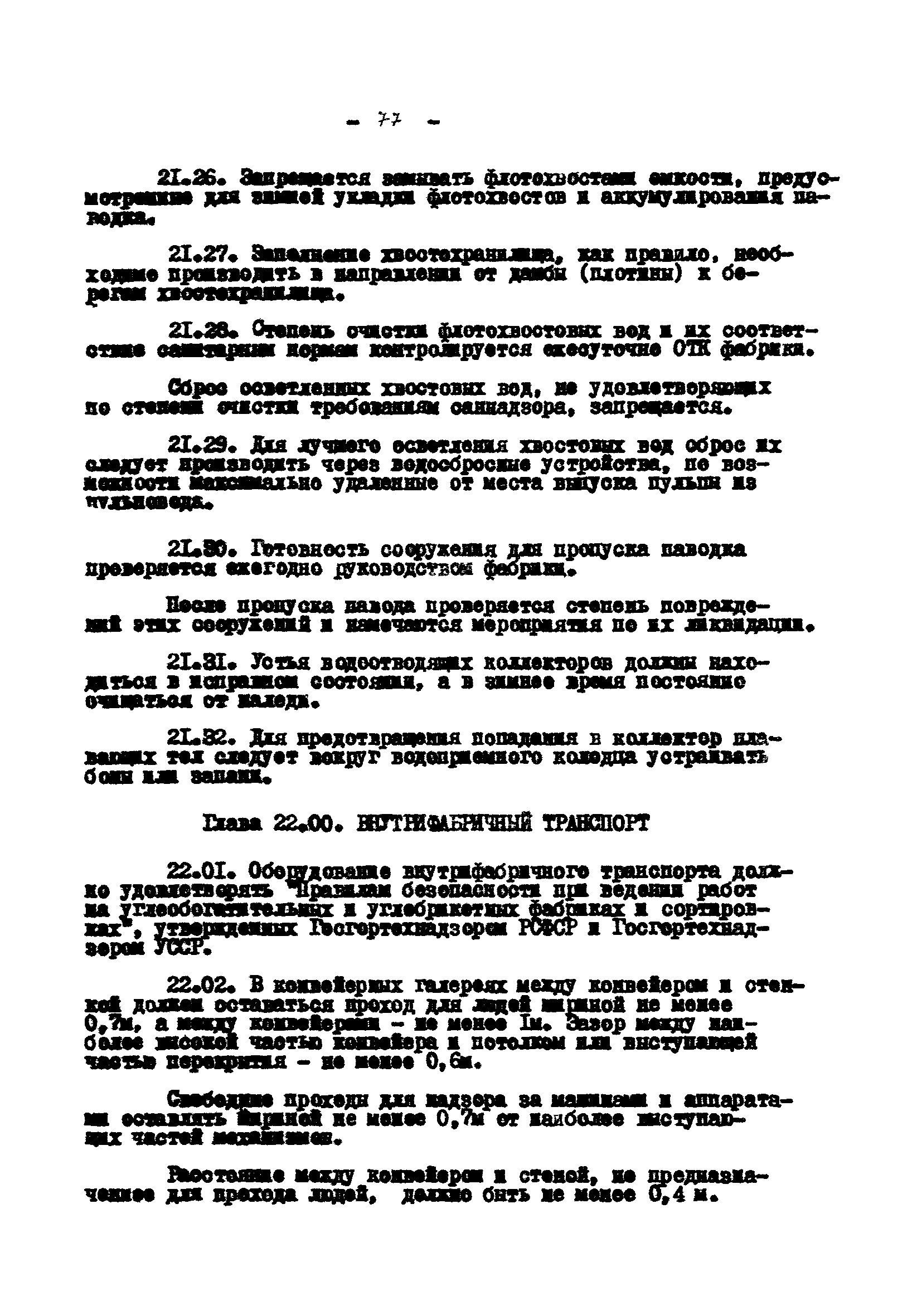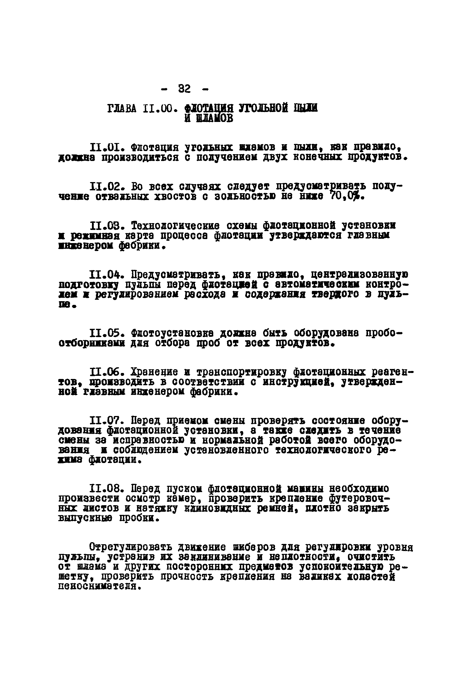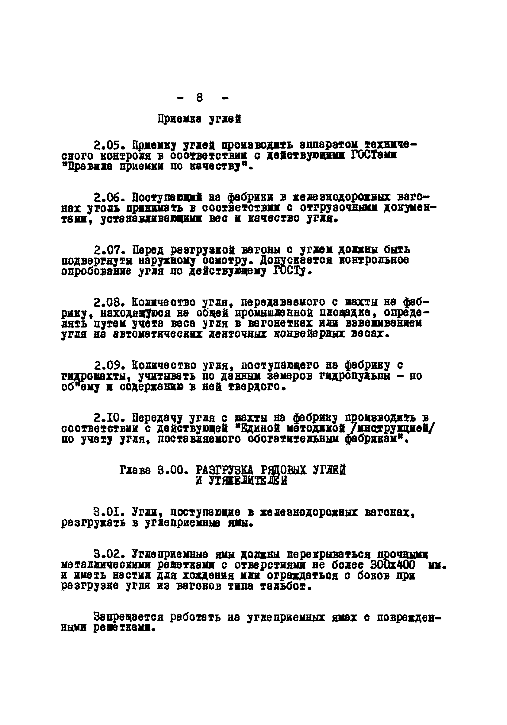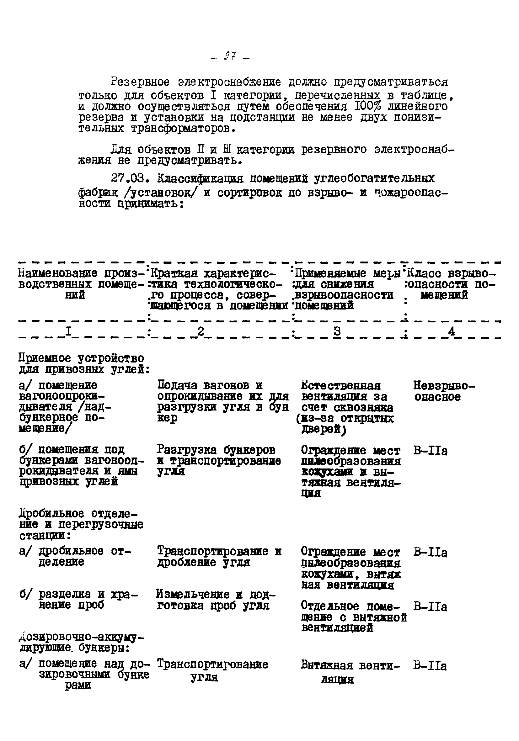 Временные правила технической эксплуатации углеобогатительных, брикетных фабрик и сортировок| Статус: | справочные материалы, мп, тпр | | Название рус.: | Временные правила технической эксплуатации углеобогатительных, брикетных фабрик и сортировок | | Дата добавления в базу: | 01.01.2018 | | Дата актуализации: | 01.01.2021 | | Область применения: | Правила обязательны для выполнения всеми предприятиями и организациями Министерства угольной промышленности СССР. | | Оглавление: | 1 Общие положения 2 Качество углей Общие положения Приемка углей 3 Разгрузка рядовых углей и утяжелителей 4 Дозировка и смешение углей 5 Дробление, грохочение и удаление из угля посторонних предметов Дробление угля Грохочение угля Удаление посторонних предметов 6 Дешламация и обемпыливание угля 7 Гидравлическая отсадка углей 8 Обогащение в тяжелых водно-минеральных суспензиях 9 Обогащение в моечных желобах 10 Пневматическое обогащение 11 Флотация угольной пыли и шламов 12 Обезвоживание 13 Водно-плановое хозяйство 14 Подготовка и сушка угля перед брикетированием 15 Прием и присадка связующих веществ 16 Прессование углей 17 Сушка угля Сушка в газовых барабанных и трубах—сушилках Слоевые топки Пылеугольные топки Шлак золоудаление Паровые трубчатые барабанные сушилки 18 Пуск и остановка оборудования фабрики 19 Погрузка и взвешивание продуктов обогащения, брикетов и сортового угля 20 Хранение угля и продуктов его переработки 21 Отвальное хозяйство Обычные отвалы Гидроотвалы 22 Внутрифабричный транспорт Подвесные канатные дороги Грузоподъемные краны Лифты 23 Водоснабжение и канализация Хозяйственно-питьевое водоснабжение Техническое и противопожарное водоснабжение Канализация 24 Технический контроль 25 Контроль технологического процесса 26 Качественно-количественный баланс 27 Электротехническое хозяйство Общие положения Электроснабжение Распределение электрической энергии Электрооборудование Крановое электрооборудование Автоматика и релейная защита Электроизмерительные приборы Заземление Надзор и контроль 28 Диспетчерская служба 29 Производственная сигнализация 30 Телефонная, громкоговорящая и другие способы связи 31 Компрессорные установки 32 Ремонтная служба 33 Пылеулавливание. Промышленная санитария и гигиена Гидрообеспыливание Уборка помещений Промышленная вентиляция Отопление 34 Санитарно-технические и бытовые службы 35 Первая медицинская помощь 36 Эксплуатация зданий и сооружений 37 Учет продукции 38 Производственный и технологический режим работы фабрик и сортировок 39 Техническое нормирование 40 Организация социалистического соревнования 41 Инструктаж рабочих 42 Управление фабрикой 43 Паспорт фабрики (паспортизация зданий, сооружений, оборудования и средств автоматизации) 44 Производственные инструкции, техника безопасности и противопожарные мероприятия Производственные инструкции Техника безопасности Противопожарные мероприятия 45 Ответственность за нарушение правил технической эксплуатации | | Разработан: | Центрогипрошахт
