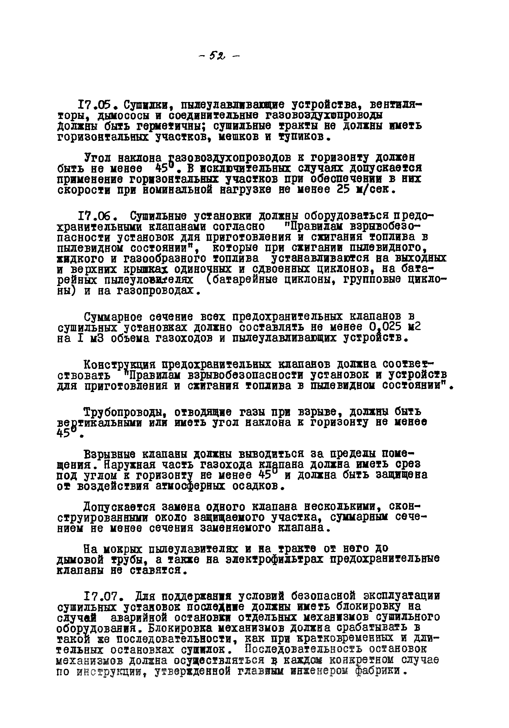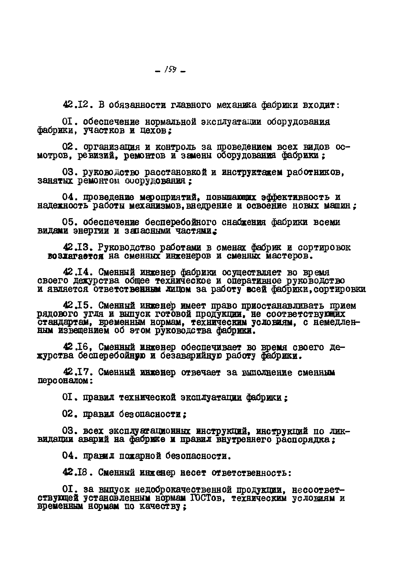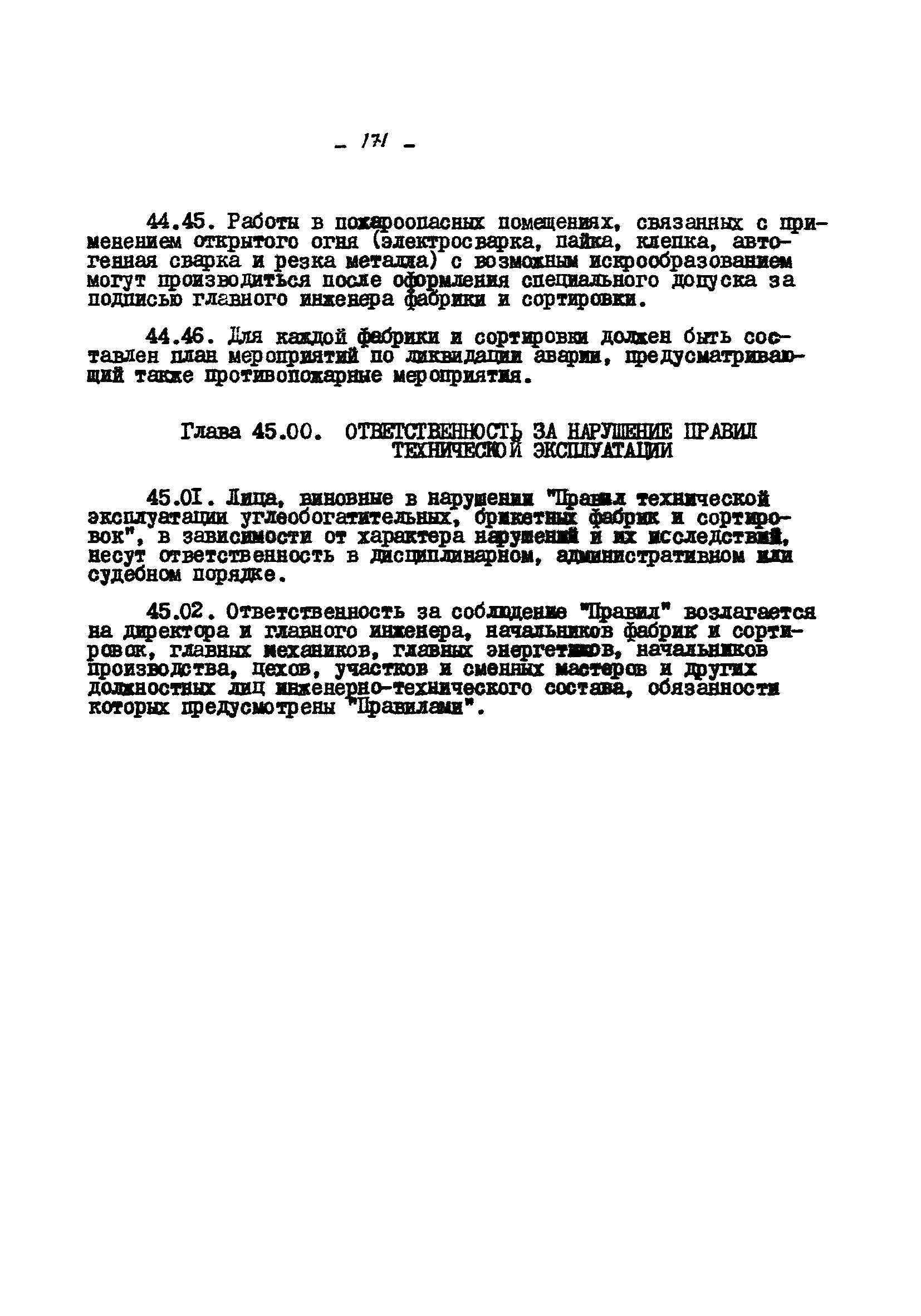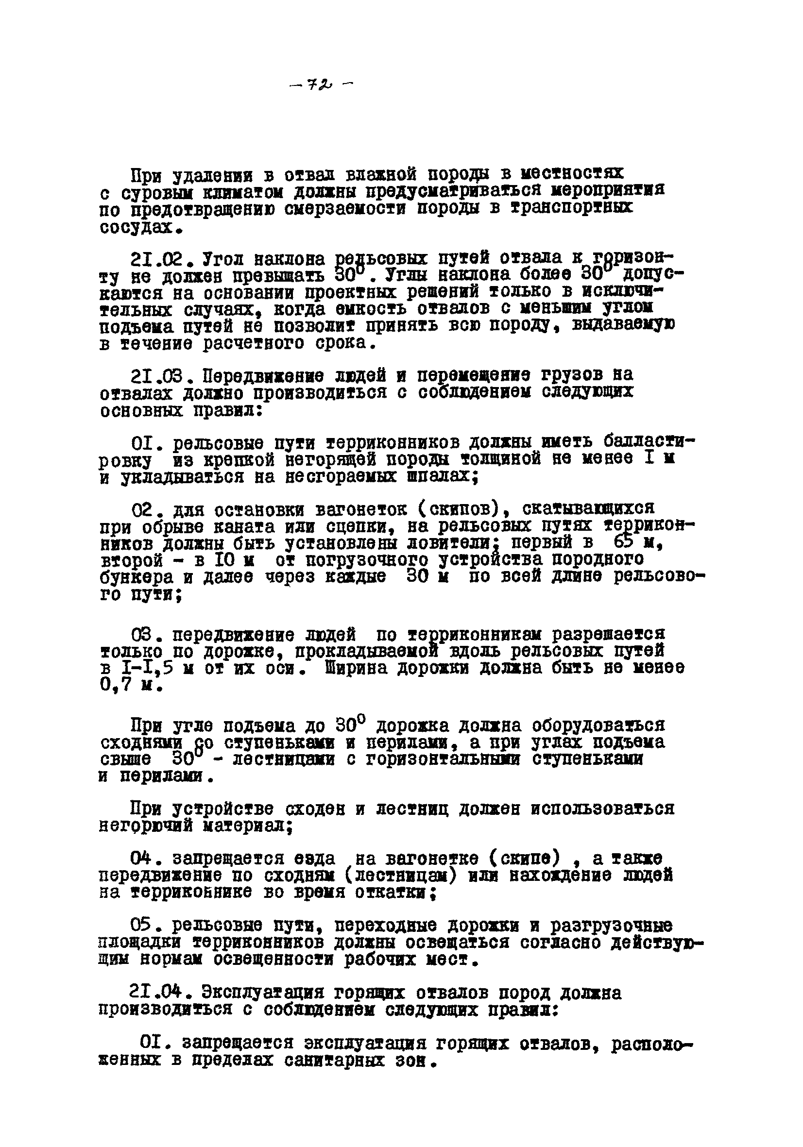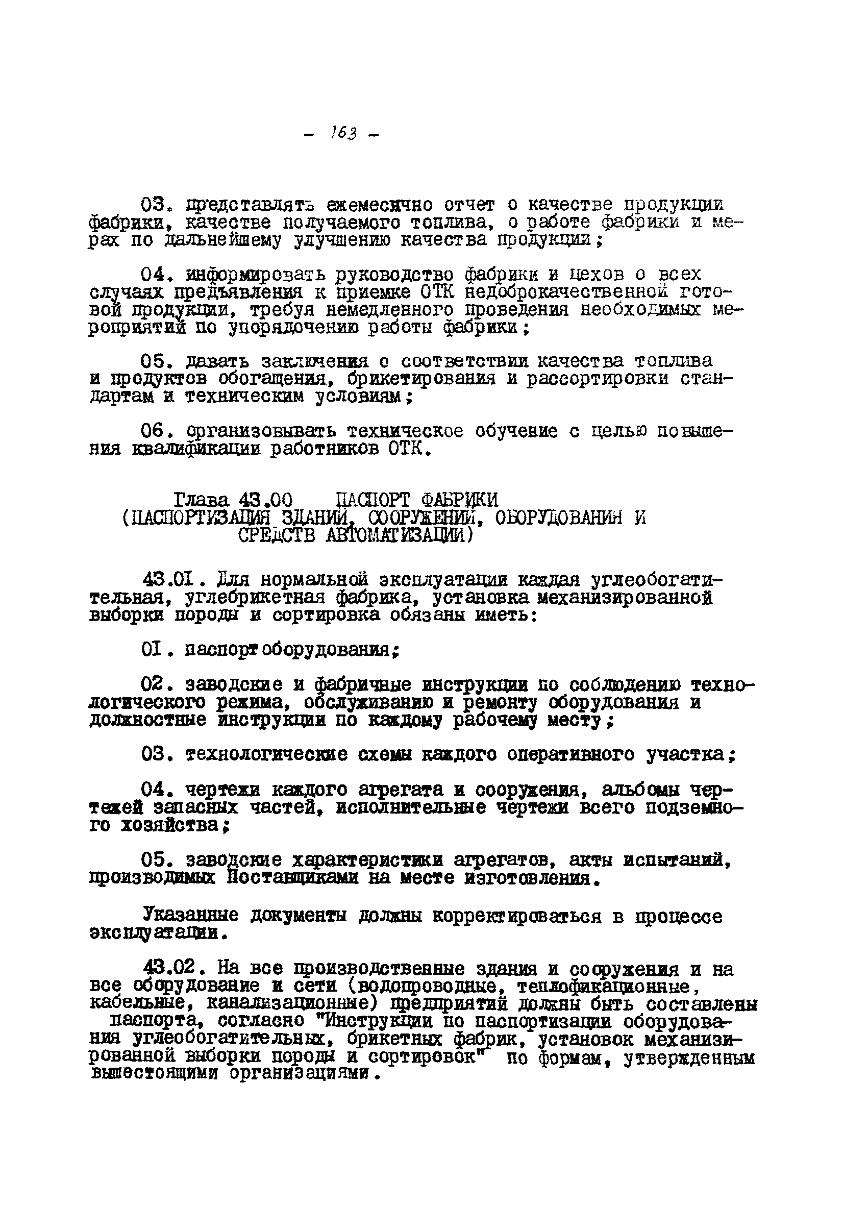Временные правила технической эксплуатации углеобогатительных, брикетных фабрик и сортировок| Статус: | справочные материалы, мп, тпр | | Название рус.: | Временные правила технической эксплуатации углеобогатительных, брикетных фабрик и сортировок | | Дата добавления в базу: | 01.01.2018 | | Дата актуализации: | 01.01.2021 | | Область применения: | Правила обязательны для выполнения всеми предприятиями и организациями Министерства угольной промышленности СССР. | | Оглавление: | 1 Общие положения 2 Качество углей Общие положения Приемка углей 3 Разгрузка рядовых углей и утяжелителей 4 Дозировка и смешение углей 5 Дробление, грохочение и удаление из угля посторонних предметов Дробление угля Грохочение угля Удаление посторонних предметов 6 Дешламация и обемпыливание угля 7 Гидравлическая отсадка углей 8 Обогащение в тяжелых водно-минеральных суспензиях 9 Обогащение в моечных желобах 10 Пневматическое обогащение 11 Флотация угольной пыли и шламов 12 Обезвоживание 13 Водно-плановое хозяйство 14 Подготовка и сушка угля перед брикетированием 15 Прием и присадка связующих веществ 16 Прессование углей 17 Сушка угля Сушка в газовых барабанных и трубах—сушилках Слоевые топки Пылеугольные топки Шлак золоудаление Паровые трубчатые барабанные сушилки 18 Пуск и остановка оборудования фабрики 19 Погрузка и взвешивание продуктов обогащения, брикетов и сортового угля 20 Хранение угля и продуктов его переработки 21 Отвальное хозяйство Обычные отвалы Гидроотвалы 22 Внутрифабричный транспорт Подвесные канатные дороги Грузоподъемные краны Лифты 23 Водоснабжение и канализация Хозяйственно-питьевое водоснабжение Техническое и противопожарное водоснабжение Канализация 24 Технический контроль 25 Контроль технологического процесса 26 Качественно-количественный баланс 27 Электротехническое хозяйство Общие положения Электроснабжение Распределение электрической энергии Электрооборудование Крановое электрооборудование Автоматика и релейная защита Электроизмерительные приборы Заземление Надзор и контроль 28 Диспетчерская служба 29 Производственная сигнализация 30 Телефонная, громкоговорящая и другие способы связи 31 Компрессорные установки 32 Ремонтная служба 33 Пылеулавливание. Промышленная санитария и гигиена Гидрообеспыливание Уборка помещений Промышленная вентиляция Отопление 34 Санитарно-технические и бытовые службы 35 Первая медицинская помощь 36 Эксплуатация зданий и сооружений 37 Учет продукции 38 Производственный и технологический режим работы фабрик и сортировок 39 Техническое нормирование 40 Организация социалистического соревнования 41 Инструктаж рабочих 42 Управление фабрикой 43 Паспорт фабрики (паспортизация зданий, сооружений, оборудования и средств автоматизации) 44 Производственные инструкции, техника безопасности и противопожарные мероприятия Производственные инструкции Техника безопасности Противопожарные мероприятия 45 Ответственность за нарушение правил технической эксплуатации | | Разработан: | Центрогипрошахт
