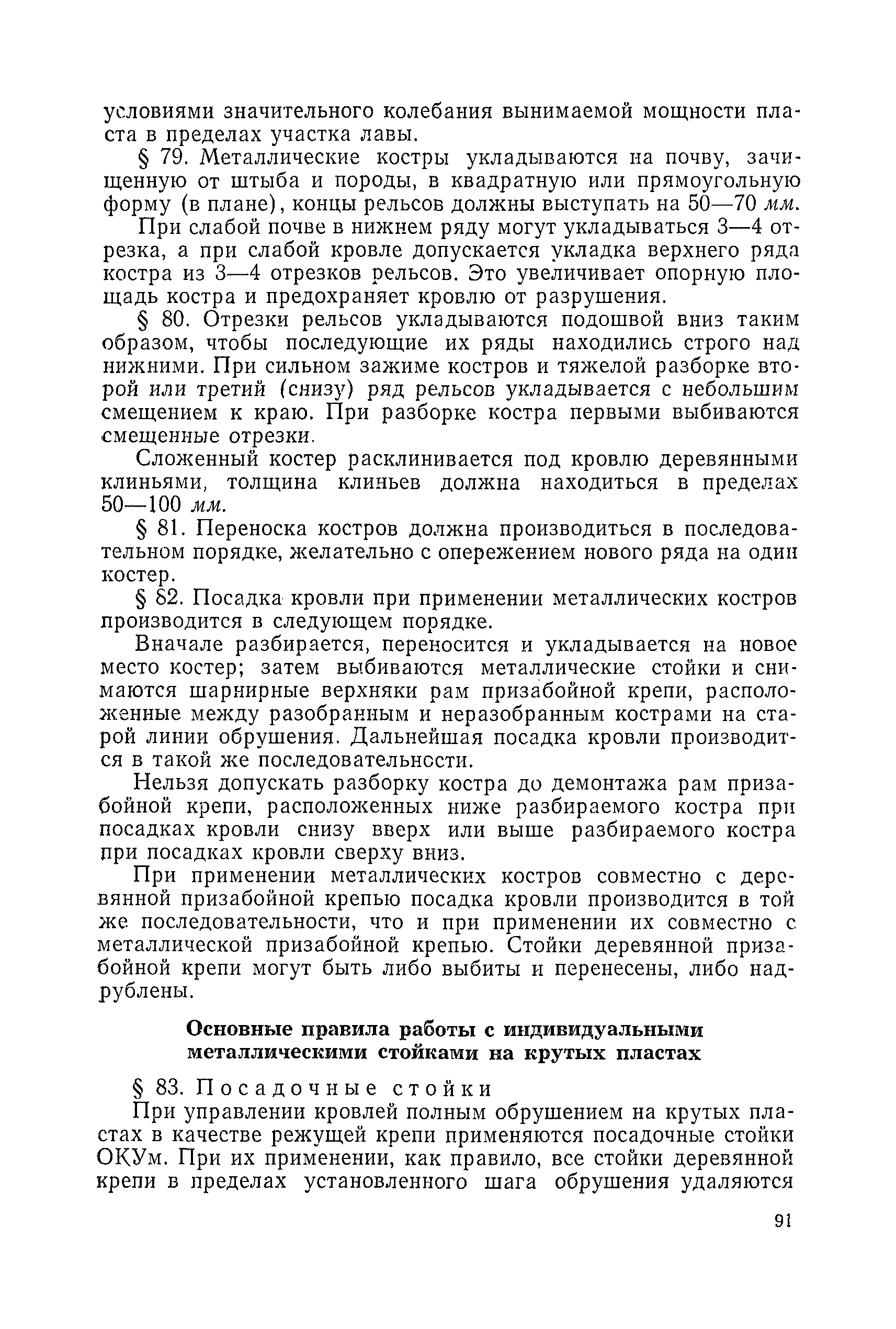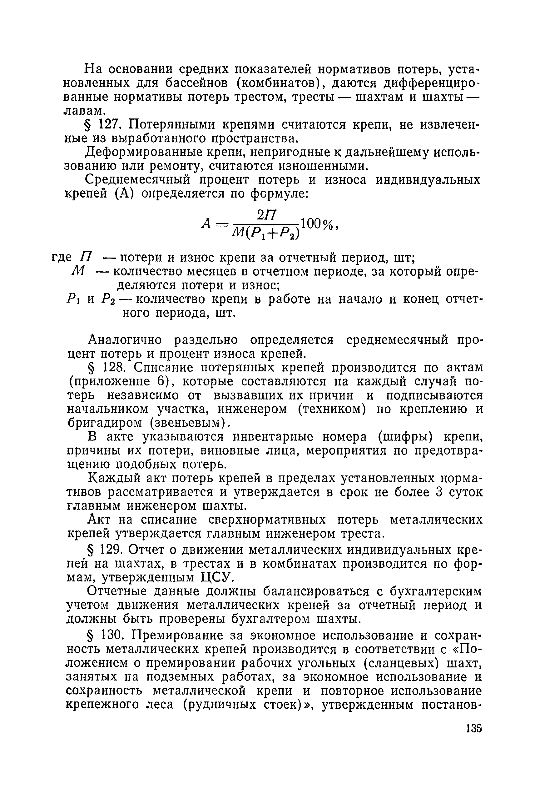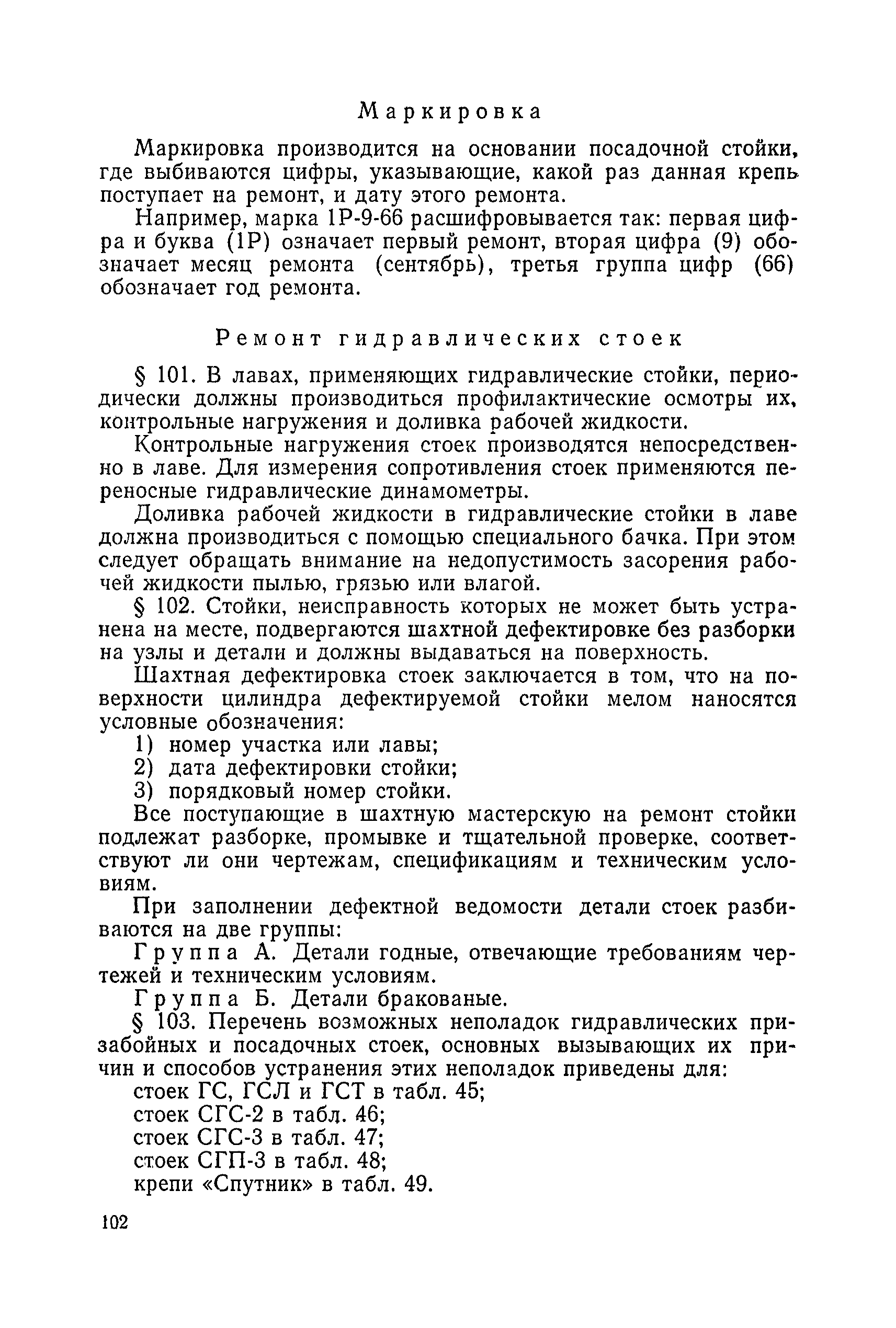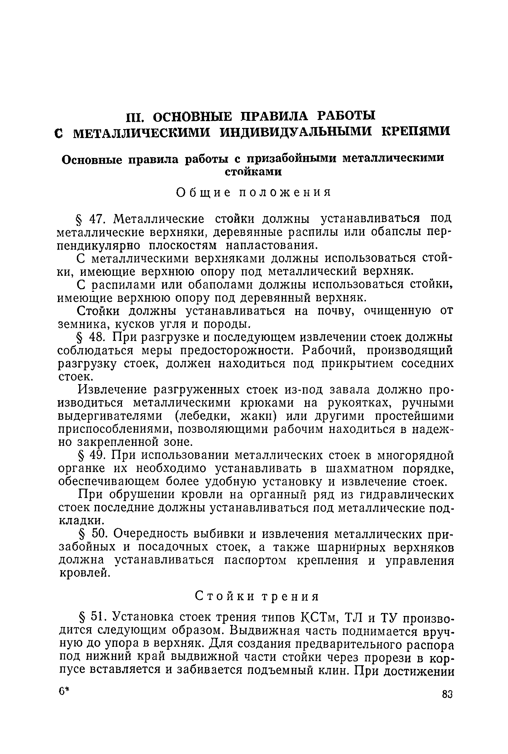 Единая инструкция по эксплуатации, ремонту и учету металлических индивидуальных крепей, применяемых в очистных выработках угольных шахт| Статус: | справочные материалы, мп, тпр | | Название рус.: | Единая инструкция по эксплуатации, ремонту и учету металлических индивидуальных крепей, применяемых в очистных выработках угольных шахт | | Дата добавления в базу: | 01.01.2018 | | Дата актуализации: | 01.01.2021 | | Область применения: | Инструкция ставит своей целью дать необходимые практические указания по вопросам правильной эксплуатации, ремонта и учета металлических индивидуальных крепей как применяемых в настоящее время на шахтах угольной промышленности СССР, так и перспективных, предусмотренных к дальнейшему выпуску. Она предназначена для обязательного применения на шахтах, в трестах и комбинатах. | | Оглавление: | Введение 1 Особенности эксплуатации, принципы работы и конструкции металлических индивидуальных крепей Особенности эксплуатации металлических индивидуальных крепей Основные принципы работы и рабочие характеристики применяемых металлических индивидуальных крепей Конструкции металлических индивидуальных крепей Призабойные стойки трения Гидравлические призабойные стойки Металлические шарнирные верхняки Посадочные крепи II Выбор типоразмеров металлических индивидуальных крепей III Основные правила работы с металлическими индивидуальными крепями Основные правила работы с призабойными металлическими стойками Основные правила работы с металлическими шарнирными верхняками Основные правила работы с посадочными металлическими стойками Основные правила работы с металлическими кострами Основные правила работы с индивидуальными металлическими стойками на крутых пластах Подготовка металлических крепей к спуску и спуск их в шахту Хранение металлических крепей и запасных частей к ним IV Ремонт металлических индивидуальных крепей Ремонт металлических стоек трения и верхняков Нормы расхода запасных частей V Комплектность поставок индивидуальных крепей, запасных частей и инструмента. Оптовые цены индивидуальных крепей VI Порядок учета, погашения стоимости и списание потерь металлических индивидуальных крепей Приложение 1. Журнал еженедельного учета движения металлических крепей Приложение 2. Форма акта инвентаризации металлических крепей по участку, лаве Приложение 3. Сводная инвентаризационная ведомость металлических крепей Приложение 4. Журнал учета движения металлических крепей в шахтной мастерской Приложение 5. Форма акта выбраковки деформированных металлических крепей Приложение 6. Форма акта на списание потерянных металлических крепей | | Утверждён: | 18.04.1968 Министерство угольной промышленности СССР (USSR Ministry of the Coal Industry )