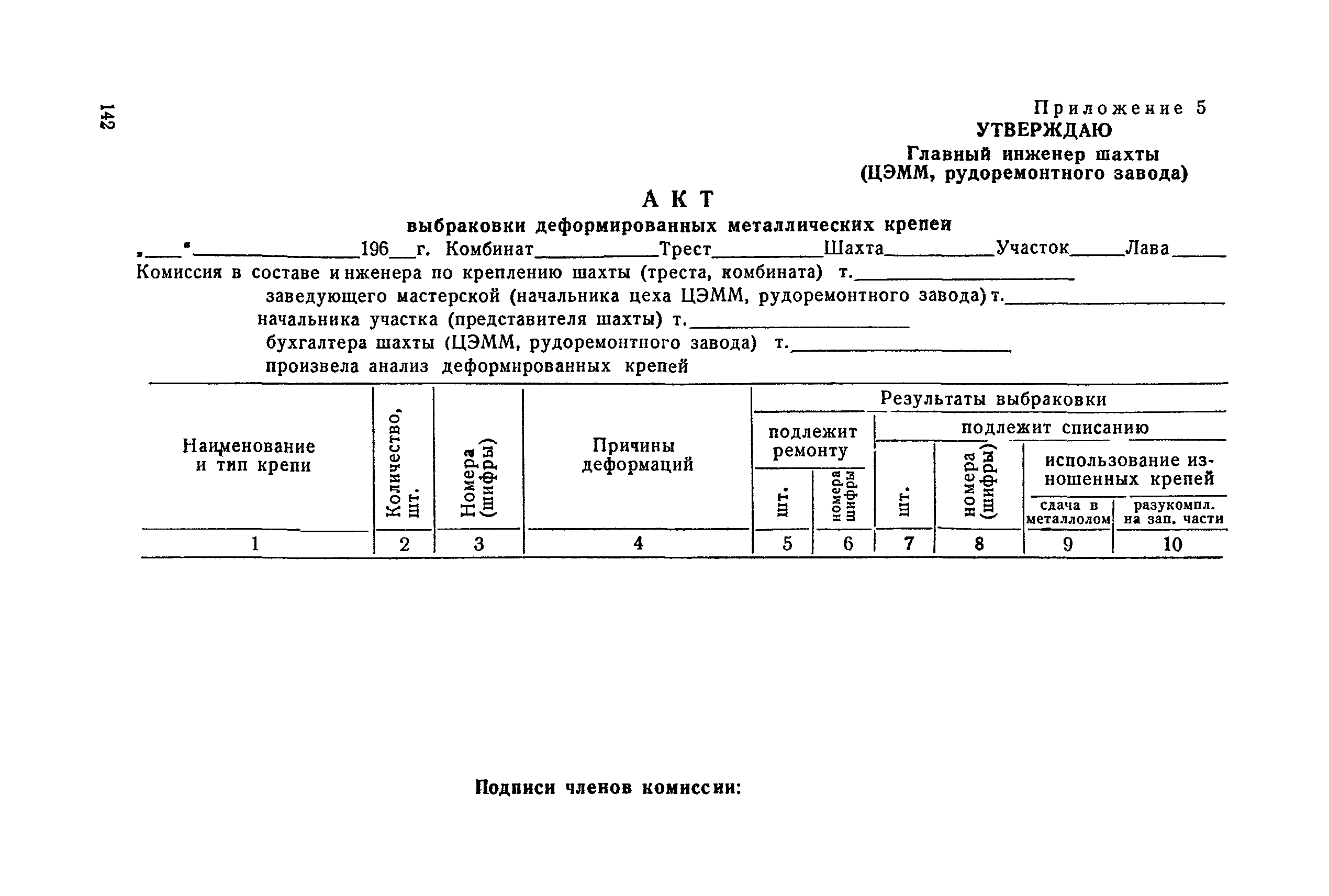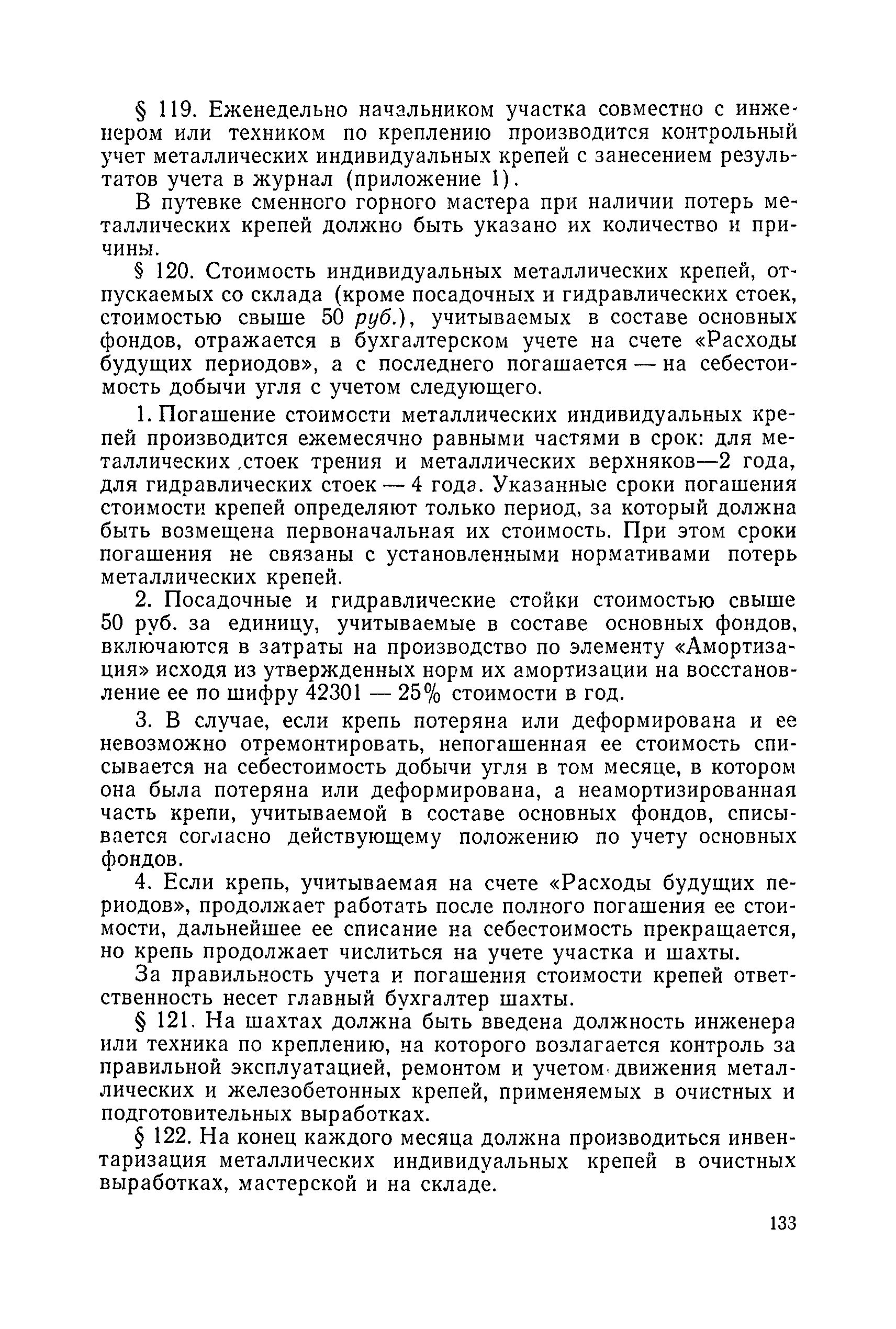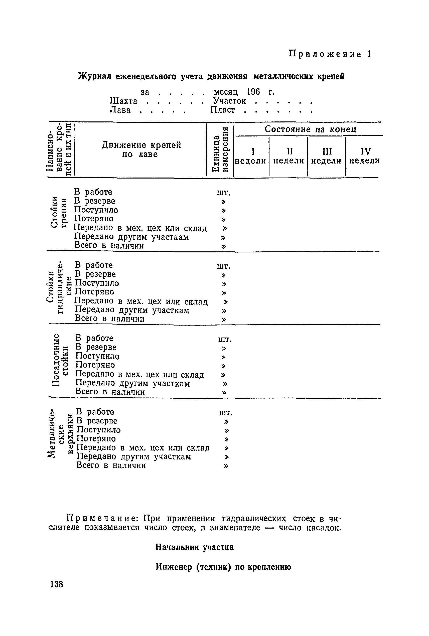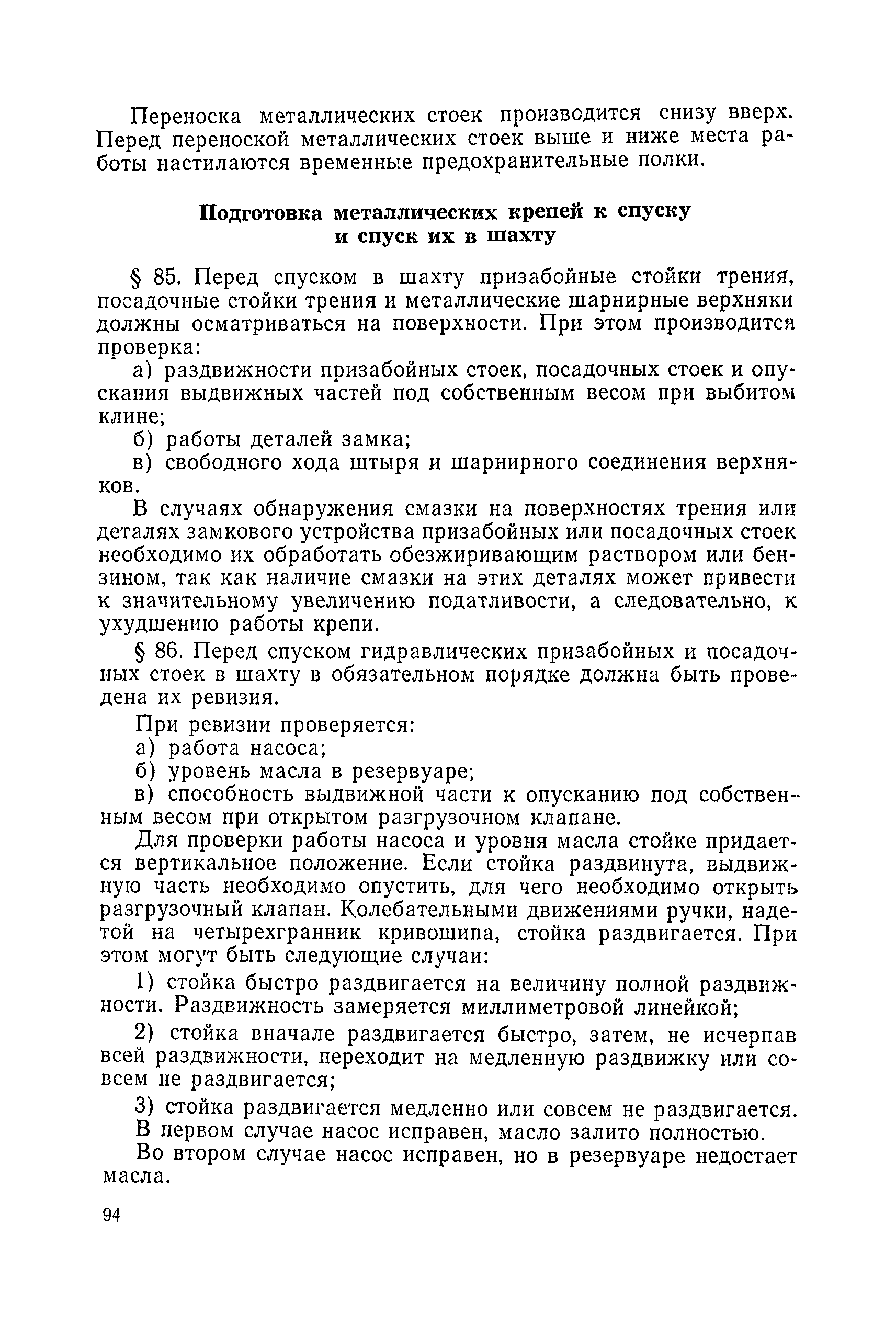 Единая инструкция по эксплуатации, ремонту и учету металлических индивидуальных крепей, применяемых в очистных выработках угольных шахт| Статус: | справочные материалы, мп, тпр | | Название рус.: | Единая инструкция по эксплуатации, ремонту и учету металлических индивидуальных крепей, применяемых в очистных выработках угольных шахт | | Дата добавления в базу: | 01.01.2018 | | Дата актуализации: | 01.01.2021 | | Область применения: | Инструкция ставит своей целью дать необходимые практические указания по вопросам правильной эксплуатации, ремонта и учета металлических индивидуальных крепей как применяемых в настоящее время на шахтах угольной промышленности СССР, так и перспективных, предусмотренных к дальнейшему выпуску. Она предназначена для обязательного применения на шахтах, в трестах и комбинатах. | | Оглавление: | Введение 1 Особенности эксплуатации, принципы работы и конструкции металлических индивидуальных крепей Особенности эксплуатации металлических индивидуальных крепей Основные принципы работы и рабочие характеристики применяемых металлических индивидуальных крепей Конструкции металлических индивидуальных крепей Призабойные стойки трения Гидравлические призабойные стойки Металлические шарнирные верхняки Посадочные крепи II Выбор типоразмеров металлических индивидуальных крепей III Основные правила работы с металлическими индивидуальными крепями Основные правила работы с призабойными металлическими стойками Основные правила работы с металлическими шарнирными верхняками Основные правила работы с посадочными металлическими стойками Основные правила работы с металлическими кострами Основные правила работы с индивидуальными металлическими стойками на крутых пластах Подготовка металлических крепей к спуску и спуск их в шахту Хранение металлических крепей и запасных частей к ним IV Ремонт металлических индивидуальных крепей Ремонт металлических стоек трения и верхняков Нормы расхода запасных частей V Комплектность поставок индивидуальных крепей, запасных частей и инструмента. Оптовые цены индивидуальных крепей VI Порядок учета, погашения стоимости и списание потерь металлических индивидуальных крепей Приложение 1. Журнал еженедельного учета движения металлических крепей Приложение 2. Форма акта инвентаризации металлических крепей по участку, лаве Приложение 3. Сводная инвентаризационная ведомость металлических крепей Приложение 4. Журнал учета движения металлических крепей в шахтной мастерской Приложение 5. Форма акта выбраковки деформированных металлических крепей Приложение 6. Форма акта на списание потерянных металлических крепей | | Утверждён: | 18.04.1968 Министерство угольной промышленности СССР (USSR Ministry of the Coal Industry )