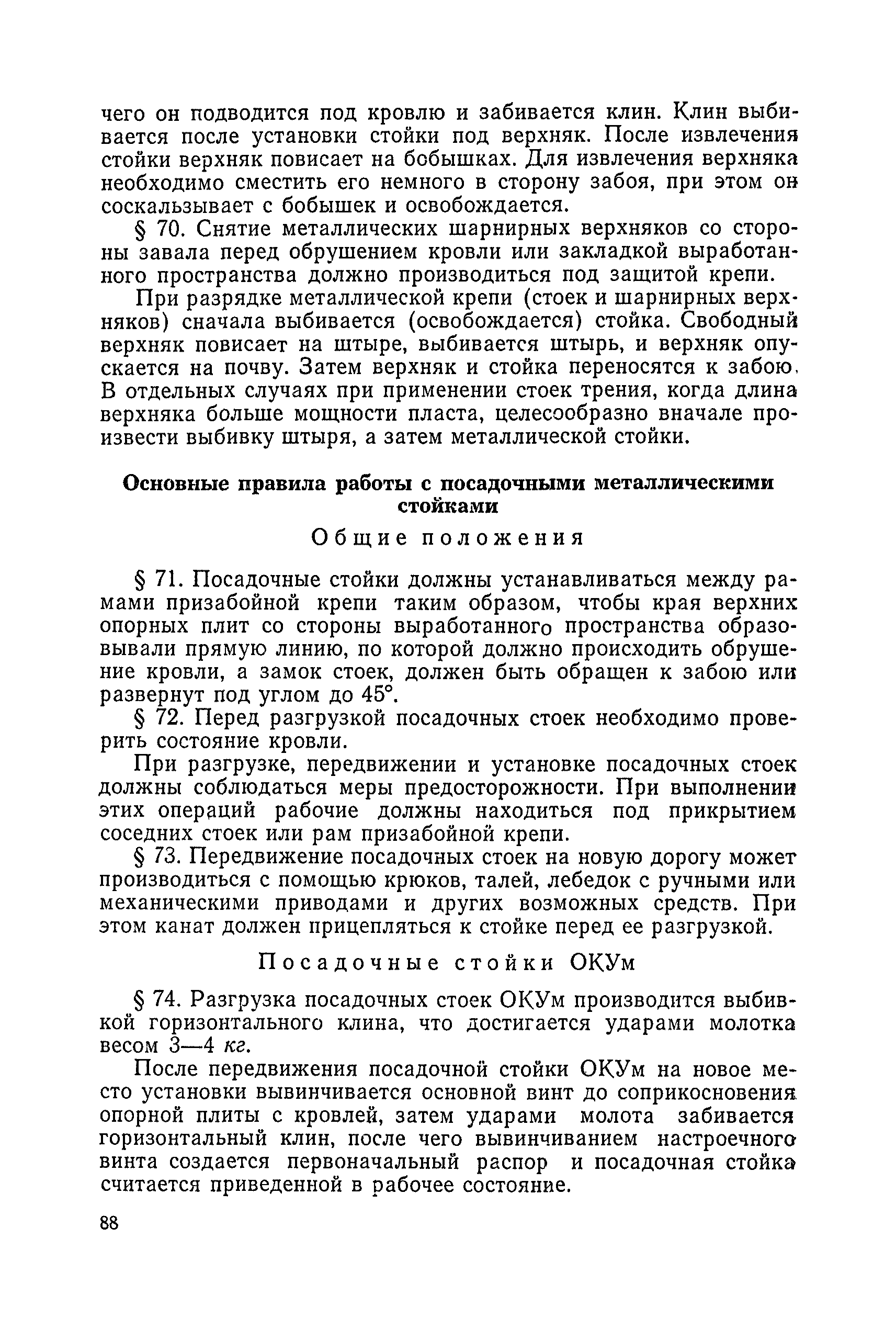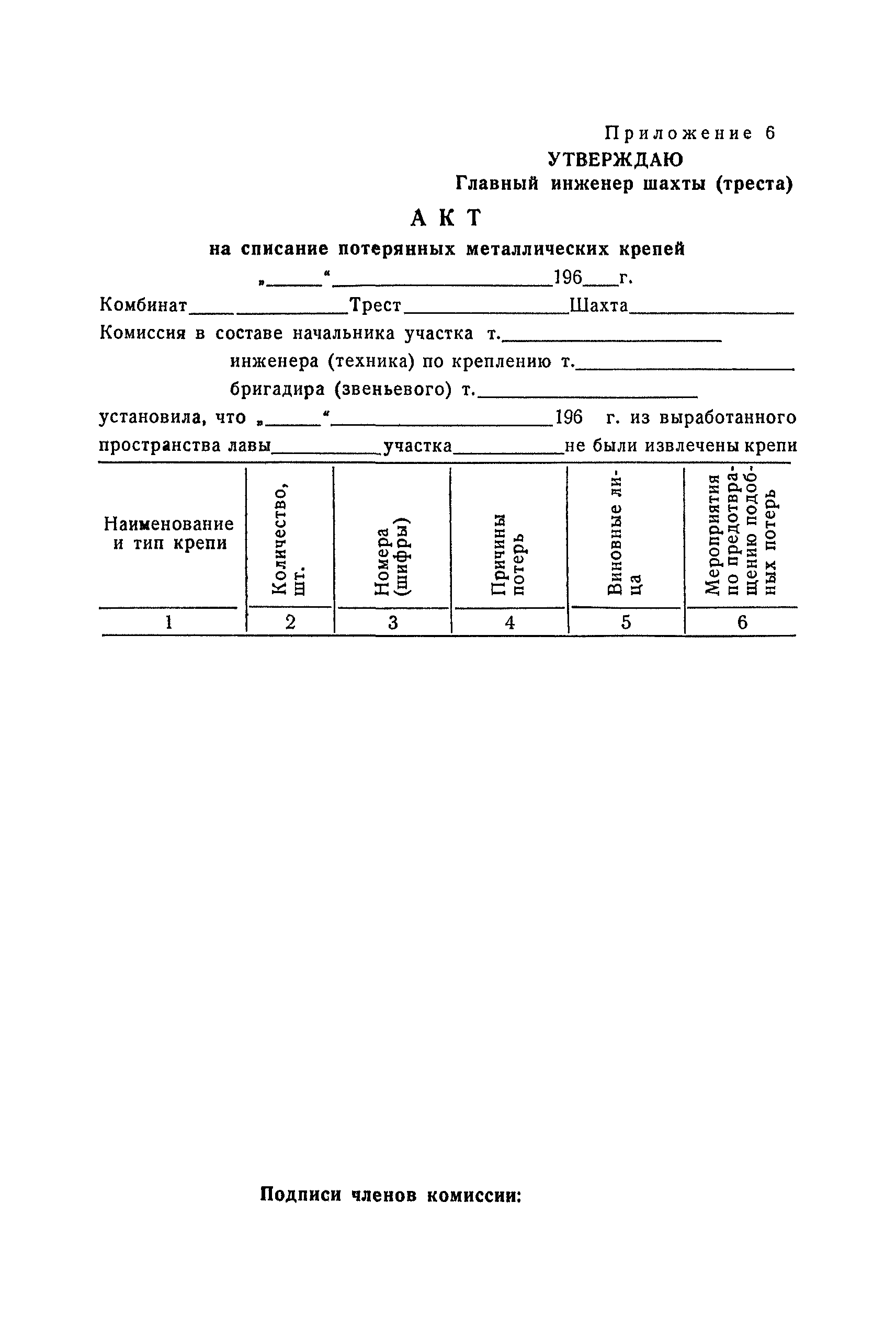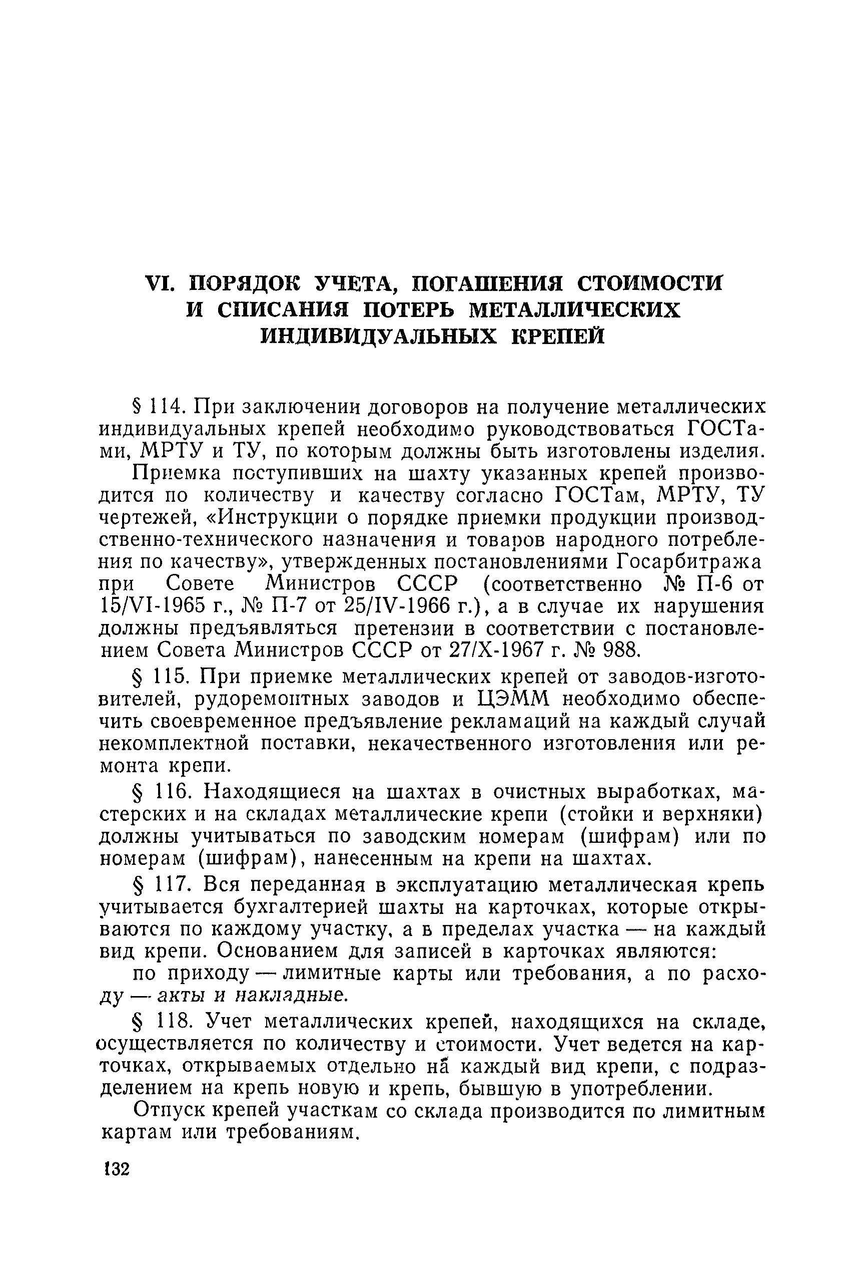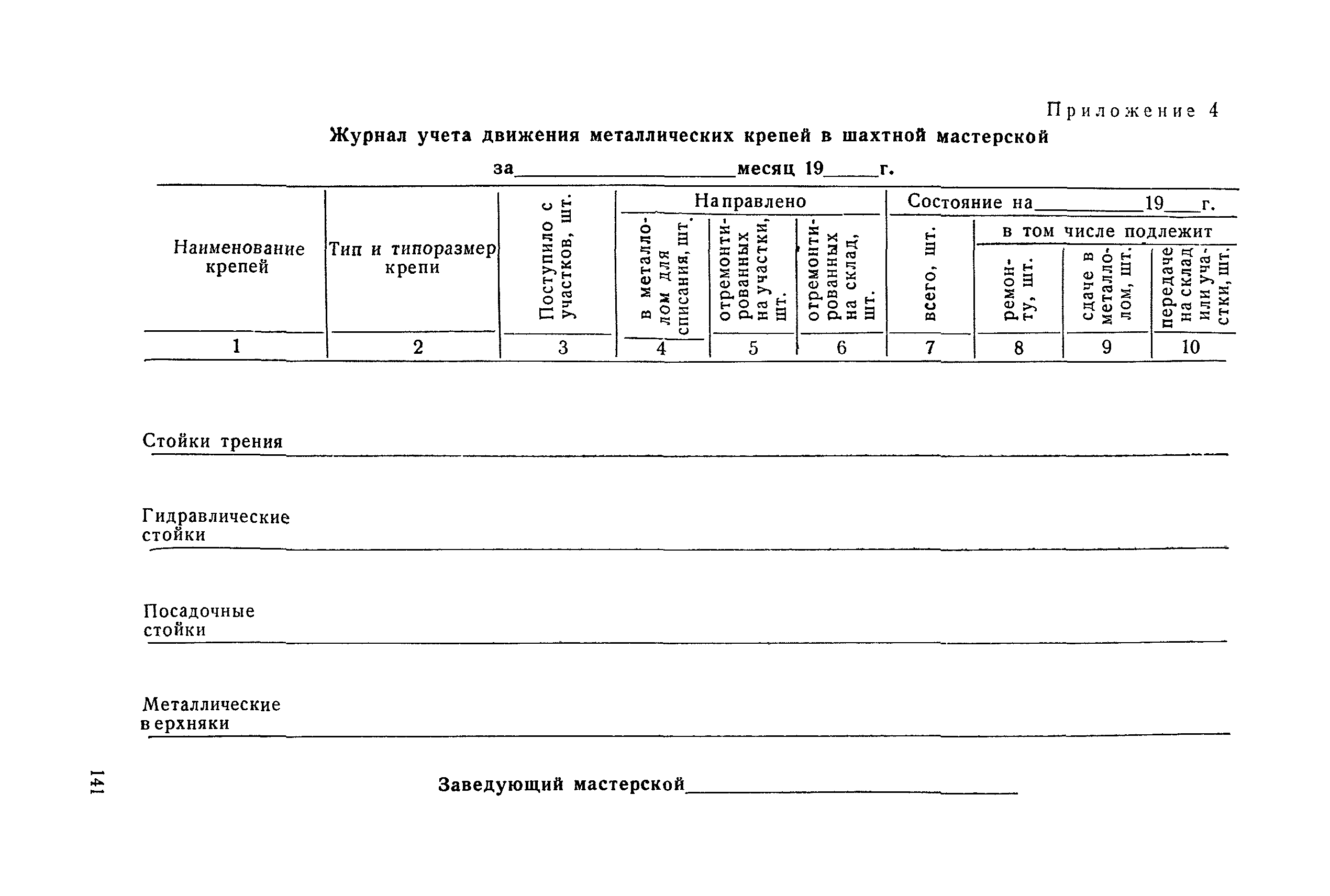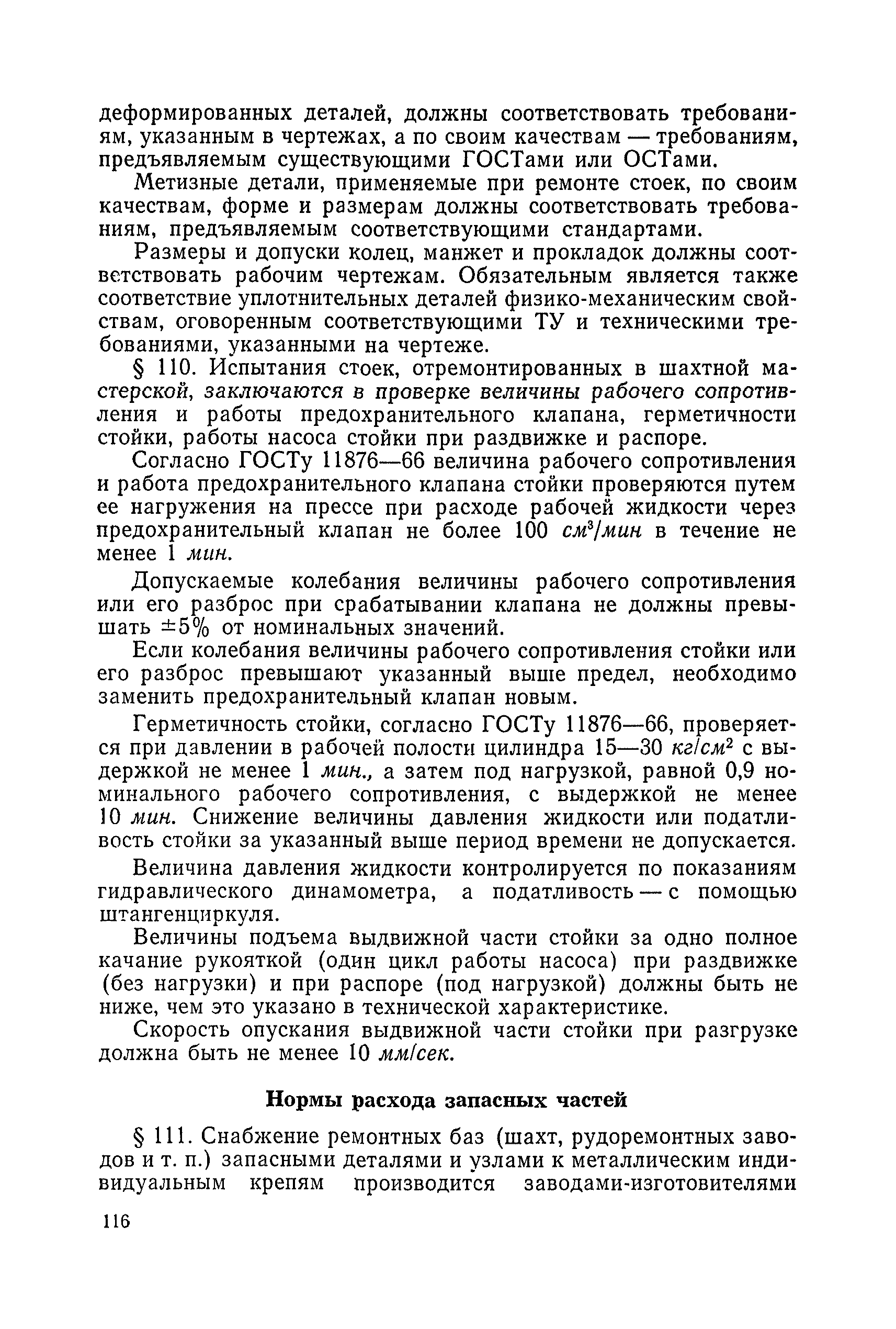 Единая инструкция по эксплуатации, ремонту и учету металлических индивидуальных крепей, применяемых в очистных выработках угольных шахт| Статус: | справочные материалы, мп, тпр | | Название рус.: | Единая инструкция по эксплуатации, ремонту и учету металлических индивидуальных крепей, применяемых в очистных выработках угольных шахт | | Дата добавления в базу: | 01.01.2018 | | Дата актуализации: | 01.01.2021 | | Область применения: | Инструкция ставит своей целью дать необходимые практические указания по вопросам правильной эксплуатации, ремонта и учета металлических индивидуальных крепей как применяемых в настоящее время на шахтах угольной промышленности СССР, так и перспективных, предусмотренных к дальнейшему выпуску. Она предназначена для обязательного применения на шахтах, в трестах и комбинатах. | | Оглавление: | Введение 1 Особенности эксплуатации, принципы работы и конструкции металлических индивидуальных крепей Особенности эксплуатации металлических индивидуальных крепей Основные принципы работы и рабочие характеристики применяемых металлических индивидуальных крепей Конструкции металлических индивидуальных крепей Призабойные стойки трения Гидравлические призабойные стойки Металлические шарнирные верхняки Посадочные крепи II Выбор типоразмеров металлических индивидуальных крепей III Основные правила работы с металлическими индивидуальными крепями Основные правила работы с призабойными металлическими стойками Основные правила работы с металлическими шарнирными верхняками Основные правила работы с посадочными металлическими стойками Основные правила работы с металлическими кострами Основные правила работы с индивидуальными металлическими стойками на крутых пластах Подготовка металлических крепей к спуску и спуск их в шахту Хранение металлических крепей и запасных частей к ним IV Ремонт металлических индивидуальных крепей Ремонт металлических стоек трения и верхняков Нормы расхода запасных частей V Комплектность поставок индивидуальных крепей, запасных частей и инструмента. Оптовые цены индивидуальных крепей VI Порядок учета, погашения стоимости и списание потерь металлических индивидуальных крепей Приложение 1. Журнал еженедельного учета движения металлических крепей Приложение 2. Форма акта инвентаризации металлических крепей по участку, лаве Приложение 3. Сводная инвентаризационная ведомость металлических крепей Приложение 4. Журнал учета движения металлических крепей в шахтной мастерской Приложение 5. Форма акта выбраковки деформированных металлических крепей Приложение 6. Форма акта на списание потерянных металлических крепей | | Утверждён: | 18.04.1968 Министерство угольной промышленности СССР (USSR Ministry of the Coal Industry )