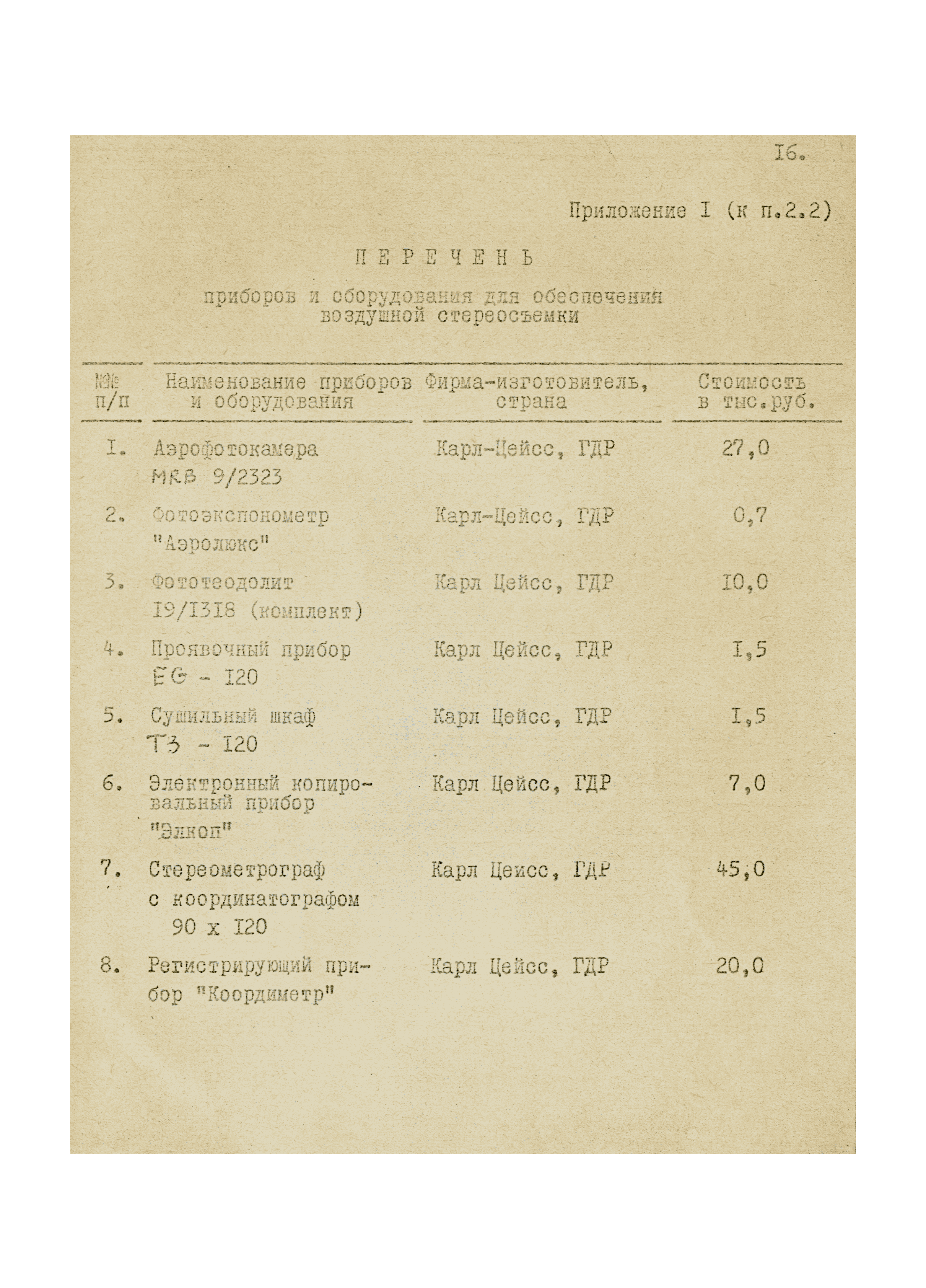 Приложение 1. Перечень приборов и оборудования для обеспечения воздушной стереосъемки