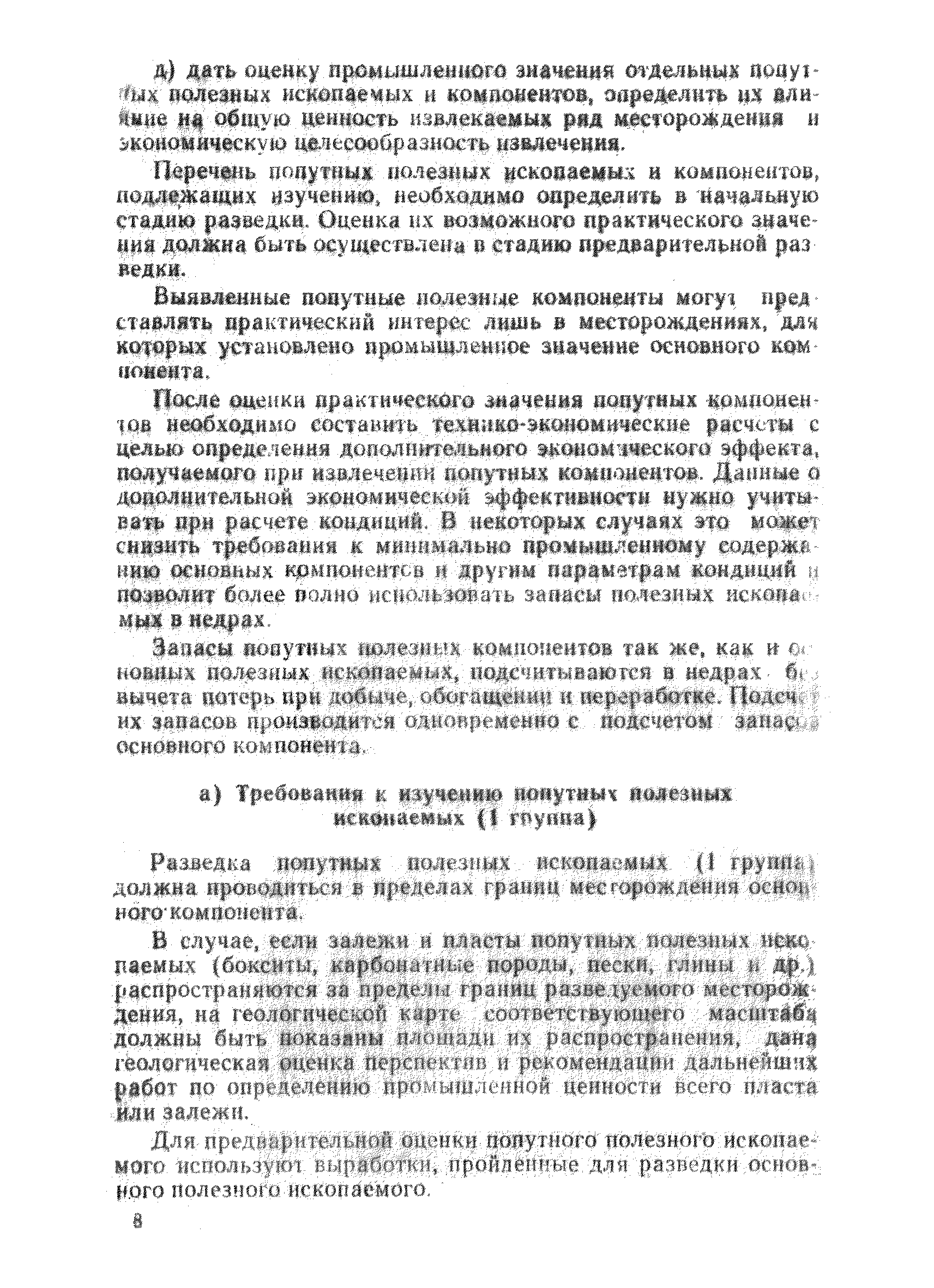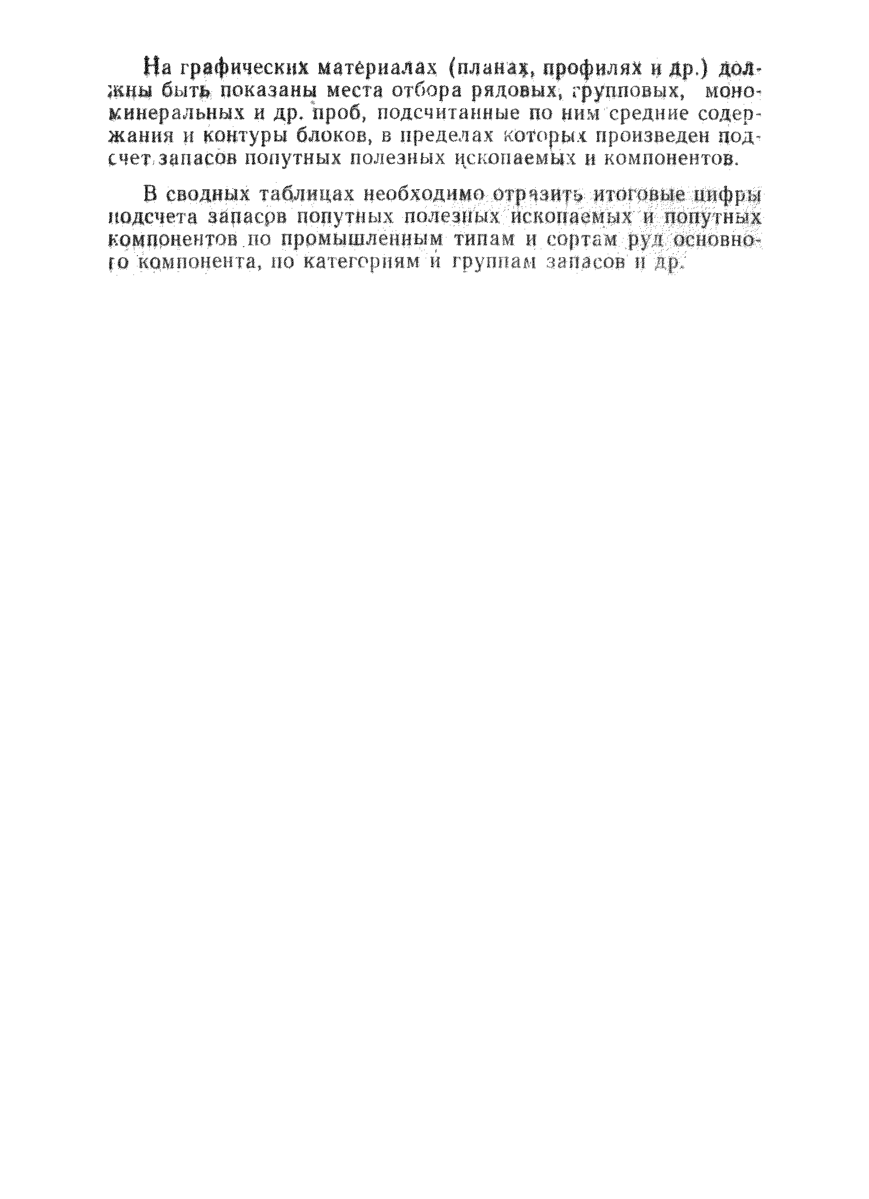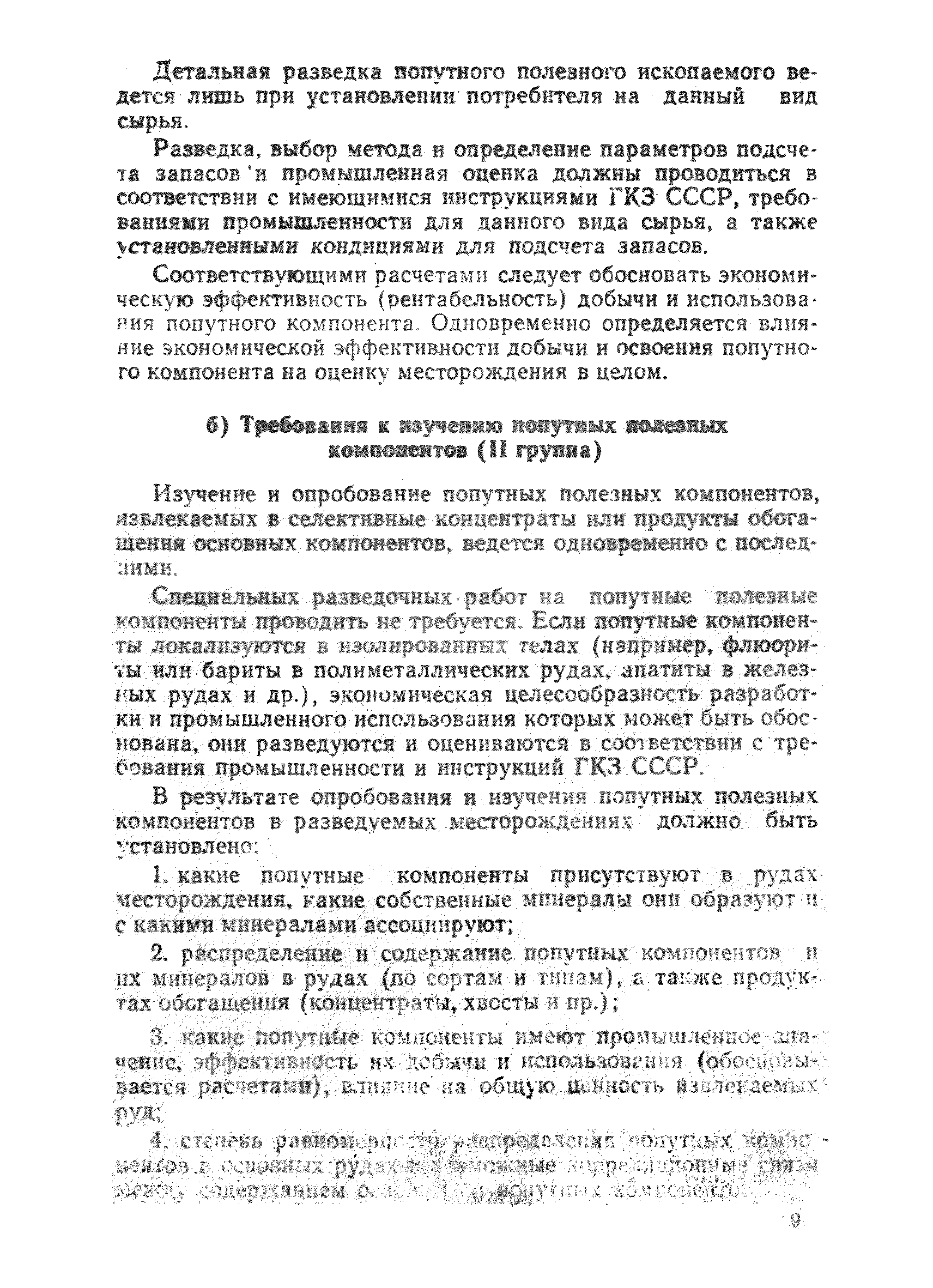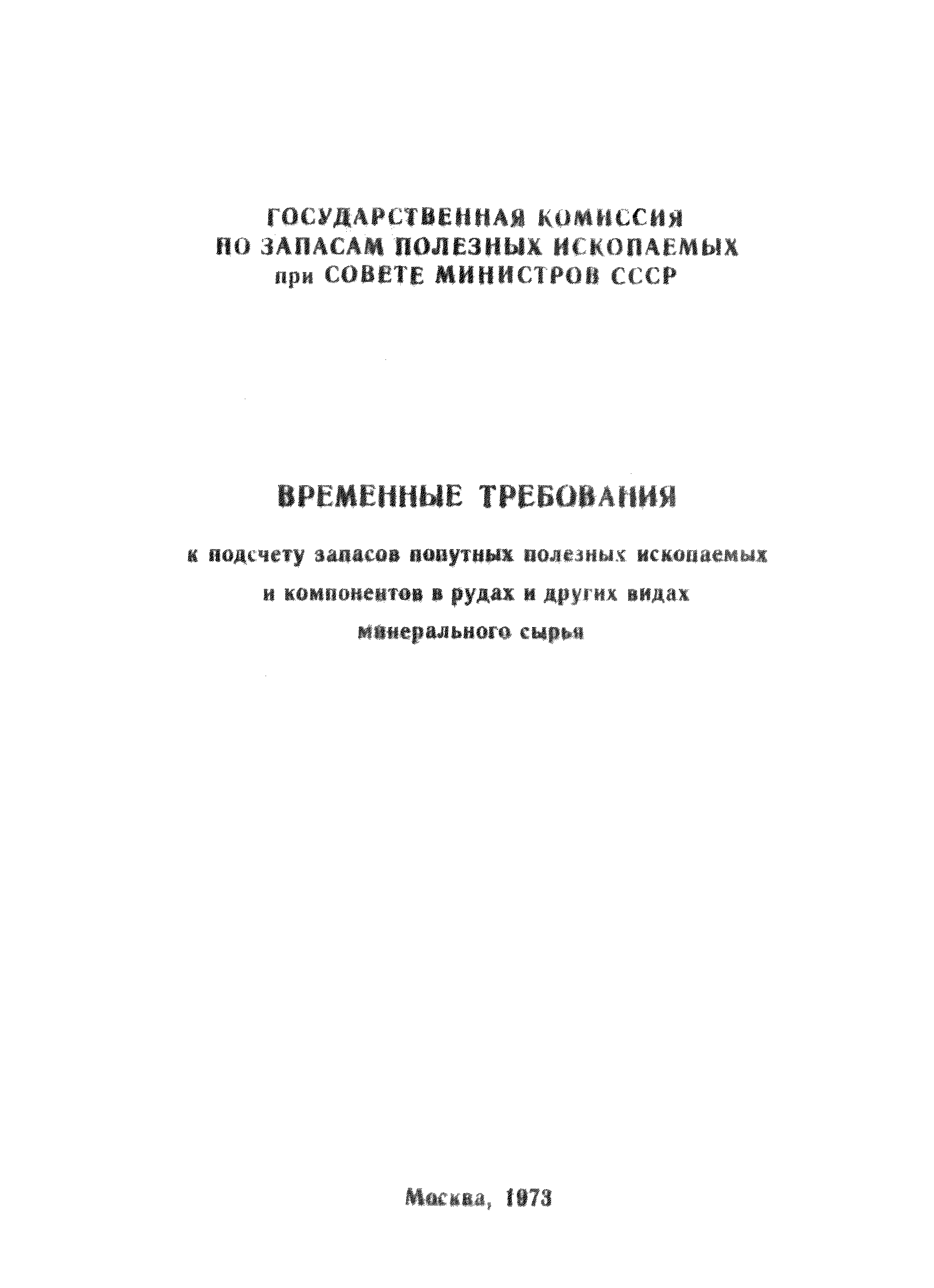 Временные требования к подсчету запасов попутных полезных ископаемых и компонентов в рудах и других видах минерального сырья| Статус: | не действует | | Название рус.: | Временные требования к подсчету запасов попутных полезных ископаемых и компонентов в рудах и других видах минерального сырья | | Дата добавления в базу: | 01.01.2018 | | Дата актуализации: | 01.01.2021 | | Оглавление: | Предисловие 1 Группировка попутных полезных компонентов I группа II группа III группа 2 Требования к изученности месторождений на попутные полезные компоненты и подсчету их запасов I группа II группа III группа 3 Определение подготовленности запасов попутных компонентов для промышленного освоения 4 Оформление материалов подсчета запасов попутных компонентов, представляемых на утверждение ГКЗ СССР 5 Приложение. Таблица предельно допустимых средних случайных погрешностей химических анализов проб на редкие и рассеянные элементы | | Утверждён: | 22.11.1973 ГКЗ СССР (USSR GKZ )