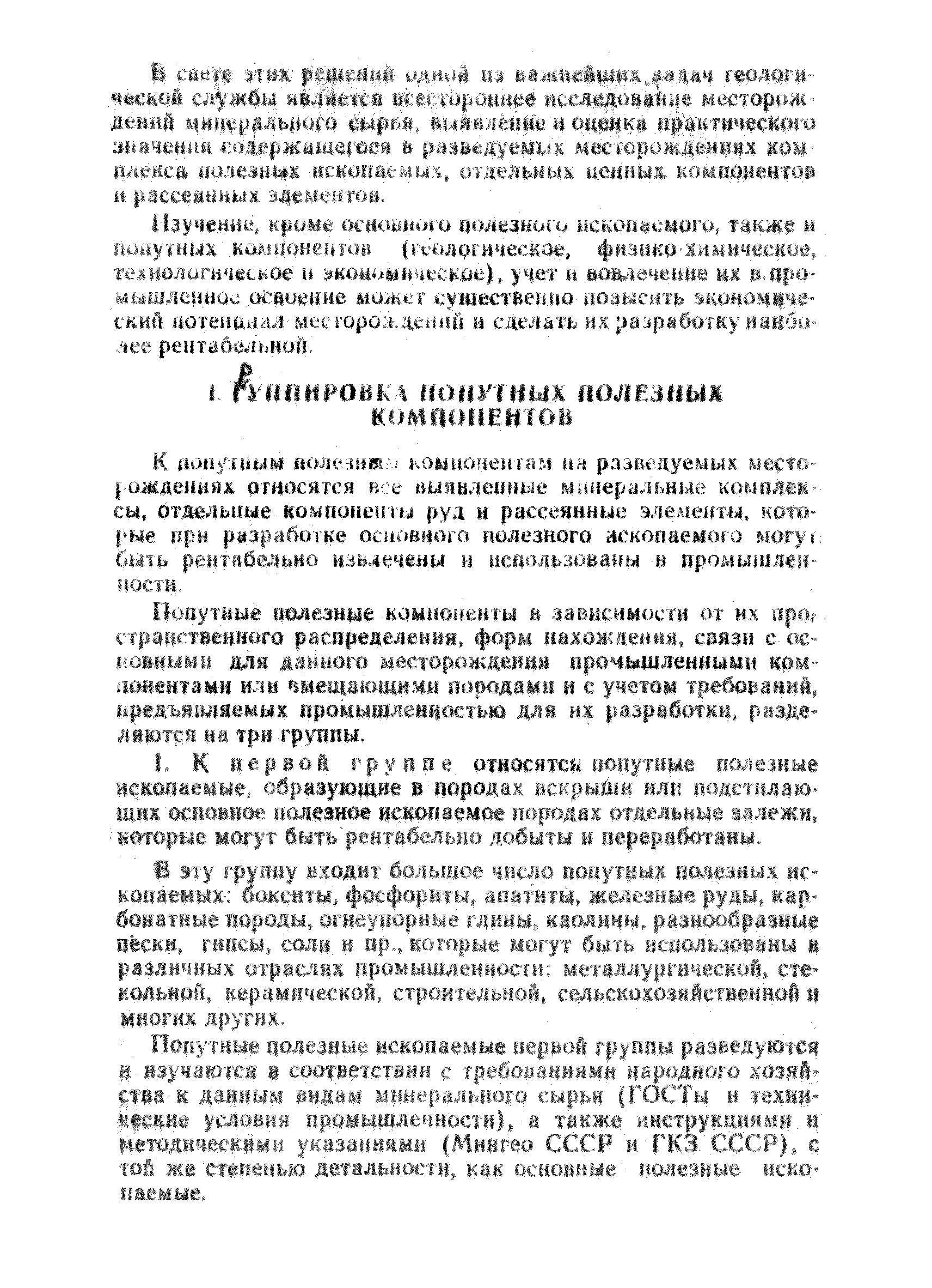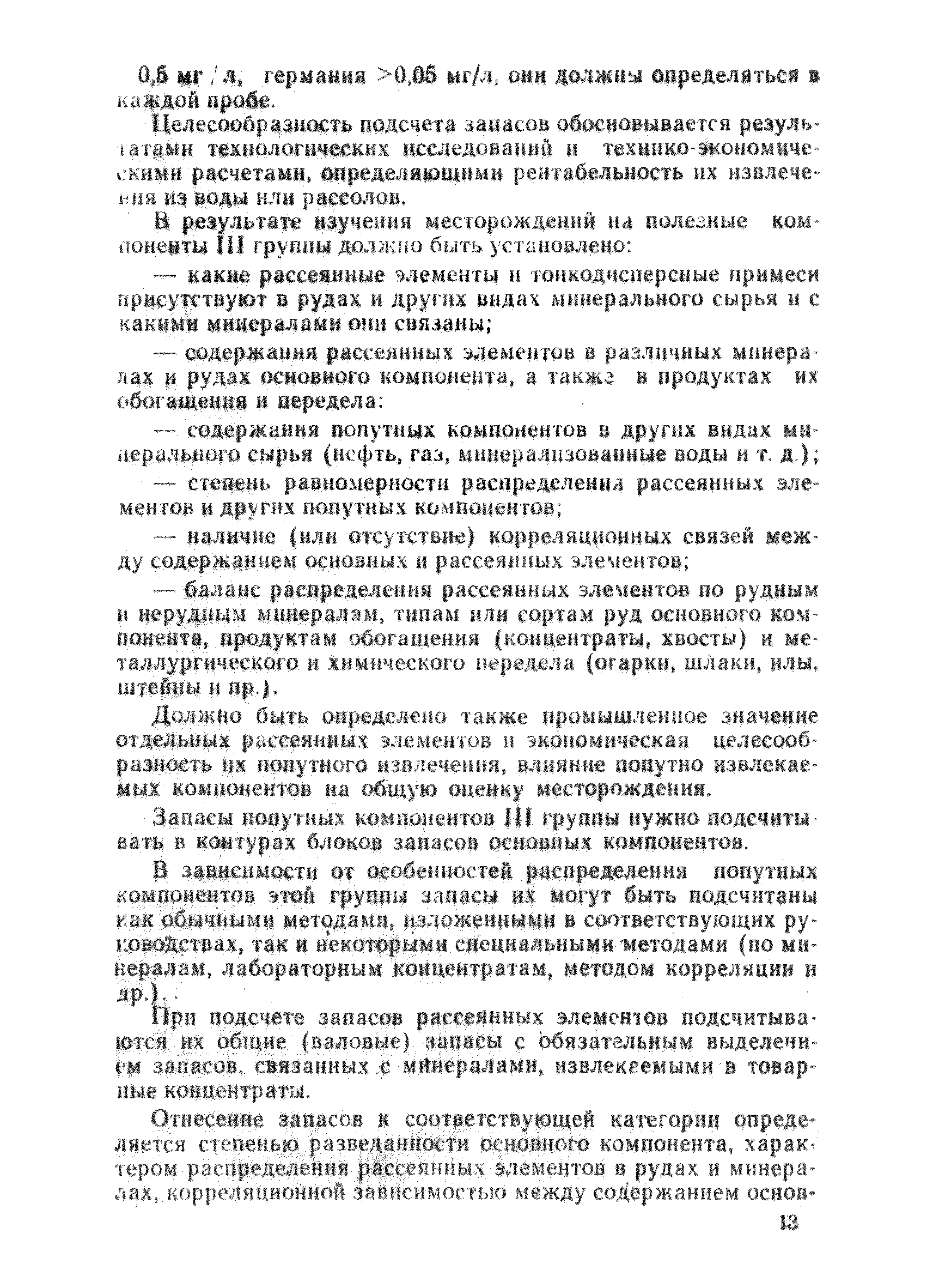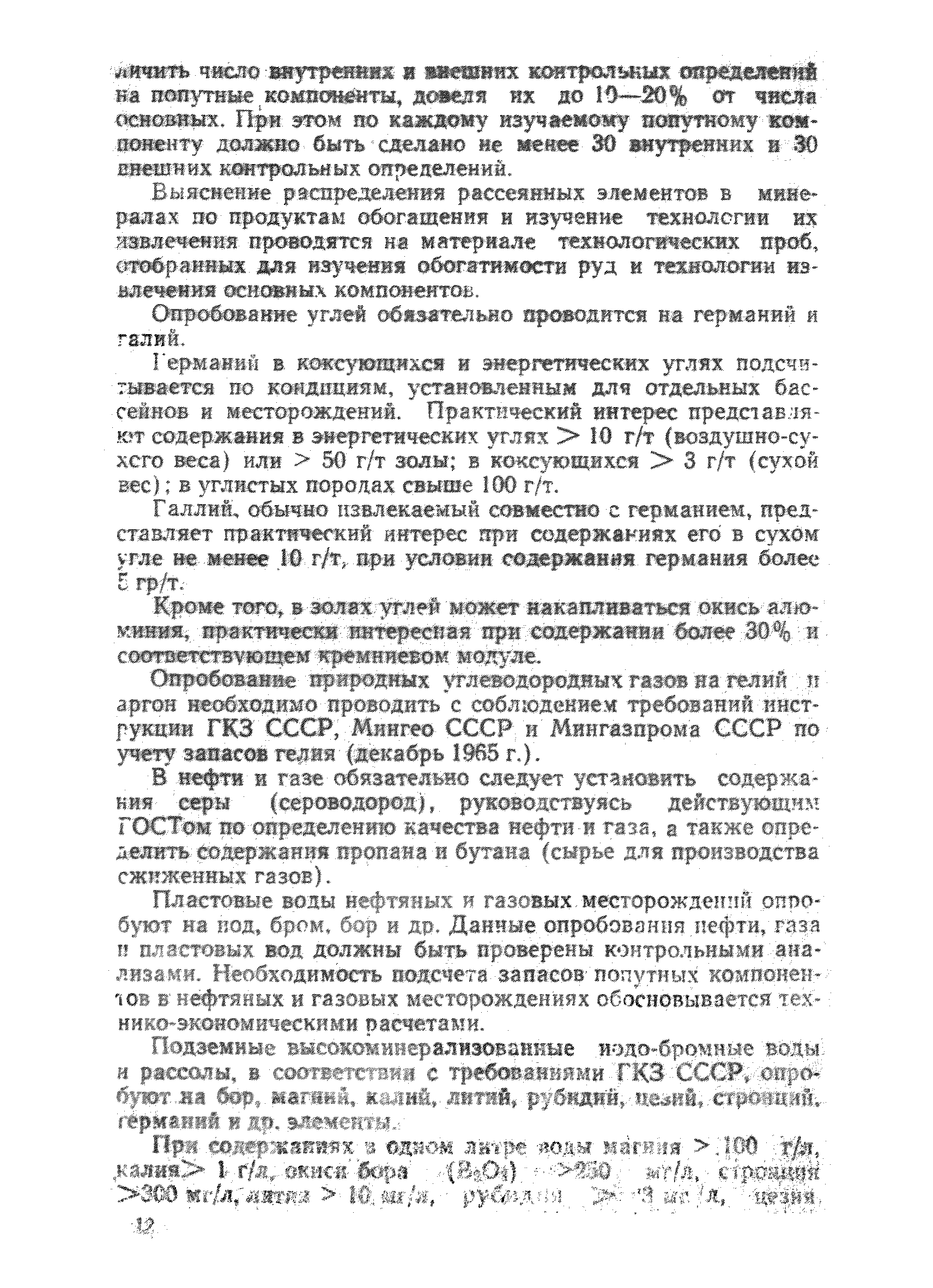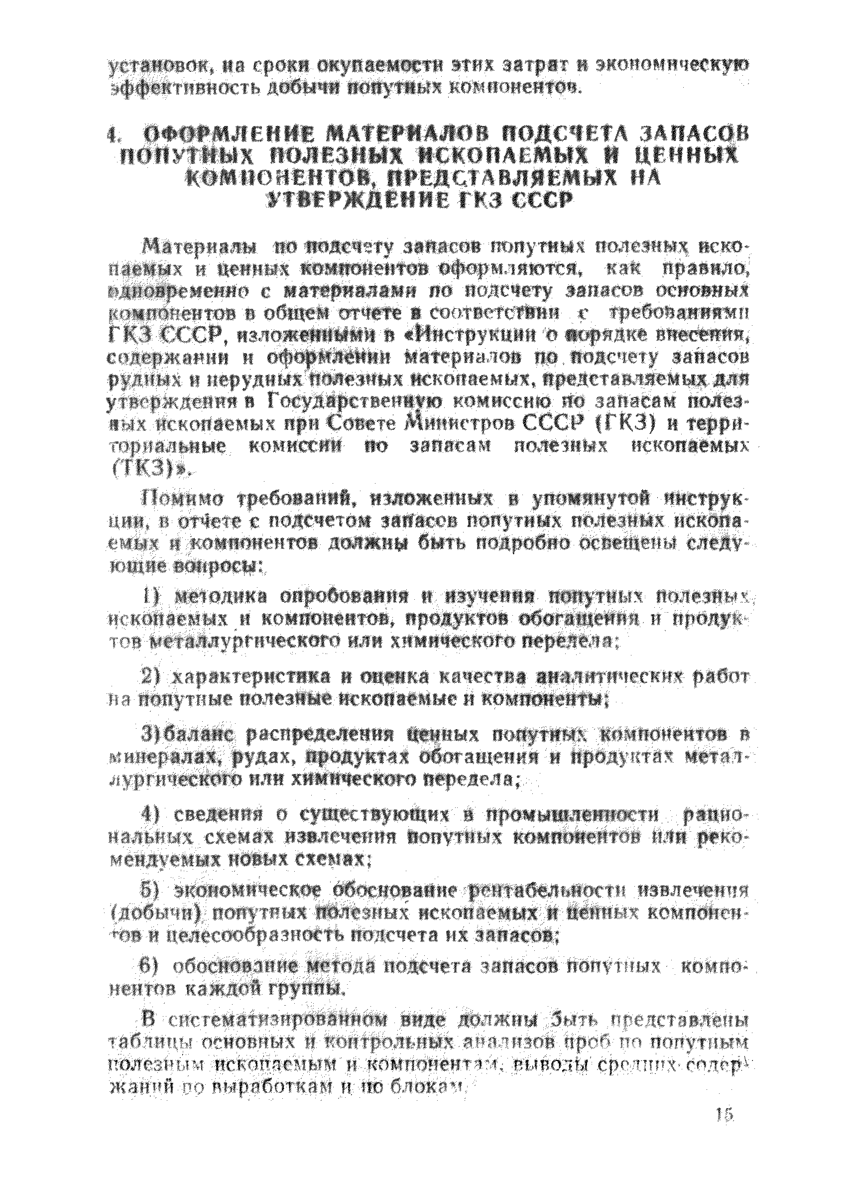 Временные требования к подсчету запасов попутных полезных ископаемых и компонентов в рудах и других видах минерального сырья| Статус: | не действует | | Название рус.: | Временные требования к подсчету запасов попутных полезных ископаемых и компонентов в рудах и других видах минерального сырья | | Дата добавления в базу: | 01.01.2018 | | Дата актуализации: | 01.01.2021 | | Оглавление: | Предисловие 1 Группировка попутных полезных компонентов I группа II группа III группа 2 Требования к изученности месторождений на попутные полезные компоненты и подсчету их запасов I группа II группа III группа 3 Определение подготовленности запасов попутных компонентов для промышленного освоения 4 Оформление материалов подсчета запасов попутных компонентов, представляемых на утверждение ГКЗ СССР 5 Приложение. Таблица предельно допустимых средних случайных погрешностей химических анализов проб на редкие и рассеянные элементы | | Утверждён: | 22.11.1973 ГКЗ СССР (USSR GKZ )