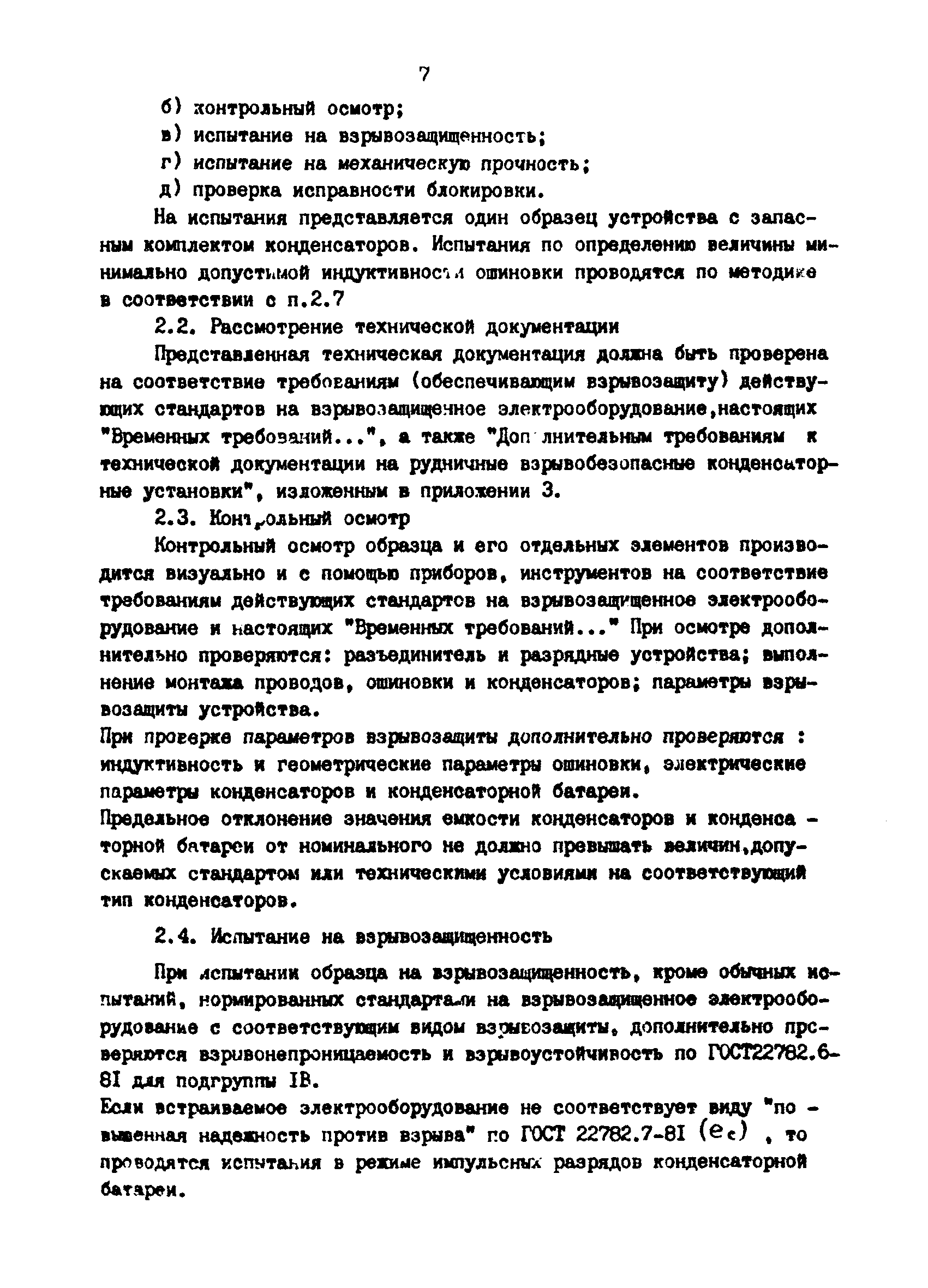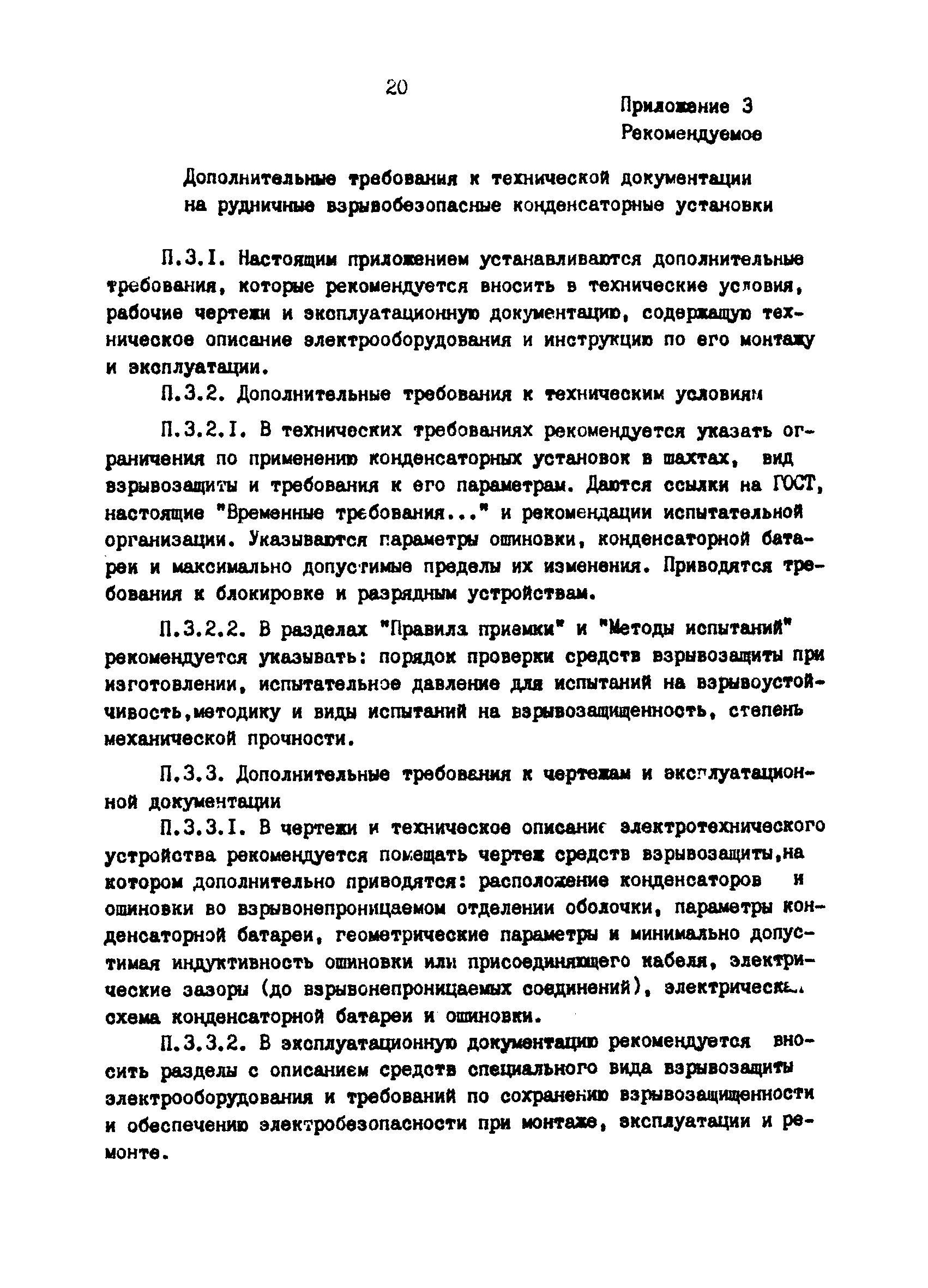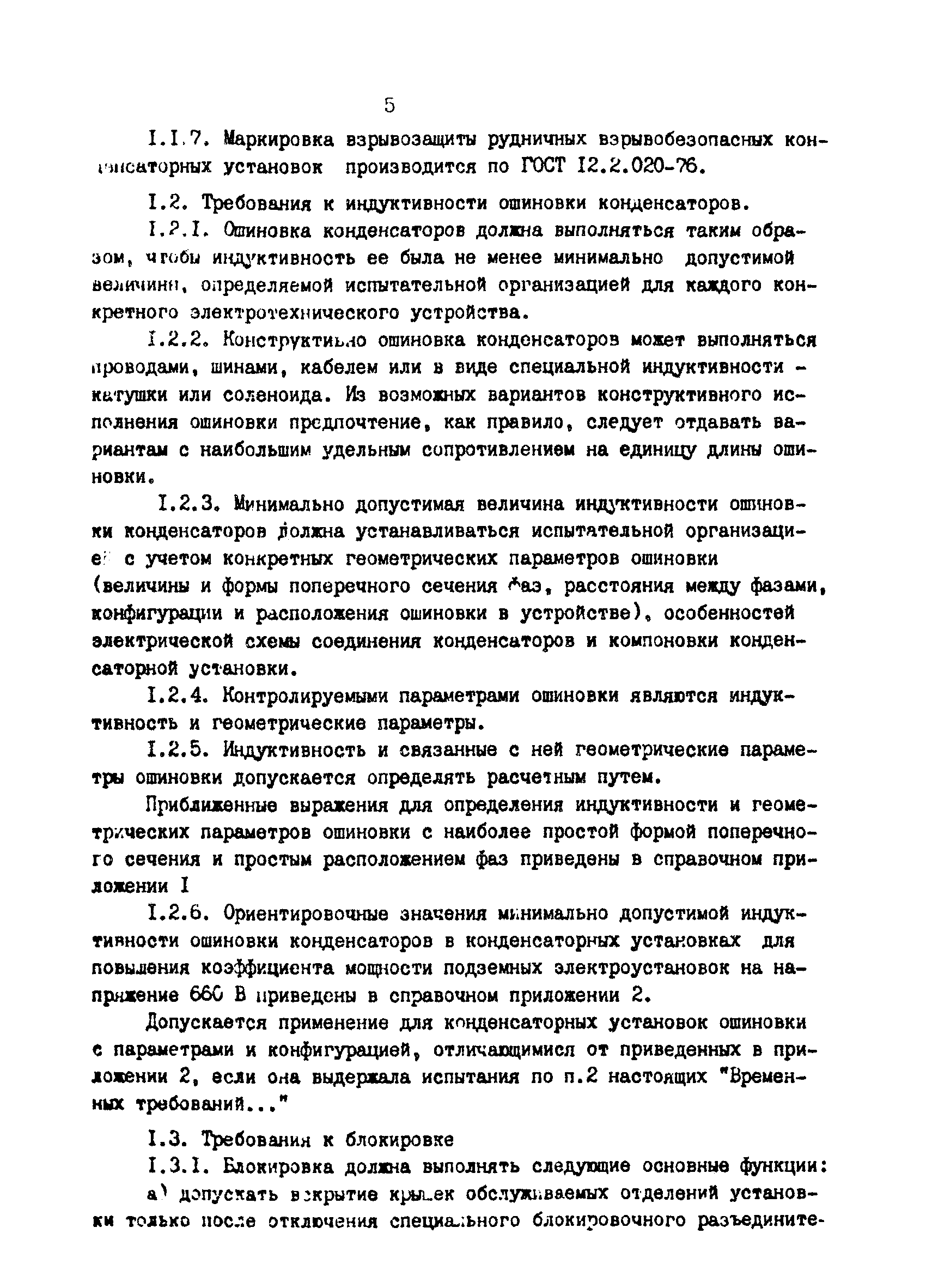 | Оглавление: | Введение 1 Требования к взрывозащите рудничных взрывобезопасных конденсаторных установок 1.1 Общие положения 1.2 Требования к индуктивности ошиновки конденсаторов 1.3 Требования к блокировке 1.4 Требования к заземлению 2 Требования к испытаниям рудничных взрывобезопасных конденсаторных установок 2.1 Общие указания 2.2 Рассмотрение технической документации 2.3 Контрольный осмотр 2.4 Испытание на взрывозащищенность 2.5 Испытание на механическую прочность 2.6 Проверка исправности блокировки 2.7 Определение величины минимально допустимой индуктивности ошиновки конденсаторов Приложение 1 (справочное). Расчет индуктивности и геометрических параметров ошиновки конденсаторов Приложение 2 (рекомендуемое). Ориентировочные значения минимально допустимой индуктивности ошиновки конденсаторов для конденсаторных установок на напряжение 660 В Приложение 3 (рекомендуемое). Дополнительные требования к технической документации на рудничные взрывобезопасные конденсаторные установки |