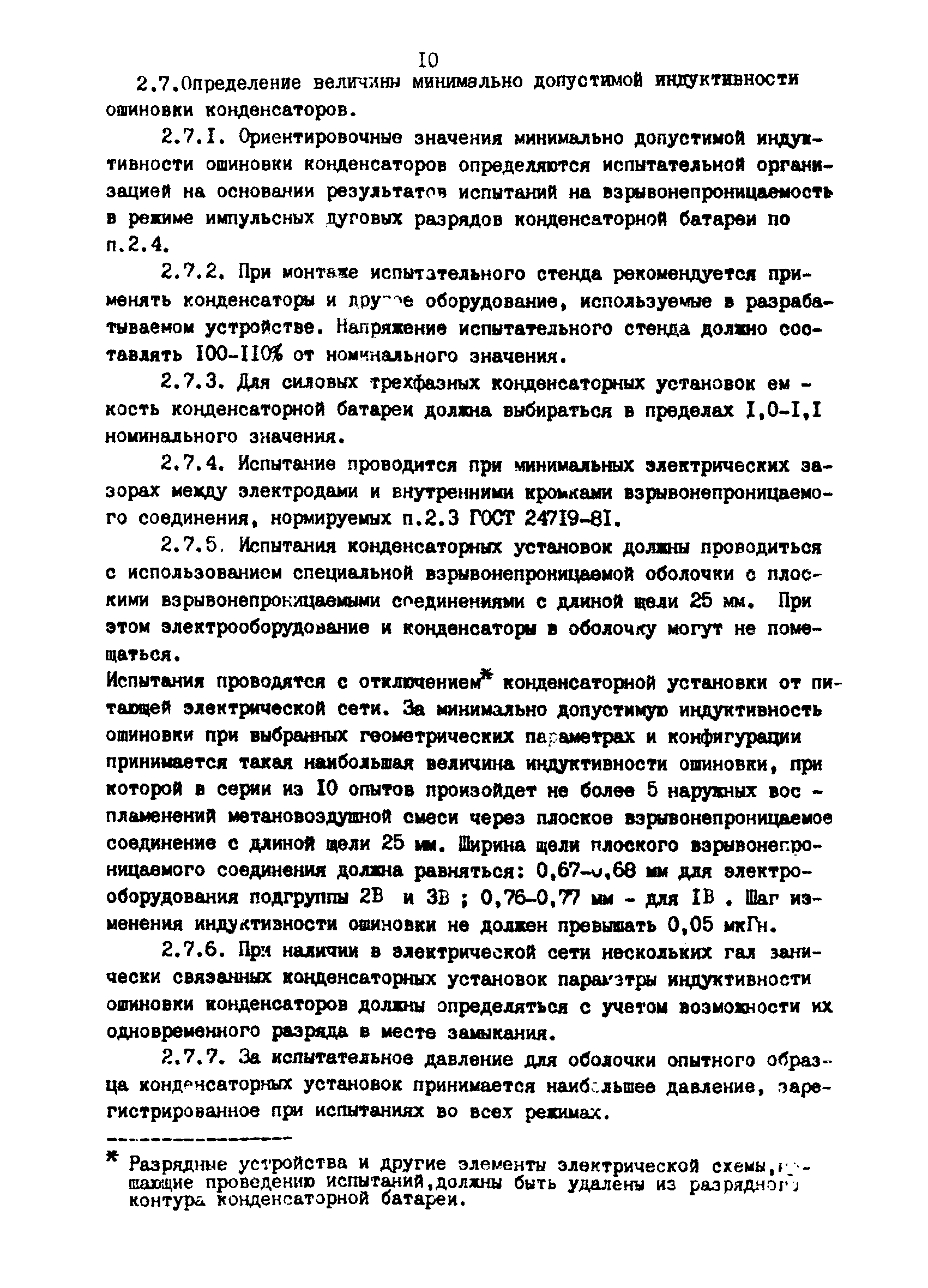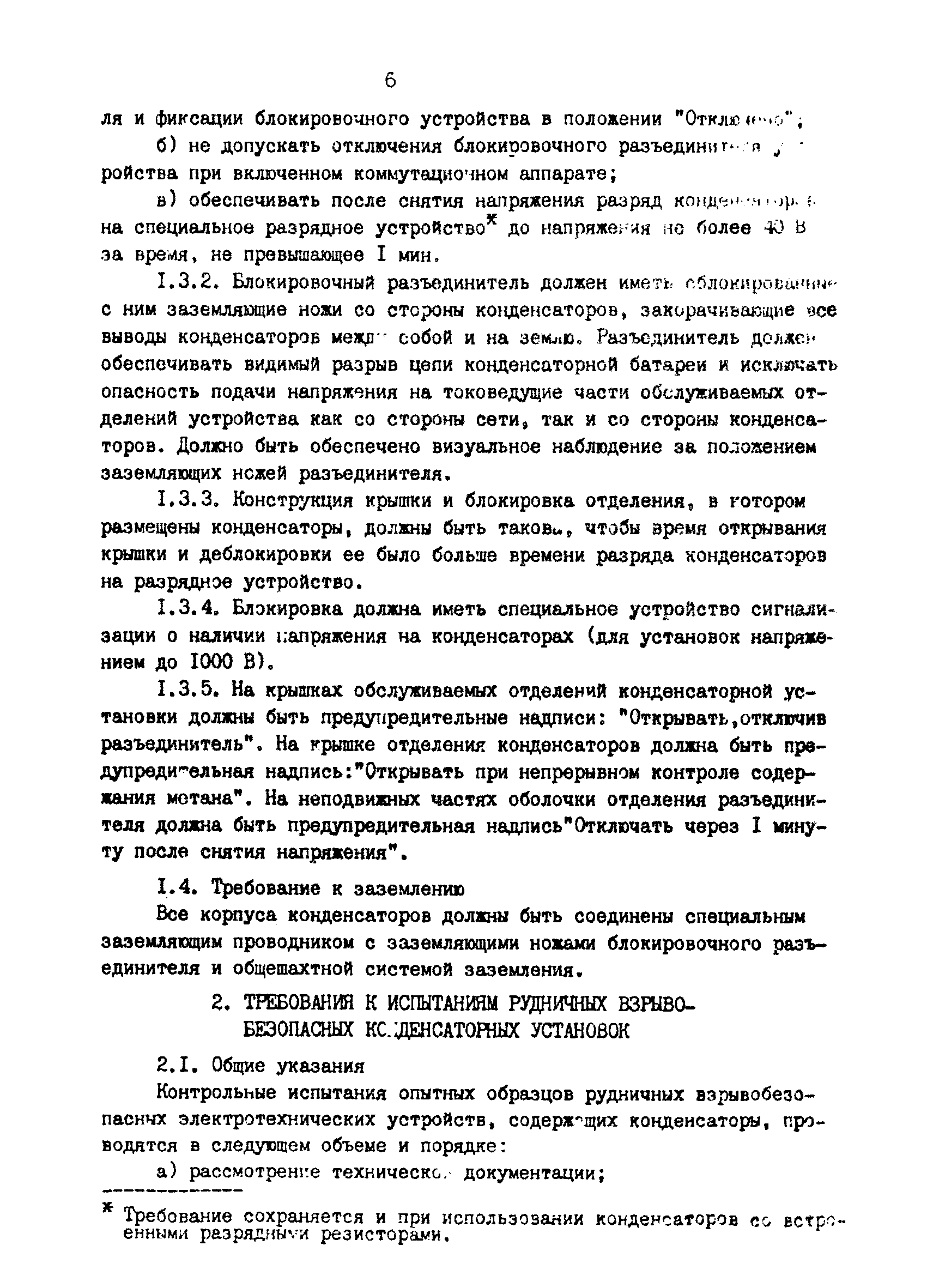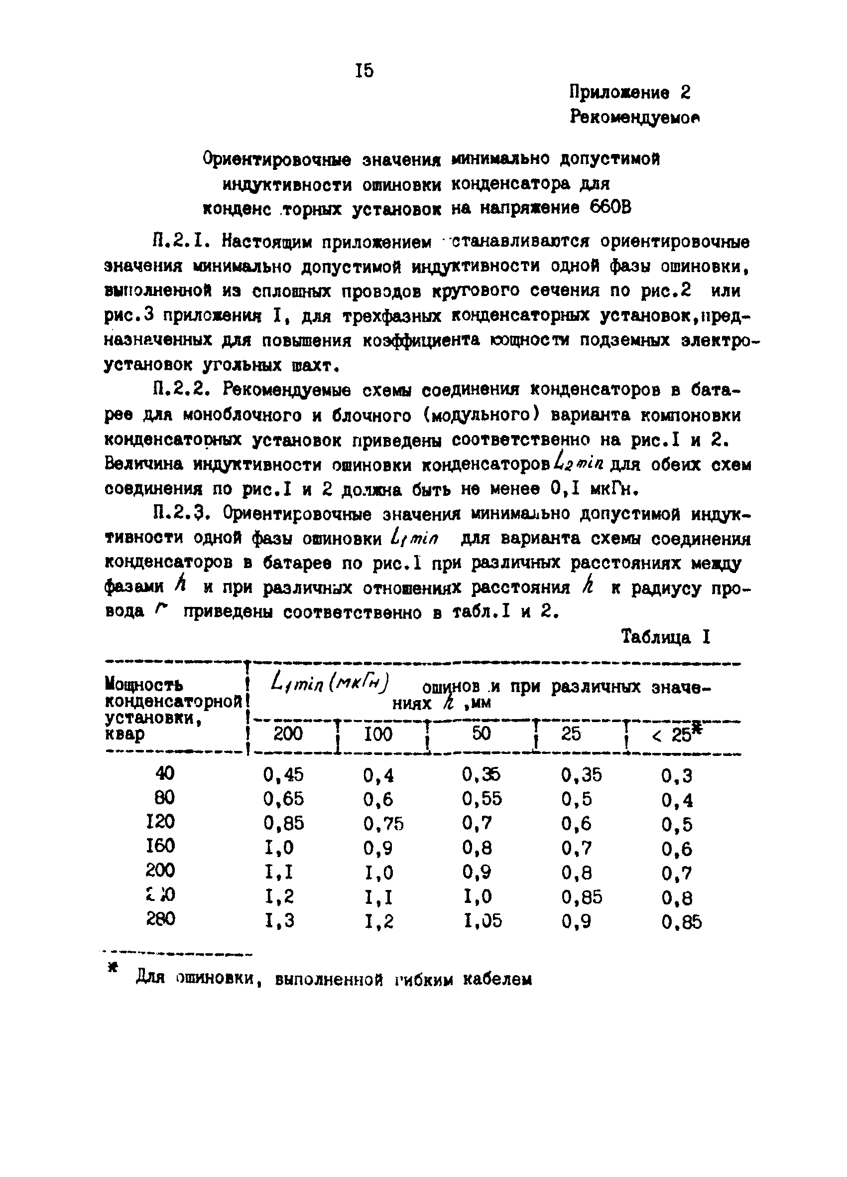 | Оглавление: | Введение 1 Требования к взрывозащите рудничных взрывобезопасных конденсаторных установок 1.1 Общие положения 1.2 Требования к индуктивности ошиновки конденсаторов 1.3 Требования к блокировке 1.4 Требования к заземлению 2 Требования к испытаниям рудничных взрывобезопасных конденсаторных установок 2.1 Общие указания 2.2 Рассмотрение технической документации 2.3 Контрольный осмотр 2.4 Испытание на взрывозащищенность 2.5 Испытание на механическую прочность 2.6 Проверка исправности блокировки 2.7 Определение величины минимально допустимой индуктивности ошиновки конденсаторов Приложение 1 (справочное). Расчет индуктивности и геометрических параметров ошиновки конденсаторов Приложение 2 (рекомендуемое). Ориентировочные значения минимально допустимой индуктивности ошиновки конденсаторов для конденсаторных установок на напряжение 660 В Приложение 3 (рекомендуемое). Дополнительные требования к технической документации на рудничные взрывобезопасные конденсаторные установки |