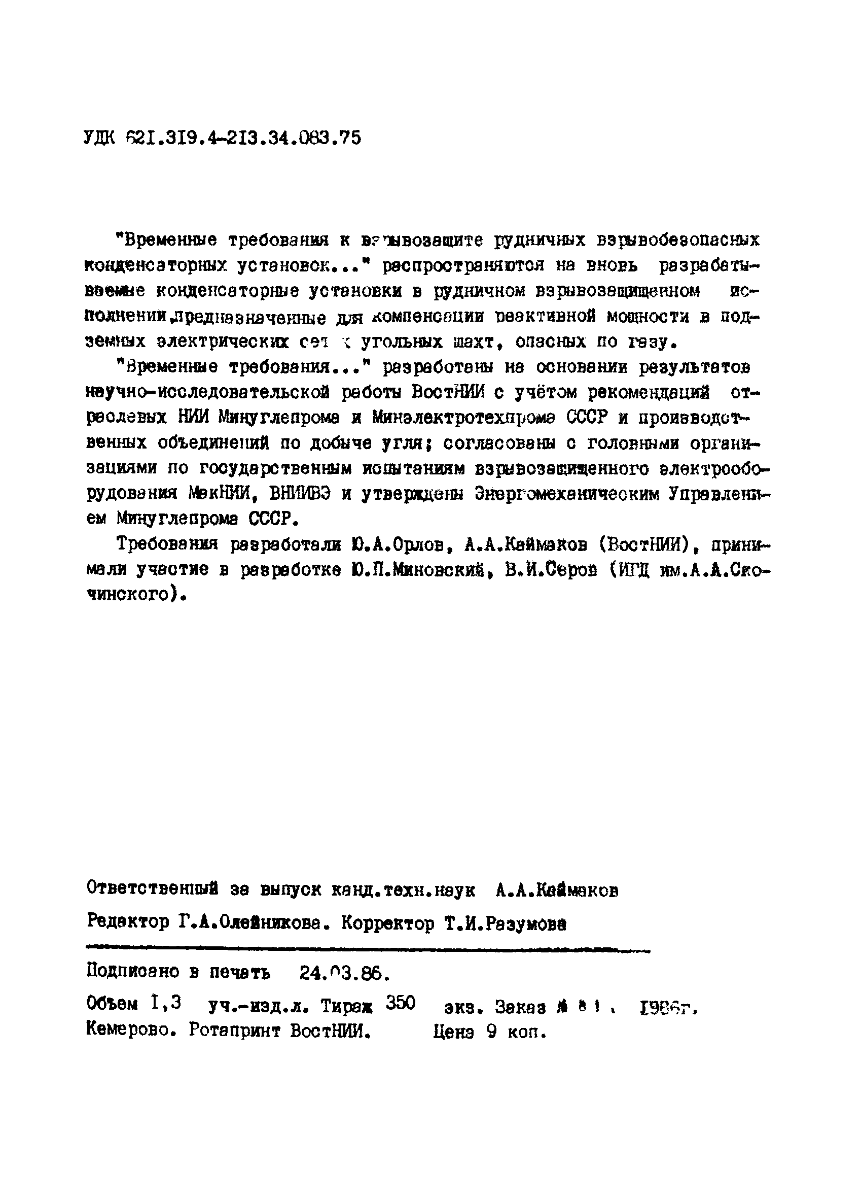 | Название рус.: | Временные требования к взрывозащите рудничных взрывобезопасных конденсаторных установок. Технические требования и методы испытаний |
