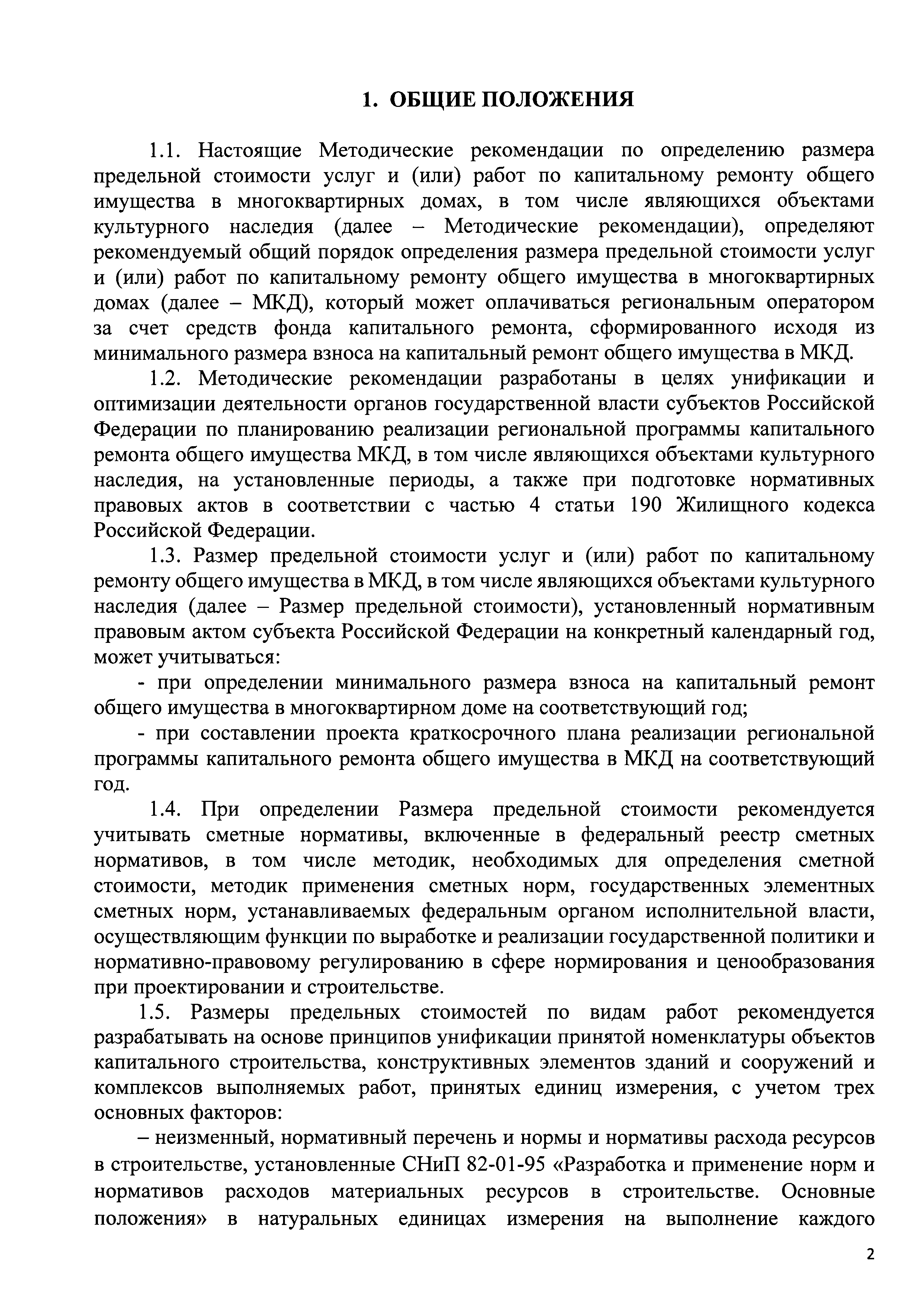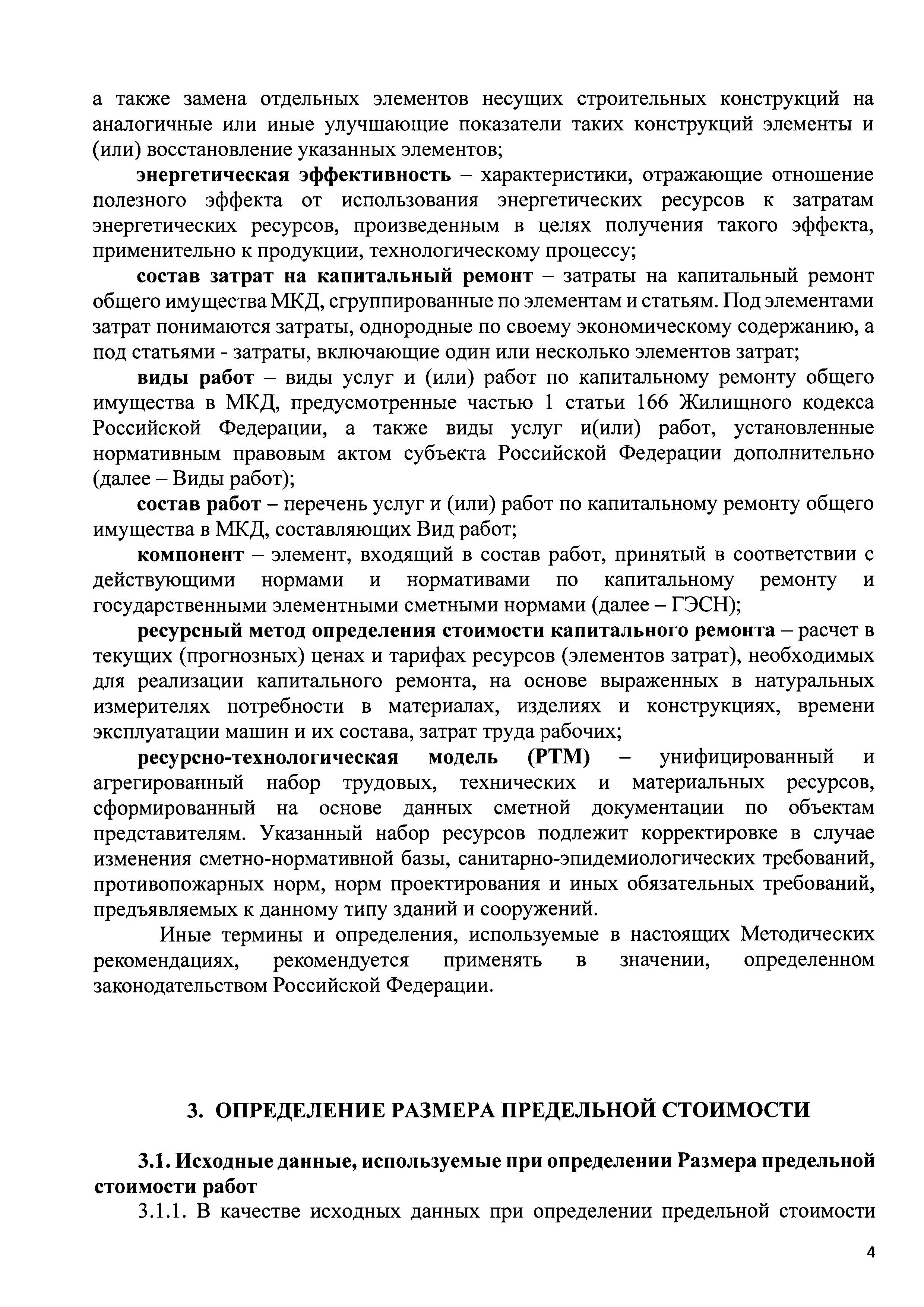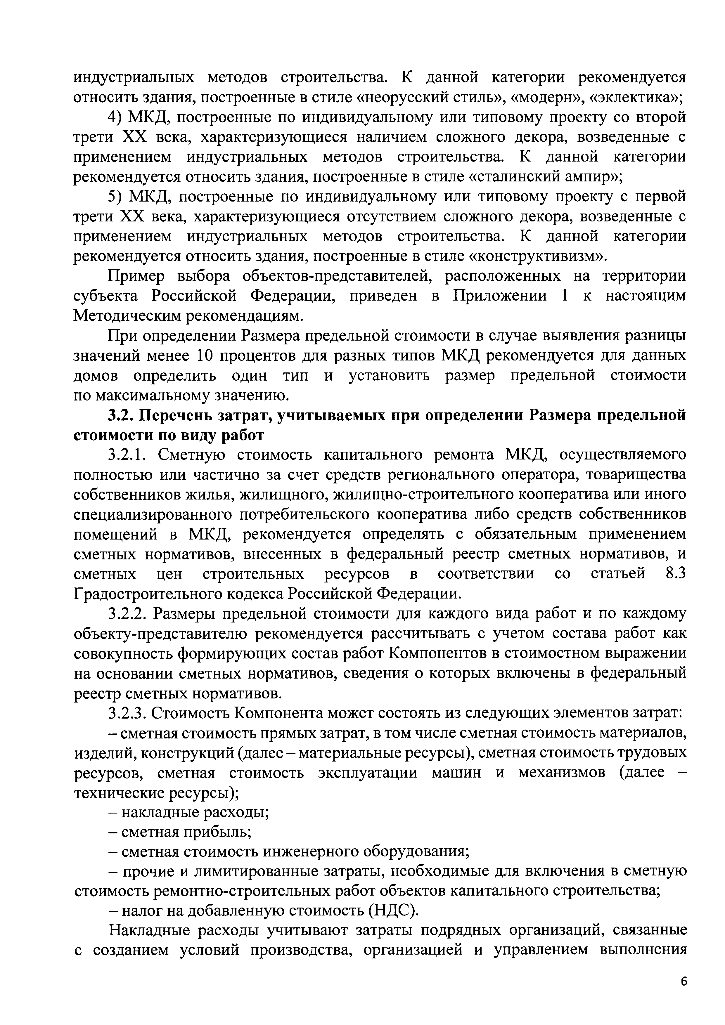 | Оглавление: | 1 Общие положения 2 Термины и определения 3 Определение размера предельной стоимости 3.1. Исходные данные, используемые при определении Размера предельной стоимости работ 3.2. Перечень затрат, учитываемых при определении Размера предельной стоимости по виду работ 3.3. Методика расчета одного Компонента, применяемого в определении Размера предельной стоимости 3.4. Формирование и актуализация стоимостного блока для расчета одного элемента Размера предельной стоимости капитального ремонта 3.5. Выбор измерителей показателей Размера предельной стоимости (один вид работ одного объекта-представителя) 3.6. Формирование сводной таблицы Размеров предельной стоимости Приложение 1. Пример выбора объектов представителей, расположенных на территории субъекта Российской Федерации Приложение 2. Пример формирования локального сметного расчета |