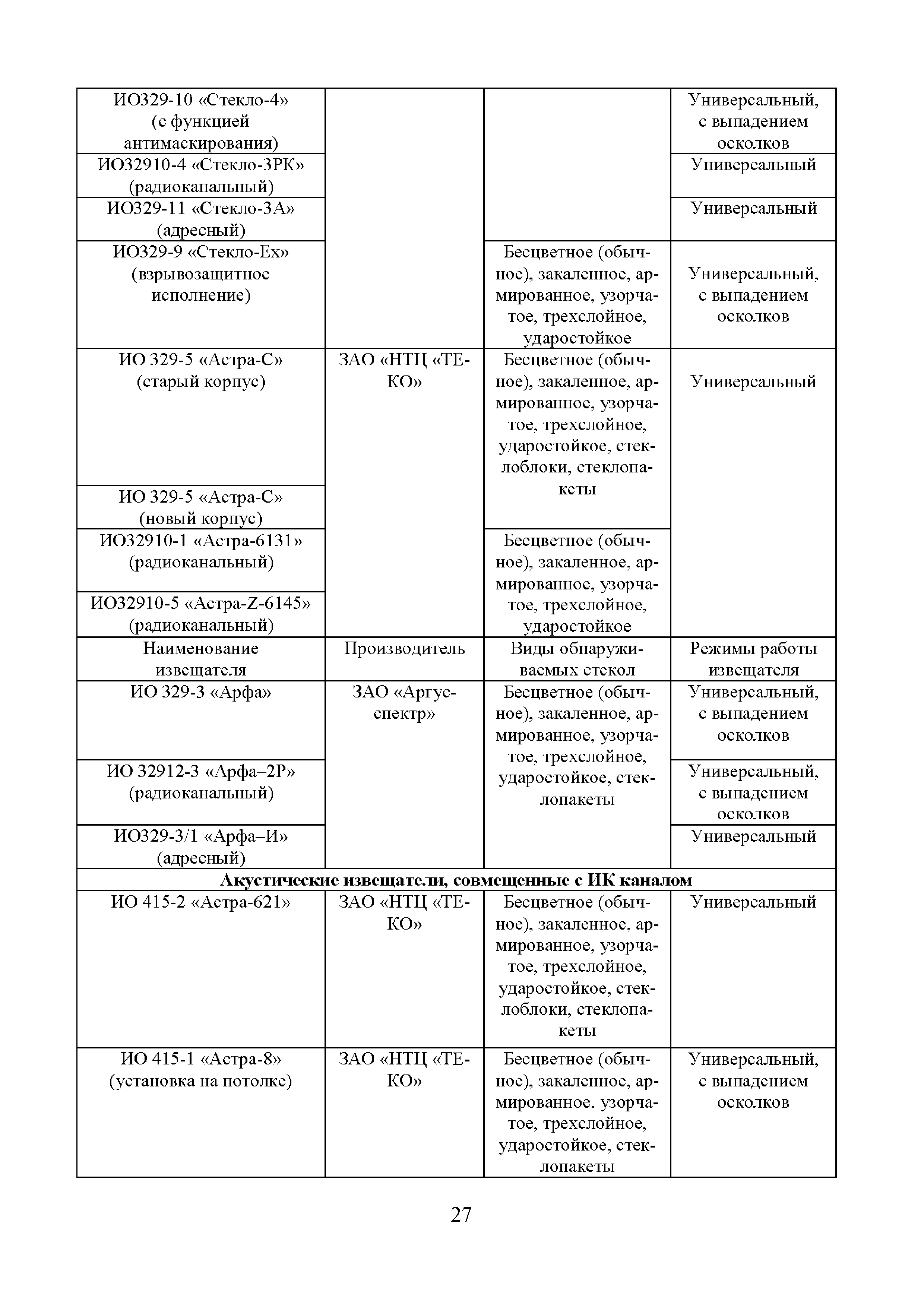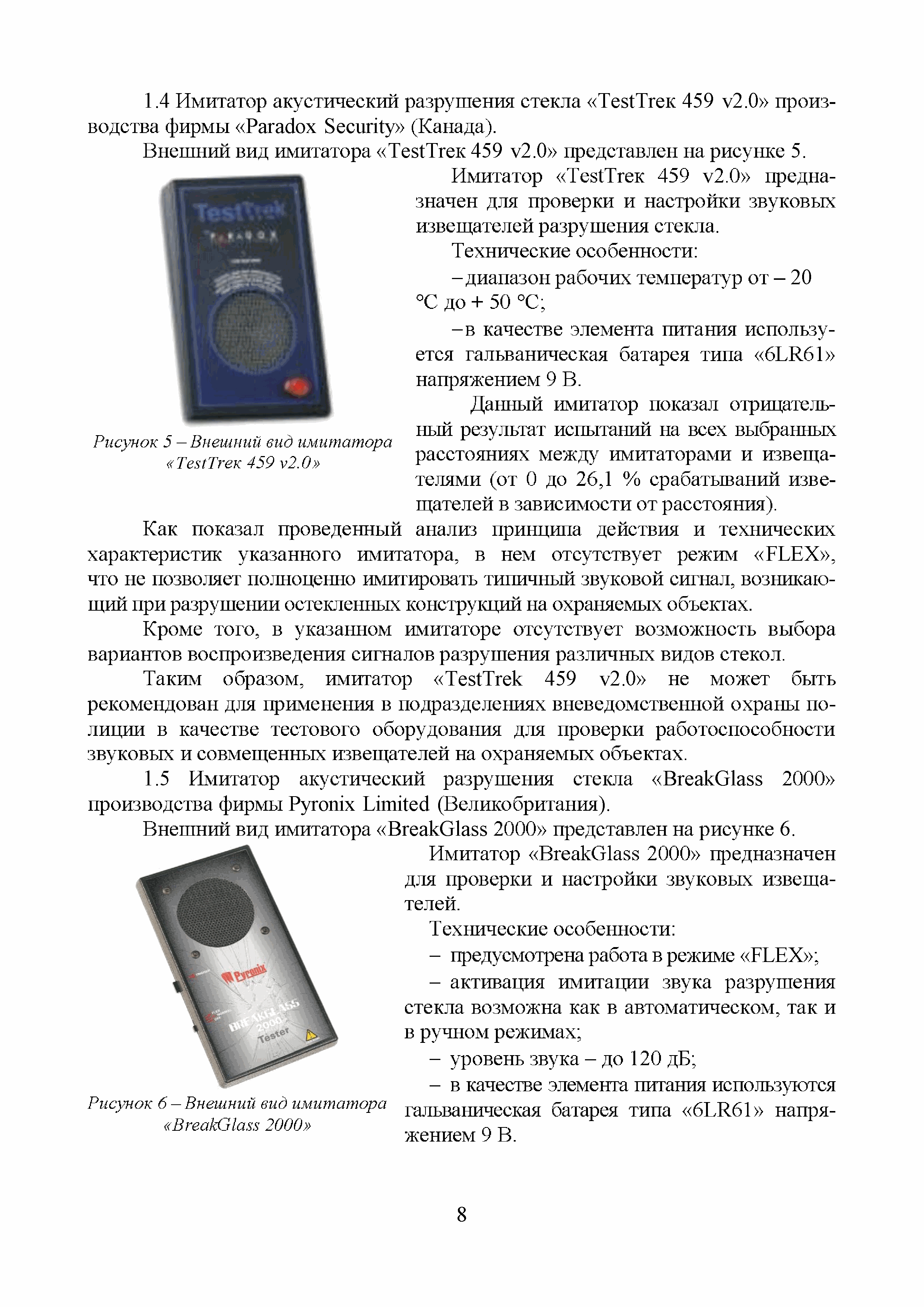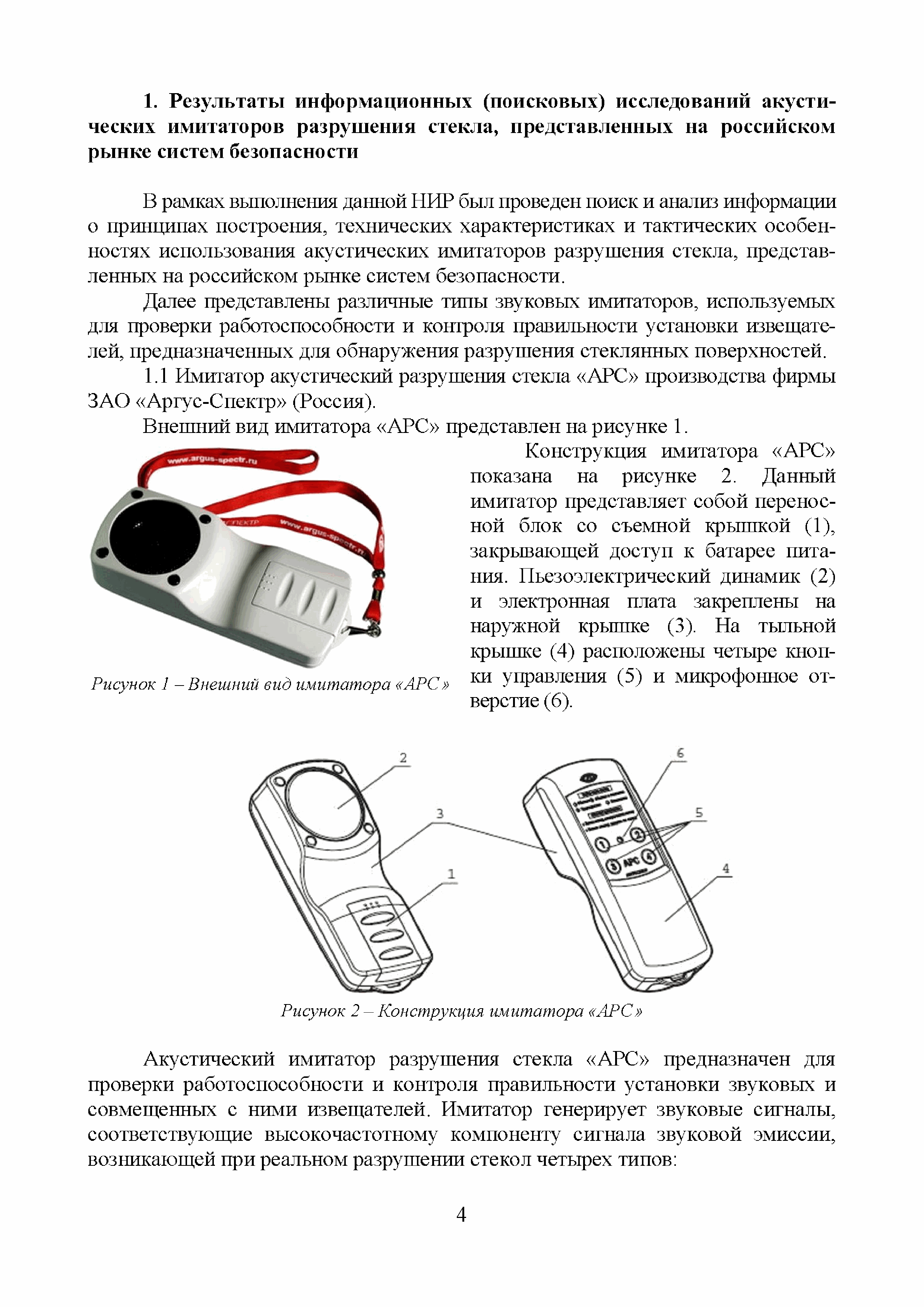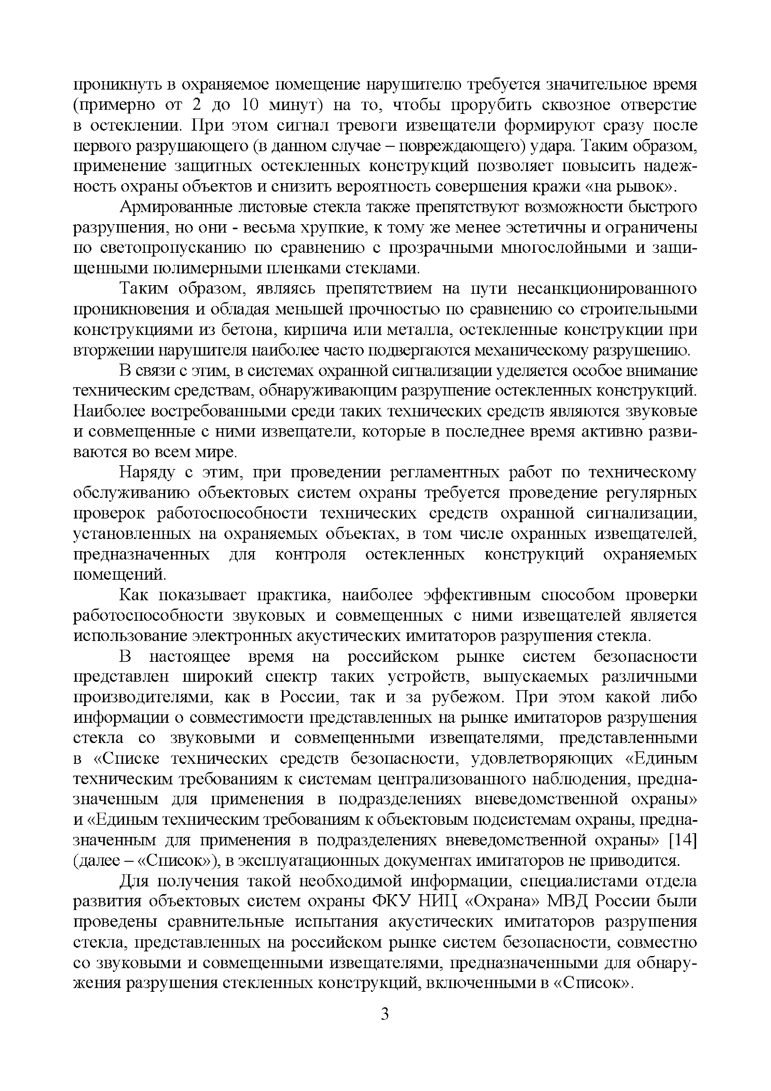 | Оглавление: | Введение 1 Результаты информационных (поисковых) исследований акустических имитаторов разрушения стекла, представленных на российском рынке систем безопасности 2 Выводы по результатам проведенных сравнительных испытаний акустических имитаторов разрушения стекла, предназначенных для контроля работоспособности звуковых и совмещенных извещателей Приложение А. Обзорная информация о звуковых и совмещенных извещателях, включенных в "Список ТСО", используемых для обнаружения разрушения стеклянных поверхностей. 1 Извещатели с электропитанием от источника постоянного тока и проводным универсальным (неадресным) интерфейсом 2 Извещатели с электропитанием от источника постоянного тока, проводным универсальным интерфейсом и с функцией антимаскирования 3 Извещатели с электропитанием от шлейфа сигнализации (ШС) и проводным неадресным интерфейсом 4 Извещатели с электропитанием от ШС ППК и проводным адресным интерфейсом 5 Извещатели с электропитанием от автономных источников и беспроводным (радиоканальным) адресным интерфейсом 6 Взрывозащищенные извещатели 7 Охранные совмещенные извещатели (звуковые и оптико-электронные) Протокол сравнительных испытаний акустических имитаторов разрушения стекла, предназначенных для контроля работоспособности звуковых и совмещенных извещателей 1 Объекты испытаний 2 Место и время проведения испытаний 3 Методика проведения испытаний 4 Результаты проведенных испытаний 6 Выводы по результатам испытаний Приложение А (справочное). Внешний вид стенда и имитаторов |