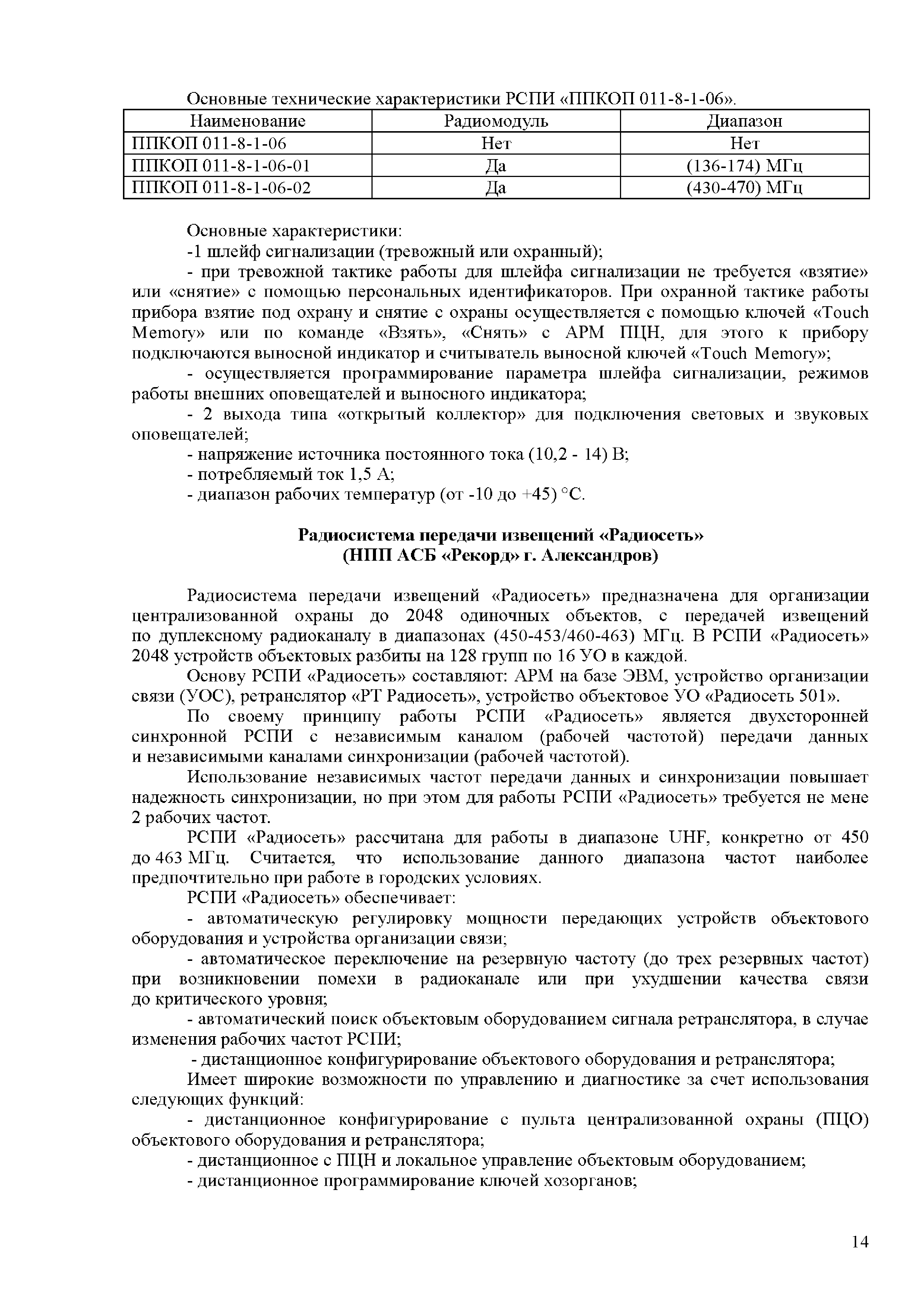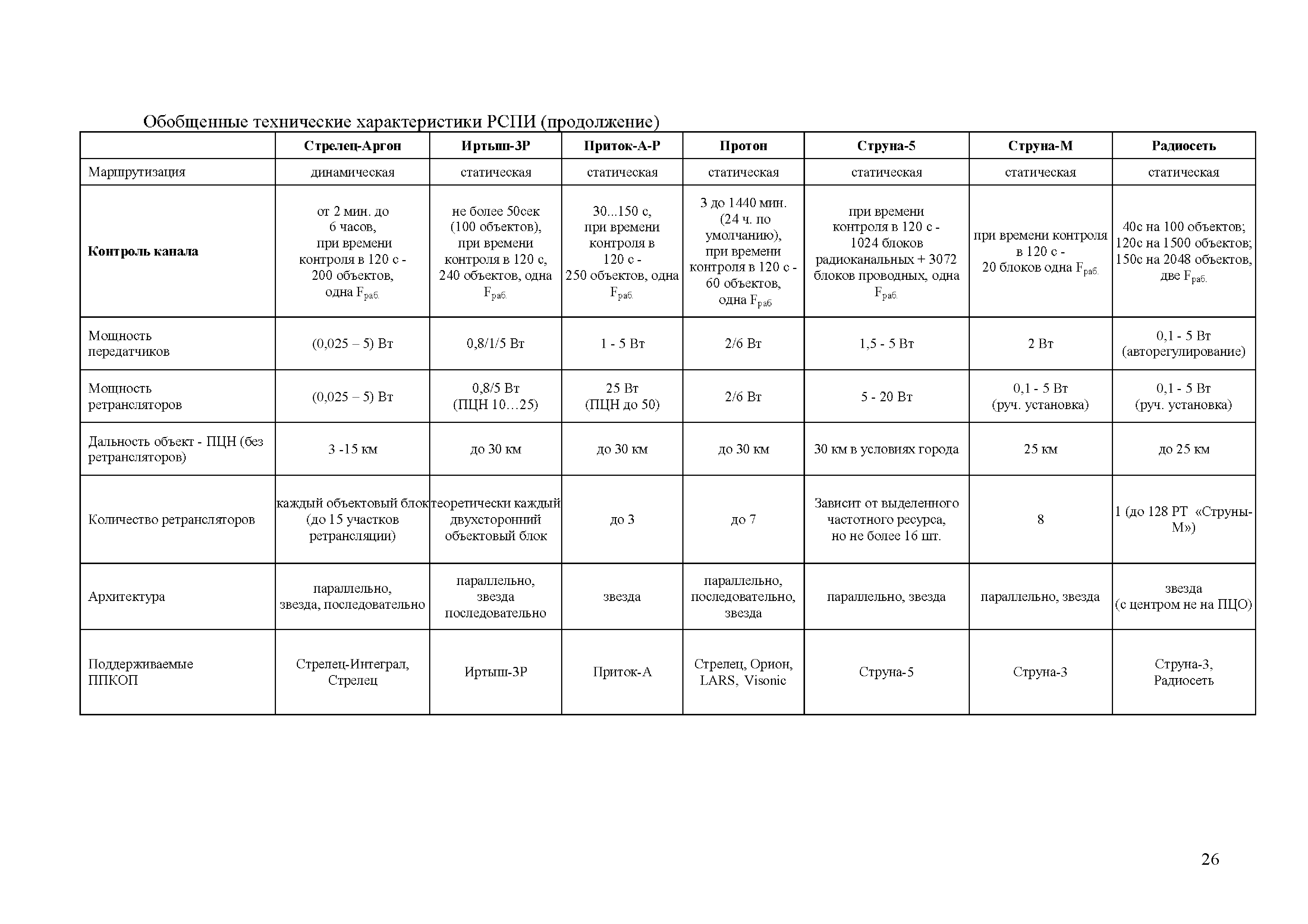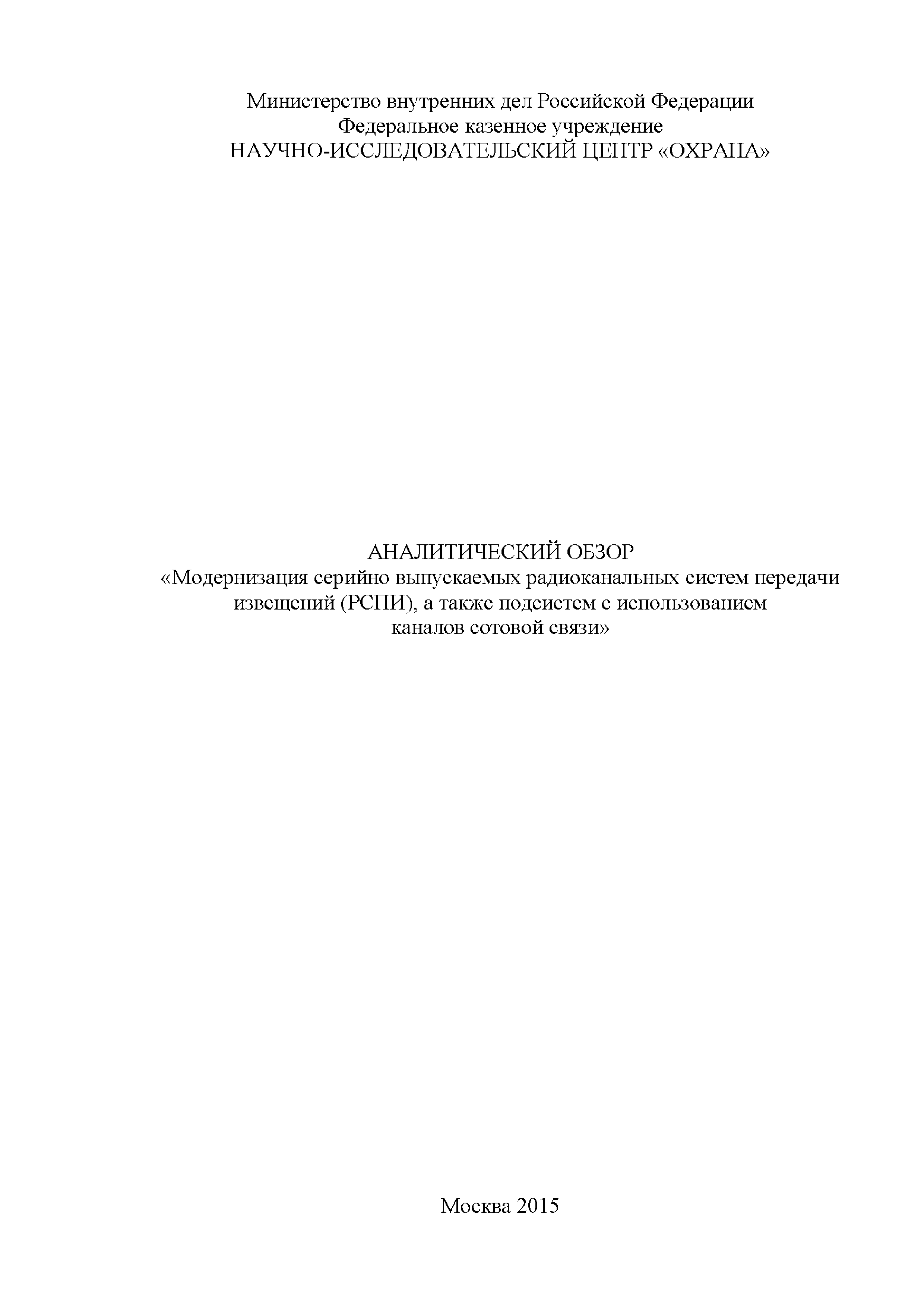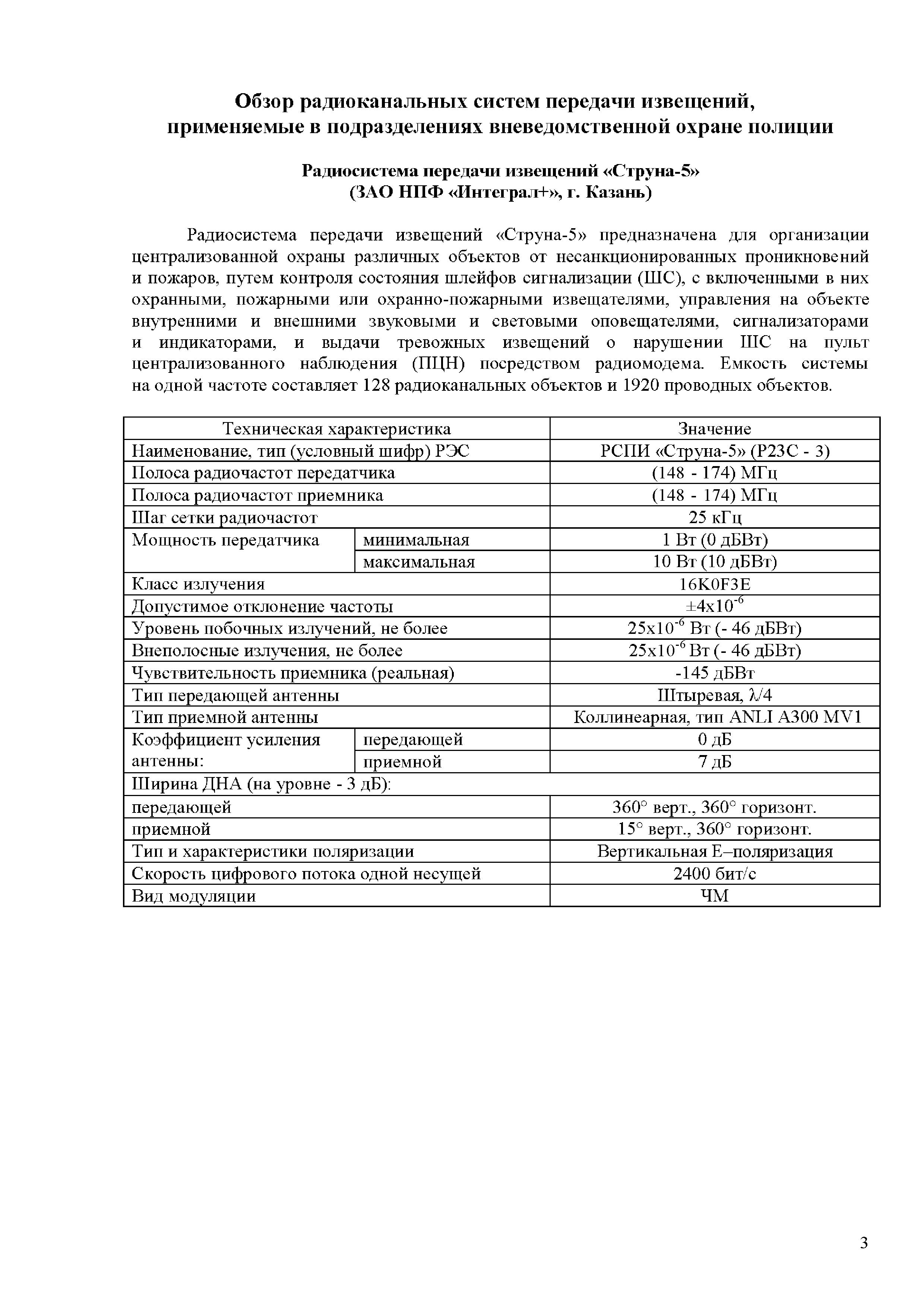 Аналитический обзор "Модернизация серийно выпускаемых радиоканальных систем передачи извещений (РСПИ), а также подсистем с использованием каналов сотовой связи"| Статус: | действует | | Название рус.: | Аналитический обзор "Модернизация серийно выпускаемых радиоканальных систем передачи извещений (РСПИ), а также подсистем с использованием каналов сотовой связи" | | Дата добавления в базу: | 01.01.2018 | | Дата актуализации: | 01.01.2021 | | Область применения: | Целью аналитического обзора является проведение сравнения основных тактико-технических характеристик, применяемых РСПИ, и выработка предложений по модернизации данного вида оборудования. | | Оглавление: | Введение Обзор радиоканальных систем передачи извещений, применяемые в подразделениях вневедомственной охране полиции Радиосистема передачи извещений "Струна-5" (ЗАО НПФ "Интеграл +", г. Казань) Радиосистема передачи извещений "Стрелец-Аргон" (Фирма-производитель ЗАО "Аргус-Спектр" г. С-Петербург) Радиосистема передачи извещений "Иртыш-3Р" (ООО НТК "Интекс" г. Омск) Радиосистема передачи извещений "Приток-А-Р" (ООО "Охранное бюро Сократ" г. Иркутск) Радиосистема передачи извещений "Радиосеть" (НПП АСБ "Рекорд" г. Александров) Радиосистема передачи извещений "Протон" (ООО НПО АСБ "Центр-Протон»" г. Челябинск) Обобщенные технические характеристики РСПИ Заключение | | Разработан: | ФКУ НИЦ Охрана МВД России