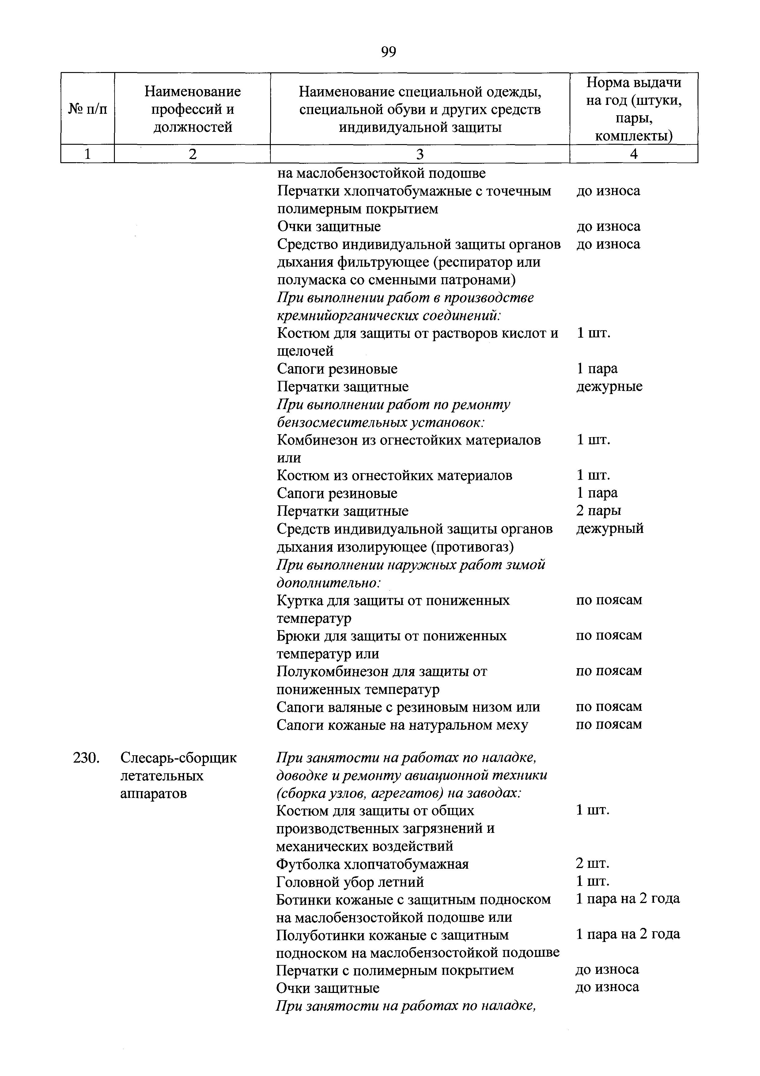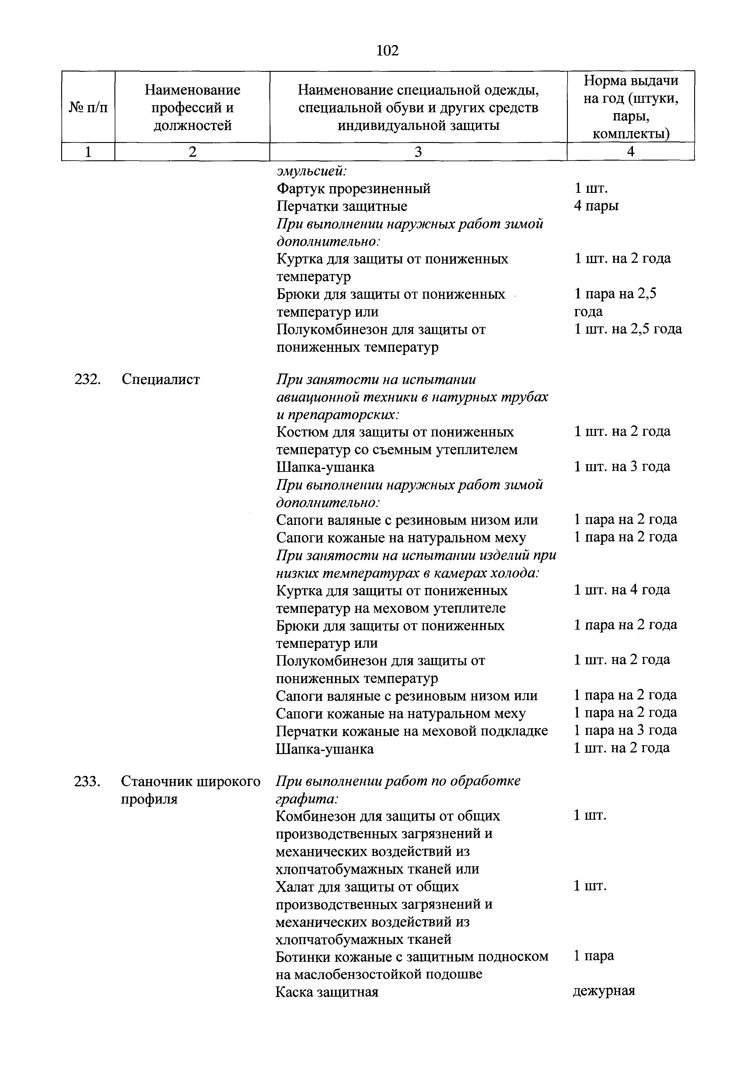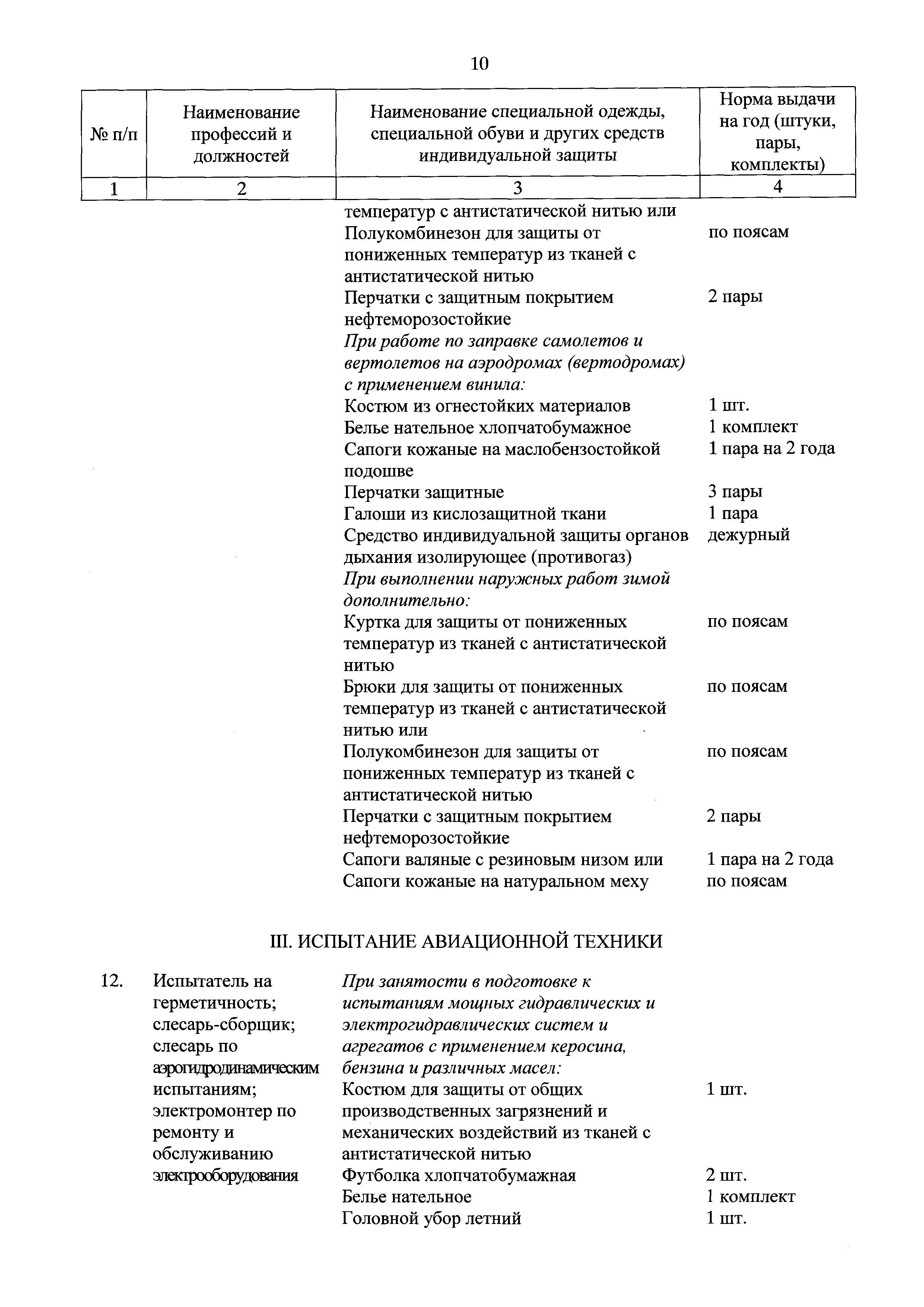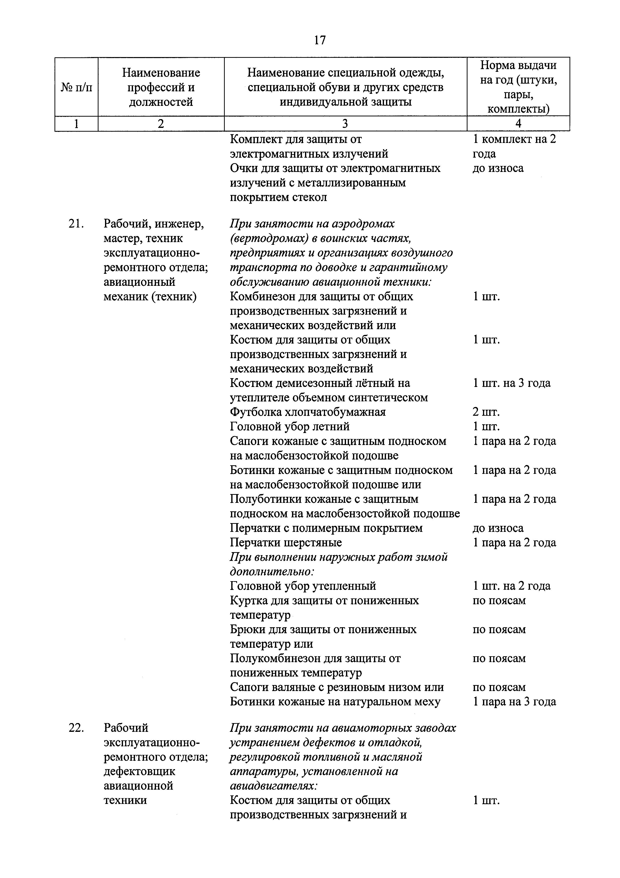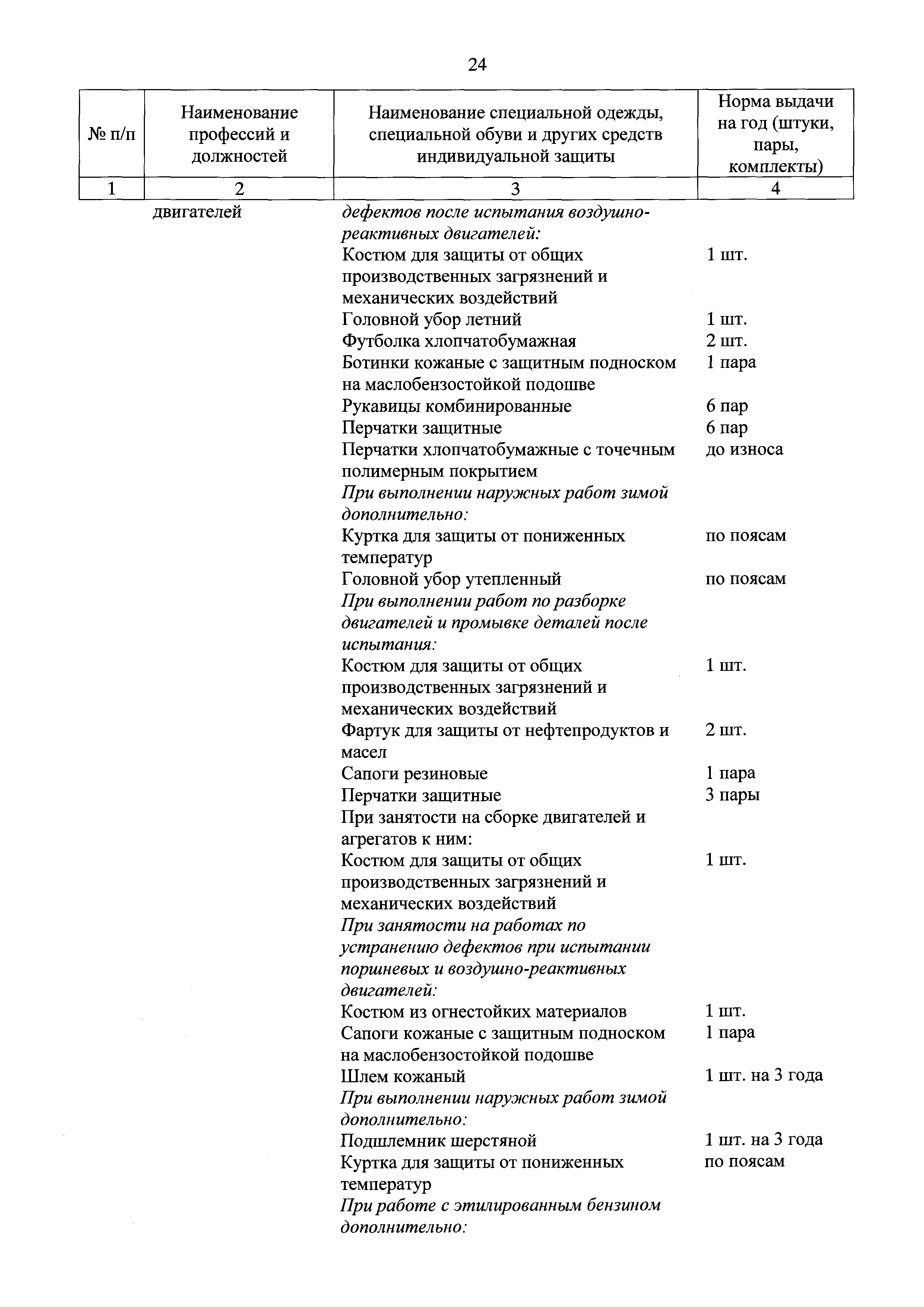 Типовые нормы бесплатной выдачи специальной одежды, специальной обуви и других средств индивидуальной защиты работникам авиационной промышленности, занятым на работах с вредными и (или) опасными условиями труда, а также на работах, выполняемых в особых температурных условиях или связанных с загрязнением| Статус: | действует | | Название рус.: | Типовые нормы бесплатной выдачи специальной одежды, специальной обуви и других средств индивидуальной защиты работникам авиационной промышленности, занятым на работах с вредными и (или) опасными условиями труда, а также на работах, выполняемых в особых температурных условиях или связанных с загрязнением | | Дата добавления в базу: | 01.01.2018 | | Дата актуализации: | 01.01.2021 | | Дата введения: | 01.12.2017 | | Оглавление: | I. Летный состав II. Инженерно-технический состав III. Испытание авиационной техники IV. Службы эксплуатационного содержания аэродромов (вертодромов) V. Персонал испытательных станций авиационных двигателей VI. Персонал испытательных станций двигателей и силовых установок VII. Работники полигона VIII. Производство мягких баков IX. Производство мипоры X. Подразделения неразрушающего контроля XI. Оптическое стекловарение и оптико-механическое производство 1. Оптическое стекловарение 2. Оптико-механическое производство 3. Общие профессии XII. Производство полимерных композиционных материалов (далее - ПКМ) и изделий из них XIII. Производство печатных плат гальваническим способом XIV. Авиаприборостоение. Сборка приборов для ракетно-космической техники XV. Прочие профессии | | Утверждён: | 19.06.2017 Министерство труда и социальной защиты РФ (507н)