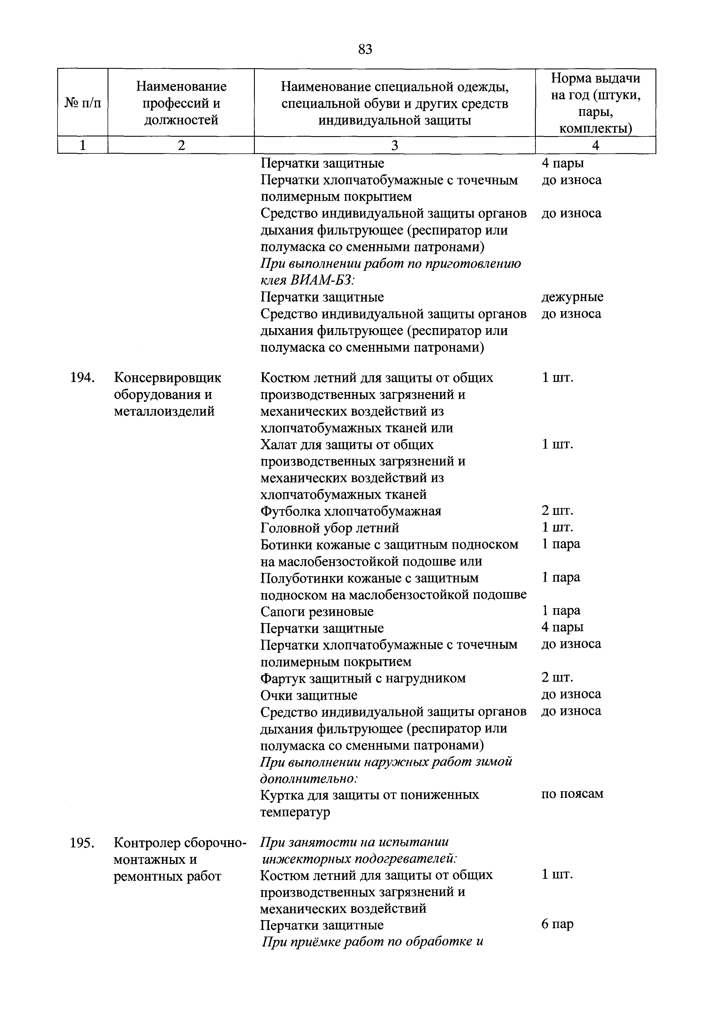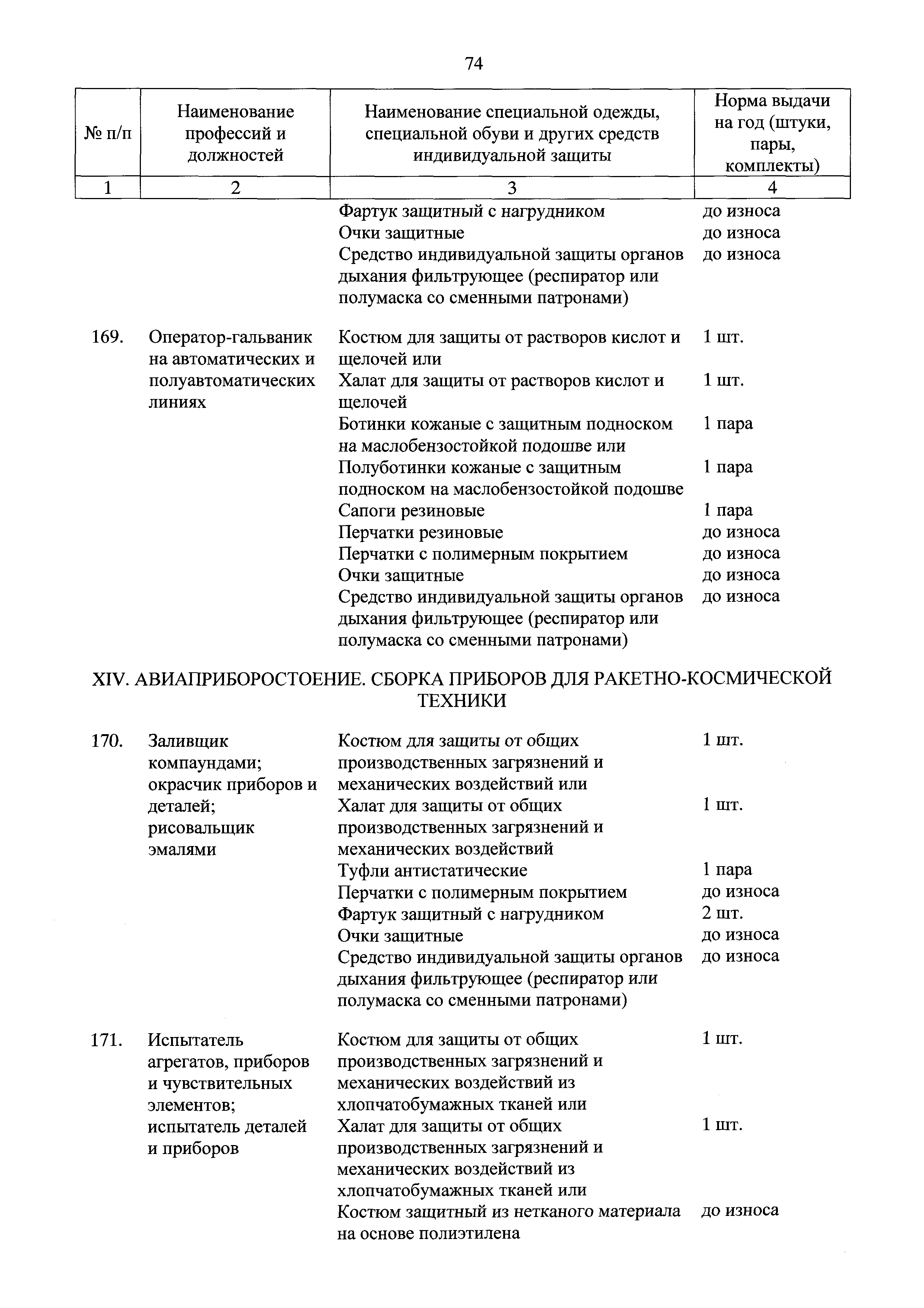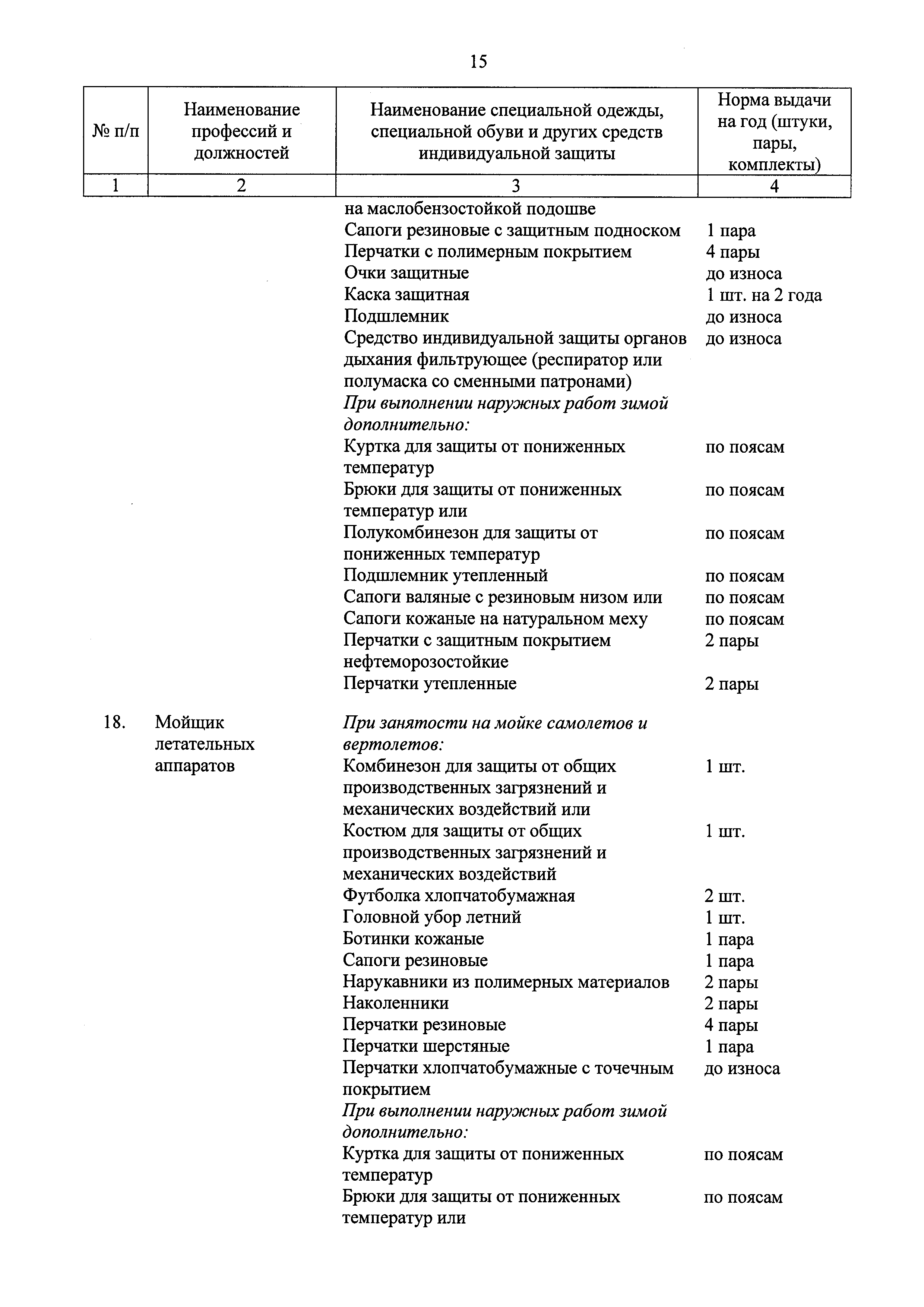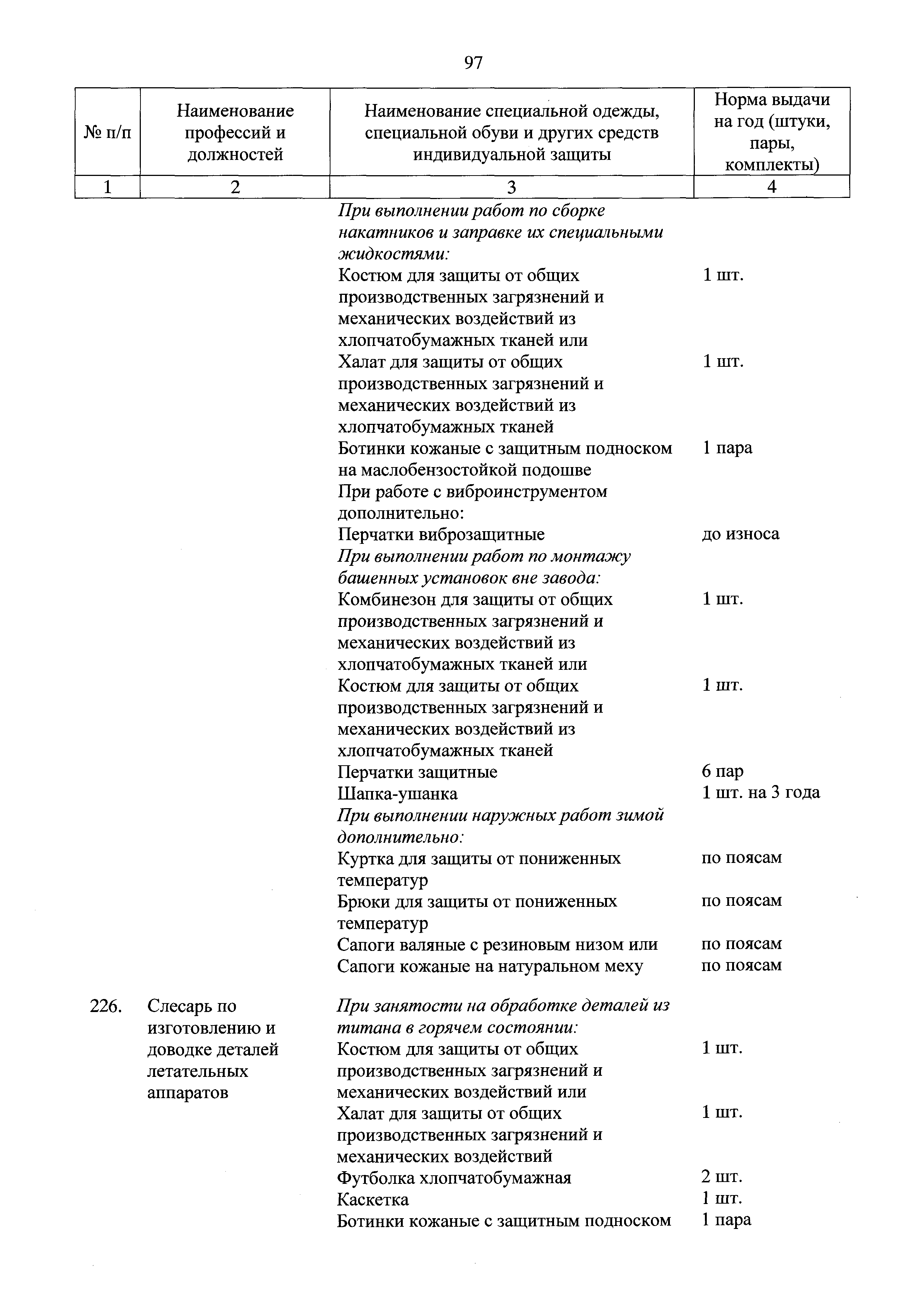 Типовые нормы бесплатной выдачи специальной одежды, специальной обуви и других средств индивидуальной защиты работникам авиационной промышленности, занятым на работах с вредными и (или) опасными условиями труда, а также на работах, выполняемых в особых температурных условиях или связанных с загрязнением| Статус: | действует | | Название рус.: | Типовые нормы бесплатной выдачи специальной одежды, специальной обуви и других средств индивидуальной защиты работникам авиационной промышленности, занятым на работах с вредными и (или) опасными условиями труда, а также на работах, выполняемых в особых температурных условиях или связанных с загрязнением | | Дата добавления в базу: | 01.01.2018 | | Дата актуализации: | 01.01.2021 | | Дата введения: | 01.12.2017 | | Оглавление: | I. Летный состав II. Инженерно-технический состав III. Испытание авиационной техники IV. Службы эксплуатационного содержания аэродромов (вертодромов) V. Персонал испытательных станций авиационных двигателей VI. Персонал испытательных станций двигателей и силовых установок VII. Работники полигона VIII. Производство мягких баков IX. Производство мипоры X. Подразделения неразрушающего контроля XI. Оптическое стекловарение и оптико-механическое производство 1. Оптическое стекловарение 2. Оптико-механическое производство 3. Общие профессии XII. Производство полимерных композиционных материалов (далее - ПКМ) и изделий из них XIII. Производство печатных плат гальваническим способом XIV. Авиаприборостоение. Сборка приборов для ракетно-космической техники XV. Прочие профессии | | Утверждён: | 19.06.2017 Министерство труда и социальной защиты РФ (507н)